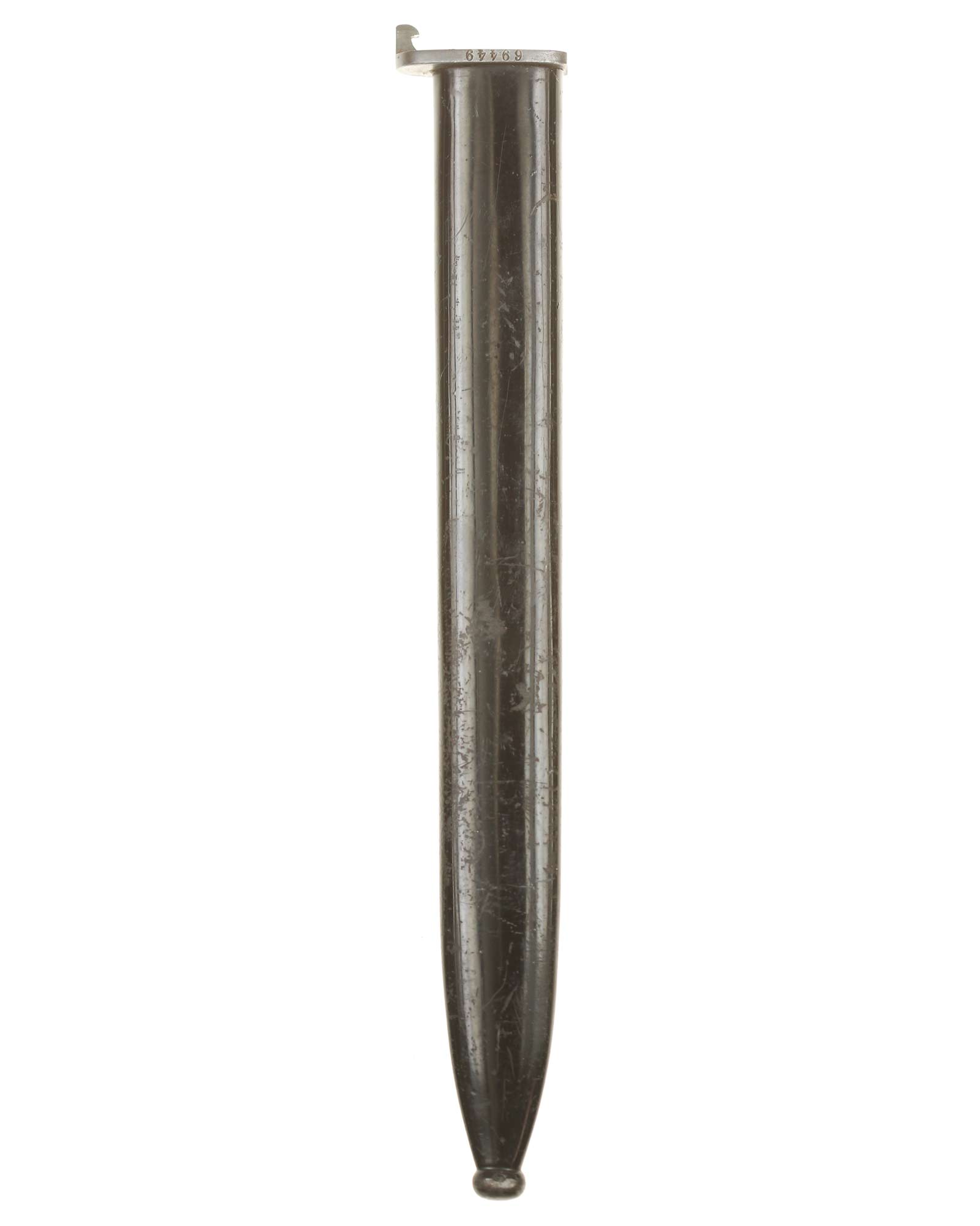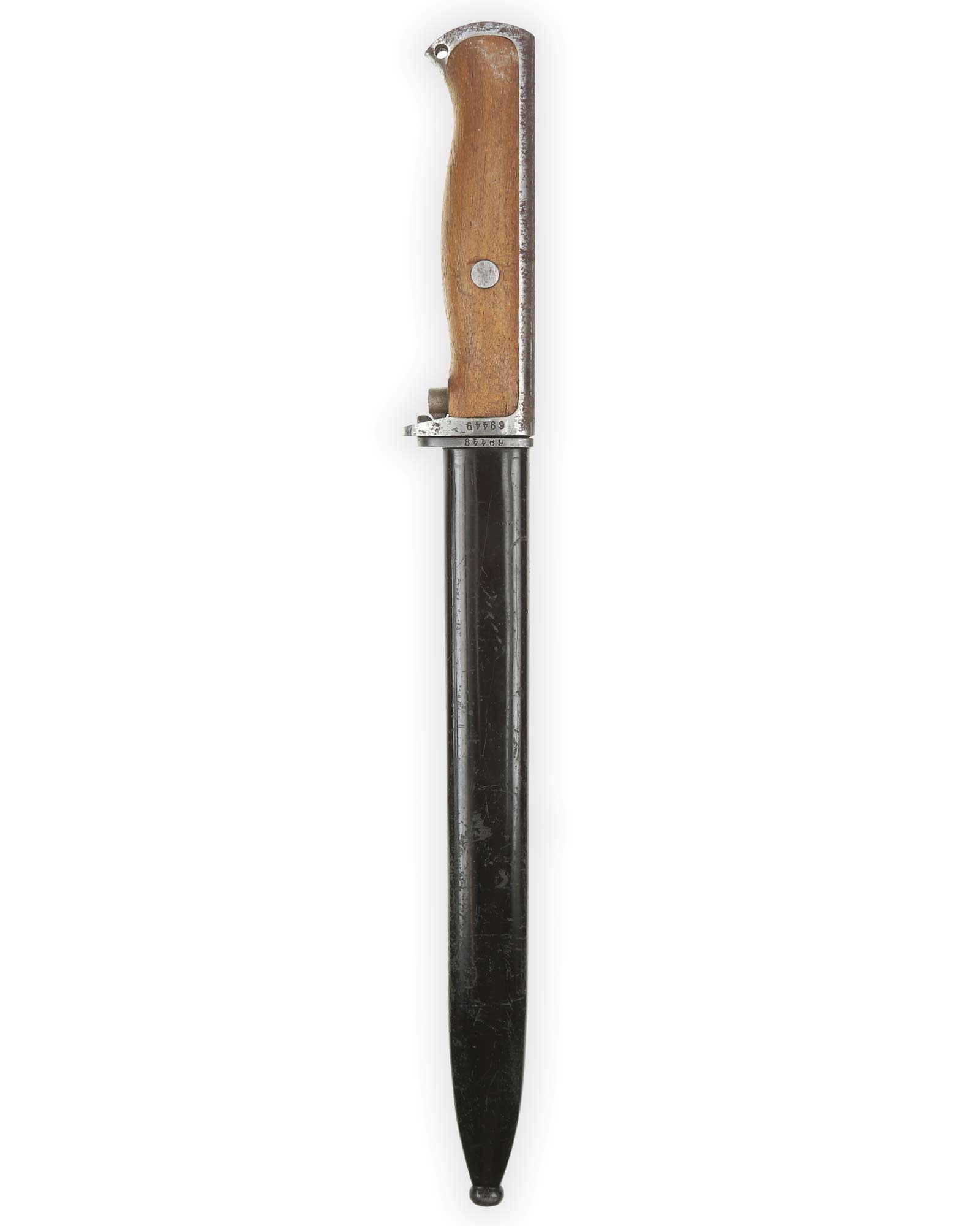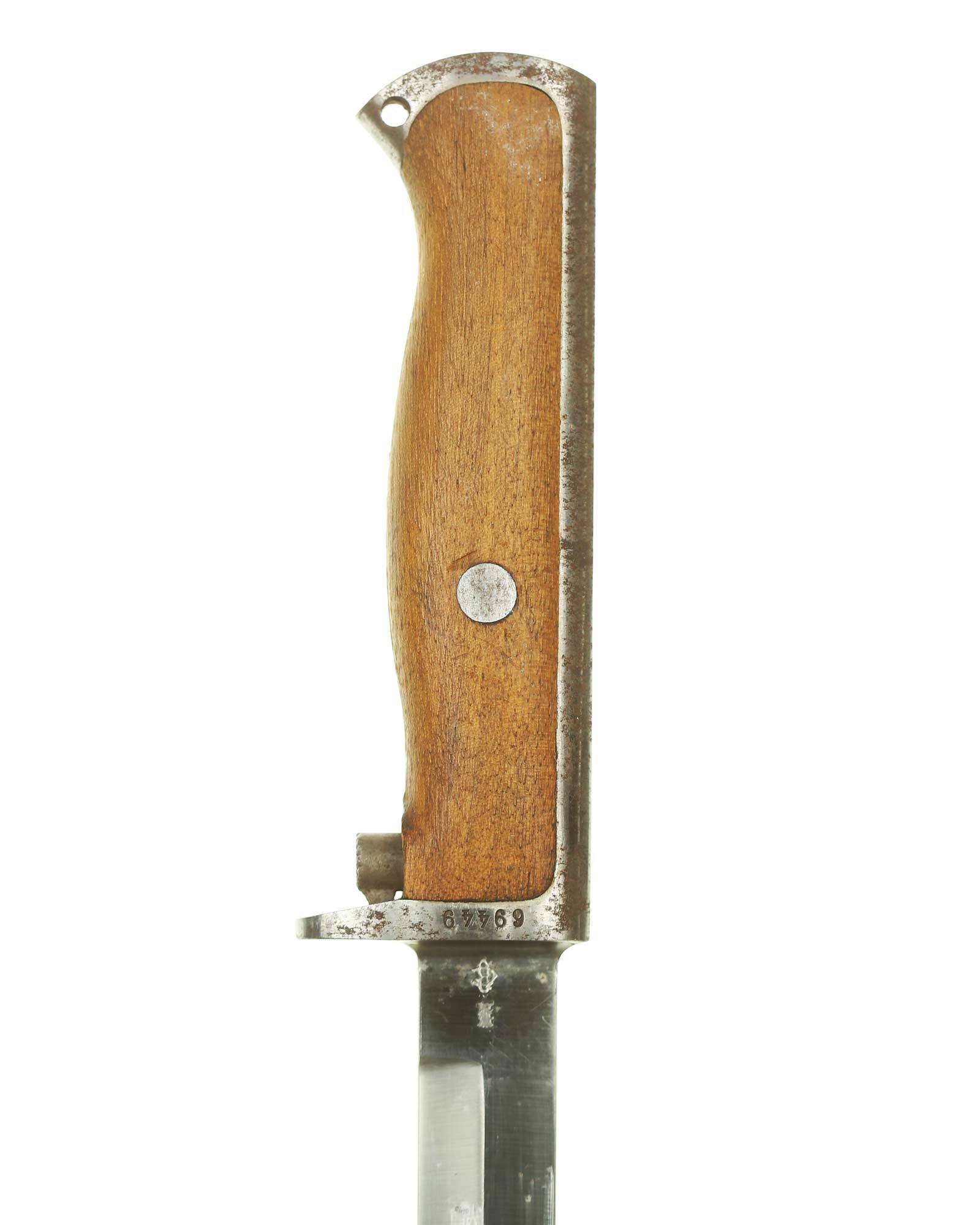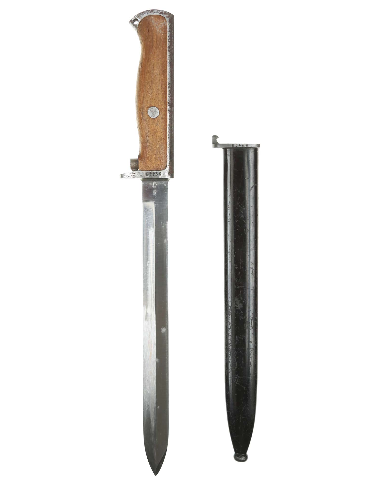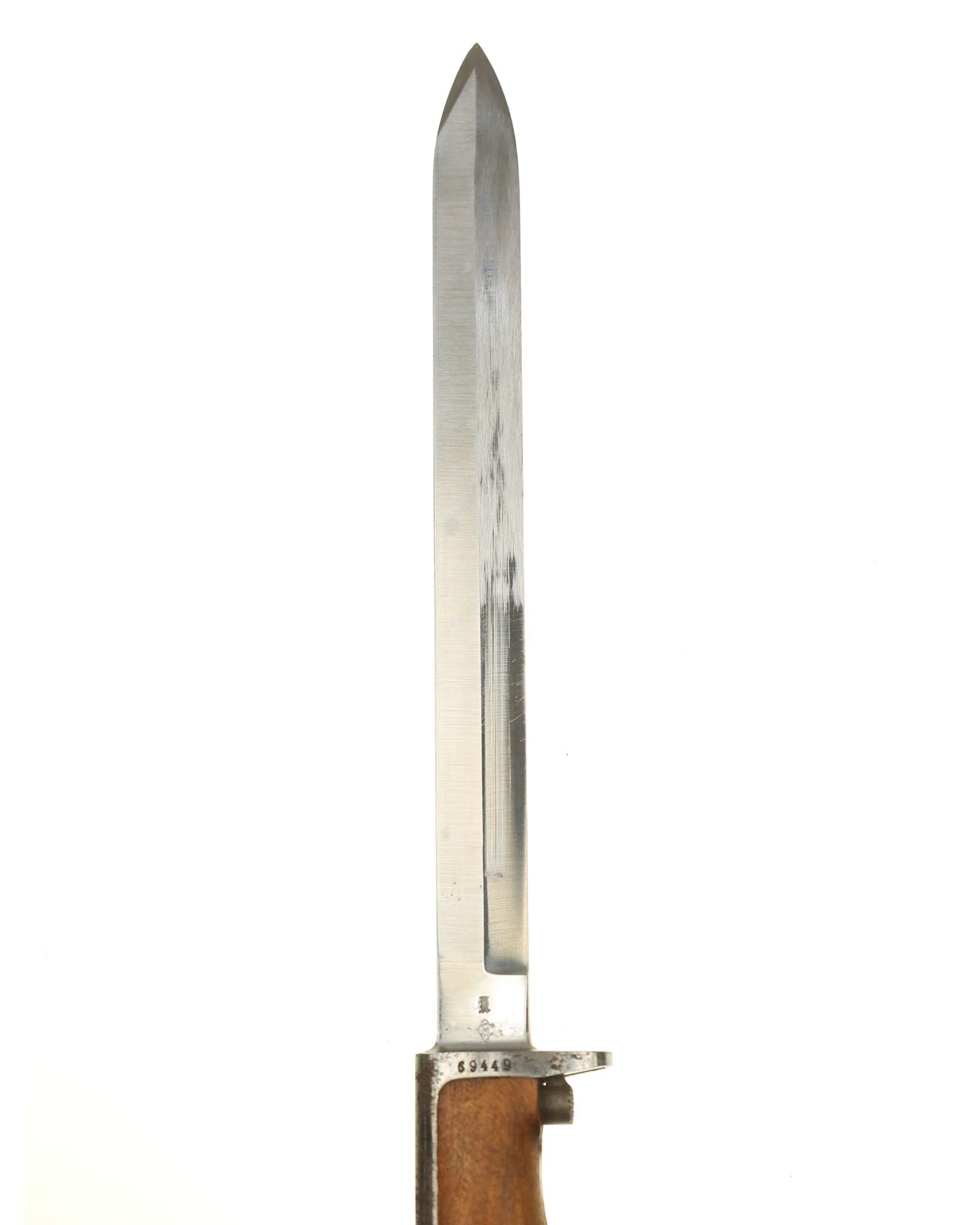Норвежский штык M 1894 для винтовки Krag-Jörgensen. На клинке имеется клеймо изготовителя. На пиноли и ножнах имеется соответствующий номер 69449. Обе деревянные шкалы рукояти в хорошем состоянии. Клинок чистый. Ножны имеют оригинальное лаковое покрытие.