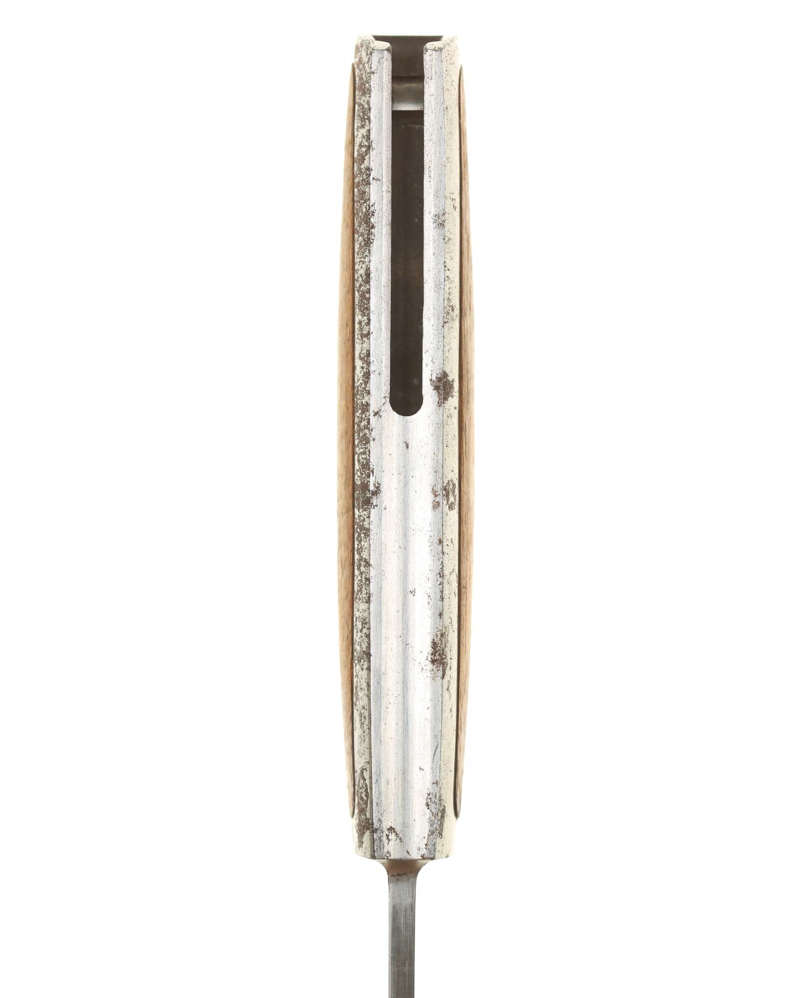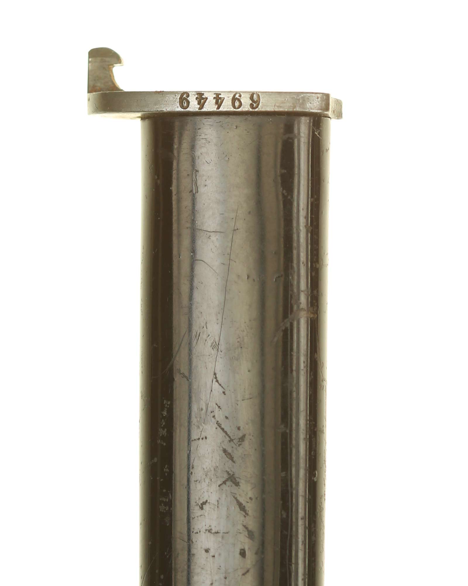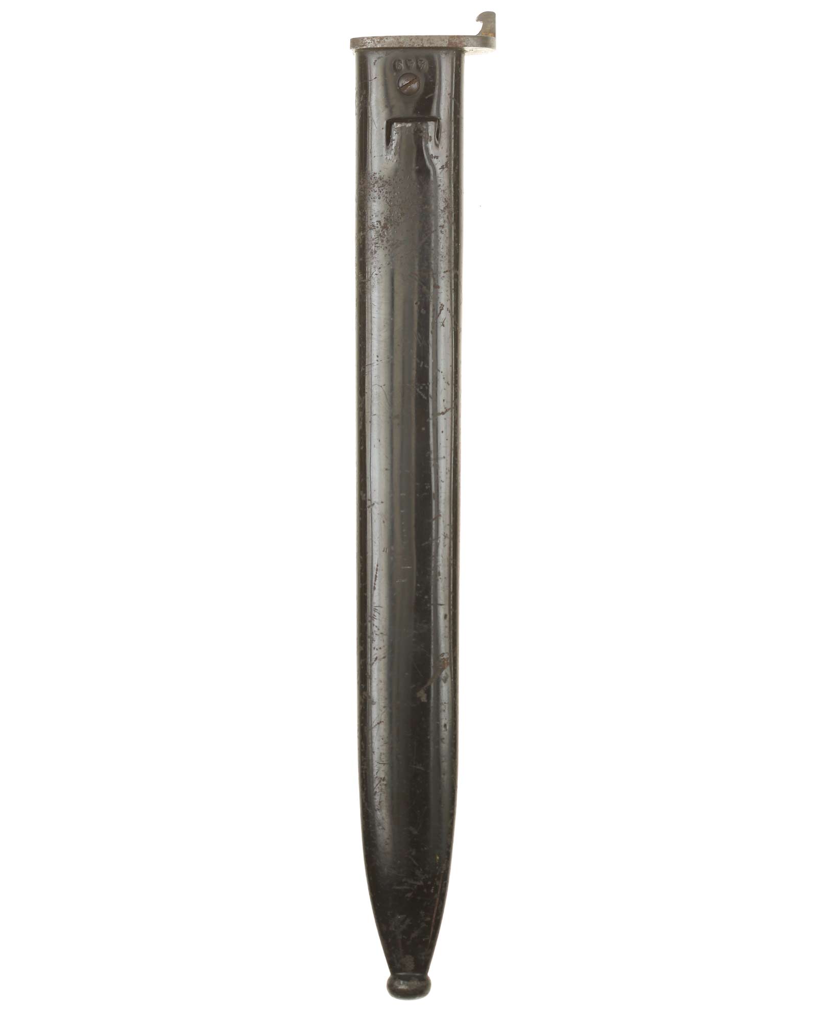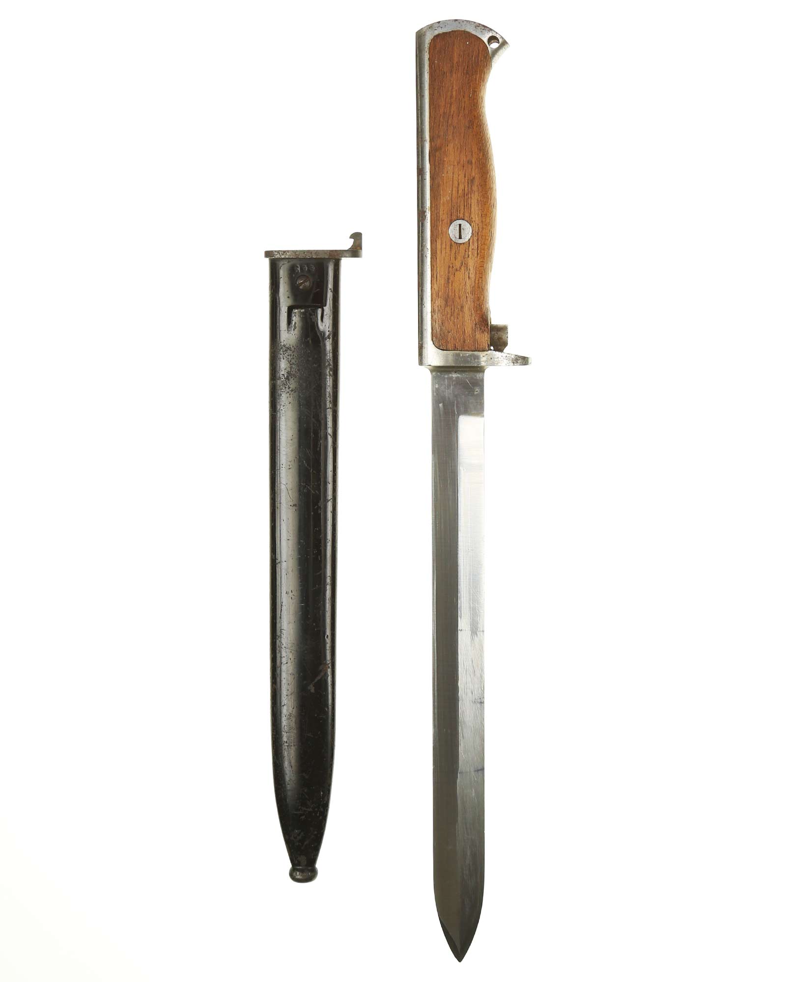 Норвежский штык M 1894 для винтовки Krag-Jörgensen. На клинке имеется клеймо изготовителя. На пиноли и ножнах имеется соответствующий номер 69449. Обе деревянные шкалы рукояти в хорошем состоянии. Клинок чистый. Ножны имеют оригинальное лаковое покрытие.