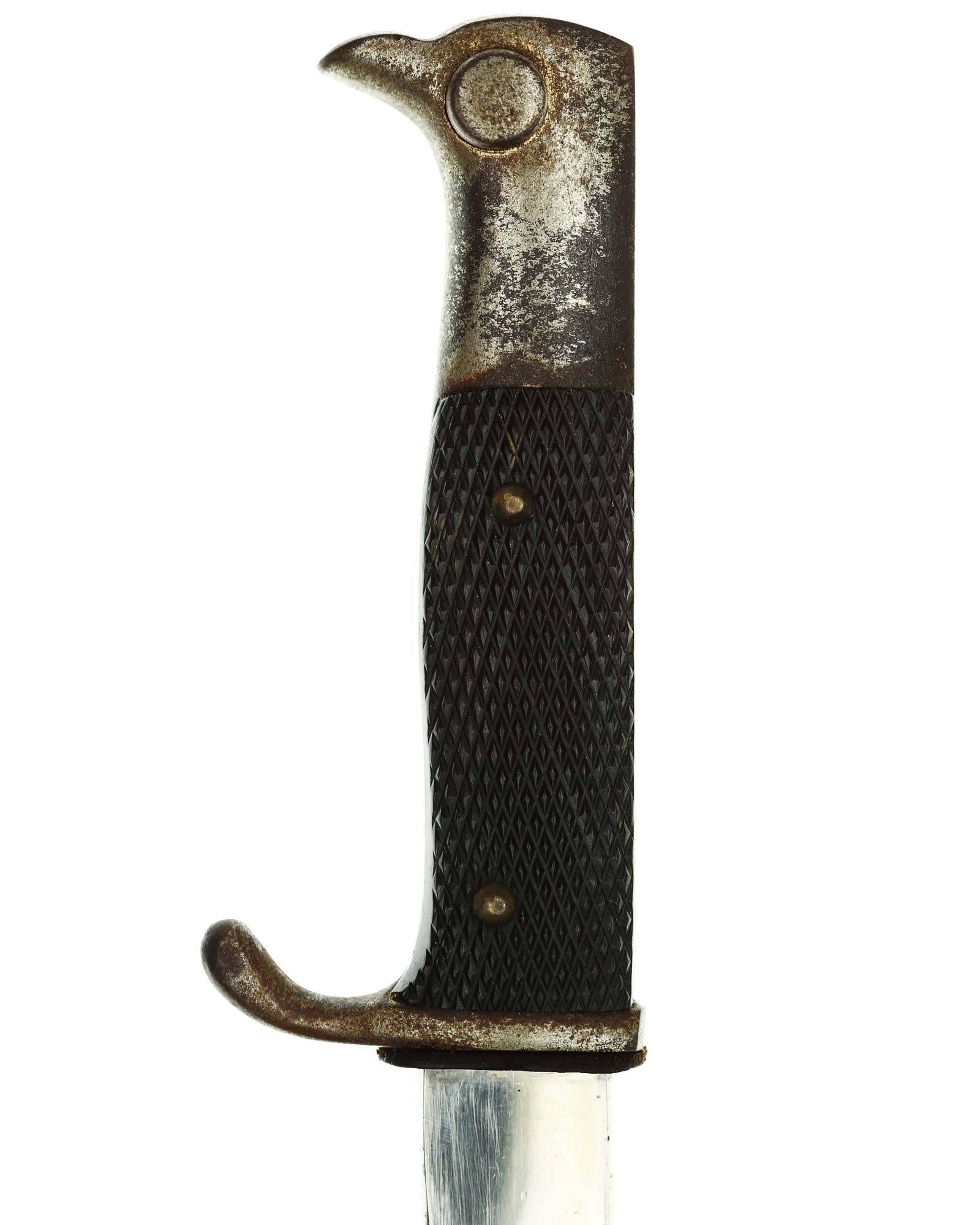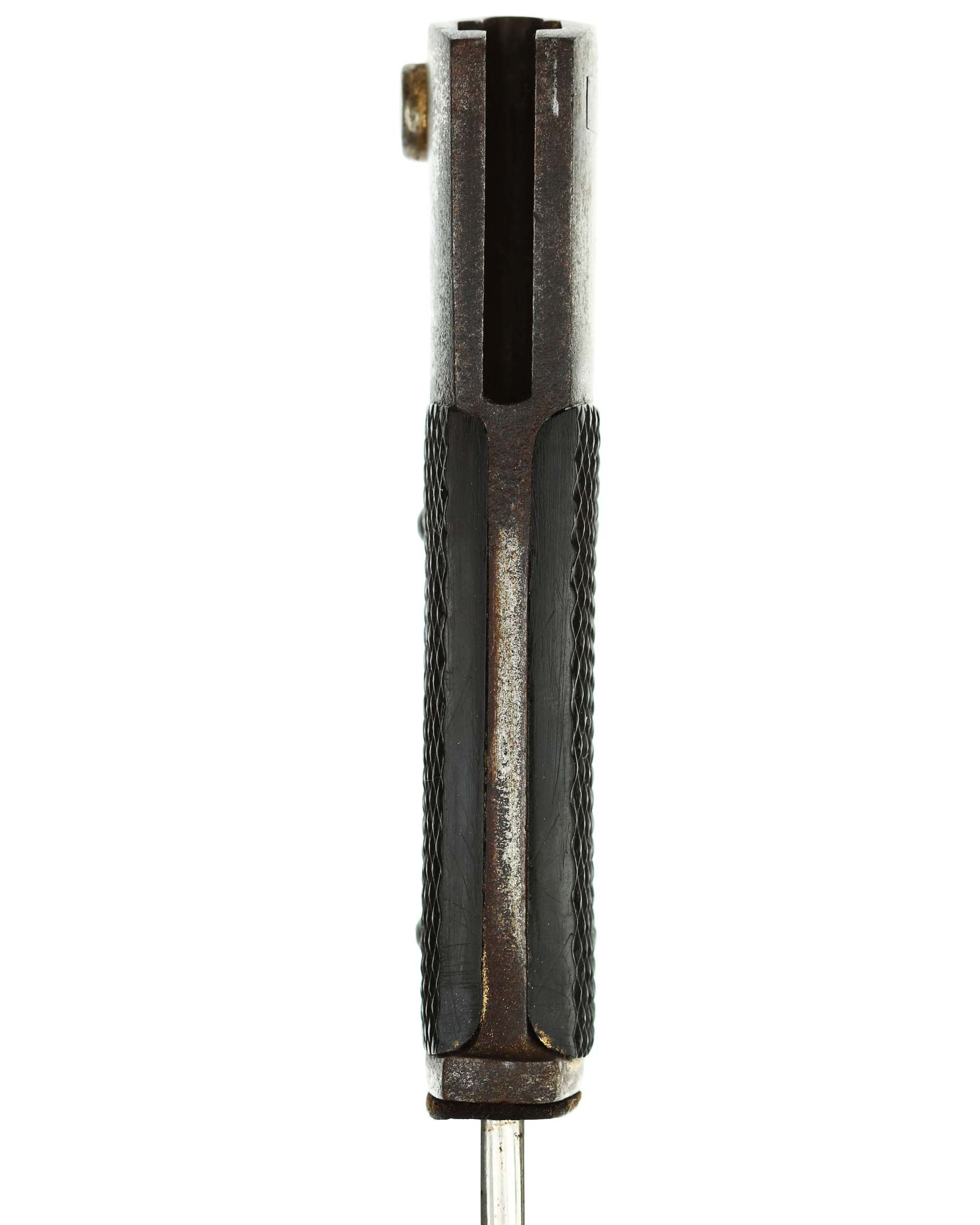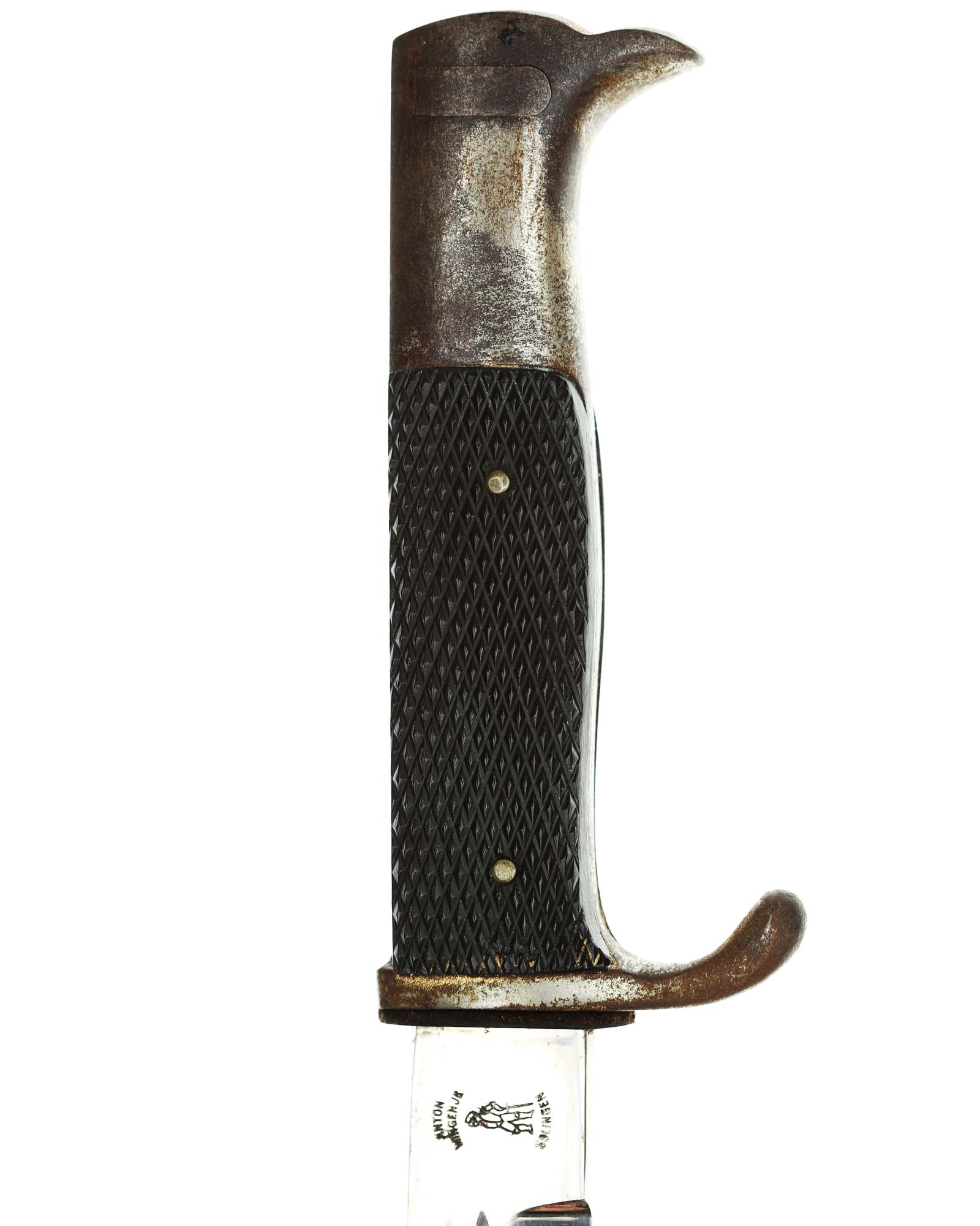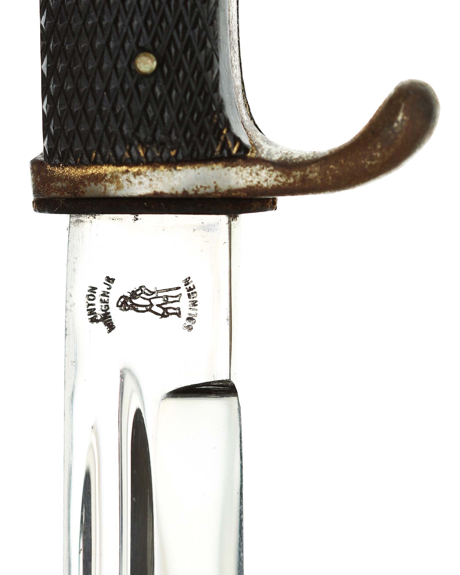 Штык внестроевой обр. 1933-45 гг. (тип K98). Рукоять образована двумя пластмассовыми рифлеными щечками, скрепленными с хвостовиком клинка заклепками. Головка рукояти стилизована под птичью голову. Клинок прямой, стальной, однолезвийный, с долом на каждой стороне и пилой на обухе. Ножны стальные, окрашены в черный цвет, с крючком и шариком на конце. На пяте клинка имеется клеймо известного производителя - Anton Wingen Solingen, клеймо немецкой фирмы «Антон Винген» Золинген.