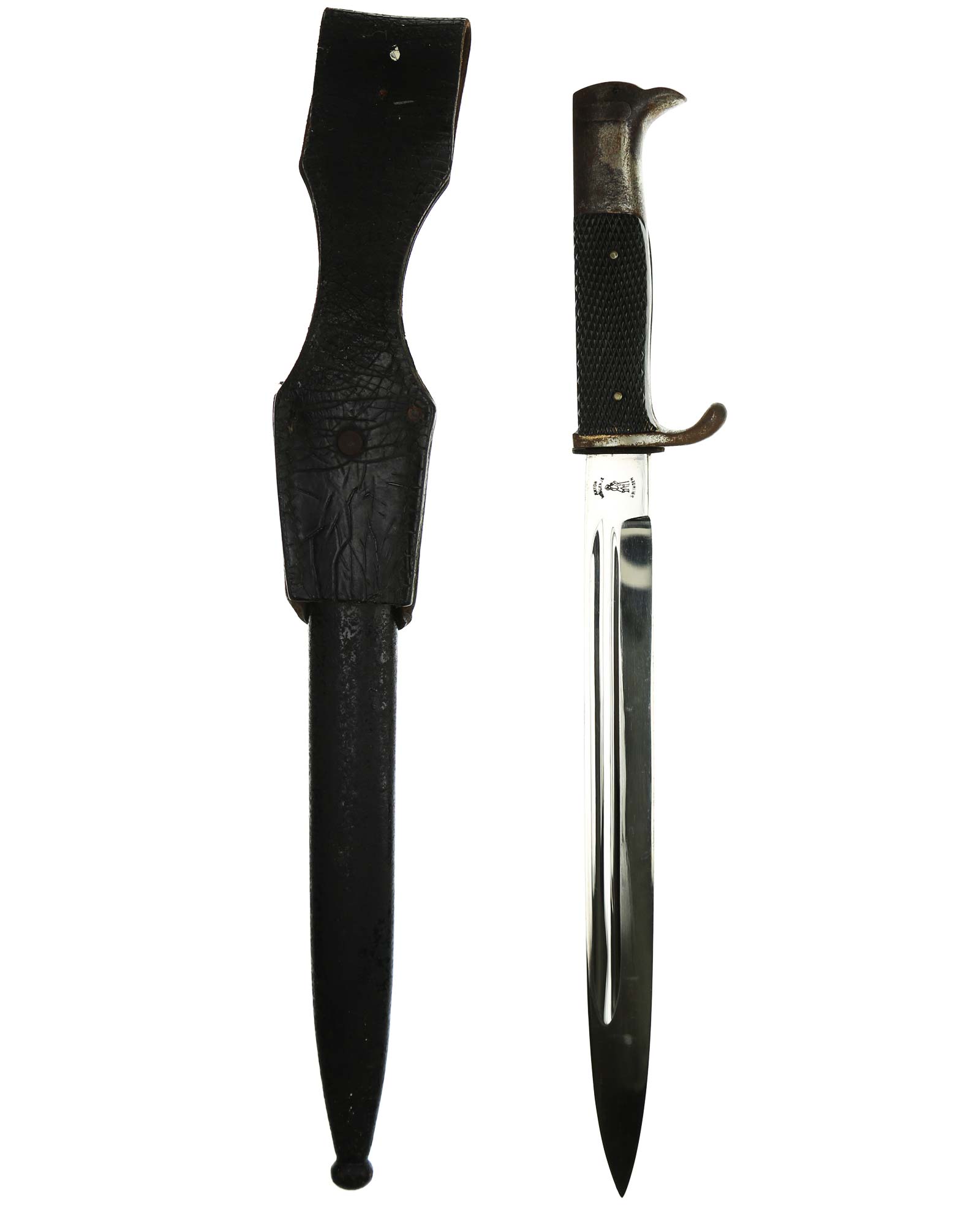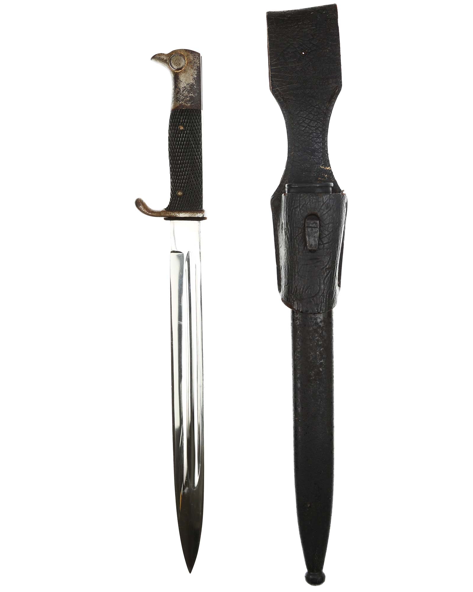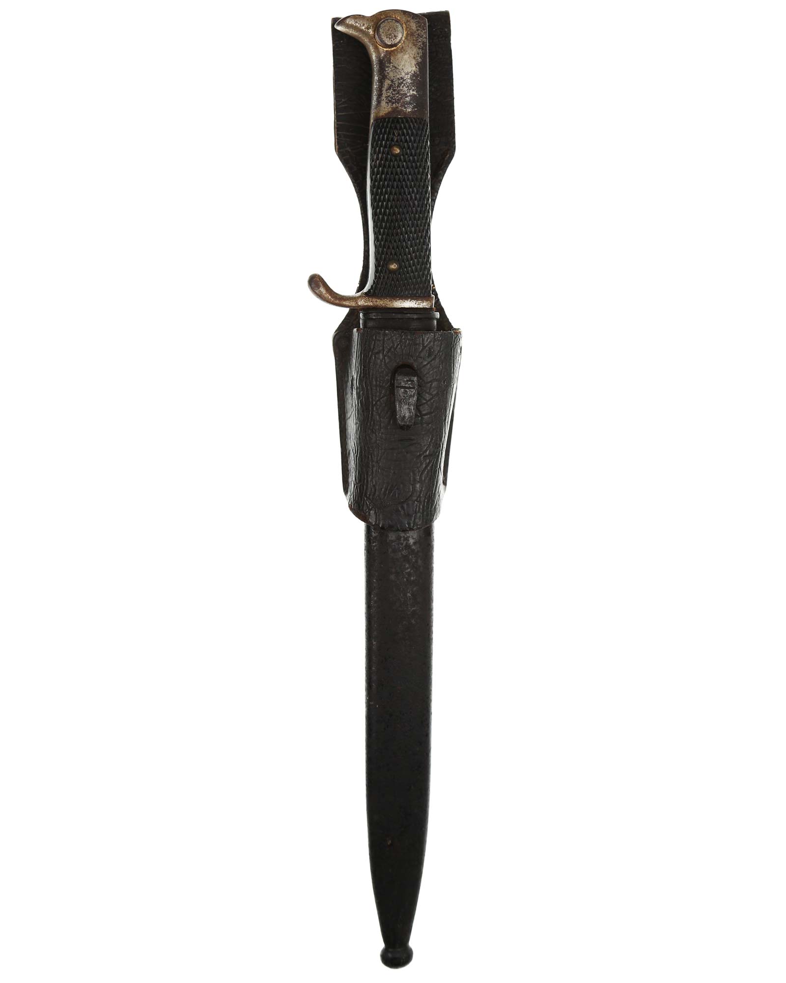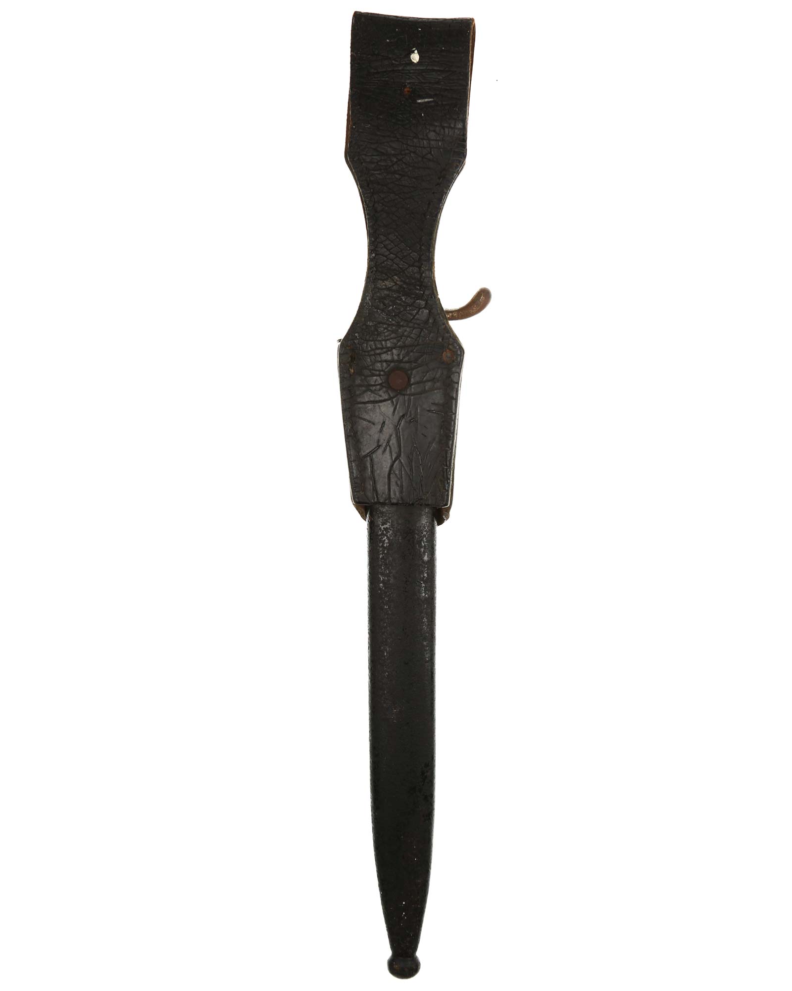 Штык внестроевой обр. 1933-45 гг. (тип K98). Рукоять образована двумя пластмассовыми рифлеными щечками, скрепленными с хвостовиком клинка заклепками. Головка рукояти стилизована под птичью голову. Клинок прямой, стальной, однолезвийный, с долом на каждой стороне и пилой на обухе. Ножны стальные, окрашены в черный цвет, с крючком и шариком на конце. На пяте клинка имеется клеймо известного производителя - Anton Wingen Solingen, клеймо немецкой фирмы «Антон Винген» Золинген.