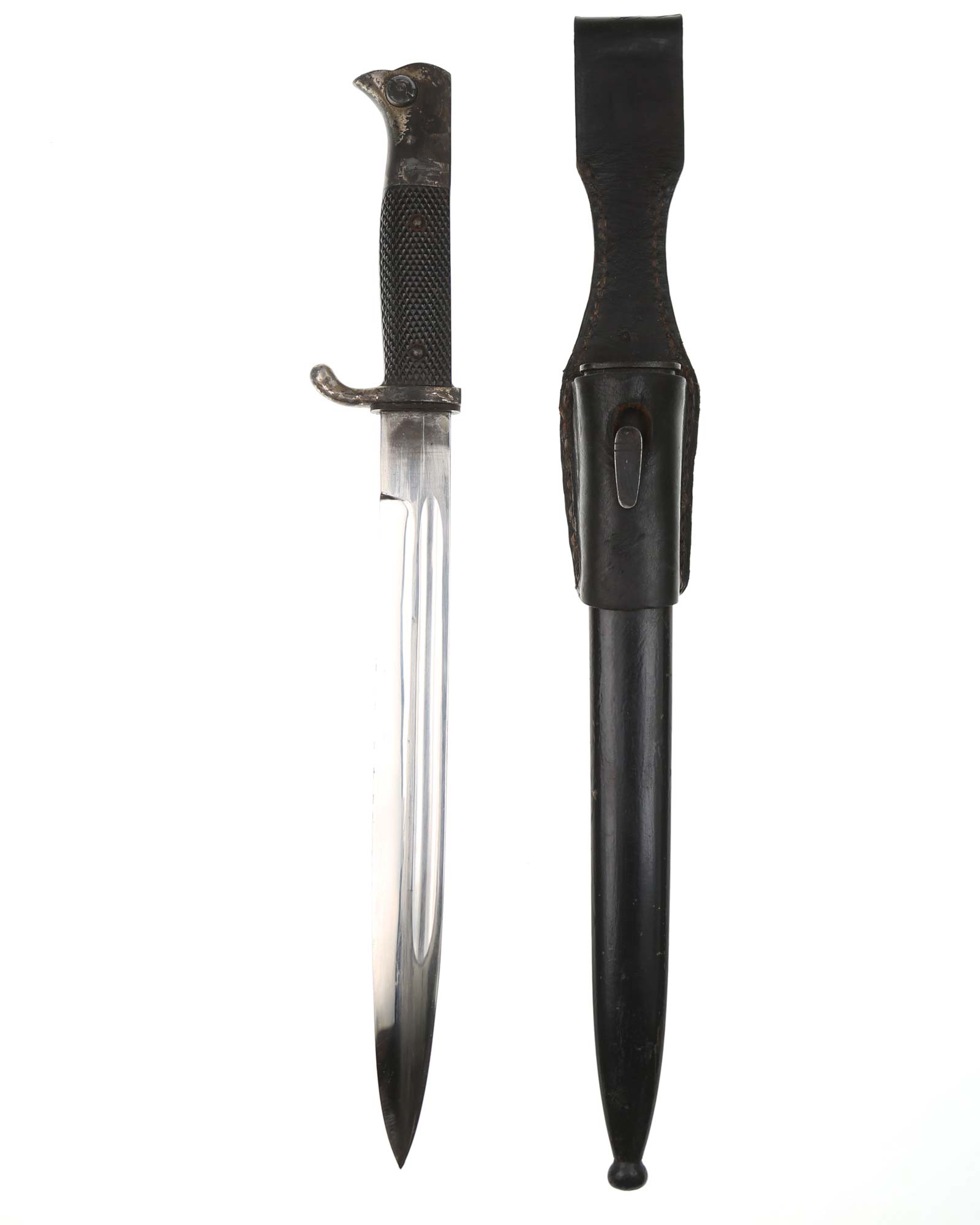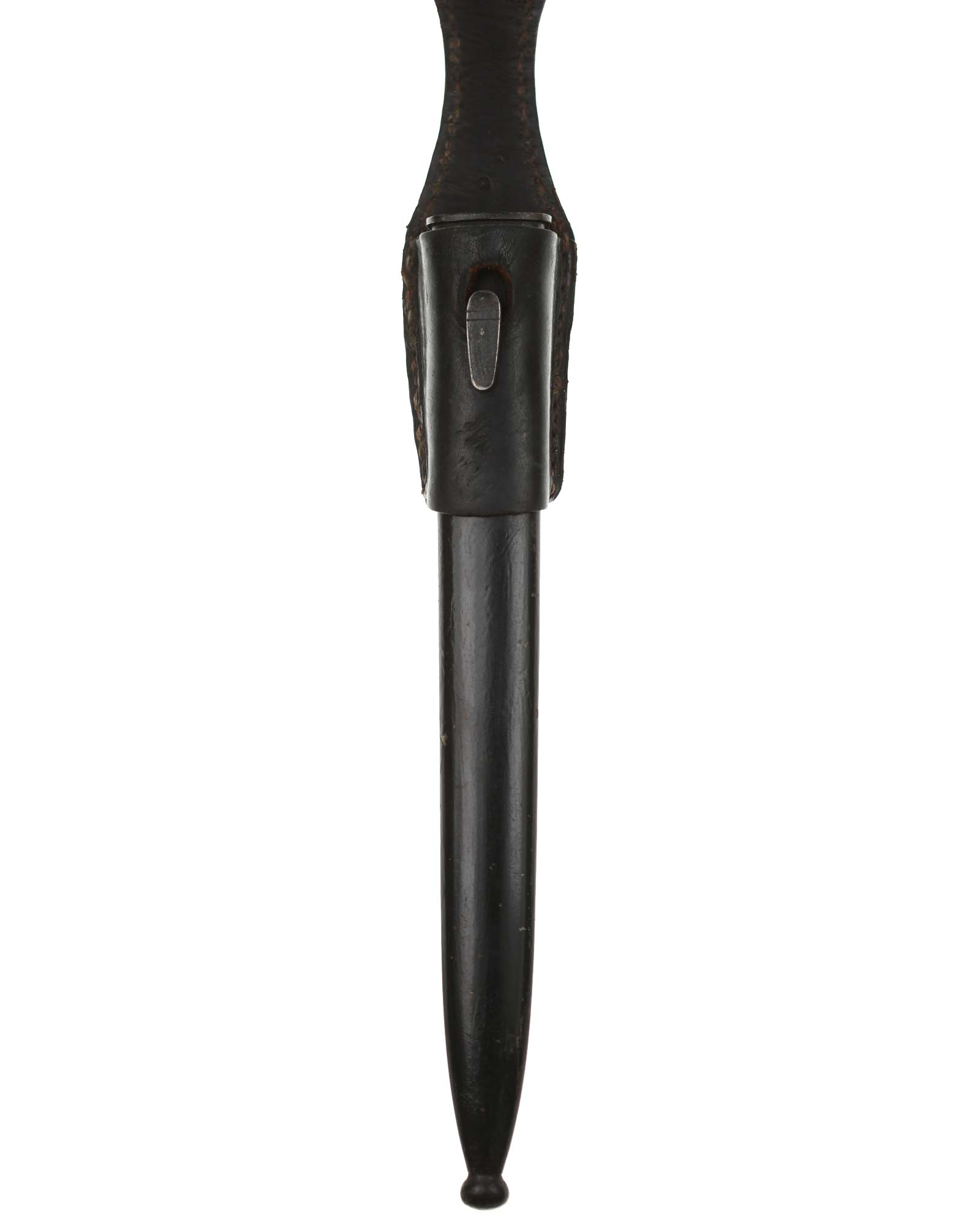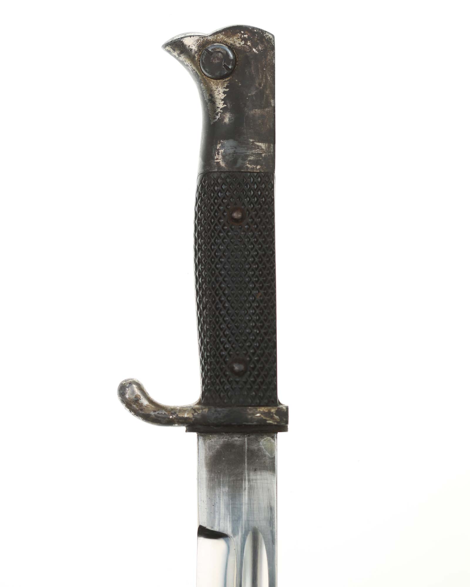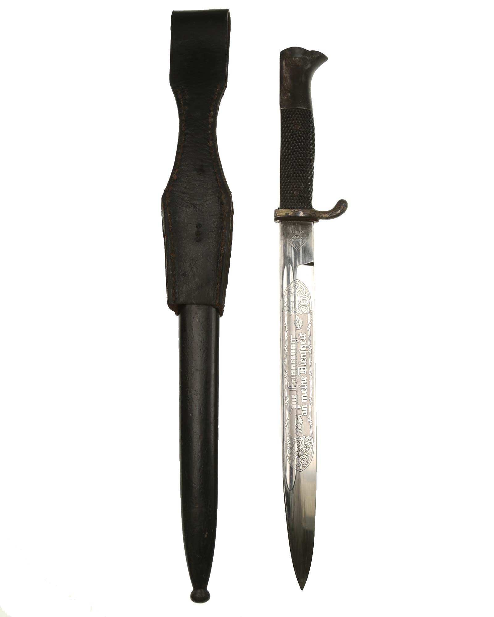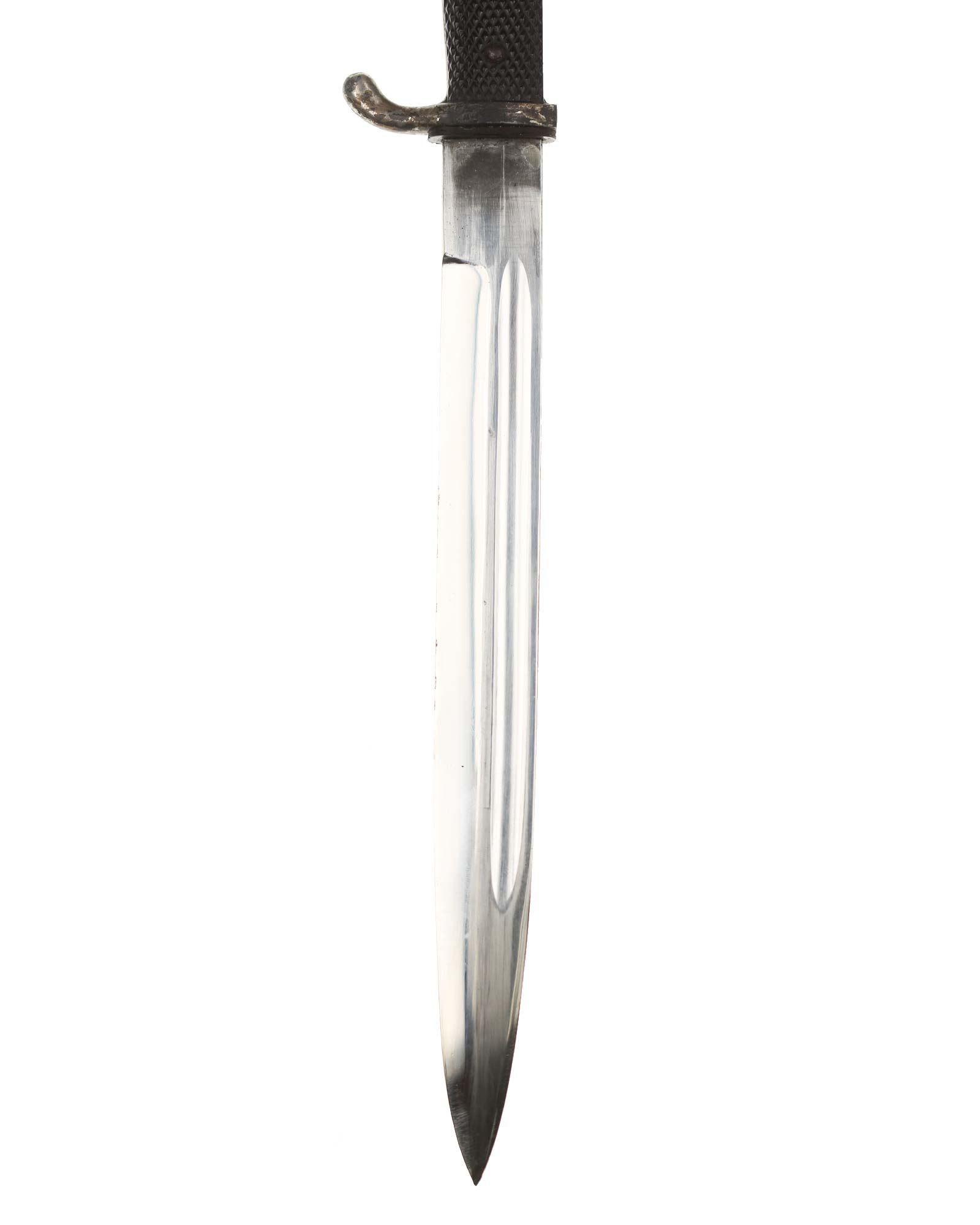 Парадный (внестроевой) штык к винтовке Маузер с травленым украшенным клинком. Клинок никелированный с красиво оформленной травленой готической надписью: "Zur Erinnerung an meine Dienstzeit" - "В память о моем времени". На пяте клинка имеется клеймо известного производителя - Puma Solingen, клеймо немецкой фирмы «Puma» Золинген. Элементы рукояти также никелированные, щечки изготовлены из черной рифленой пластмассы. Ножны металлические, выкрашенные в черный цвет.