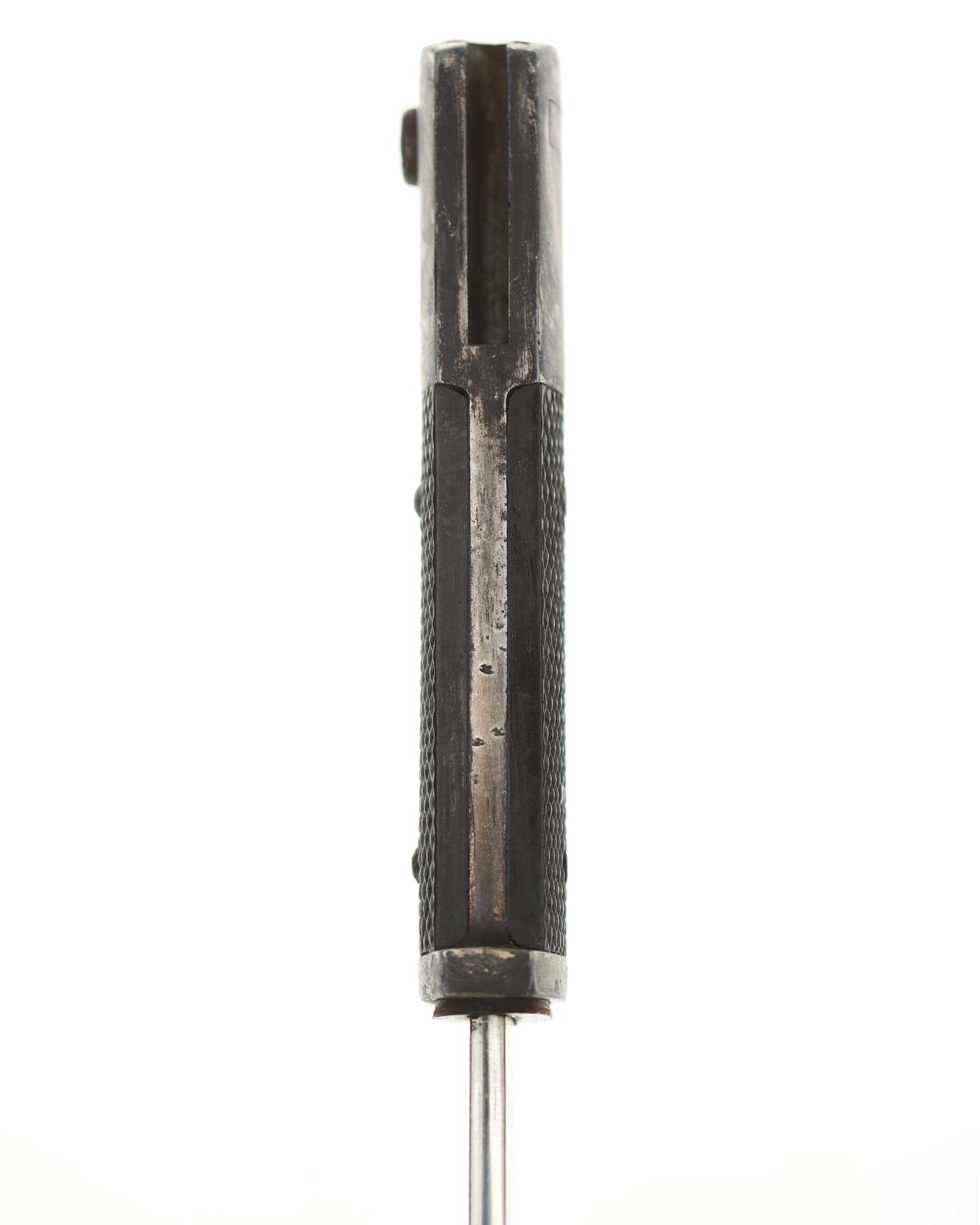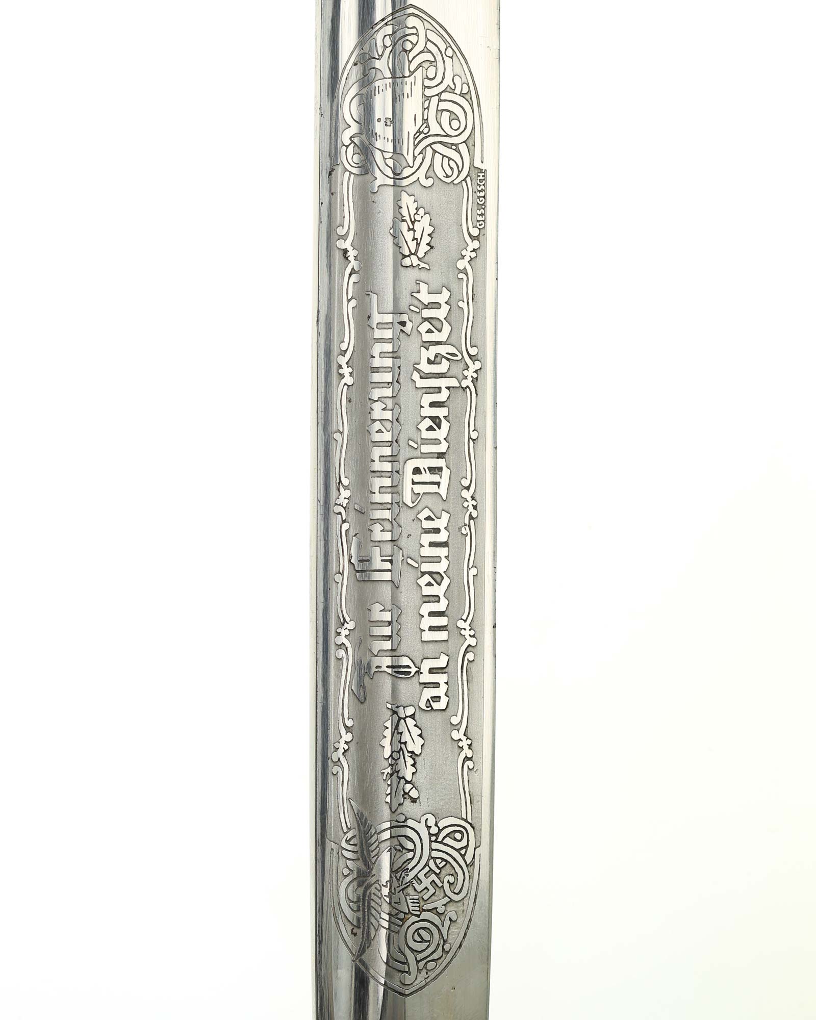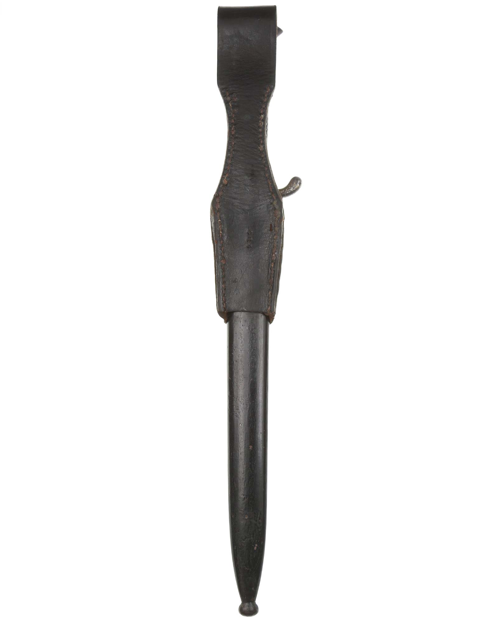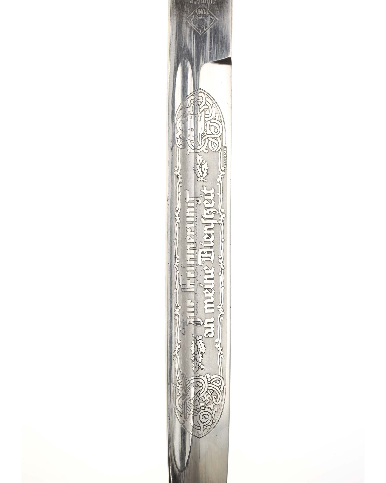 Парадный (внестроевой) штык к винтовке Маузер с травленым украшенным клинком. Клинок никелированный с красиво оформленной травленой готической надписью: "Zur Erinnerung an meine Dienstzeit" - "В память о моем времени". На пяте клинка имеется клеймо известного производителя - Puma Solingen, клеймо немецкой фирмы «Puma» Золинген. Элементы рукояти также никелированные, щечки изготовлены из черной рифленой пластмассы. Ножны металлические, выкрашенные в черный цвет.