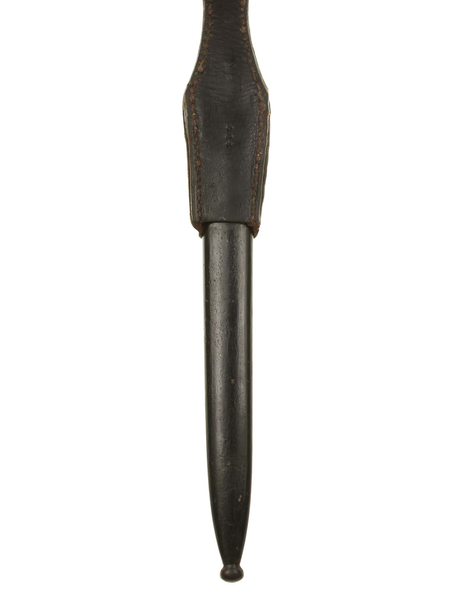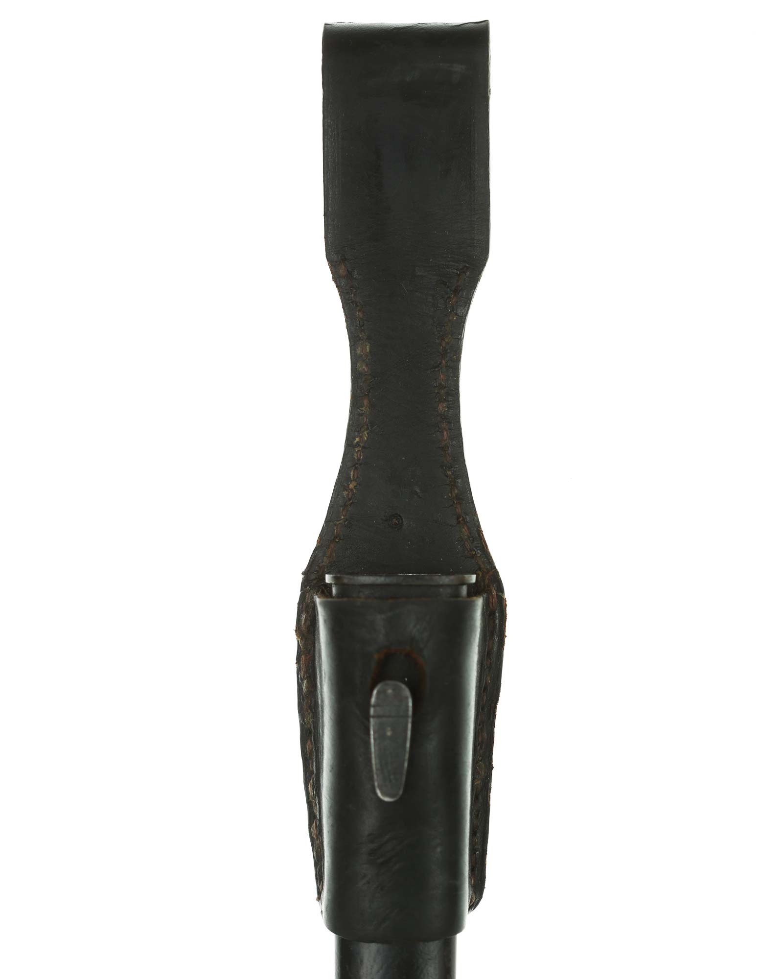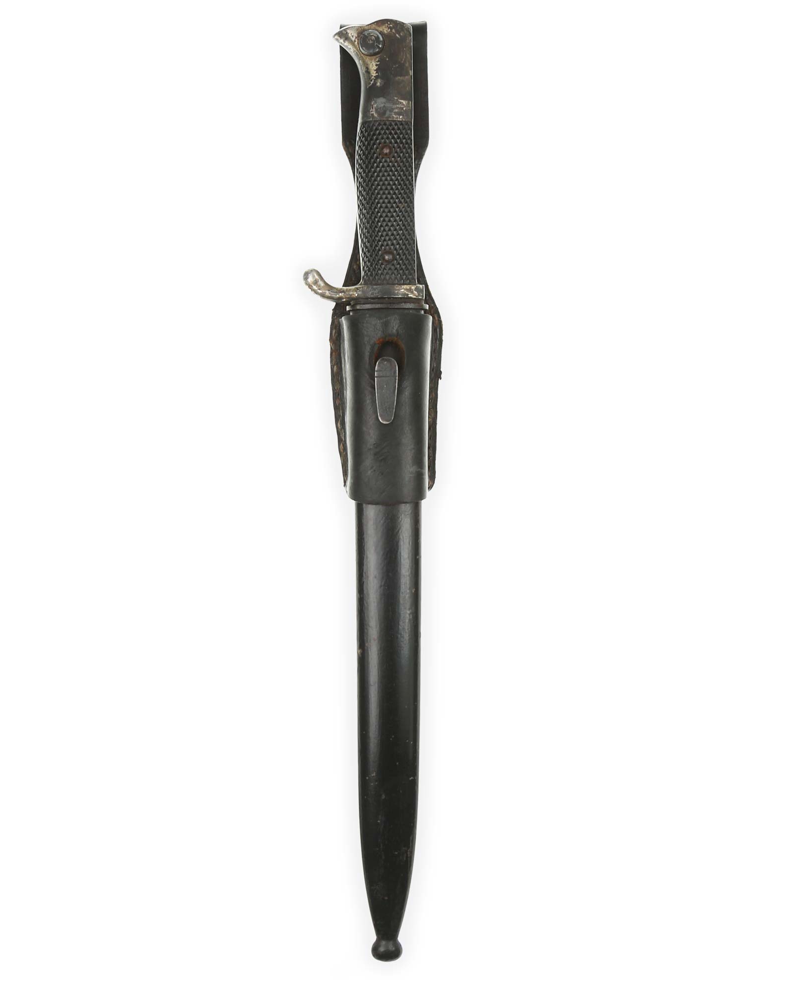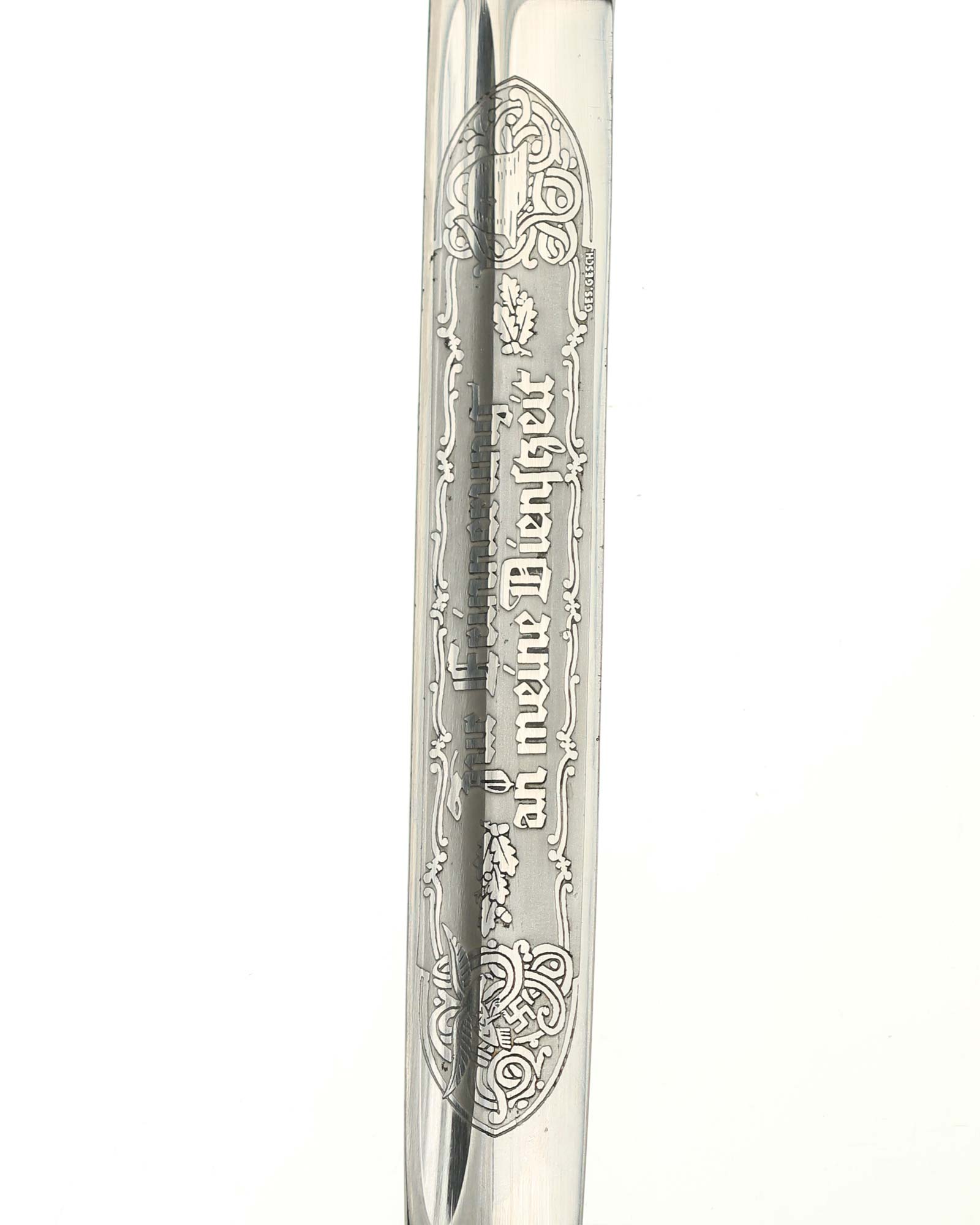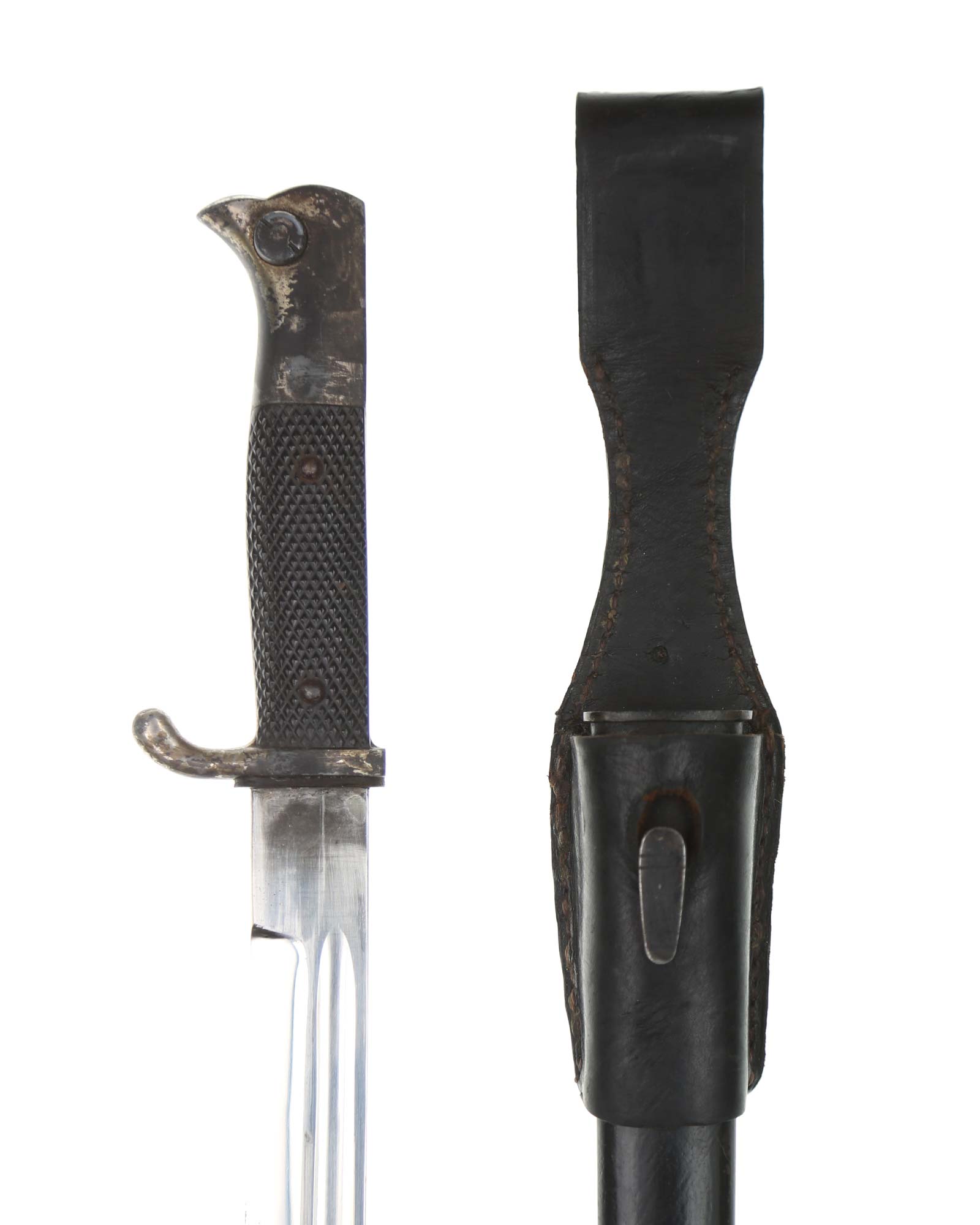 Парадный (внестроевой) штык к винтовке Маузер с травленым украшенным клинком. Клинок никелированный с красиво оформленной травленой готической надписью: "Zur Erinnerung an meine Dienstzeit" - "В память о моем времени". На пяте клинка имеется клеймо известного производителя - Puma Solingen, клеймо немецкой фирмы «Puma» Золинген. Элементы рукояти также никелированные, щечки изготовлены из черной рифленой пластмассы. Ножны металлические, выкрашенные в черный цвет.