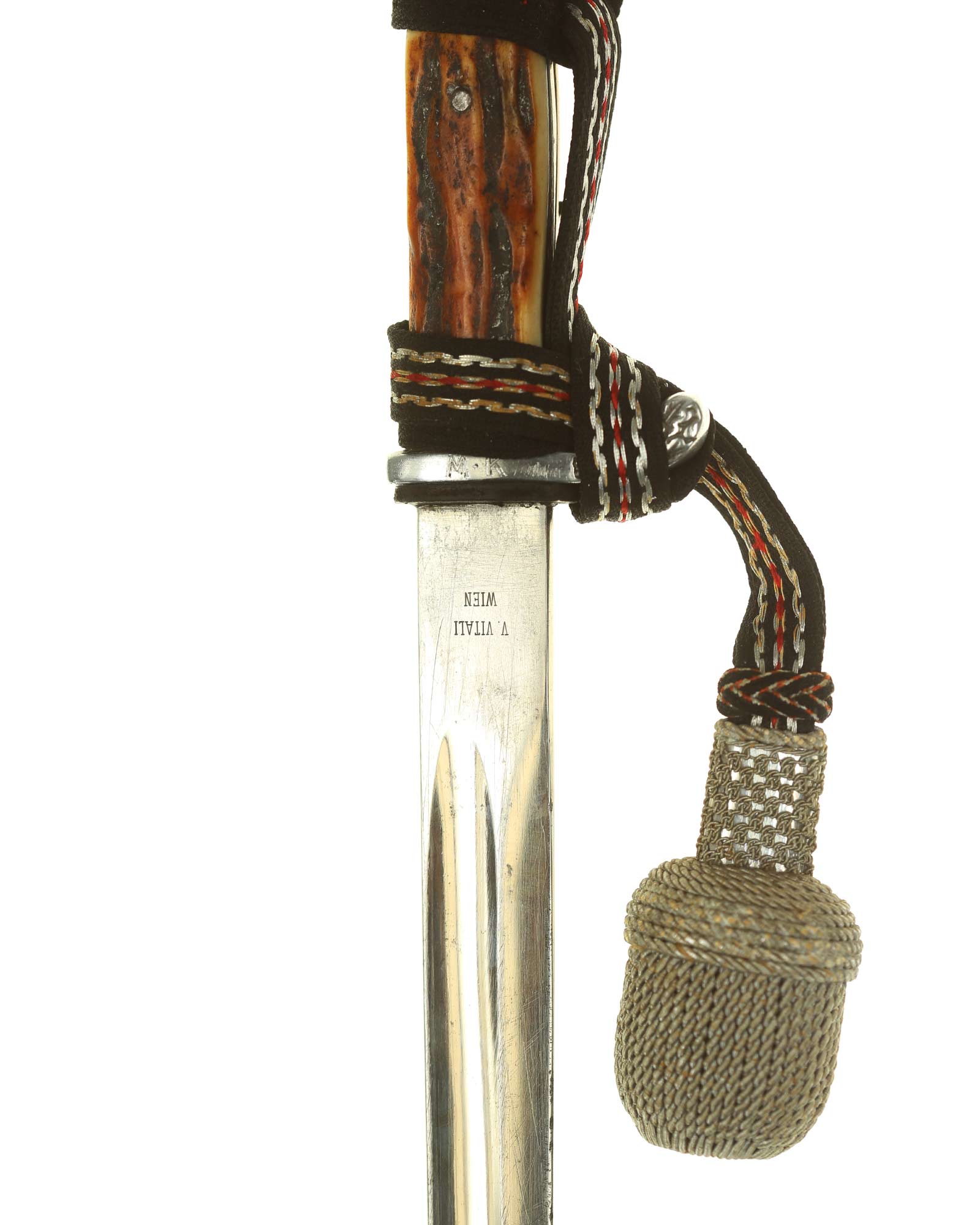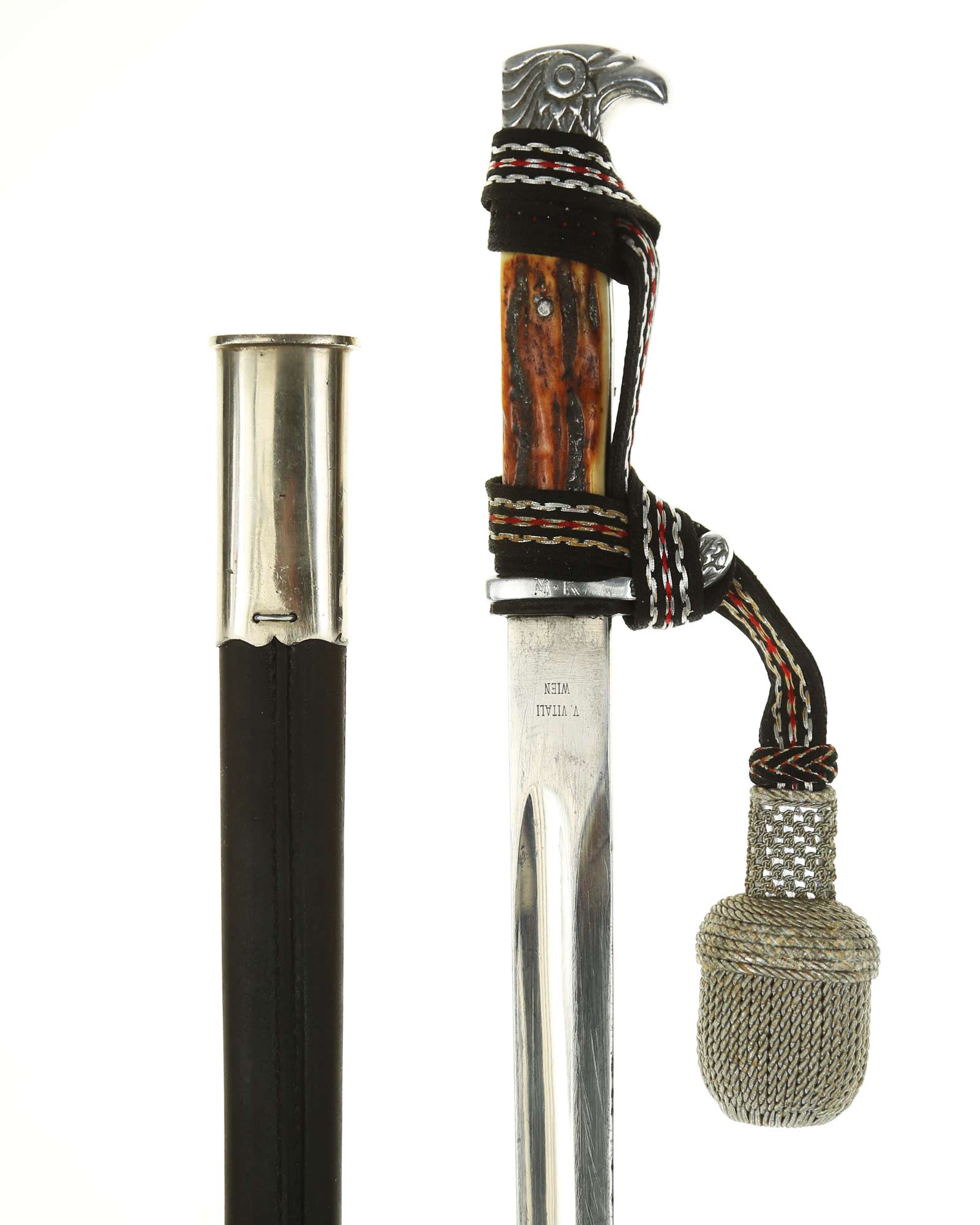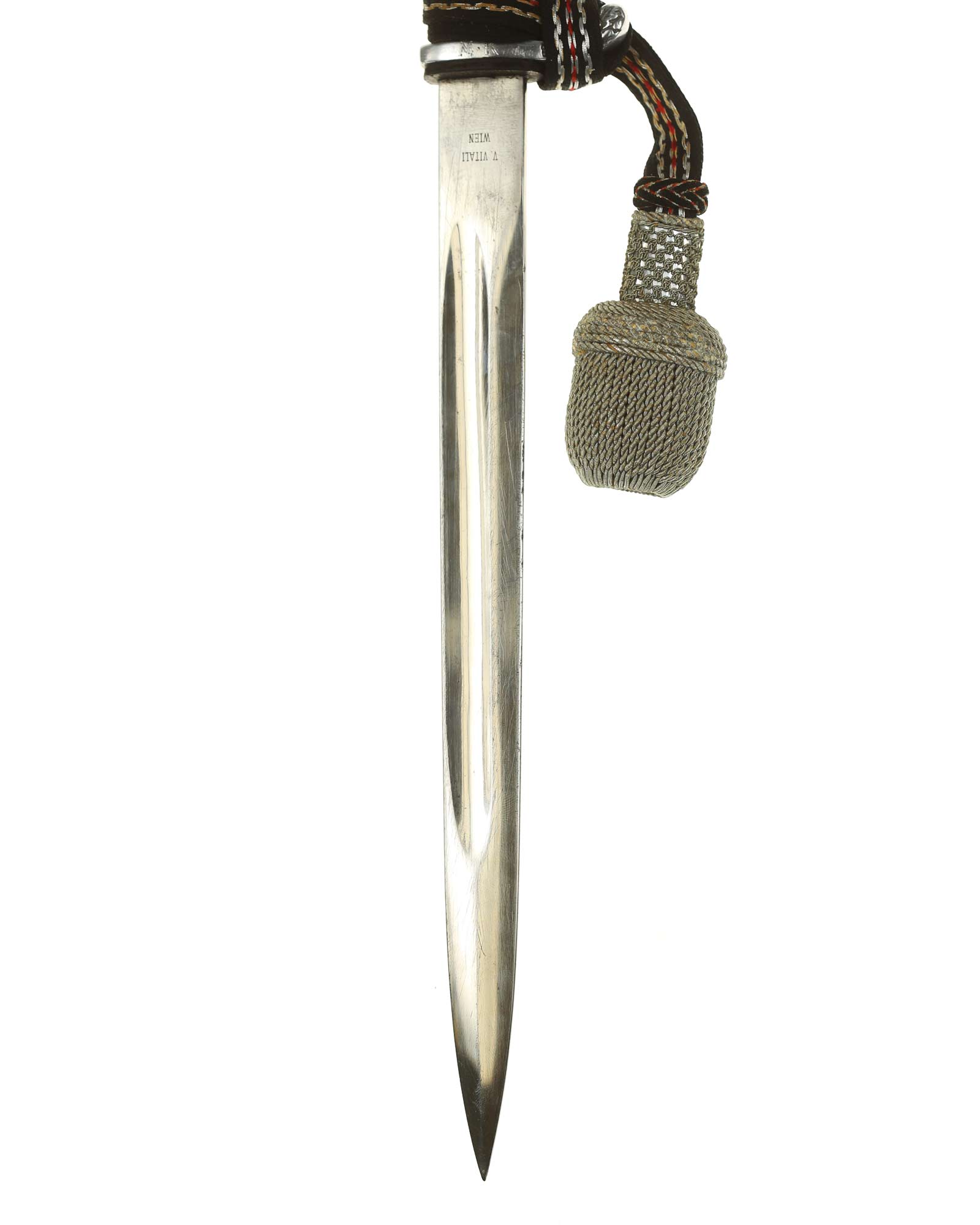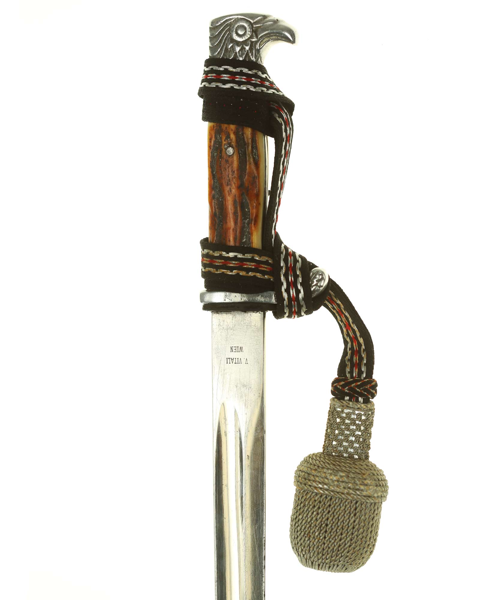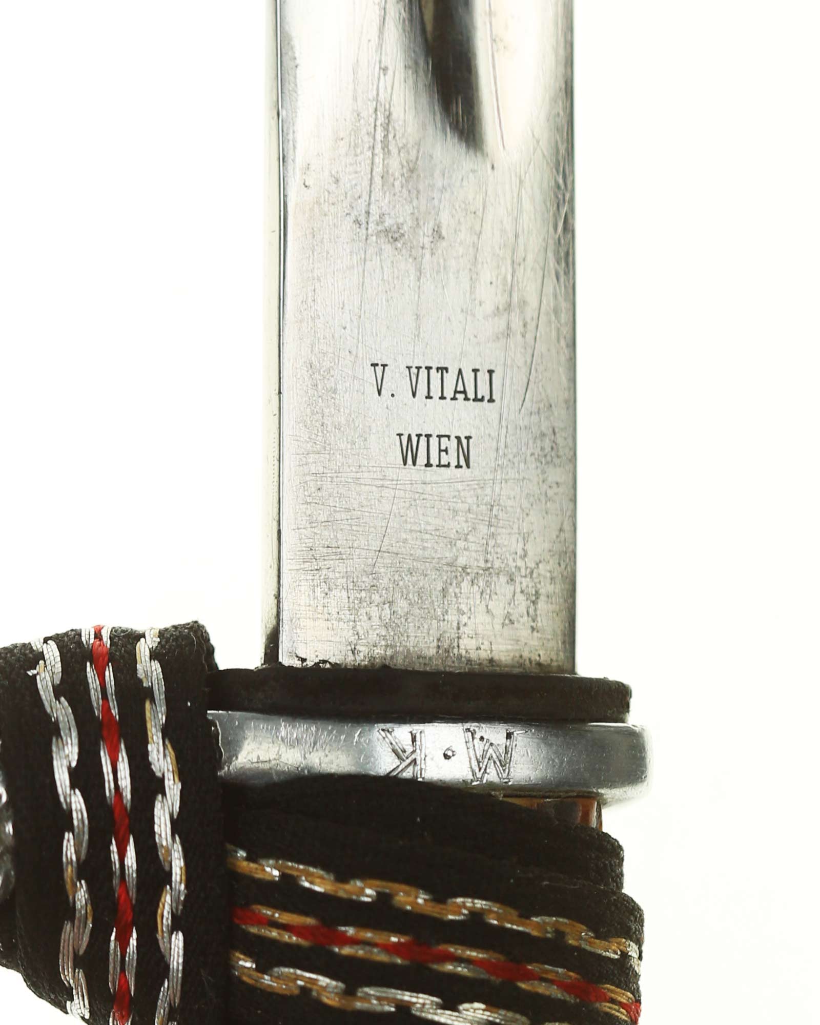 Штык парадный полицейский обр. 1934-45 гг. - В. Витали Вена. Эфес состоит из рукояти и крестовины. Щечки рукояти роговые, укреплены на черенке клинка при помощи двух заклепок. В центре одной из щечек располагается полицейская эмблема – орел в венке со свастикой в лапах. Головка рукояти рифленая, выполненная в виде головы орла. Крестовина с одной стороны вверх по направлению к клюву «орла». Клинок стальной, прямой, однолезвийный, с одним долом, никелированный. Клинок с клеймом изготовителя: V. Vitali Wien, с обеих сторон. На рукояти выгравировано имя владельца «Max. Hehs».