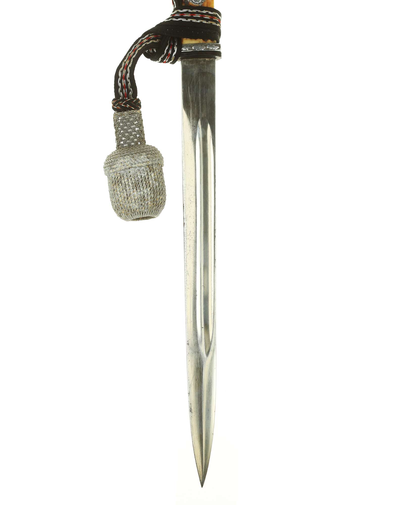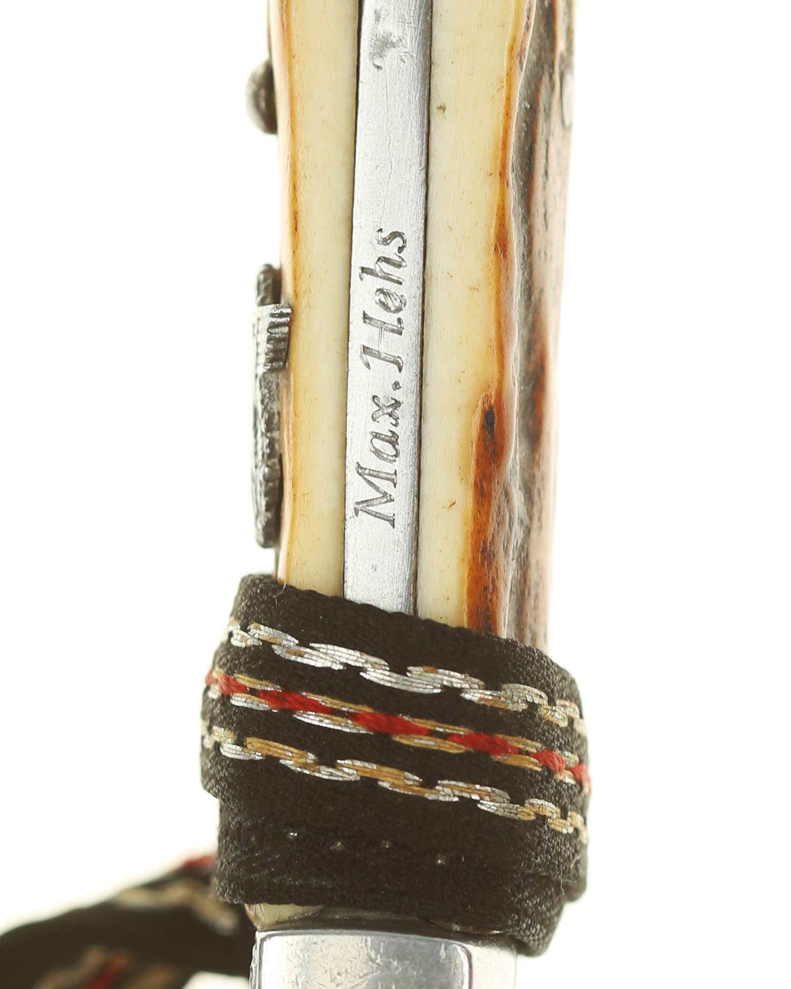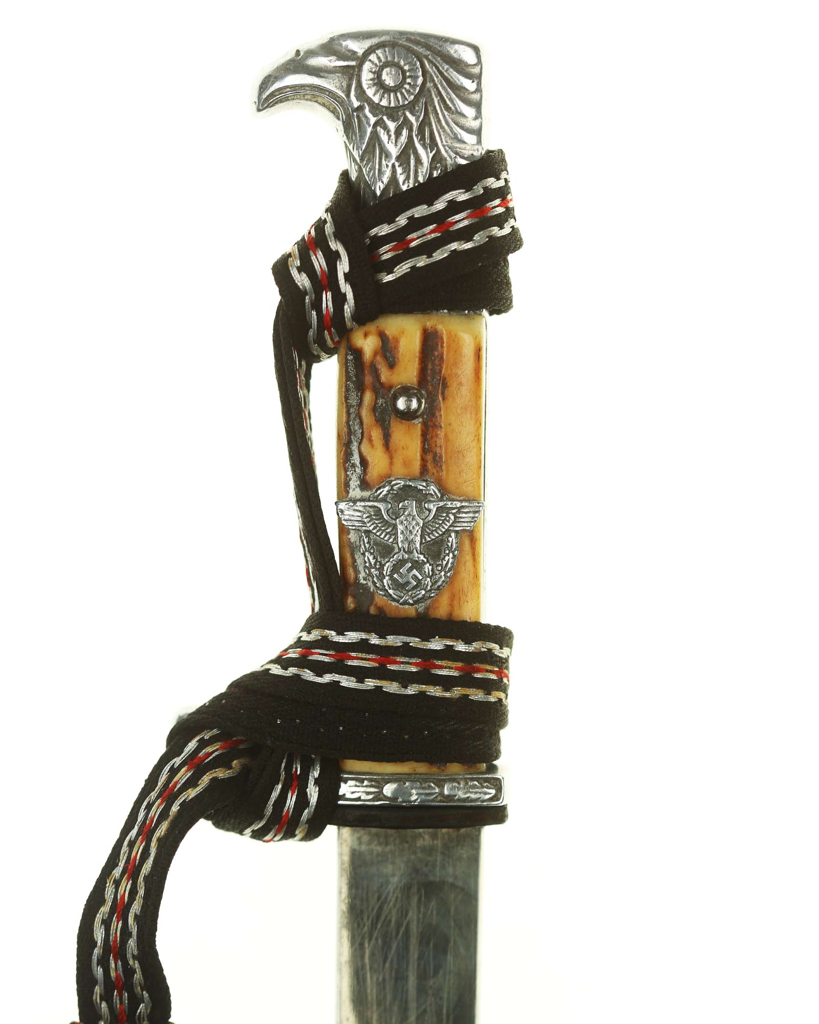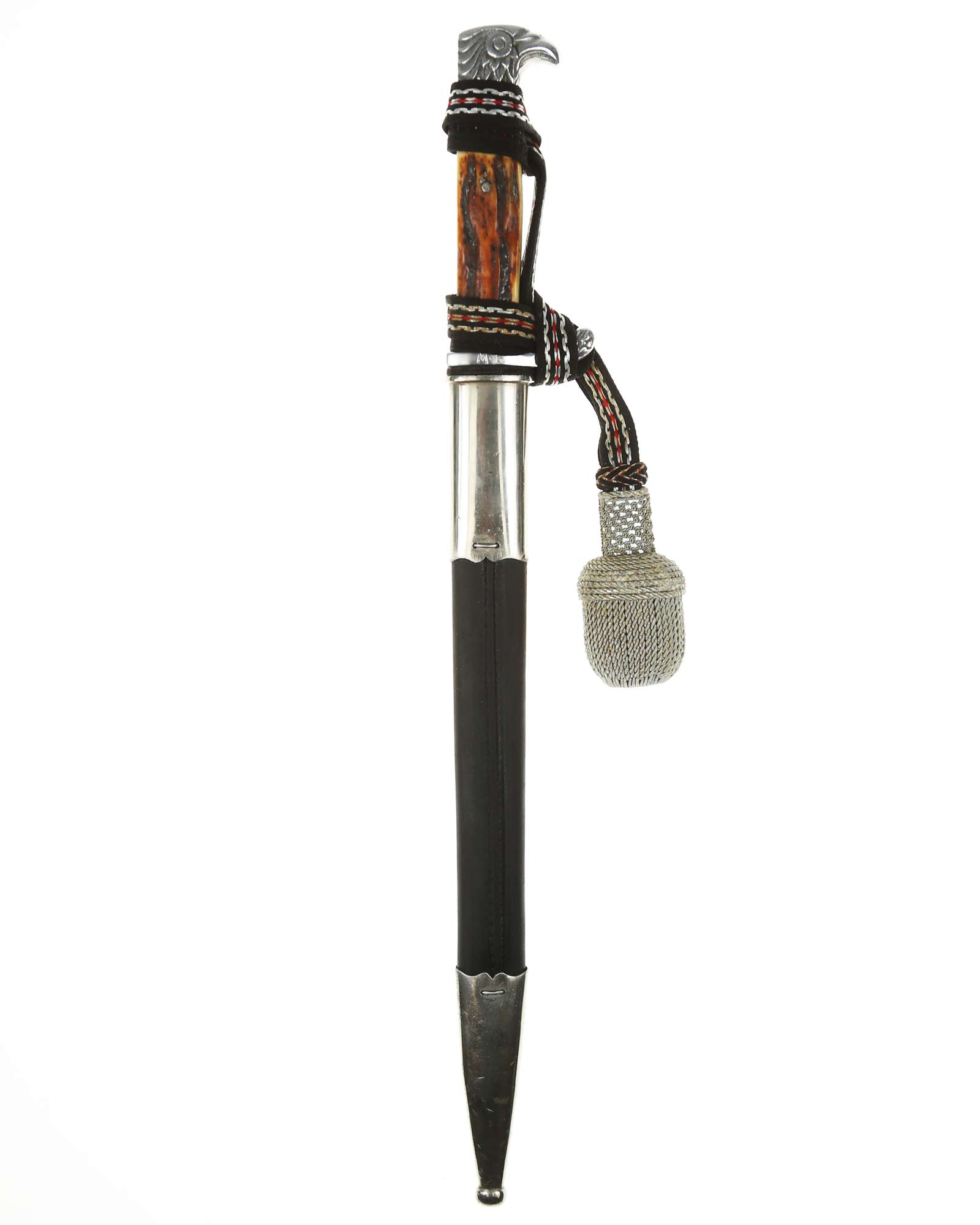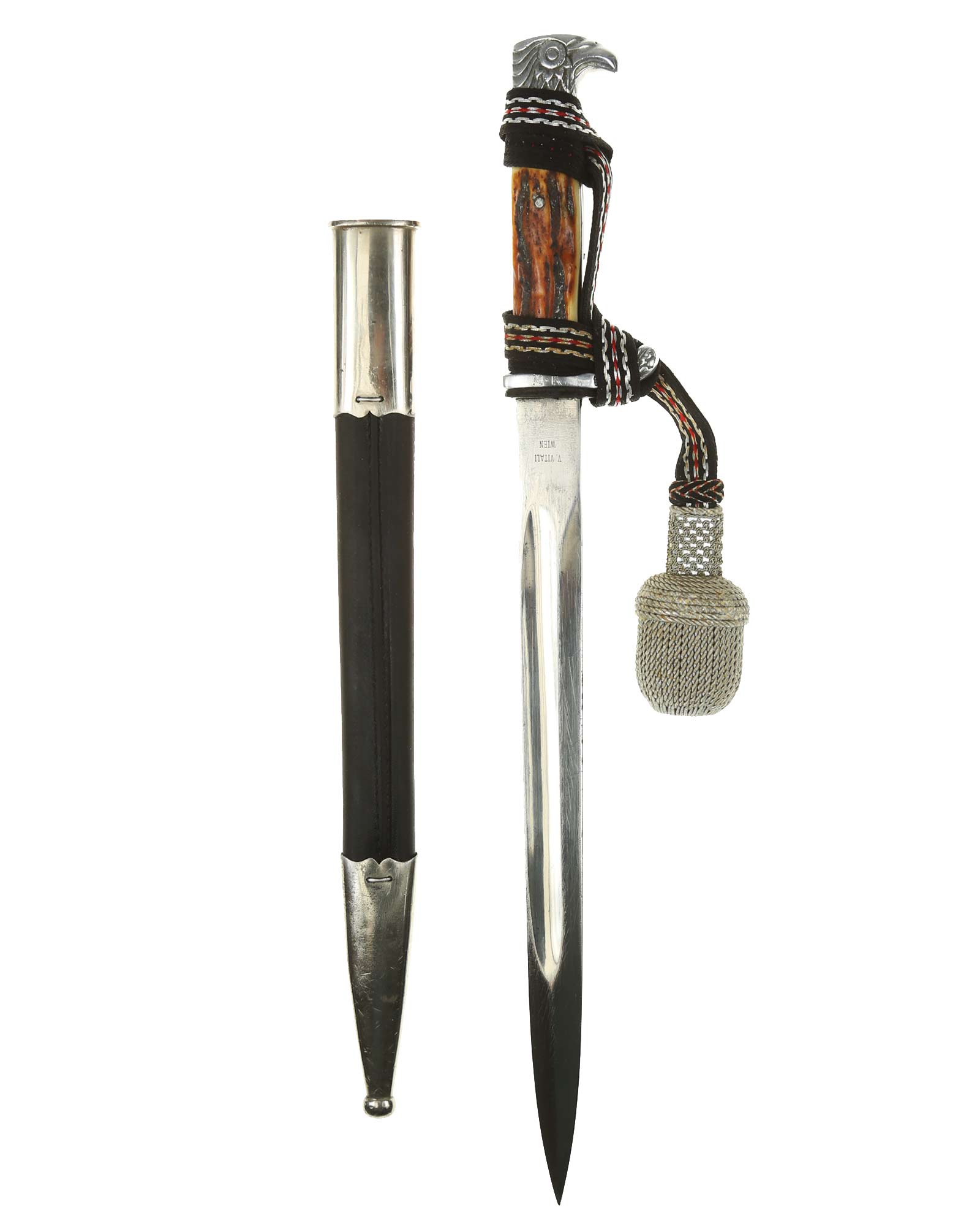 Штык парадный полицейский обр. 1934-45 гг. - В. Витали Вена. Эфес состоит из рукояти и крестовины. Щечки рукояти роговые, укреплены на черенке клинка при помощи двух заклепок. В центре одной из щечек располагается полицейская эмблема – орел в венке со свастикой в лапах. Головка рукояти рифленая, выполненная в виде головы орла. Крестовина с одной стороны вверх по направлению к клюву «орла». Клинок стальной, прямой, однолезвийный, с одним долом, никелированный. Клинок с клеймом изготовителя: V. Vitali Wien, с обеих сторон. На рукояти выгравировано имя владельца «Max. Hehs».