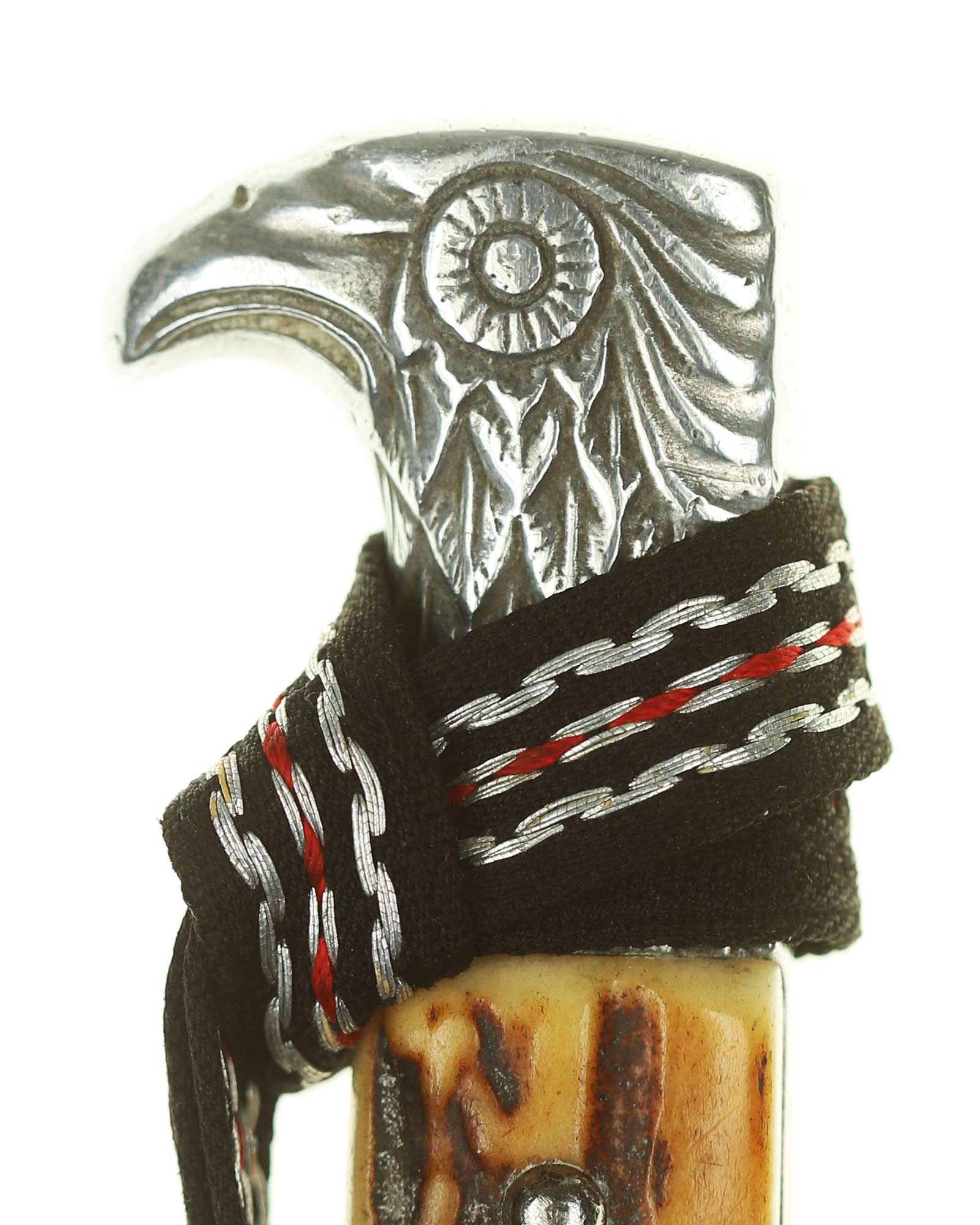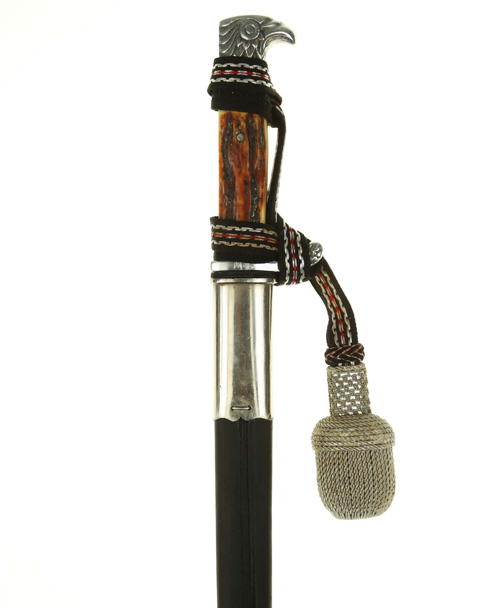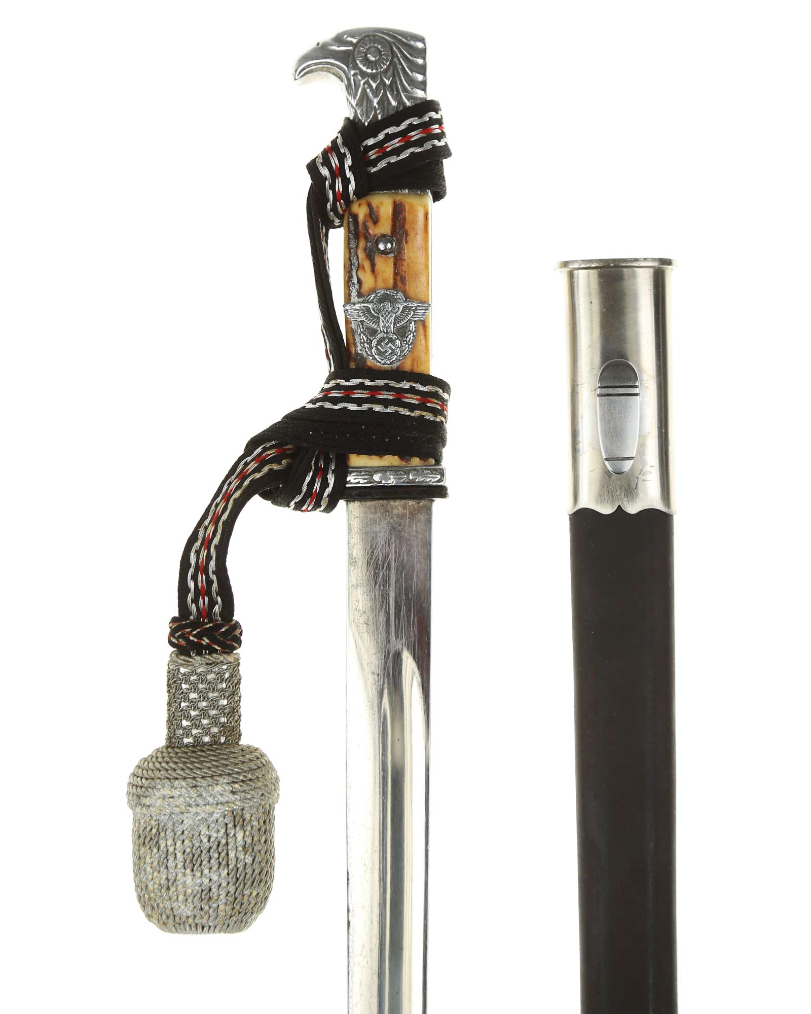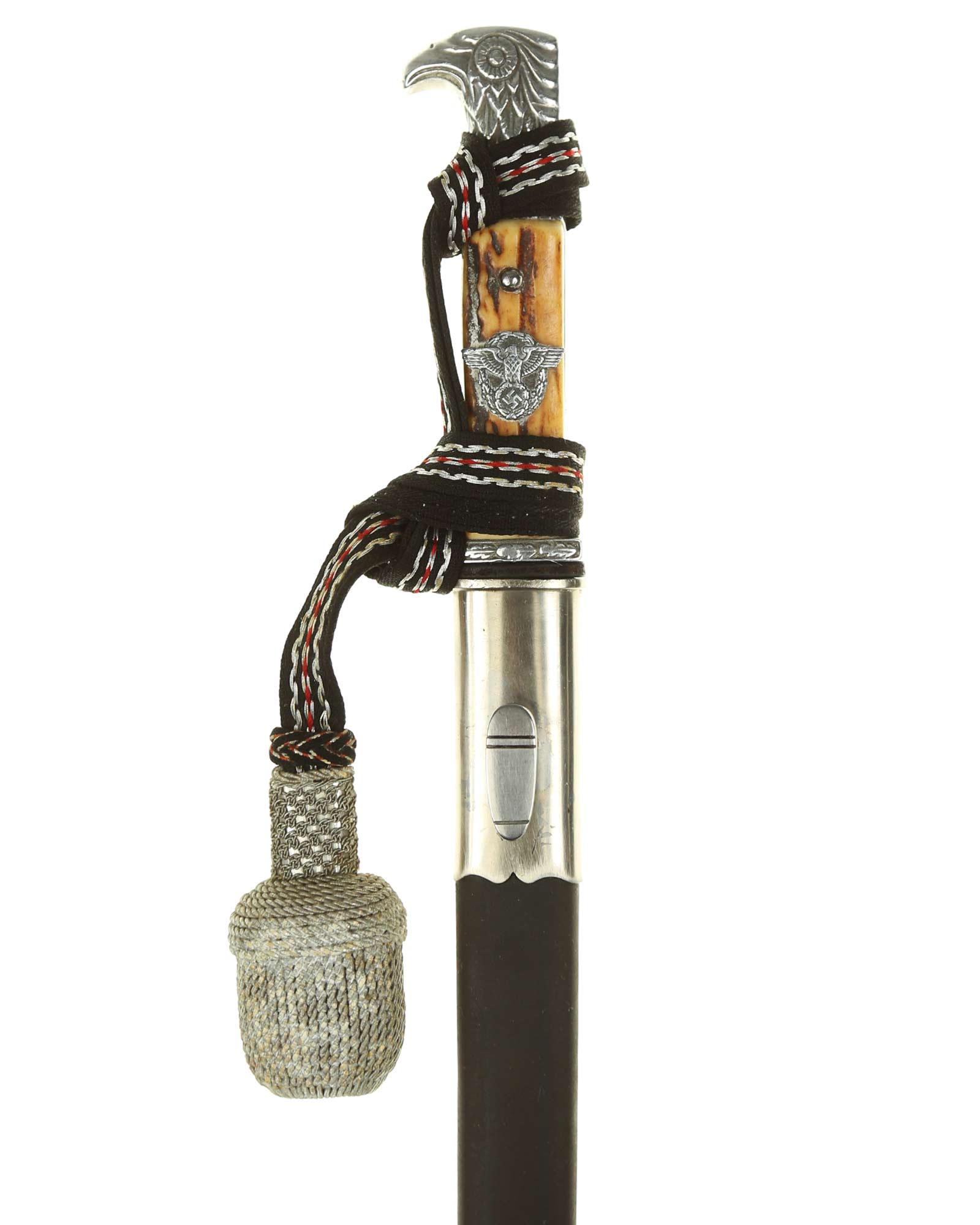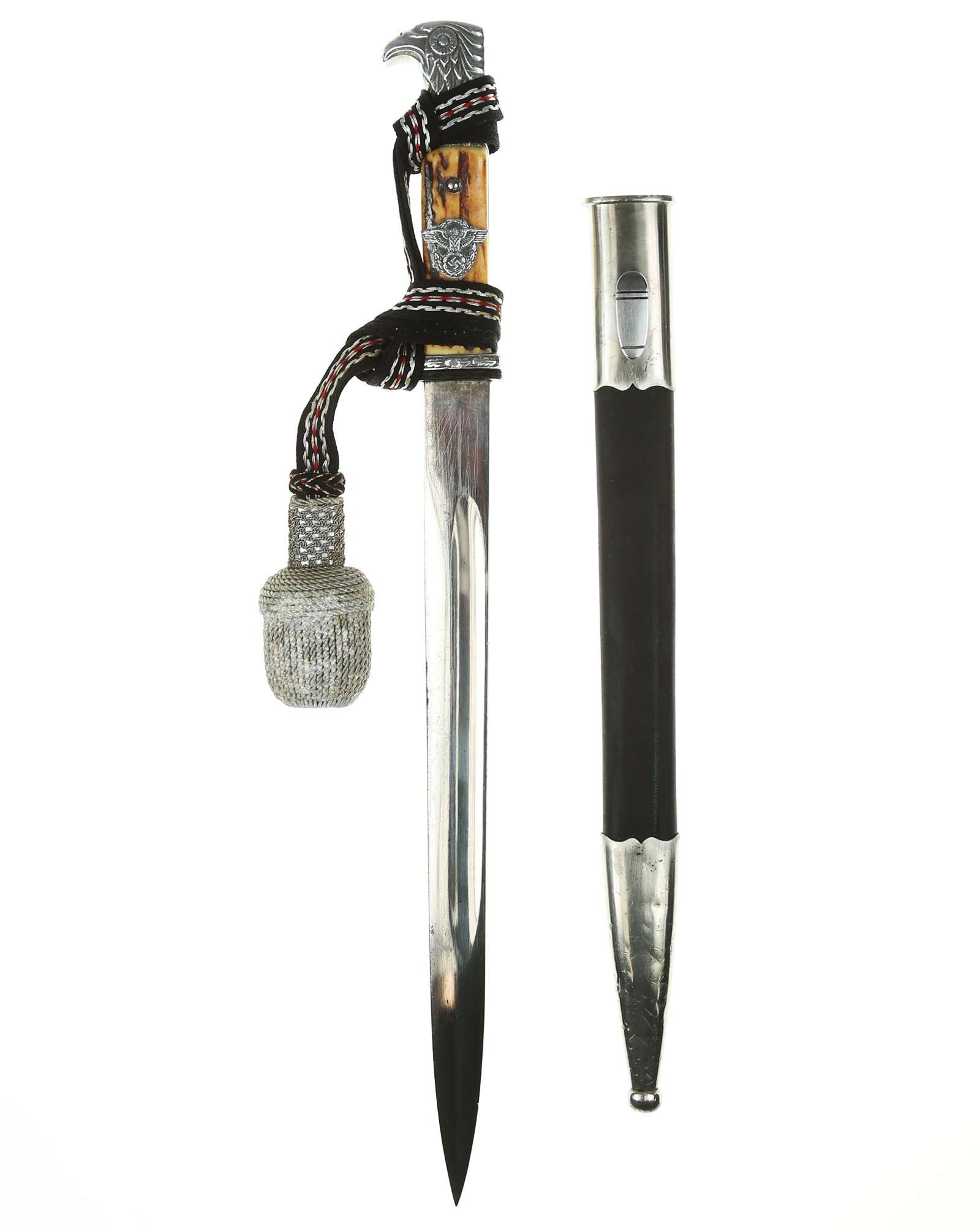 Штык парадный полицейский обр. 1934-45 гг. - В. Витали Вена. Эфес состоит из рукояти и крестовины. Щечки рукояти роговые, укреплены на черенке клинка при помощи двух заклепок. В центре одной из щечек располагается полицейская эмблема – орел в венке со свастикой в лапах. Головка рукояти рифленая, выполненная в виде головы орла. Крестовина с одной стороны вверх по направлению к клюву «орла». Клинок стальной, прямой, однолезвийный, с одним долом, никелированный. Клинок с клеймом изготовителя: V. Vitali Wien, с обеих сторон. На рукояти выгравировано имя владельца «Max. Hehs».