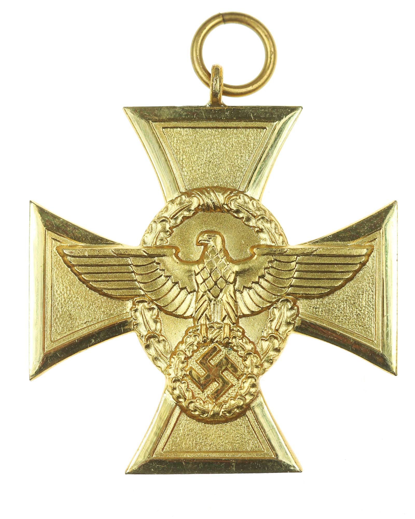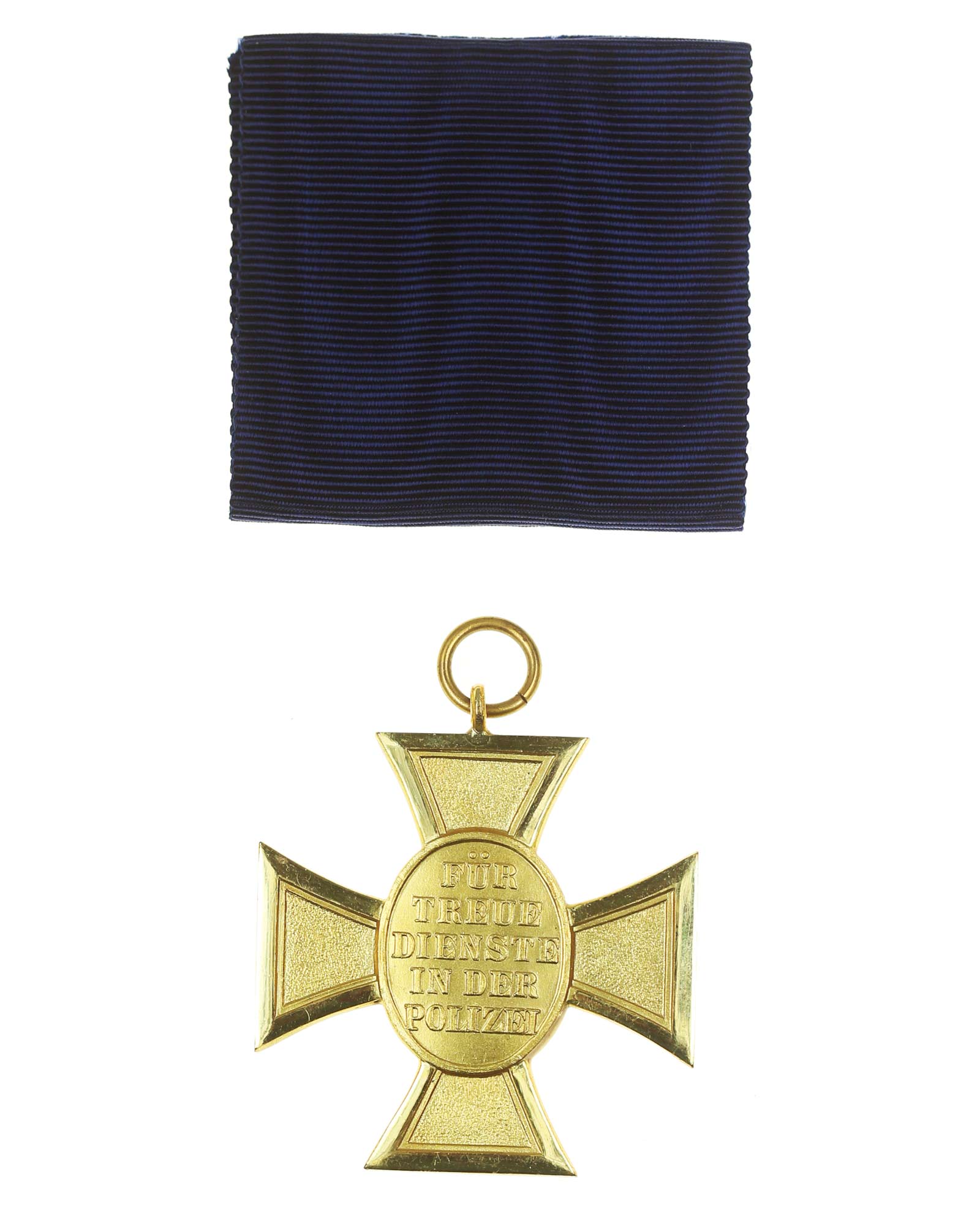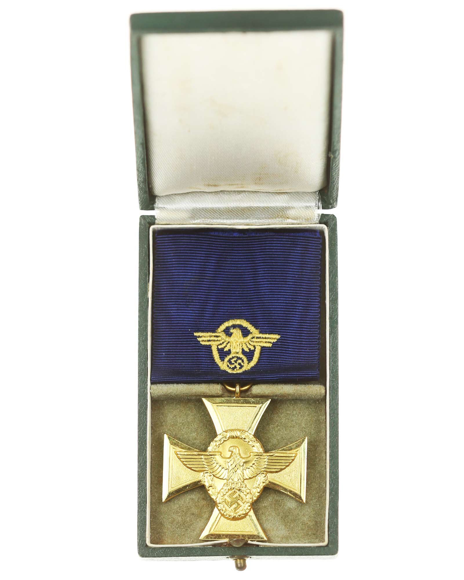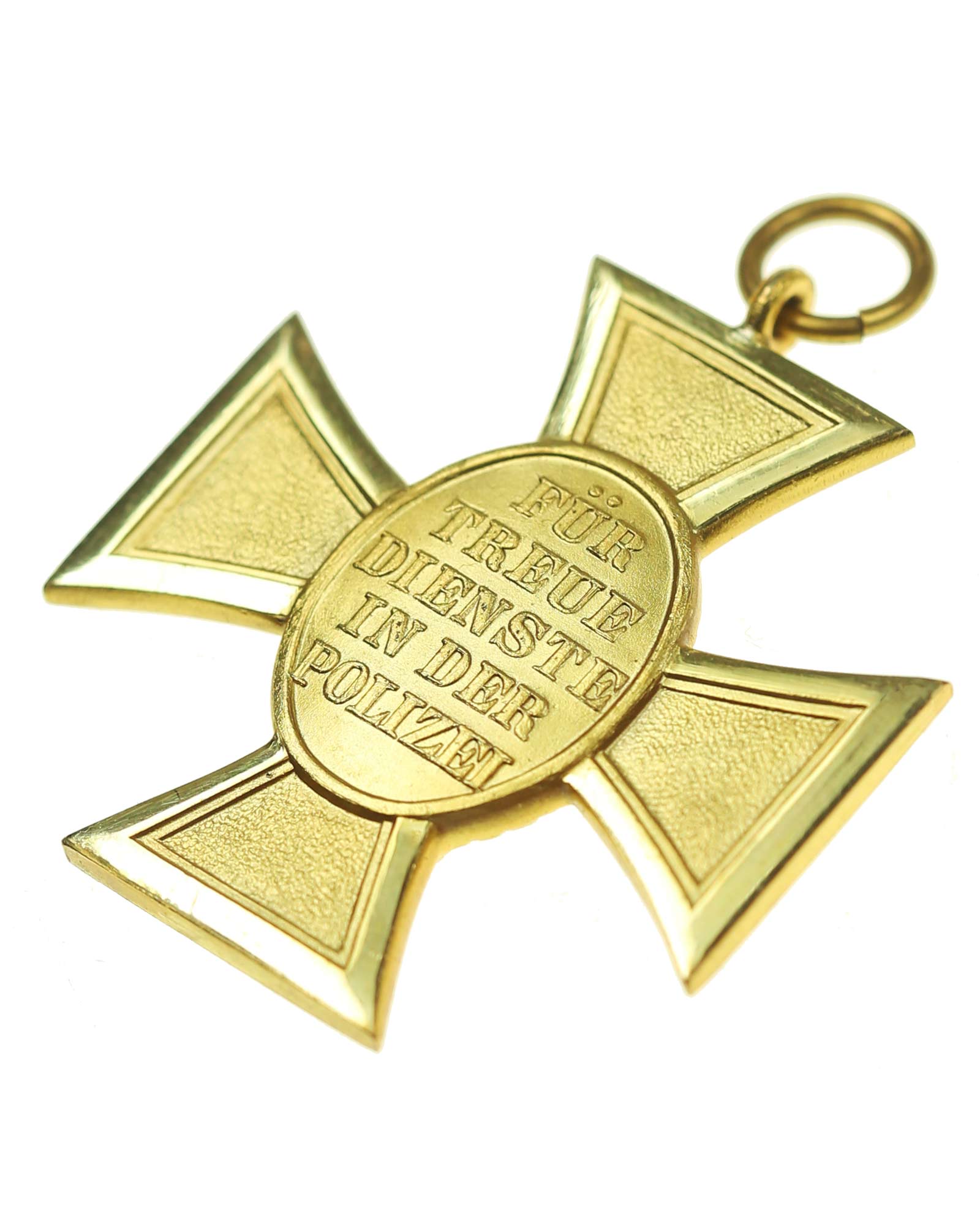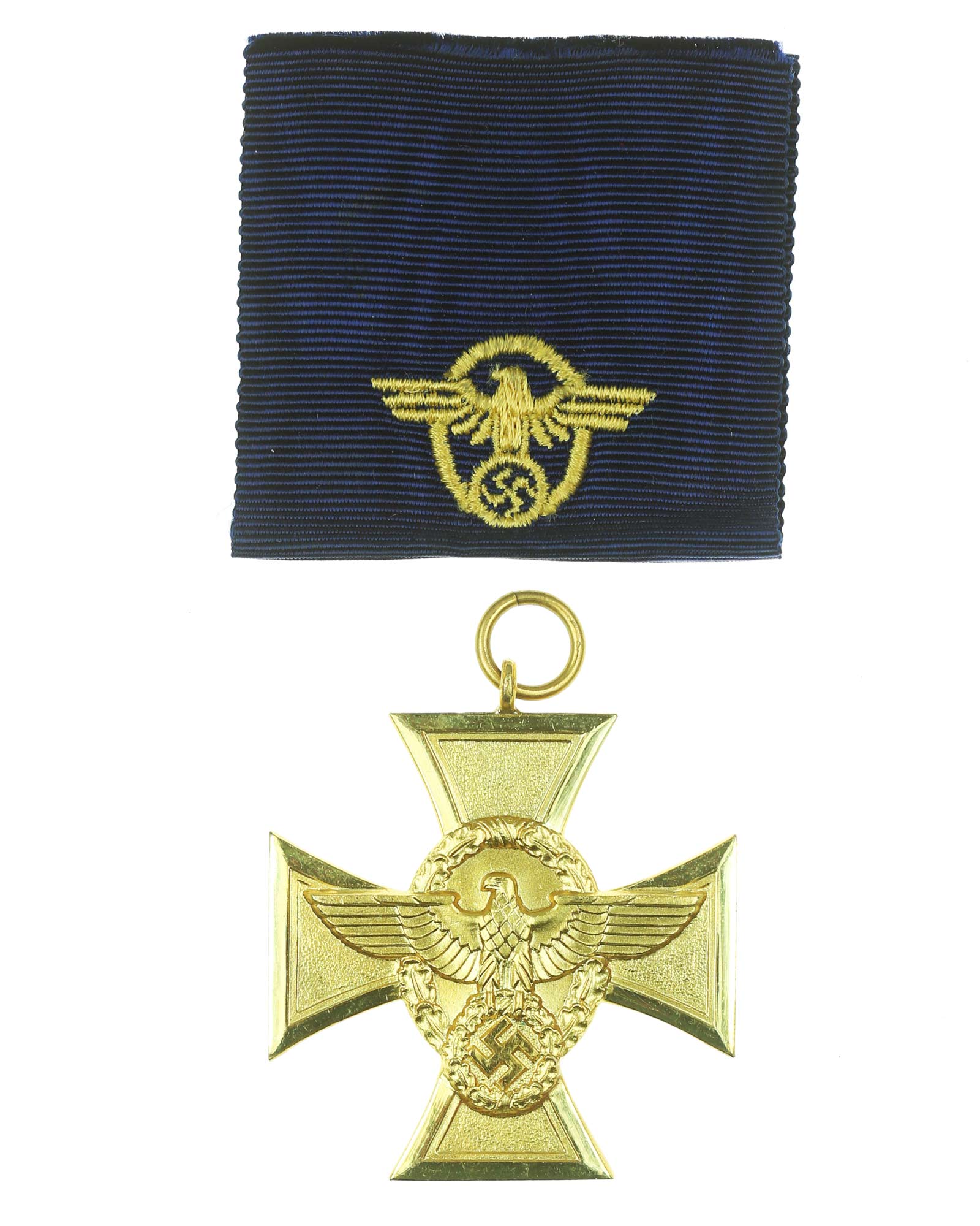 Награда за службу в полиции 1-го уровня за 25 лет. Позолоченный цветной металл, широкая лента с вышитым национальным орлом, в наградном футляре с золотым оттиском. На обороте надпись: ЗА ВЕРНУЮ СЛУЖБУ В ПОЛИЦИИ. Общий вес 23 г. Размеры: 43,43 x 43,45 мм. Соответствующее удостоверение с оригинальной подписью фюрера/рейхсканцлера Адольфа Гитлера.