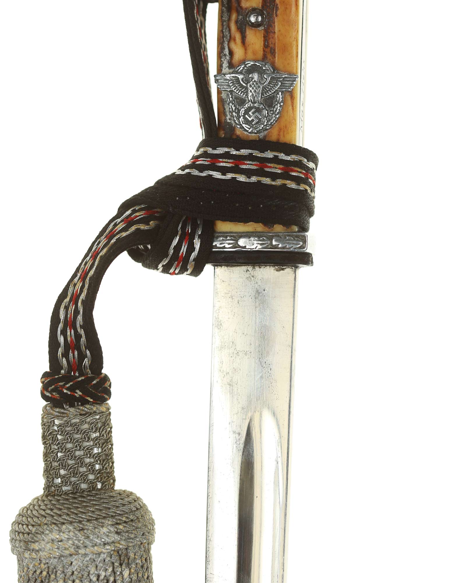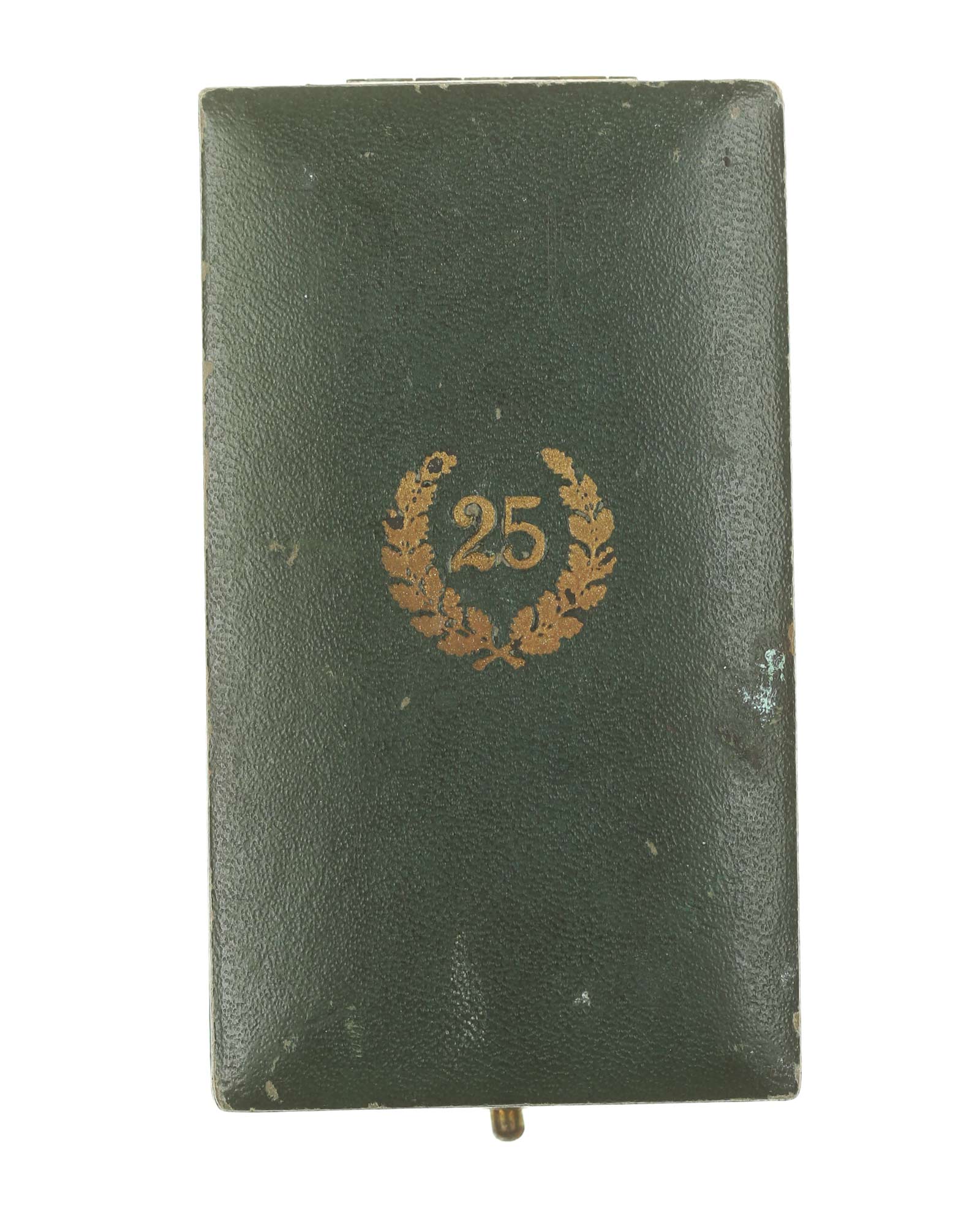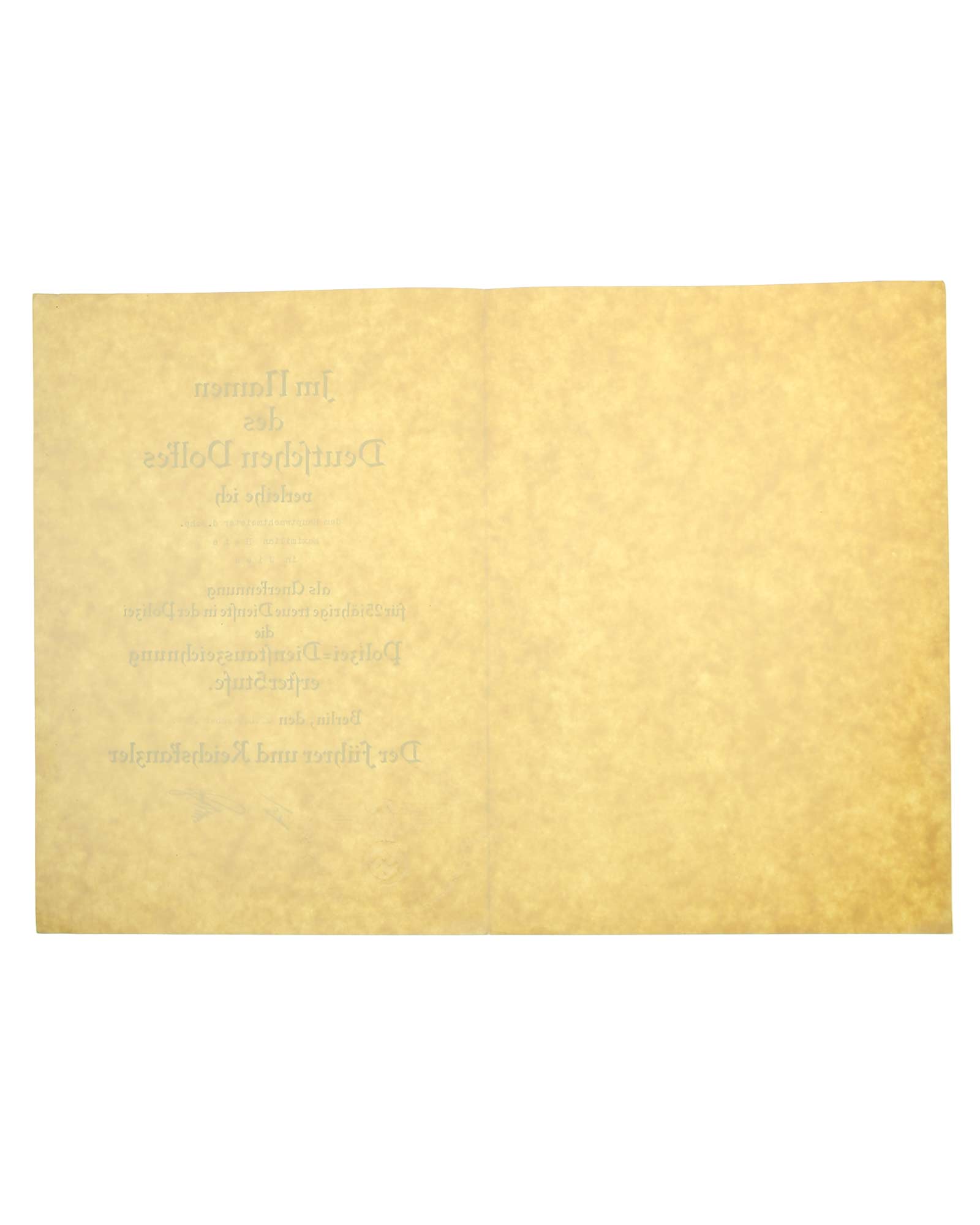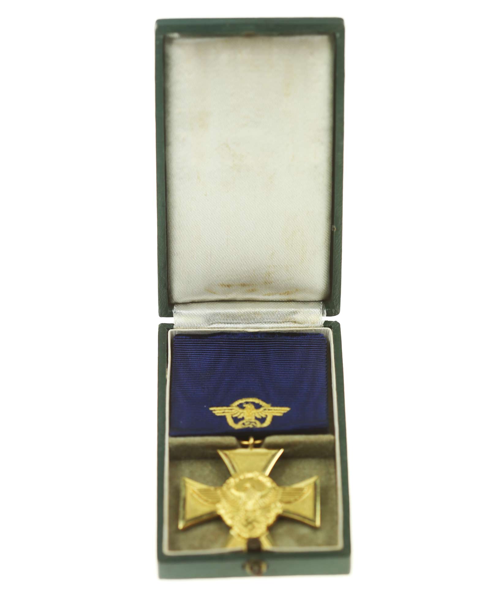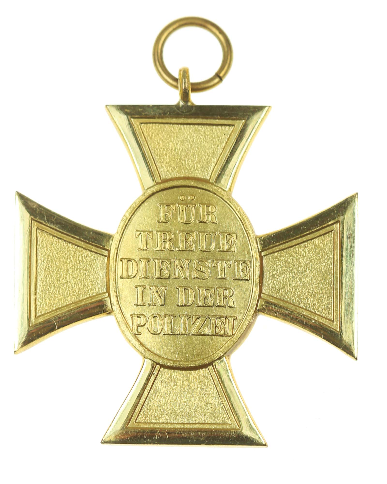 Награда за службу в полиции 1-го уровня за 25 лет. Позолоченный цветной металл, широкая лента с вышитым национальным орлом, в наградном футляре с золотым оттиском. На обороте надпись: ЗА ВЕРНУЮ СЛУЖБУ В ПОЛИЦИИ. Общий вес 23 г. Размеры: 43,43 x 43,45 мм. Соответствующее удостоверение с оригинальной подписью фюрера/рейхсканцлера Адольфа Гитлера.