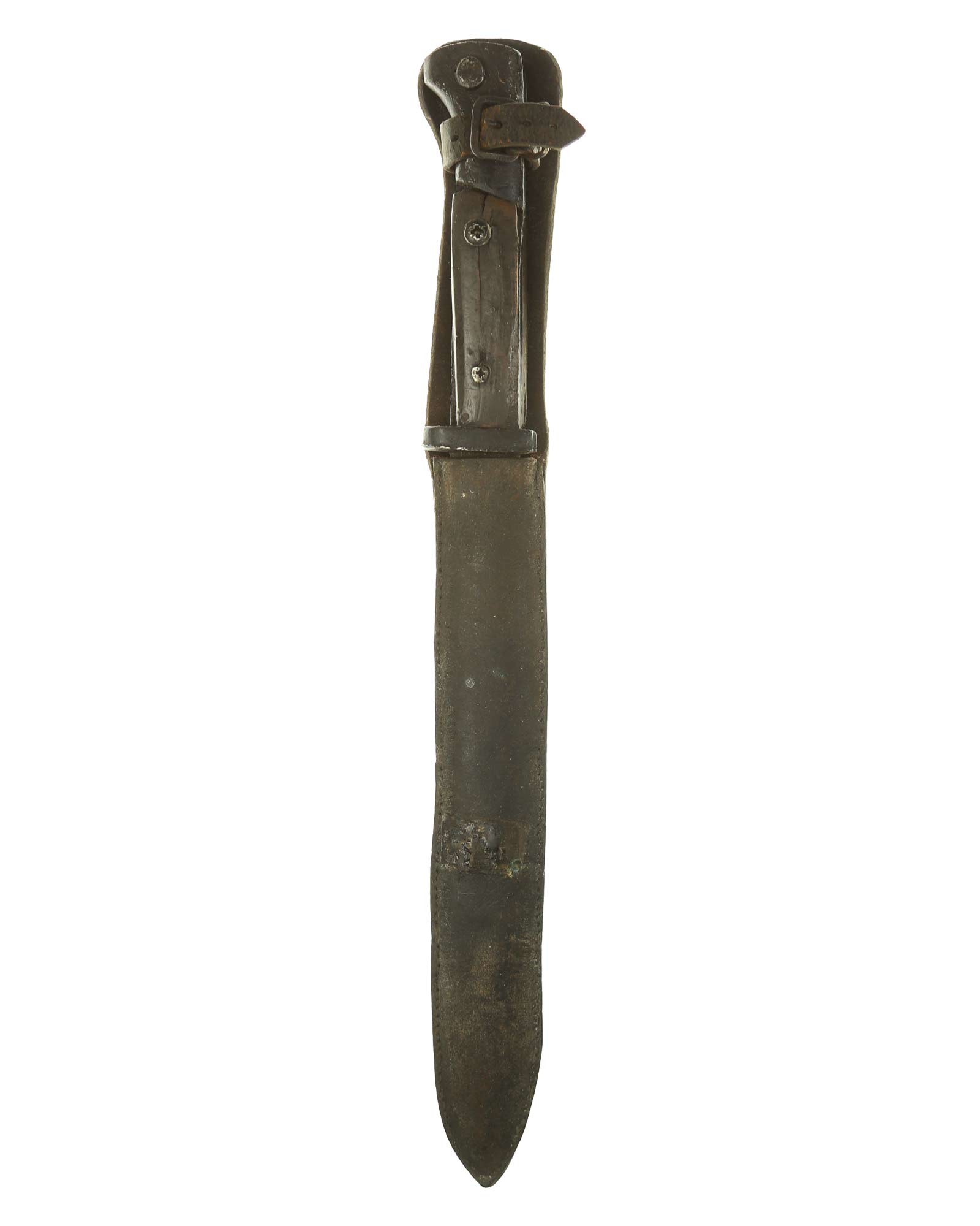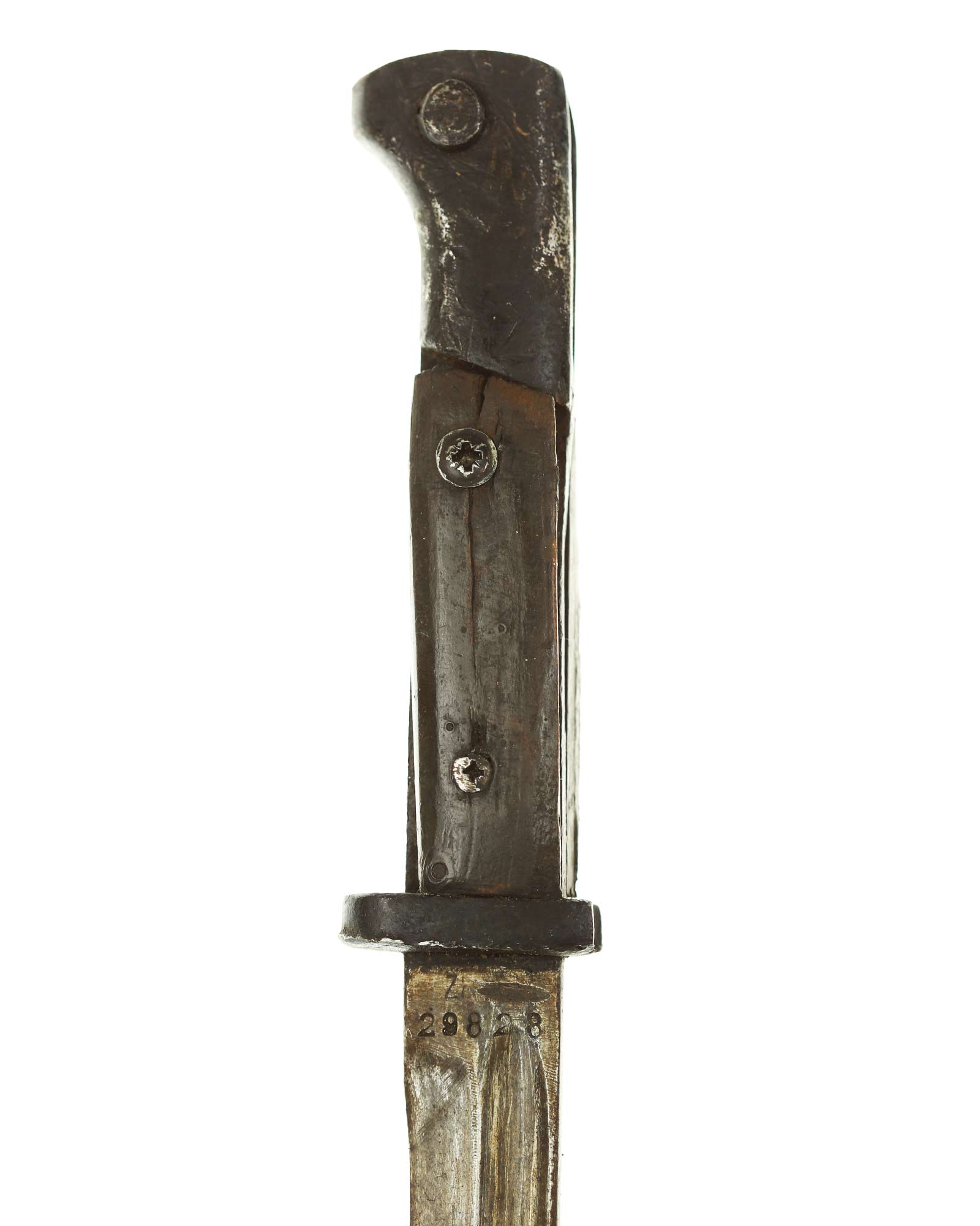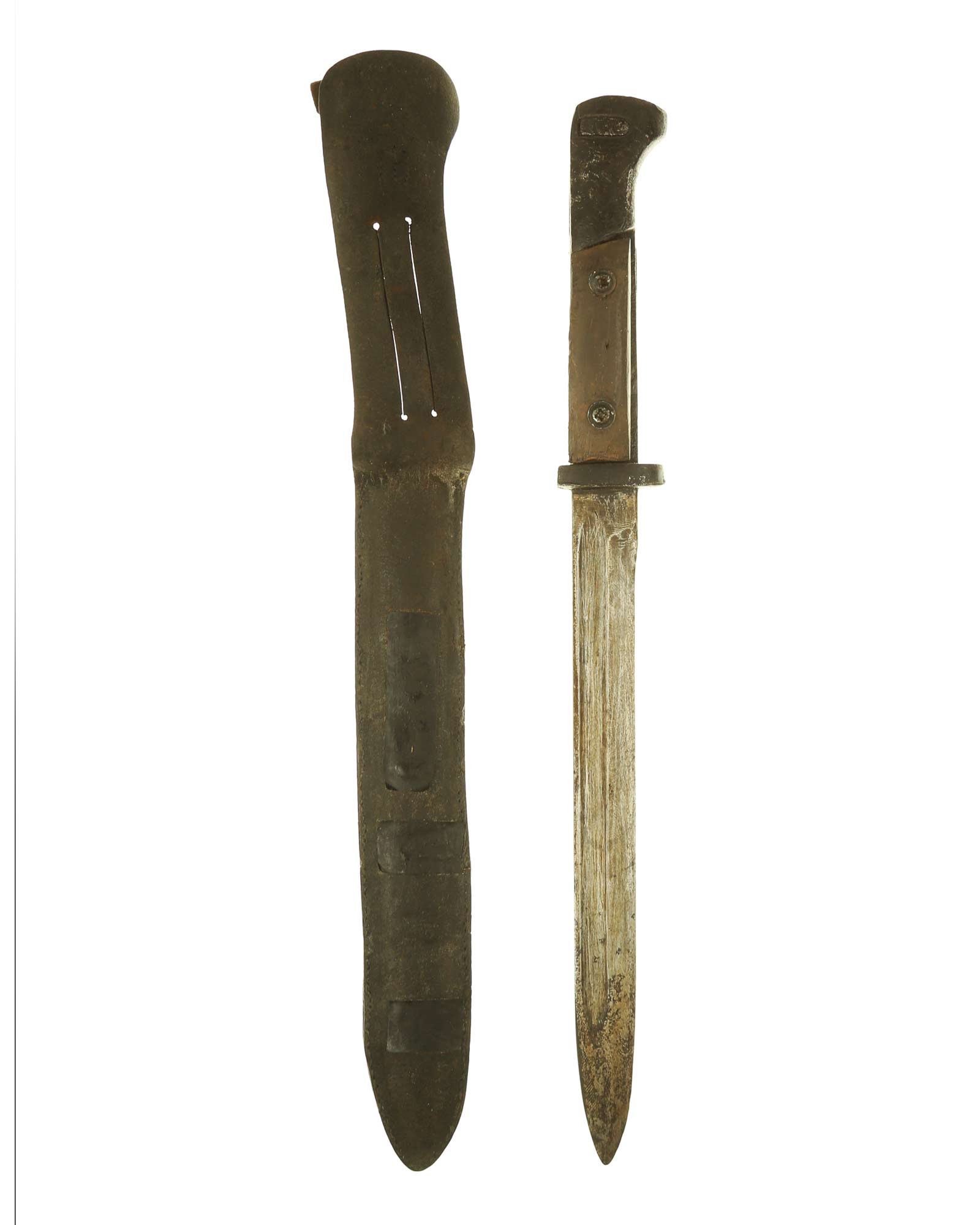 Штык-нож к винтовкам и карабинам системы Маузера. Рукоять образована двумя щечками, скрепленными с хвостовиком двумя винтами. В головке рукояти располагается Т-образный паз и пружинная защелка с внутренним расположением спиральной пружины. Клинок прямой, стальной. Боевой конец двулезвийный.