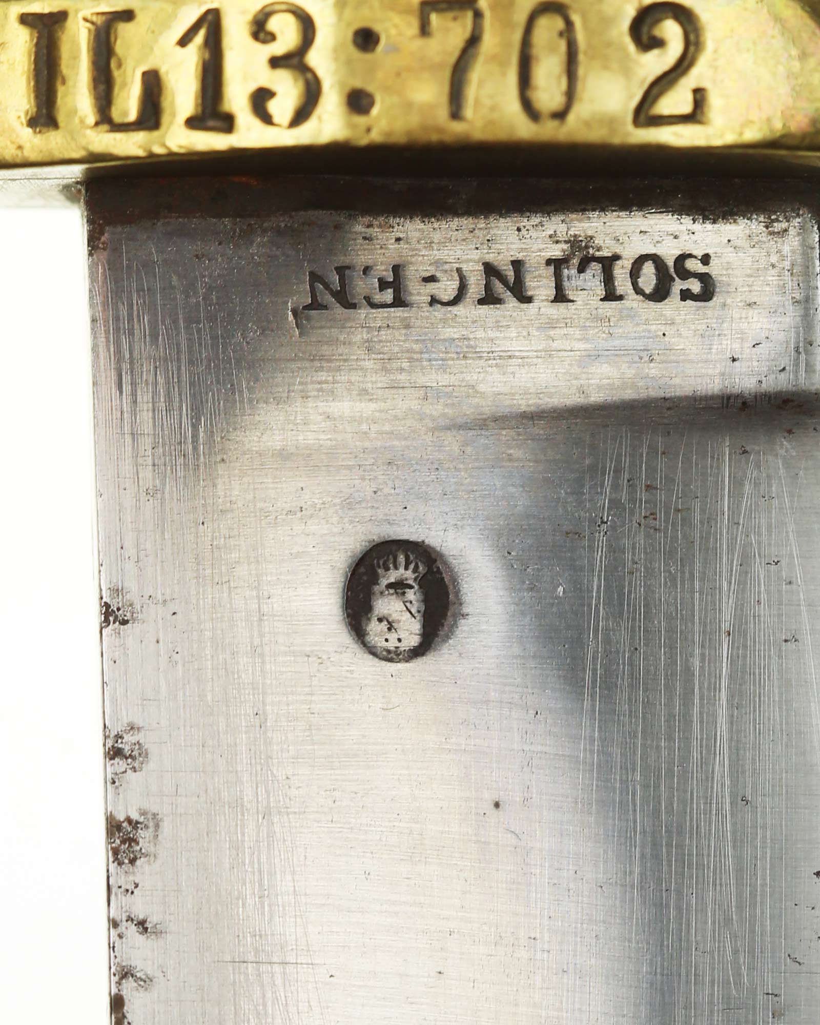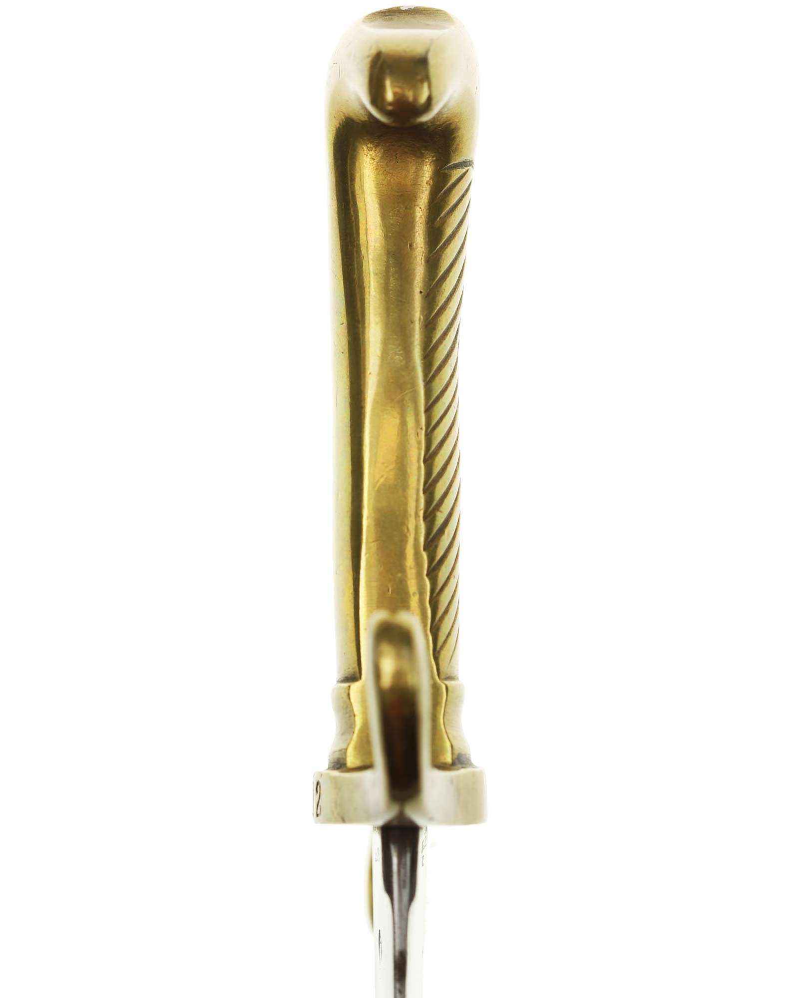 Рукоять: Эфес латунный, состоит из рукояти и гарды. Рукоять с поперечными желобками и гладкой спинкой, которая плавно переходит в округлую головку. Гарда образована передней защитной дужкой, переходящей в крестовину. Дальний конец крестовины округлый и загнут в сторону клинка.