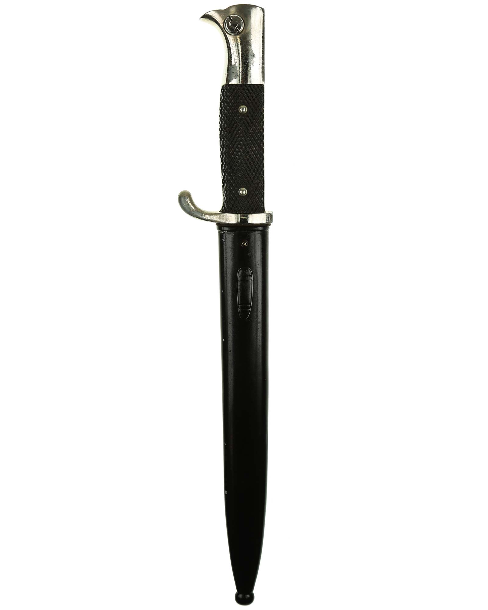 Штык внестроевой обр. 1933-45 гг. (тип KS98). Рукоять образована двумя пластмассовыми рифлеными щечками, скрепленными с хвостовиком клинка заклепками. Головка рукояти стилизована под птичью голову. Клинок прямой, стальной, однолезвийный, с долом на каждой стороне и пилой на обухе. Ножны стальные, окрашены в черный цвет, с крючком и шариком на конце. На пяте клинка имеется клеймо известного производителя - WKC Solingen, клеймо немецкой фирмы «Вайерсберг, Киршбаум & Ко.» Золинген.