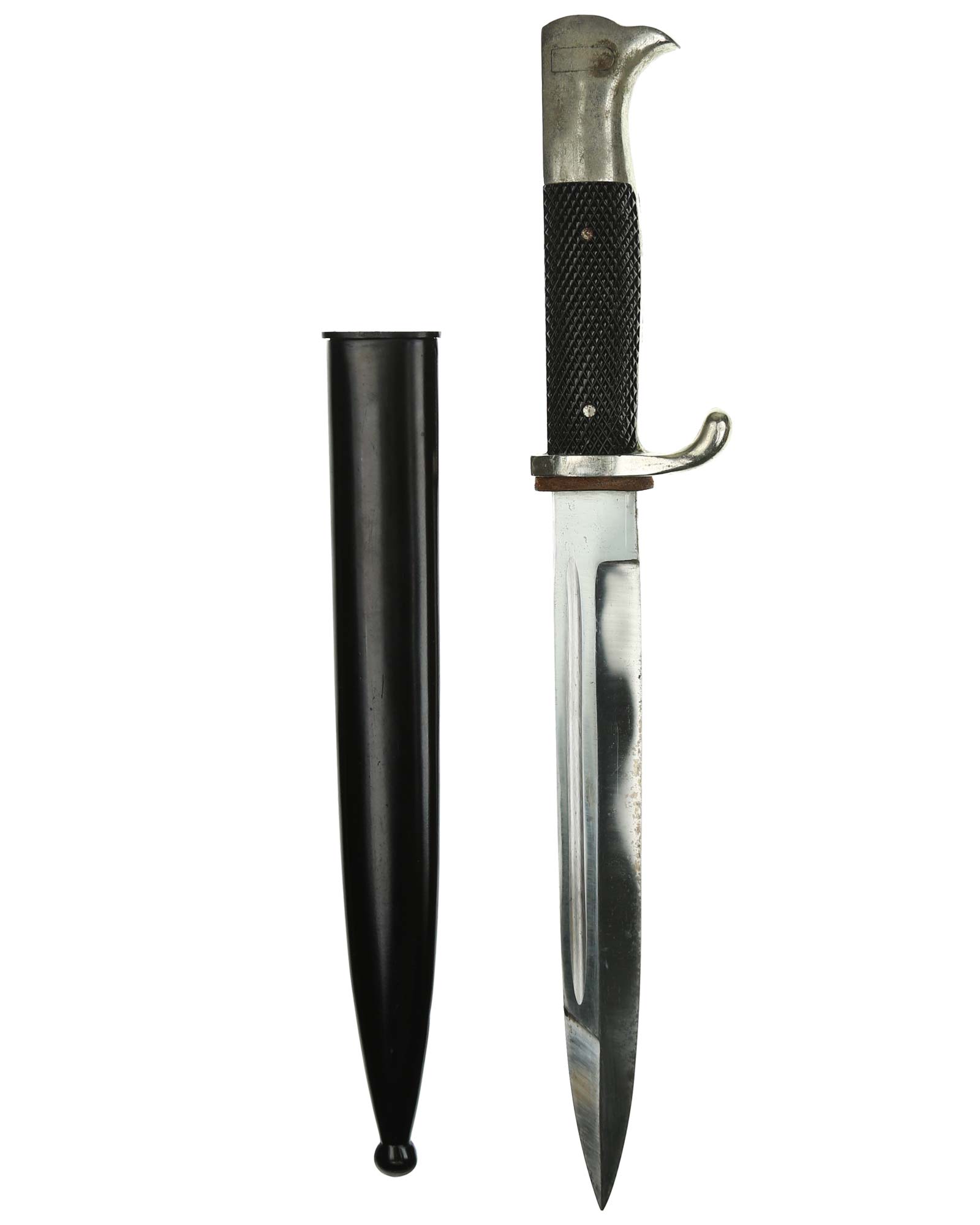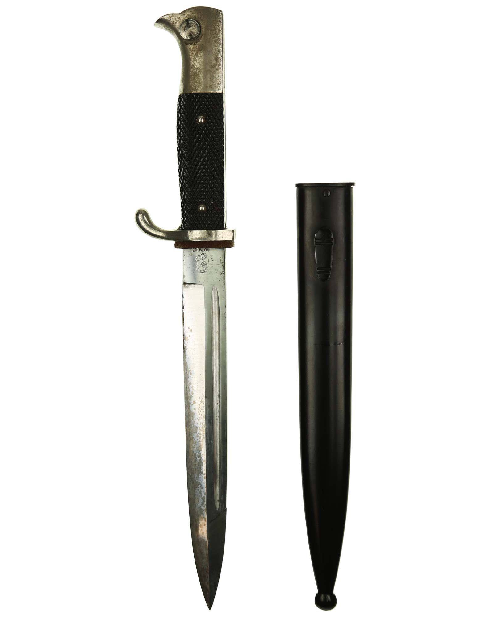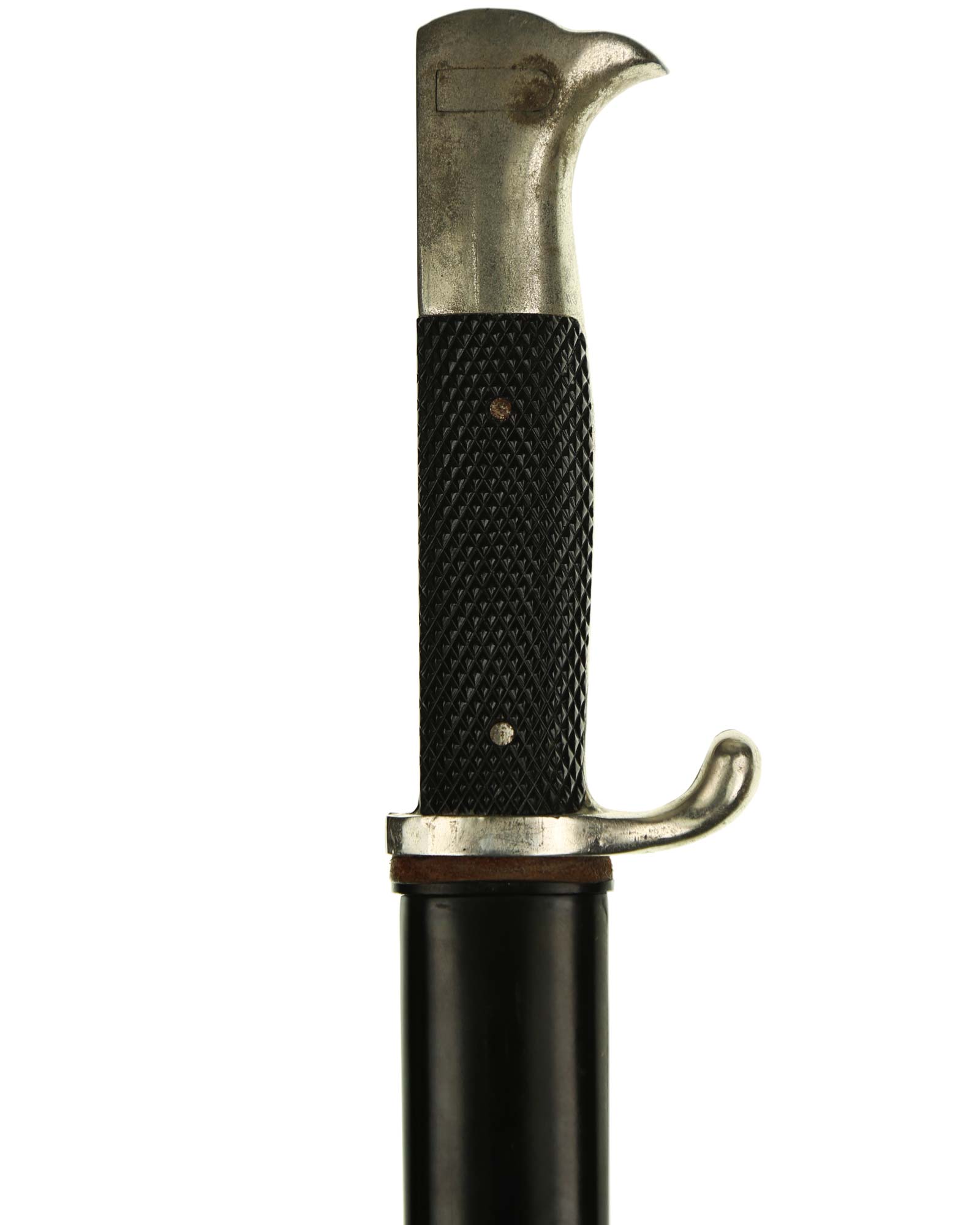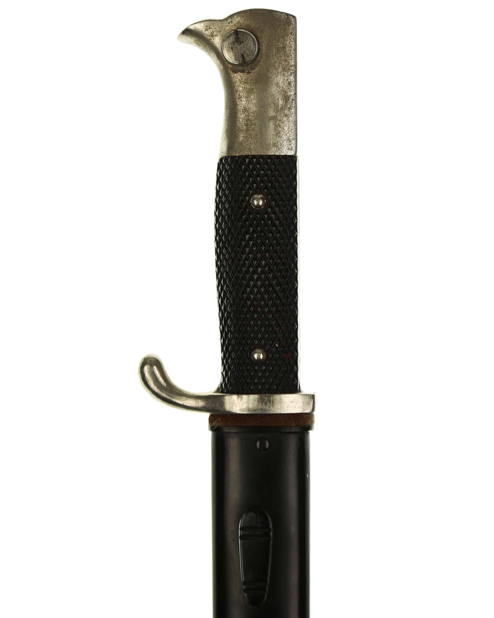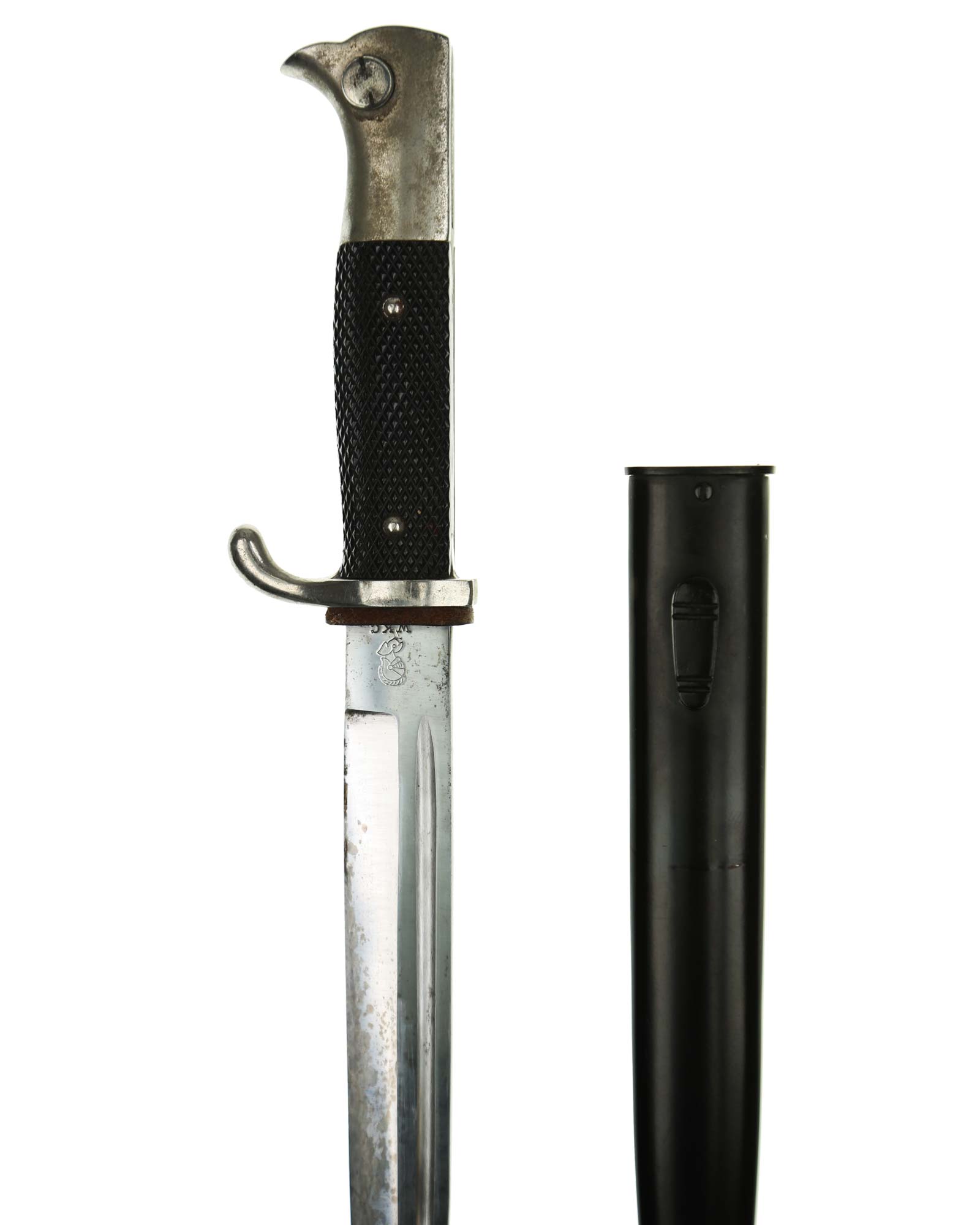 Штык внестроевой обр. 1933-45 гг. (тип KS98). Рукоять образована двумя пластмассовыми рифлеными щечками, скрепленными с хвостовиком клинка заклепками. Головка рукояти стилизована под птичью голову. Клинок прямой, стальной, однолезвийный, с долом на каждой стороне и пилой на обухе. Ножны стальные, окрашены в черный цвет, с крючком и шариком на конце. На пяте клинка имеется клеймо известного производителя - WKC Solingen.