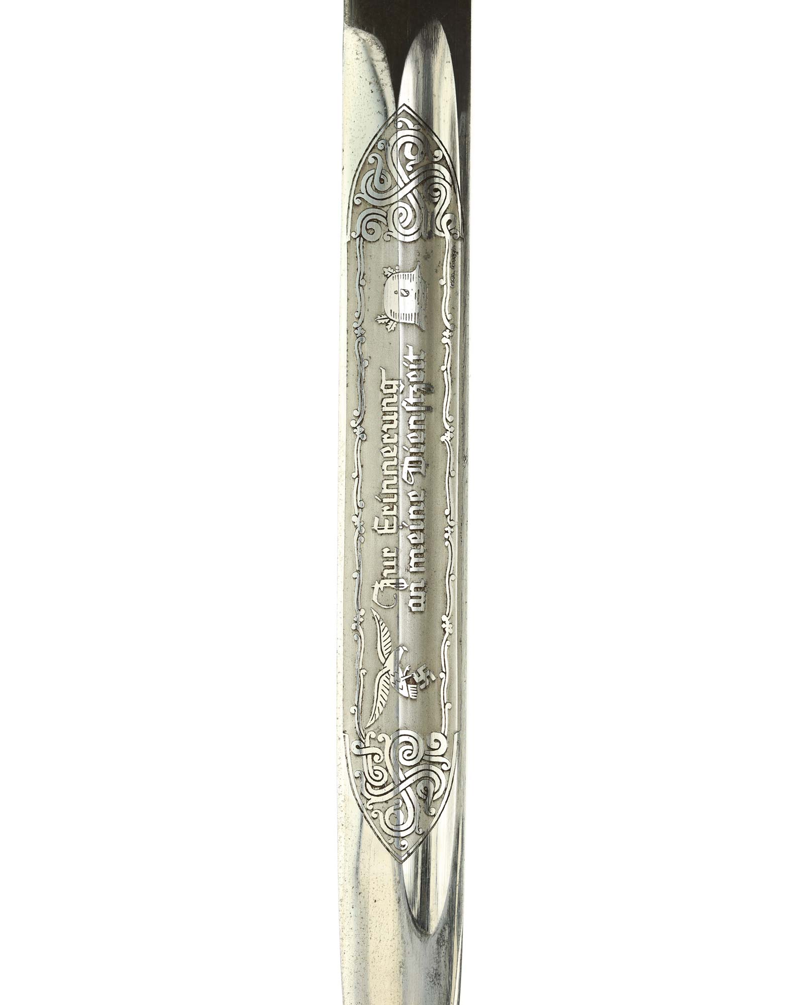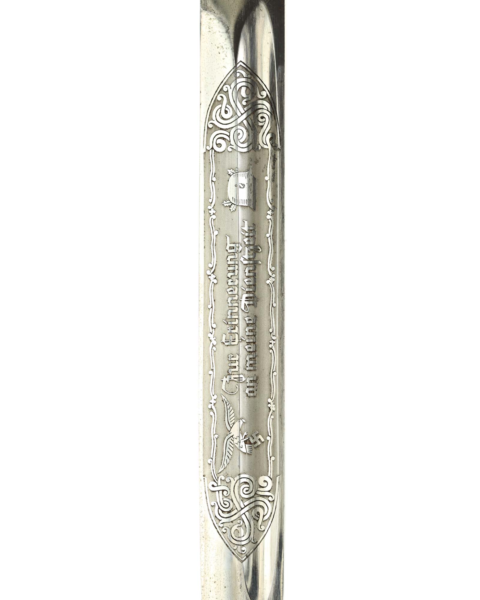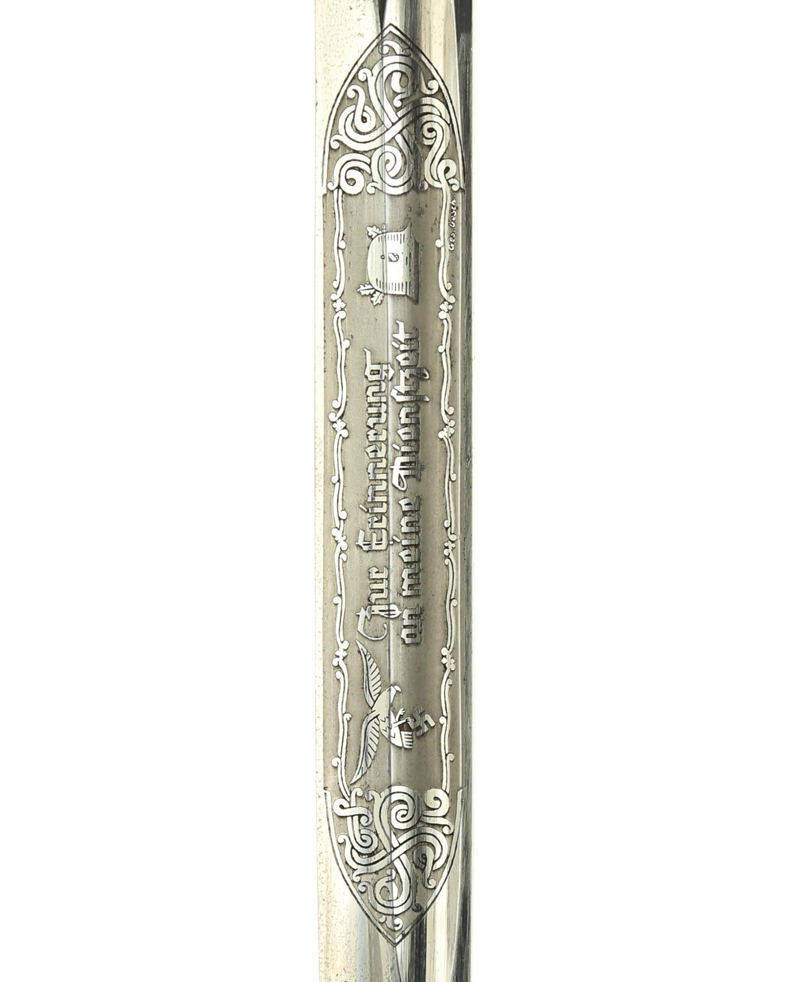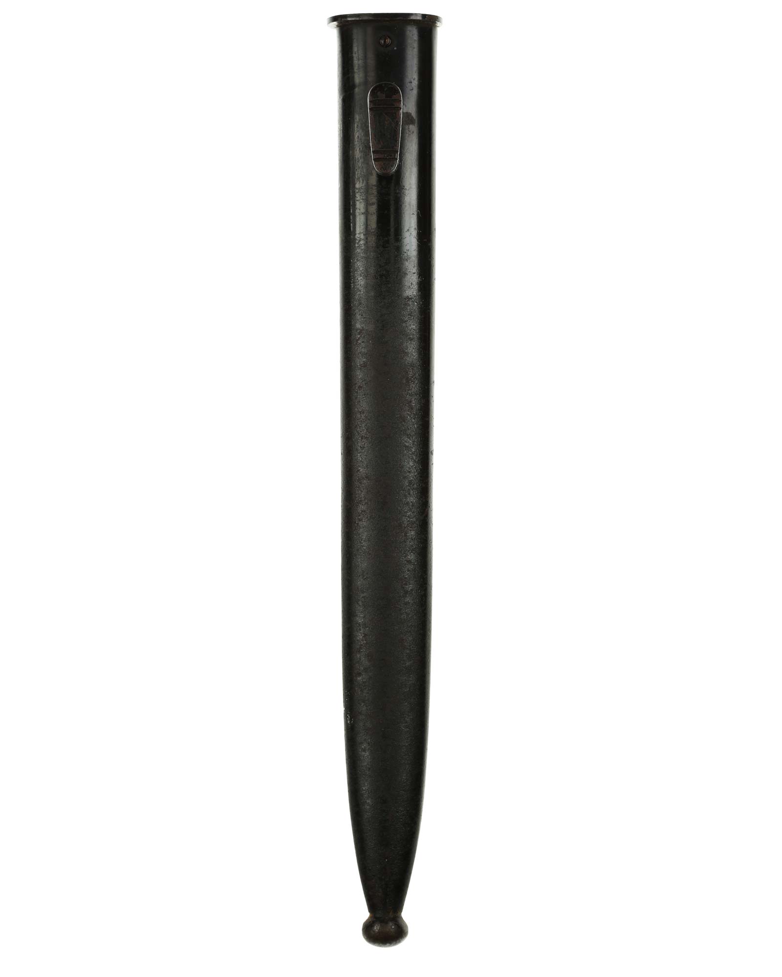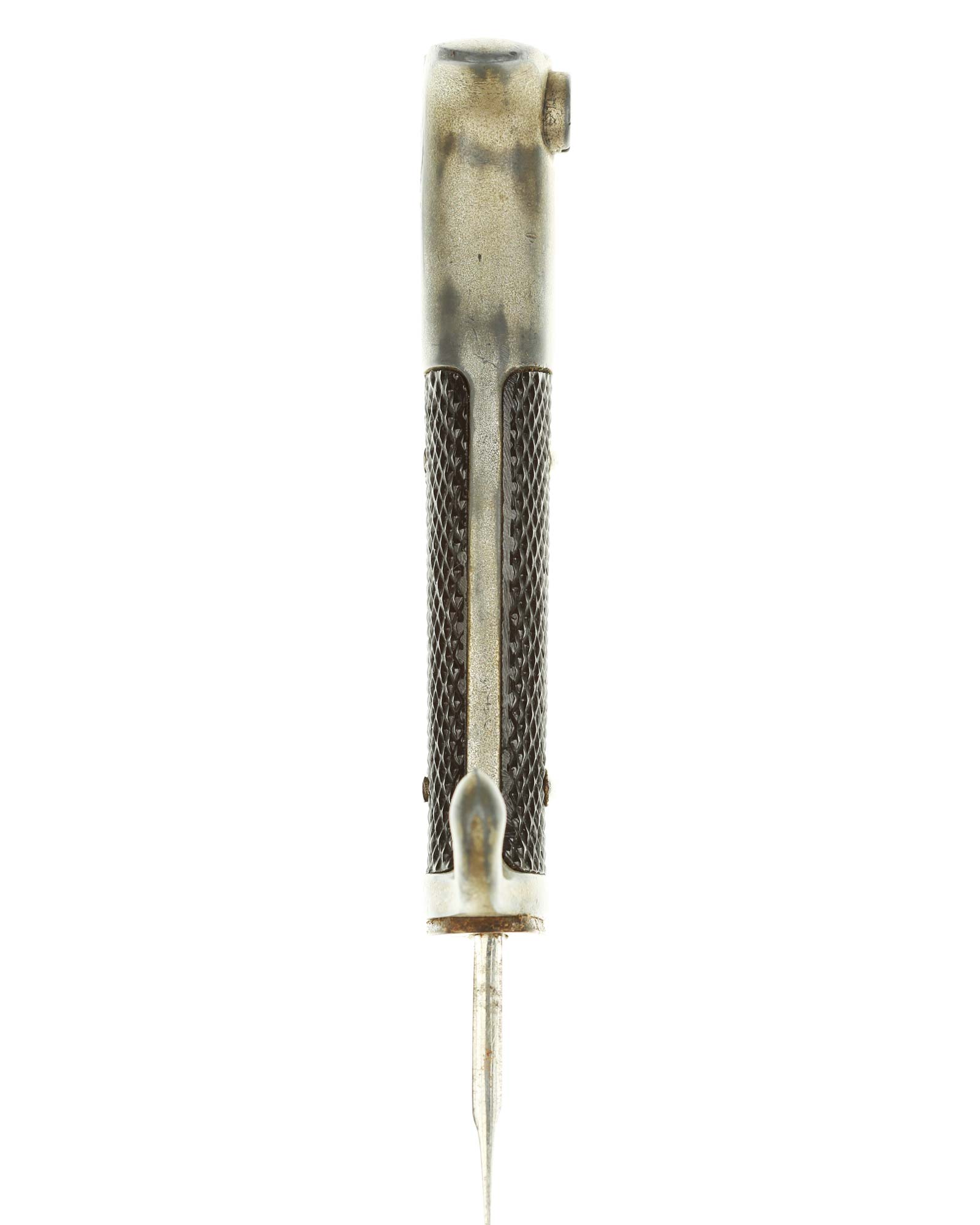 Парадный (внестроевой) штык к винтовке Маузер с травленым (Luftwaffe) украшенным клинком. Клинок никелированный с красиво оформленной травленой готической надписью: "Zur Erinnerung an meine Dienstzeit" - "Память о моей службе". На пяте клинка имеется клеймо известного производителя - Perfectum Solingen, клеймо немецкой фирмы «ПЕРФЕКТУМ » Золинген. Элементы рукояти также никелированные, щечки изготовлены из черной рифленой пластмассы. Ножны металлические, выкрашенные в черный цвет.
