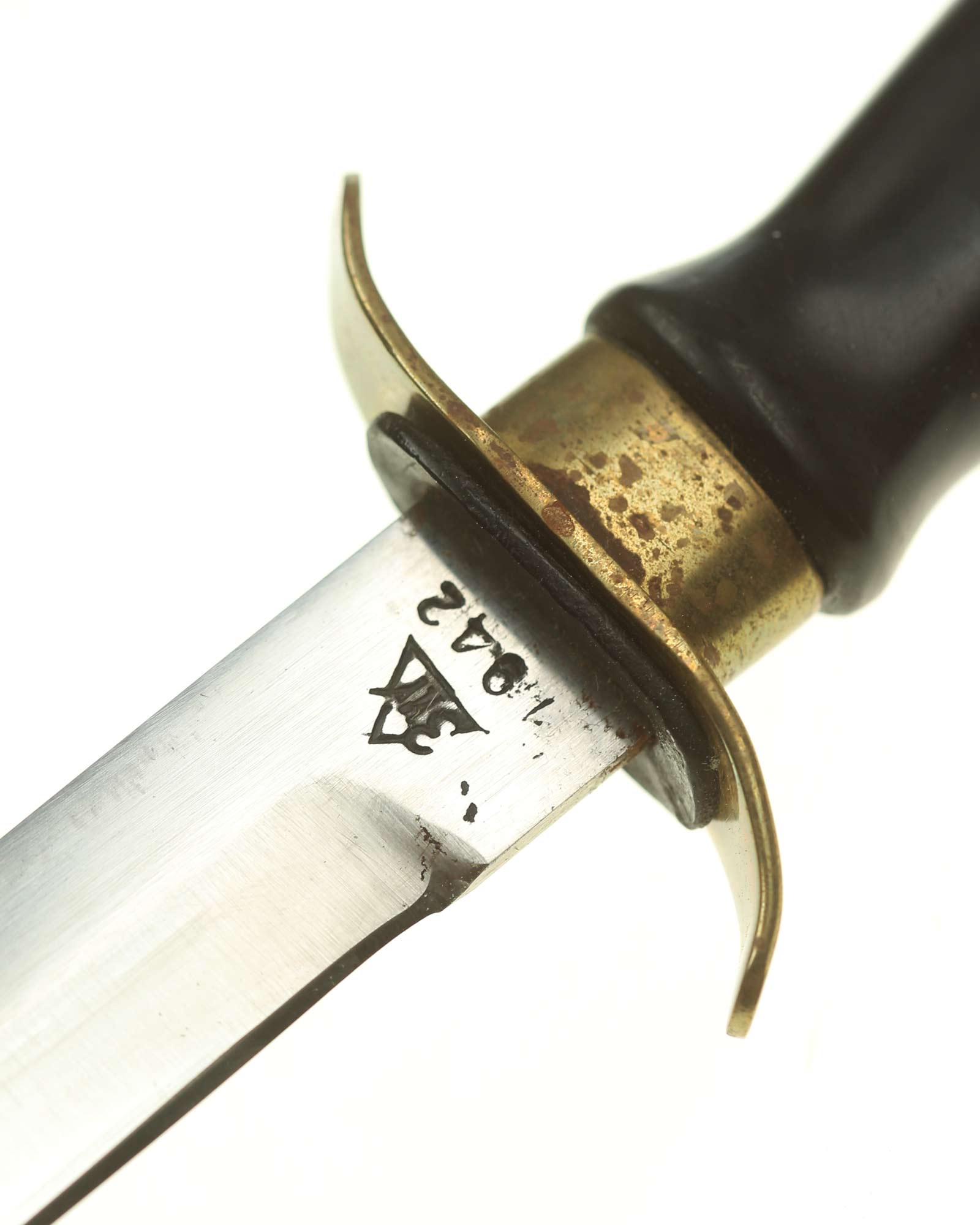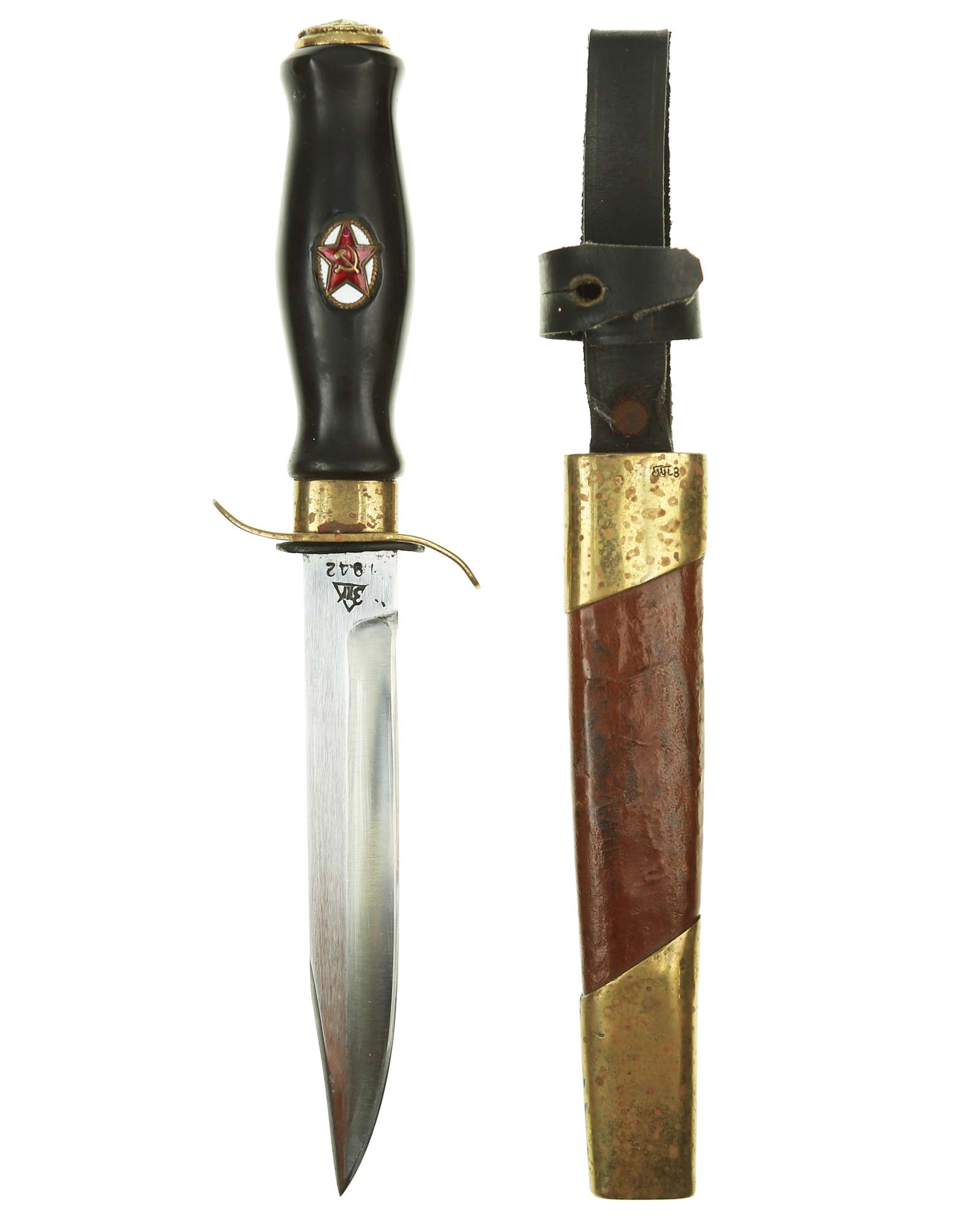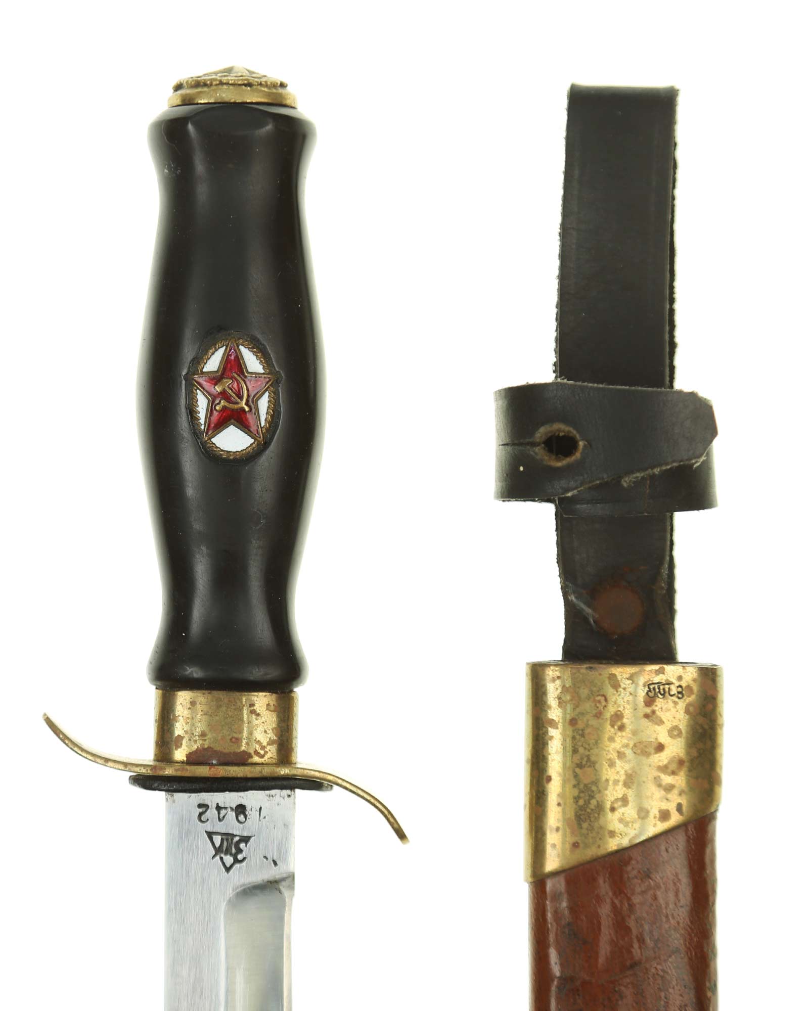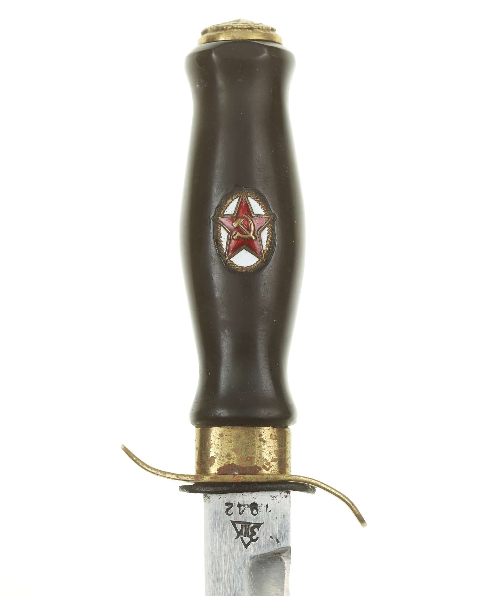 Советский нож НКВД (финка) обр. 1942 года. Клинок слегка изогнут, на аверсе год 1942 и клеймо изготовителя ЗИК (Златоуст). Бакелитовая рукоять с советским государственным символом CCCP. Ножны с кожаным покрытием.