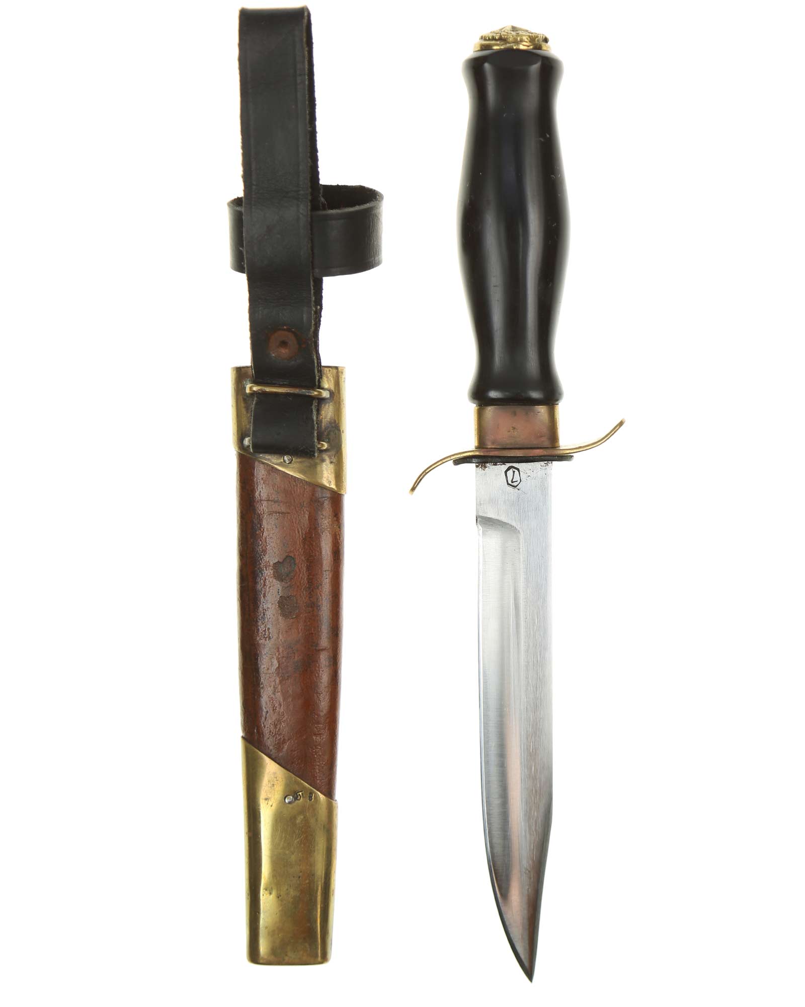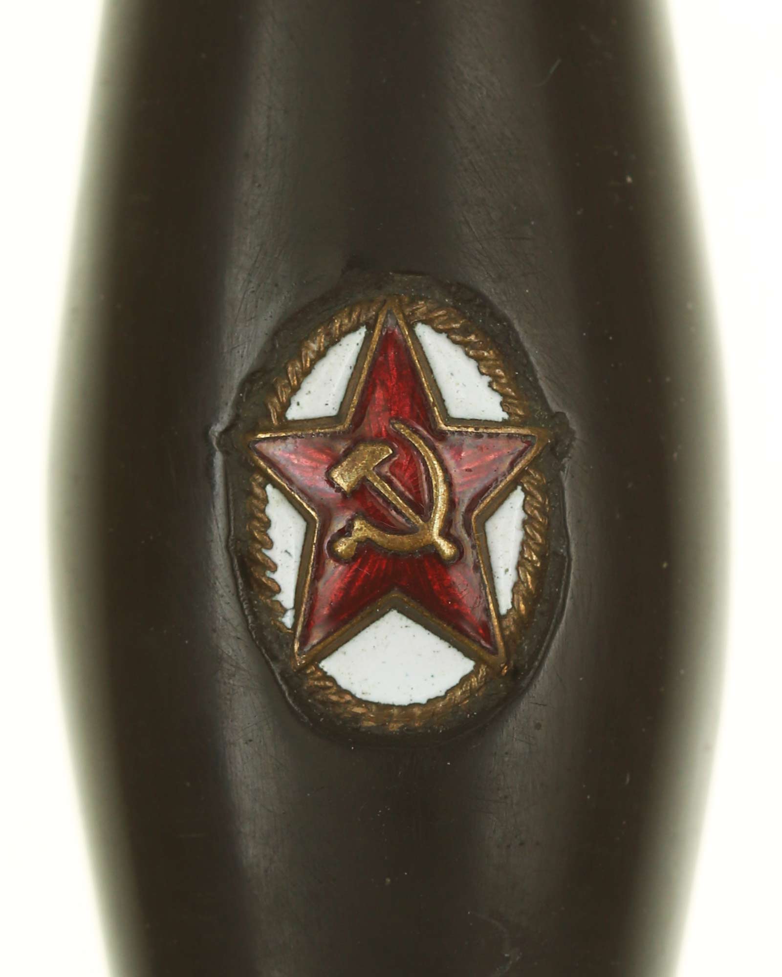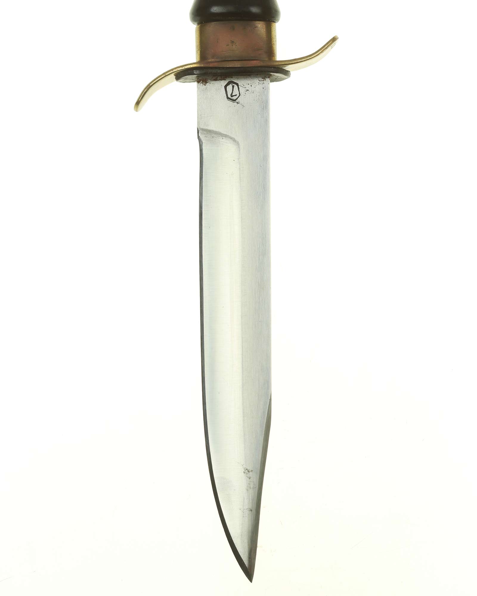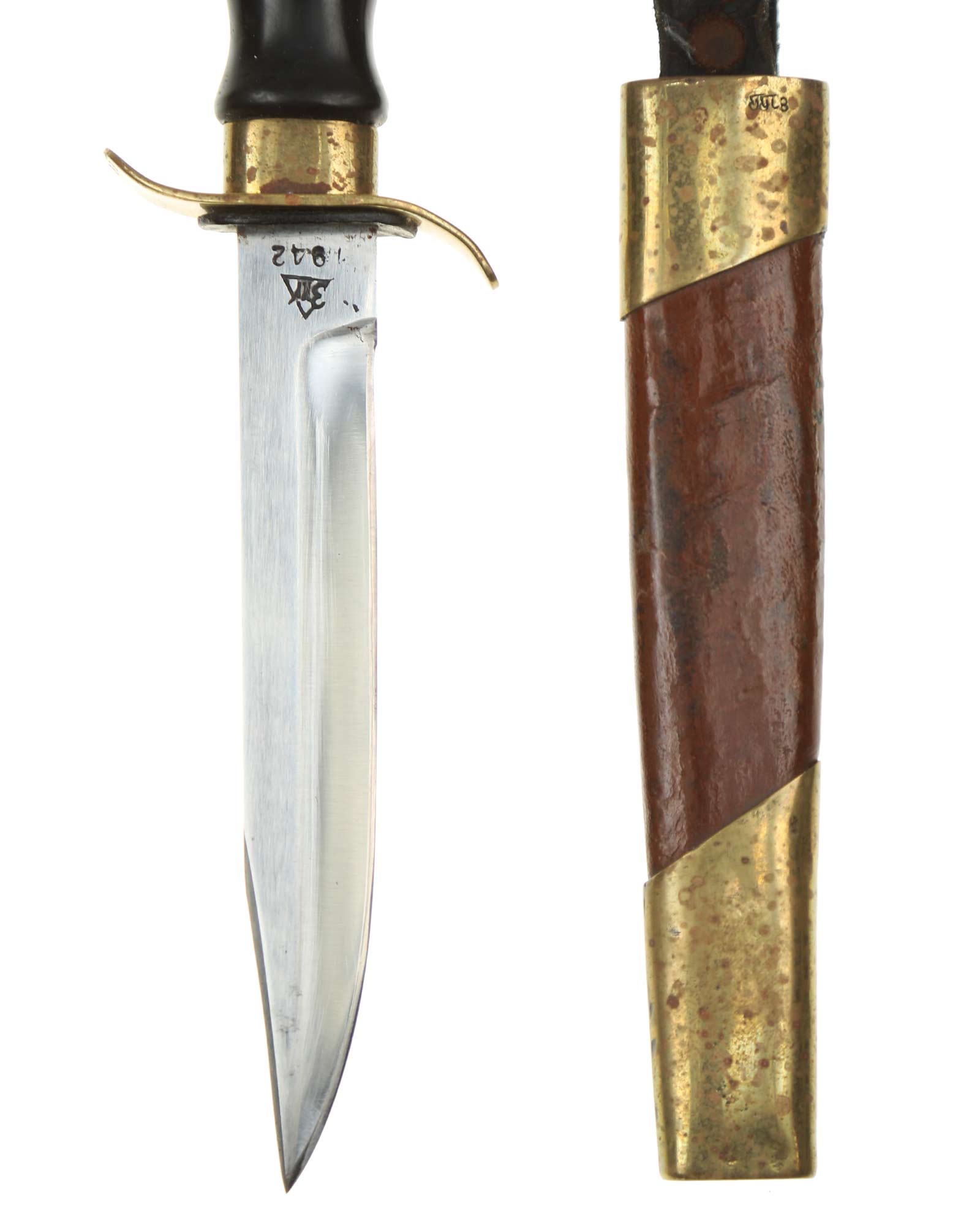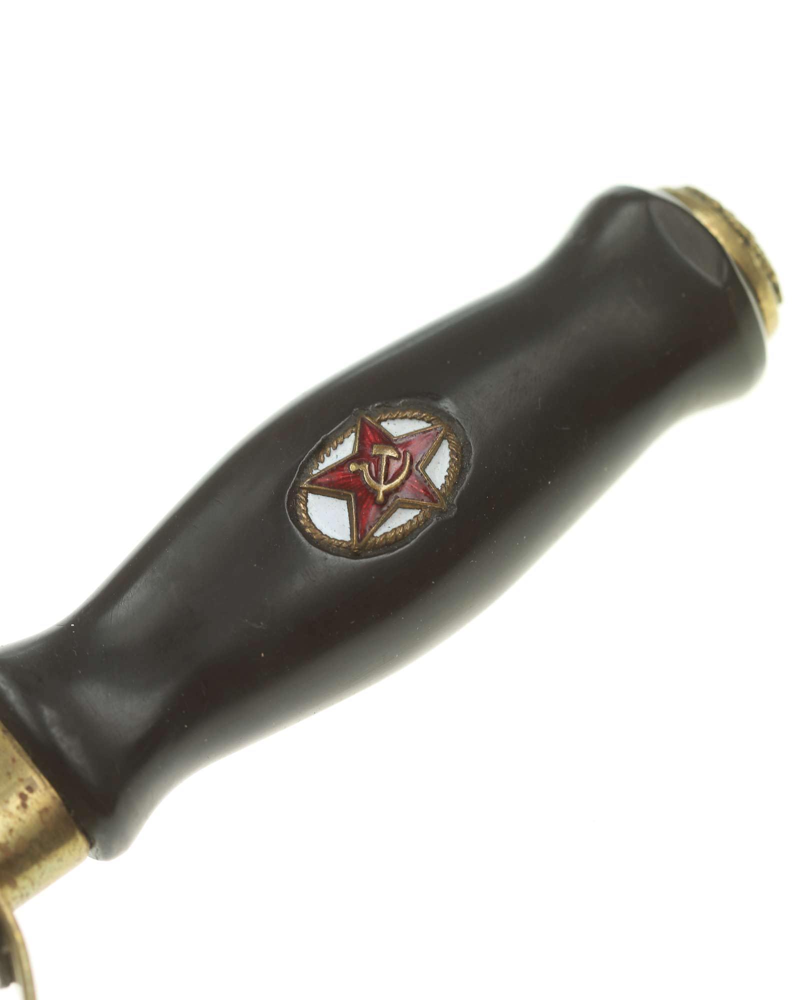 Советский нож НКВД (финка) обр. 1942 года. Клинок слегка изогнут, на аверсе год 1942 и клеймо изготовителя ЗИК (Златоуст). Бакелитовая рукоять с советским государственным символом CCCP. Ножны с кожаным покрытием.