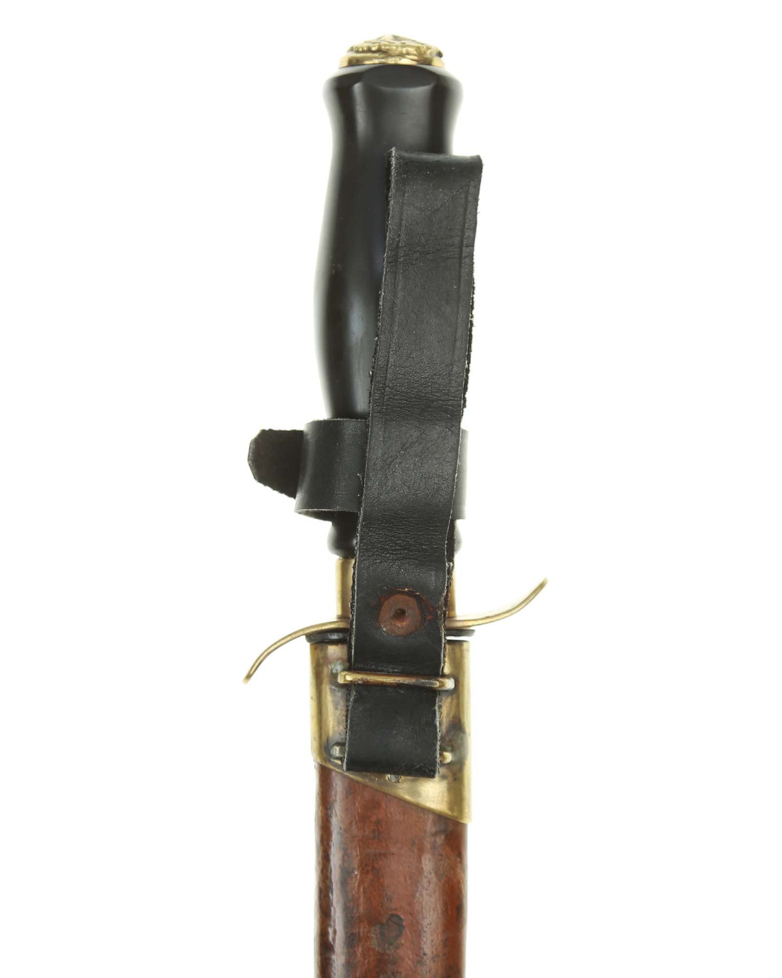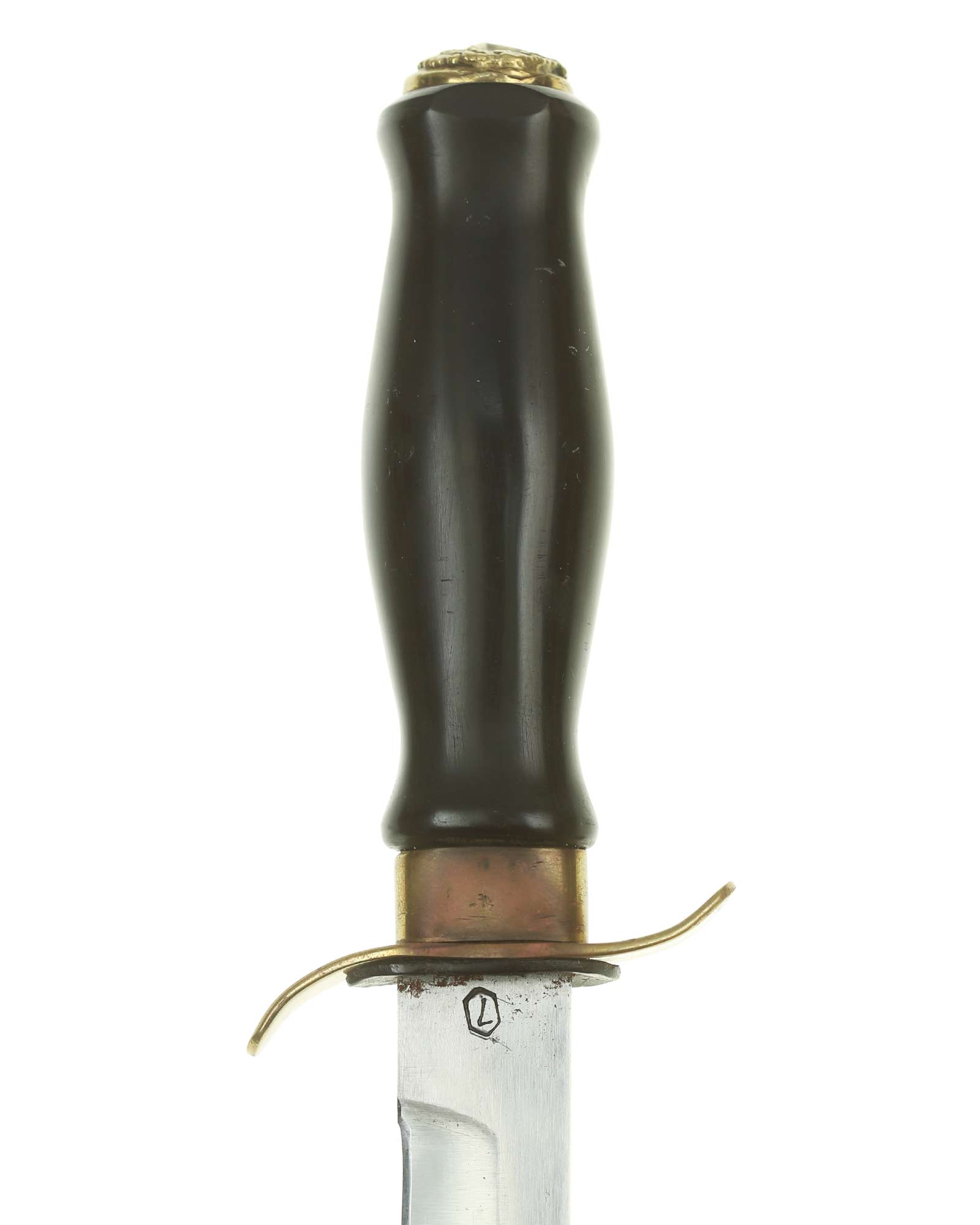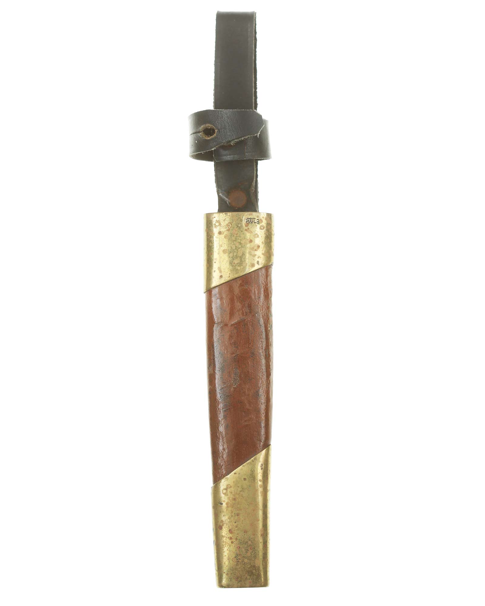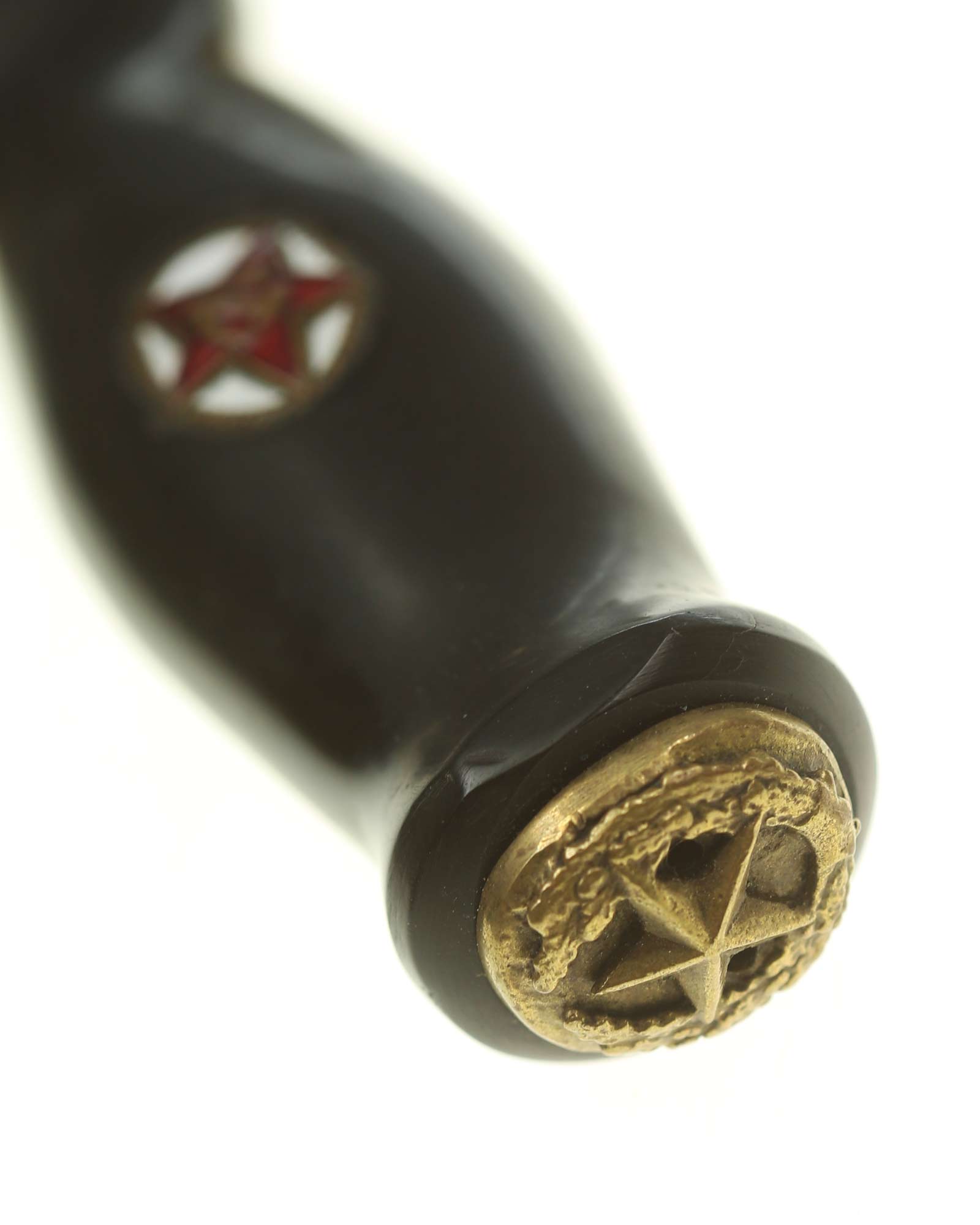 Советский нож НКВД (финка) обр. 1942 года. Клинок слегка изогнут, на аверсе год 1942 и клеймо изготовителя ЗИК (Златоуст). Бакелитовая рукоять с советским государственным символом CCCP. Ножны с кожаным покрытием.