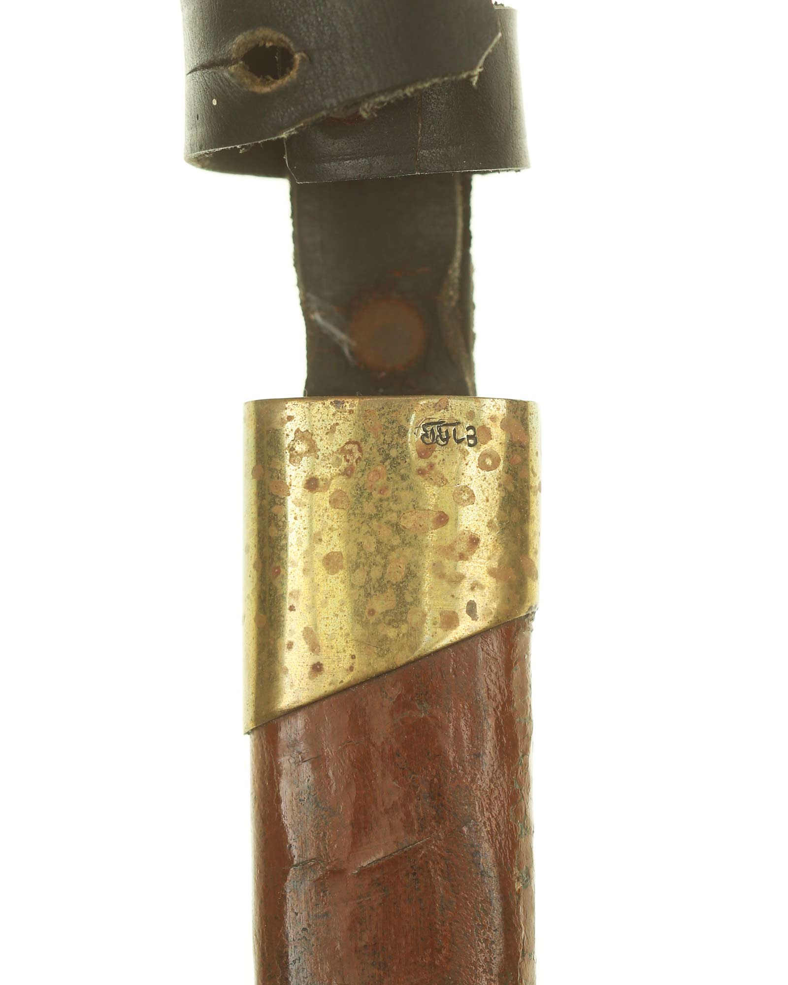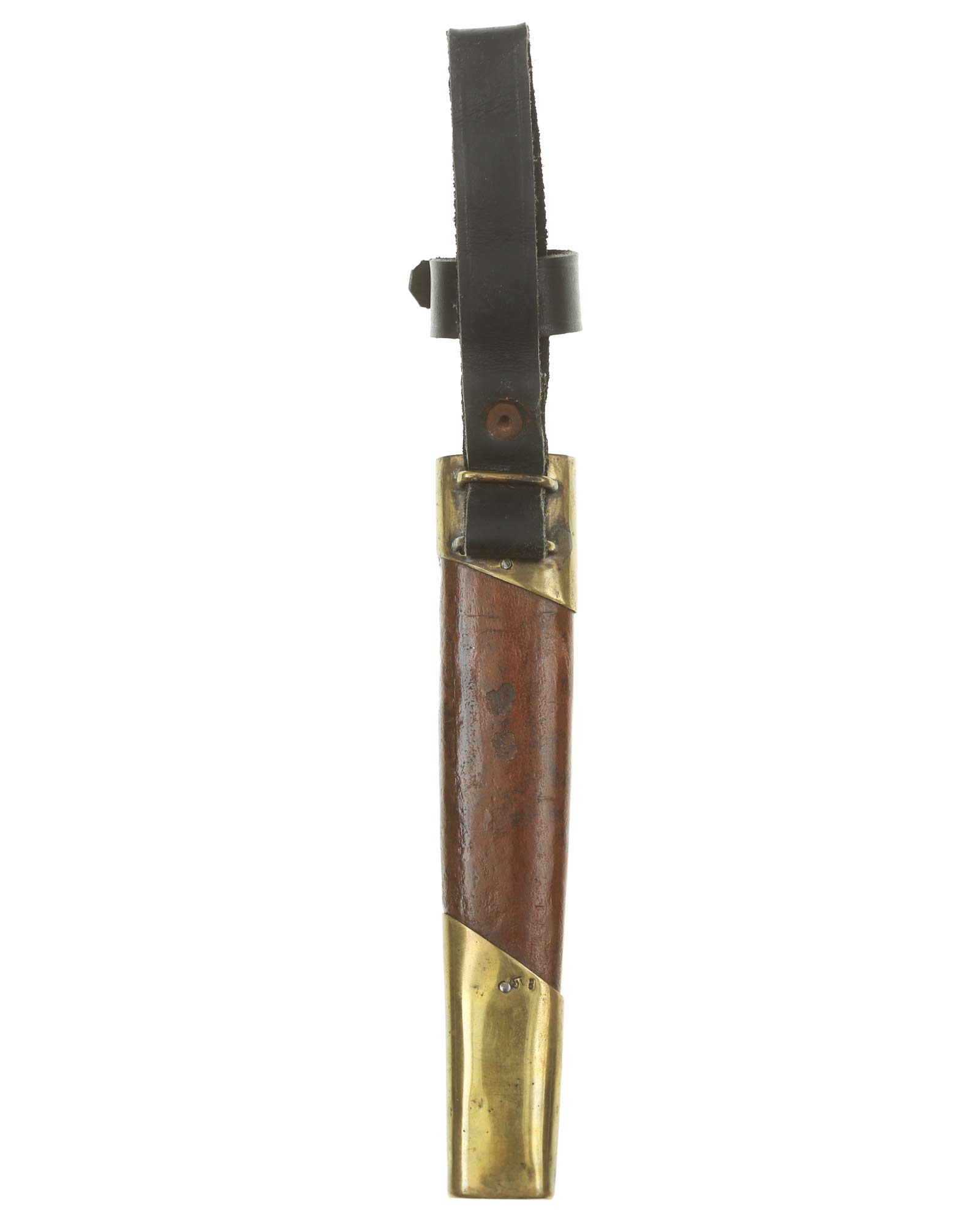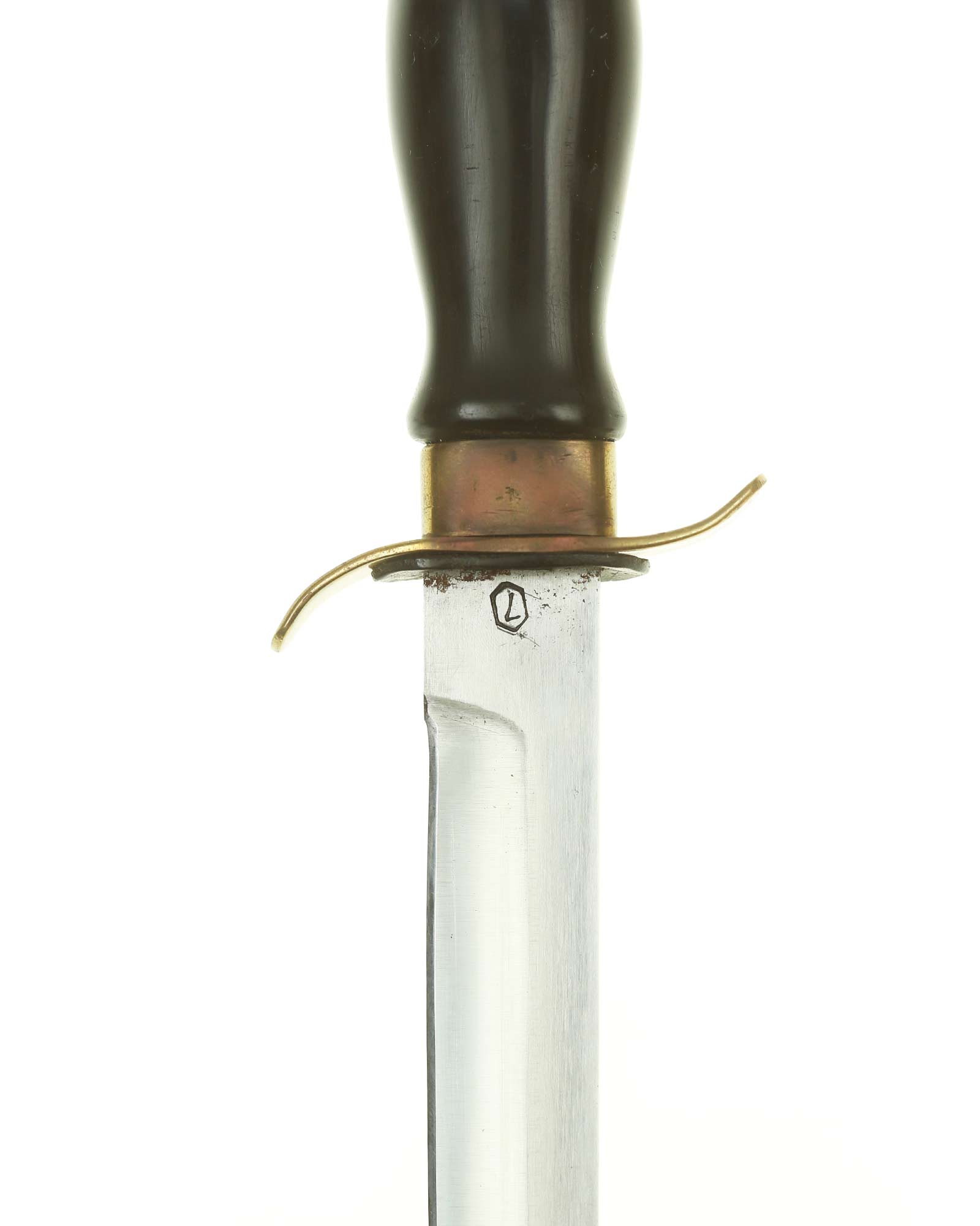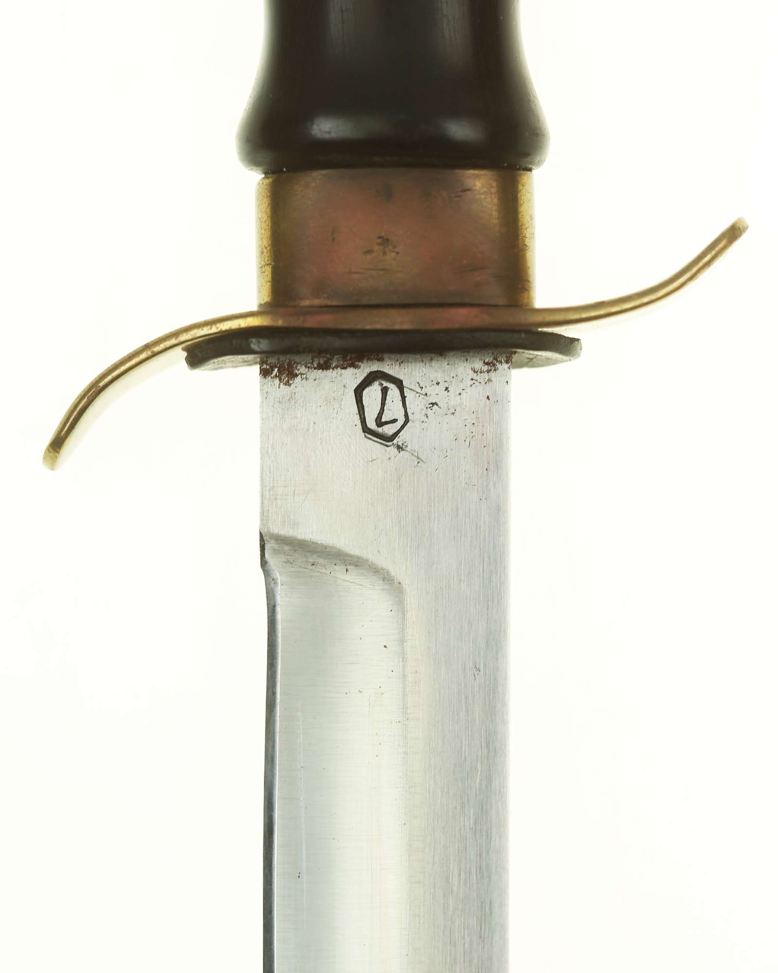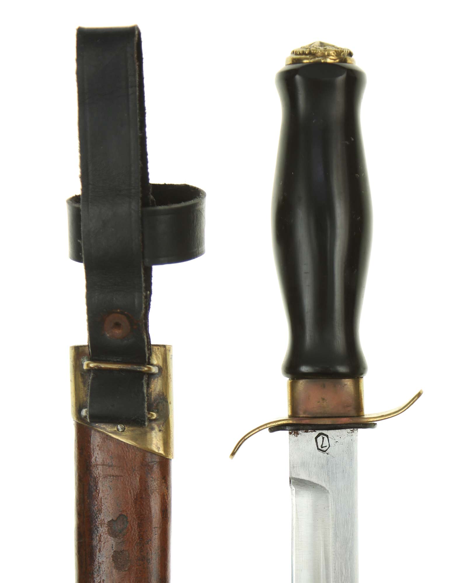 Советский нож НКВД (финка) обр. 1942 года. Клинок слегка изогнут, на аверсе год 1942 и клеймо изготовителя ЗИК (Златоуст). Бакелитовая рукоять с советским государственным символом CCCP. Ножны с кожаным покрытием.