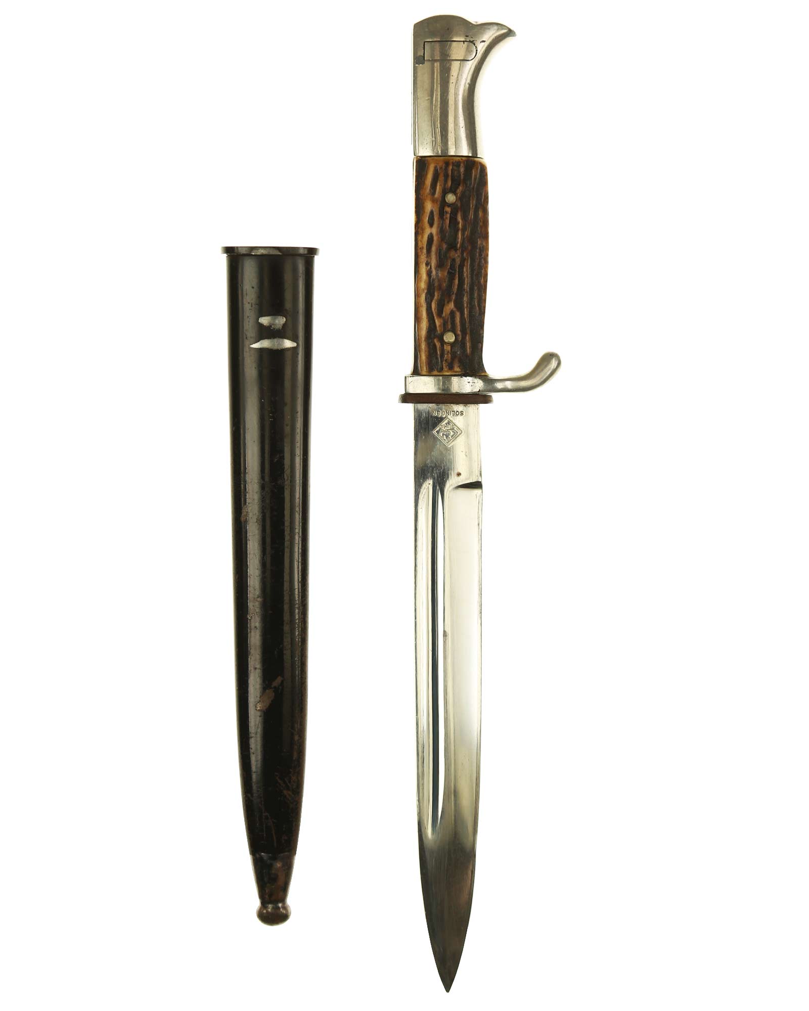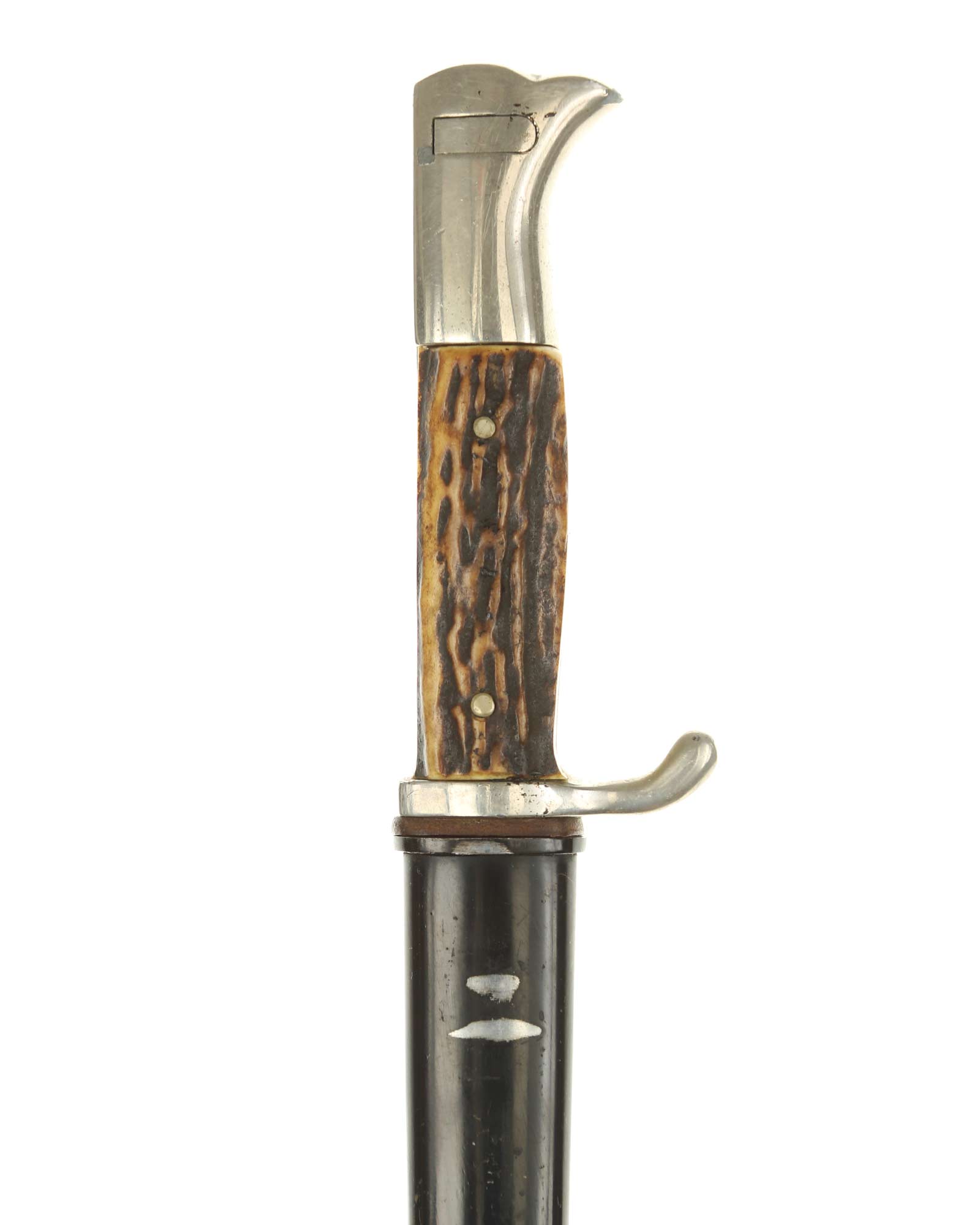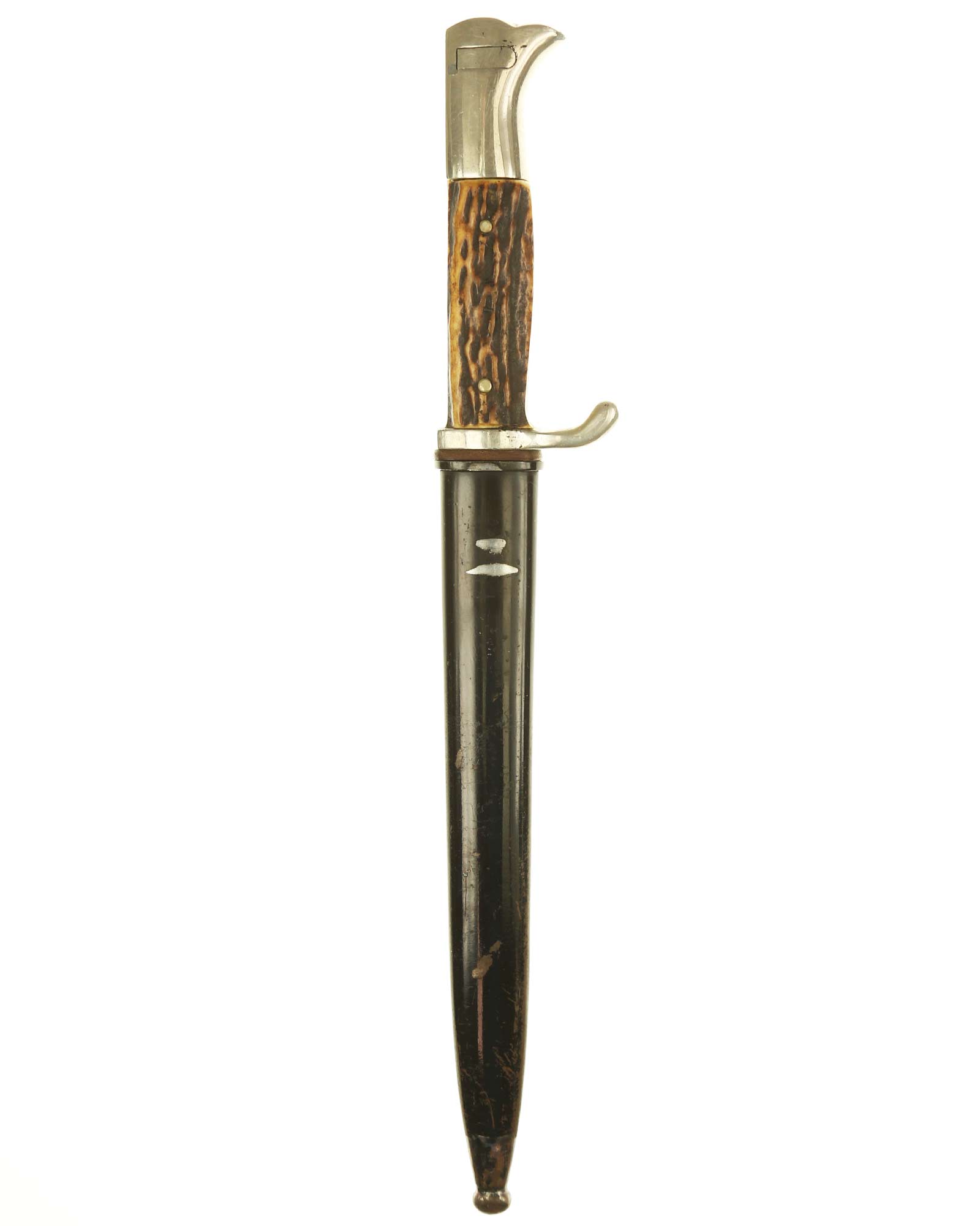 Парадный (внестроевой) штык к винтовке Маузер с рукоятками из рога оленя. Клинок никелированный. На пяте клинка имеется клеймо известного производителя - Puma Solingen, клеймо немецкой фирмы «ПУМА» Золинген. Элементы рукояти также никелированные, щечки изготовлены из рога. Ножны металлические, выкрашенные в черный цвет.