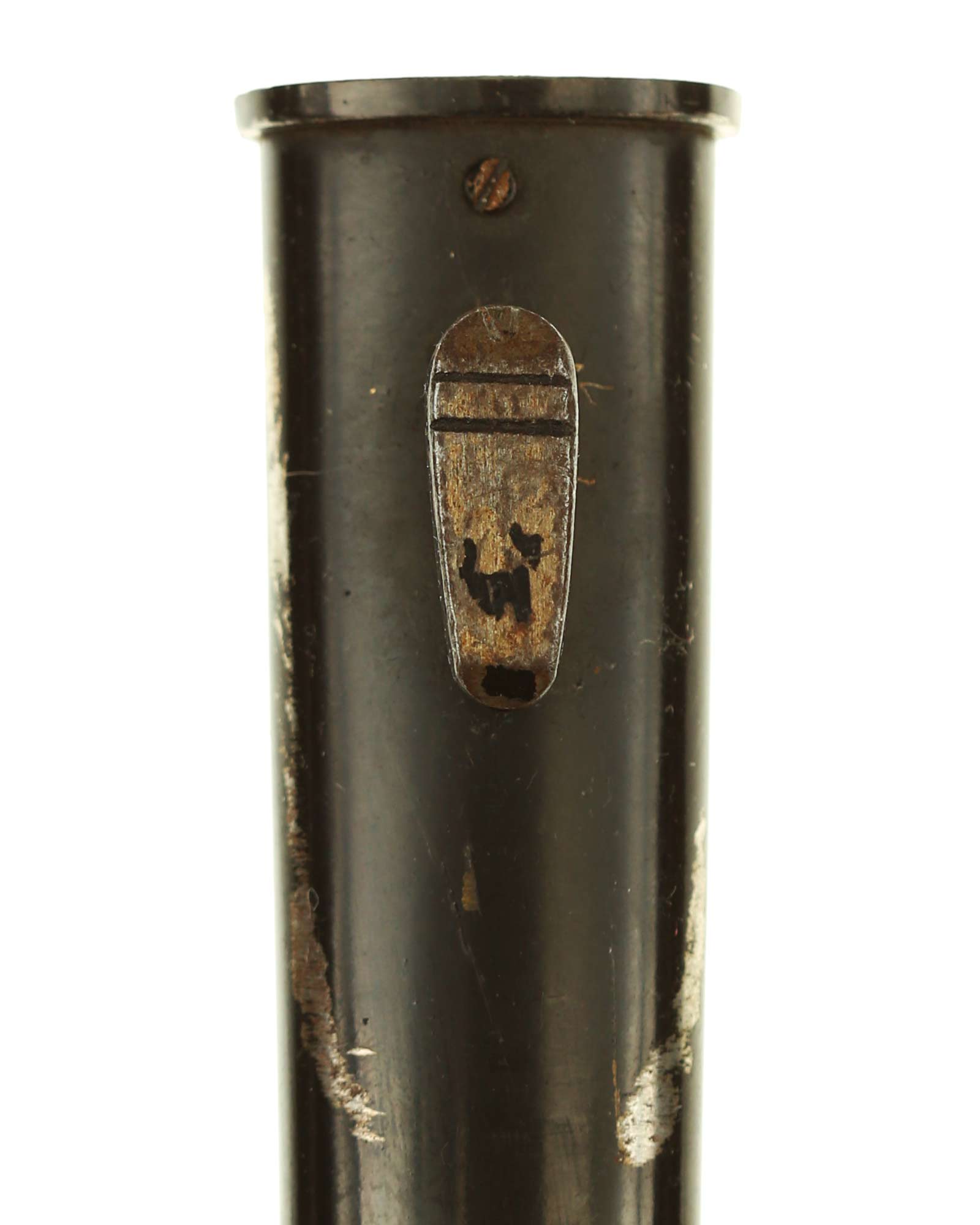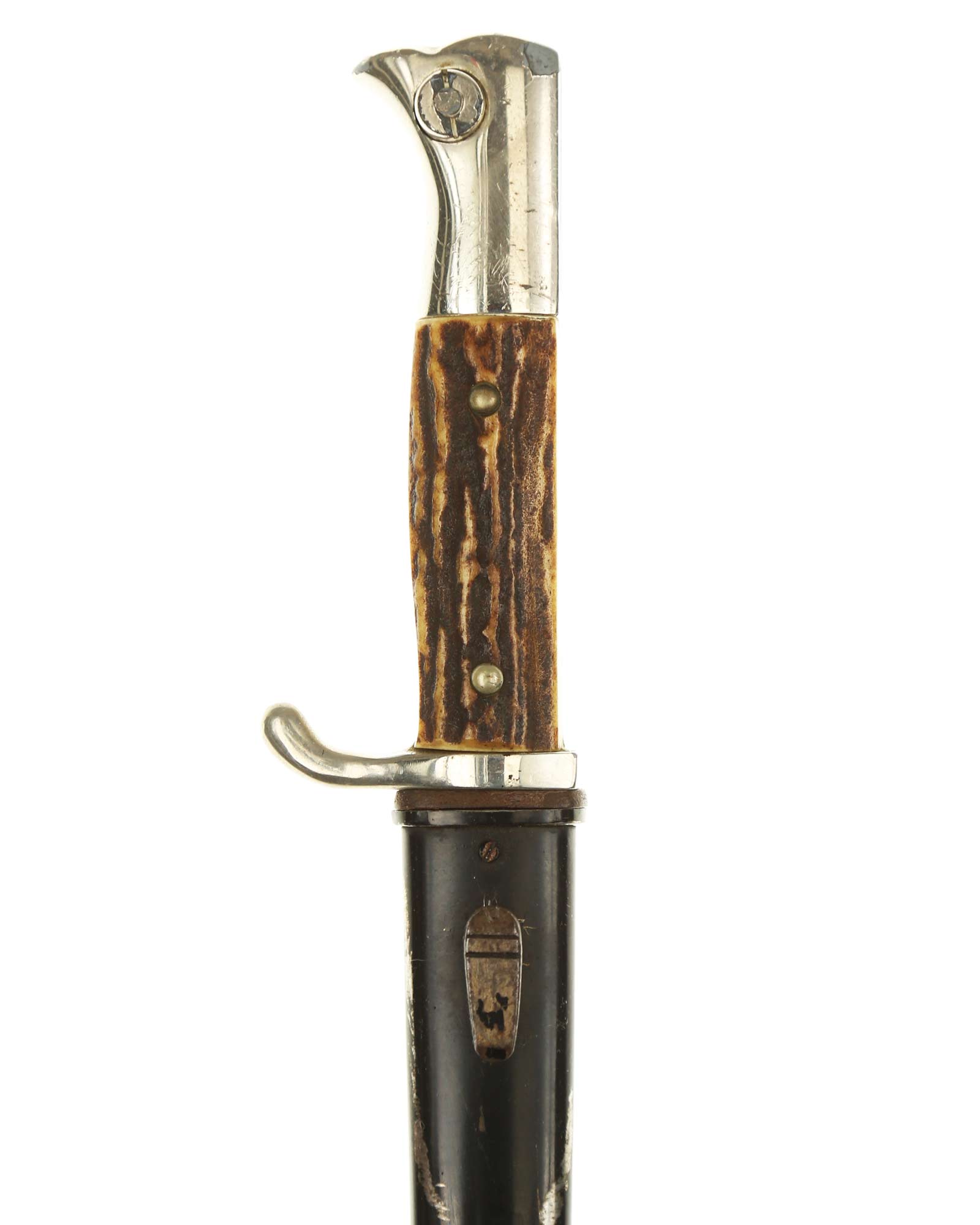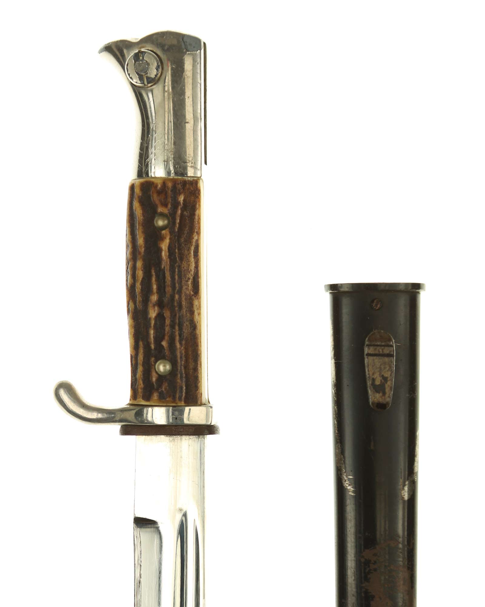 Парадный (внестроевой) штык к винтовке Маузер с рукоятками из рога оленя. Клинок никелированный. На пяте клинка имеется клеймо известного производителя - Puma Solingen, клеймо немецкой фирмы «ПУМА» Золинген. Элементы рукояти также никелированные, щечки изготовлены из рога. Ножны металлические, выкрашенные в черный цвет.