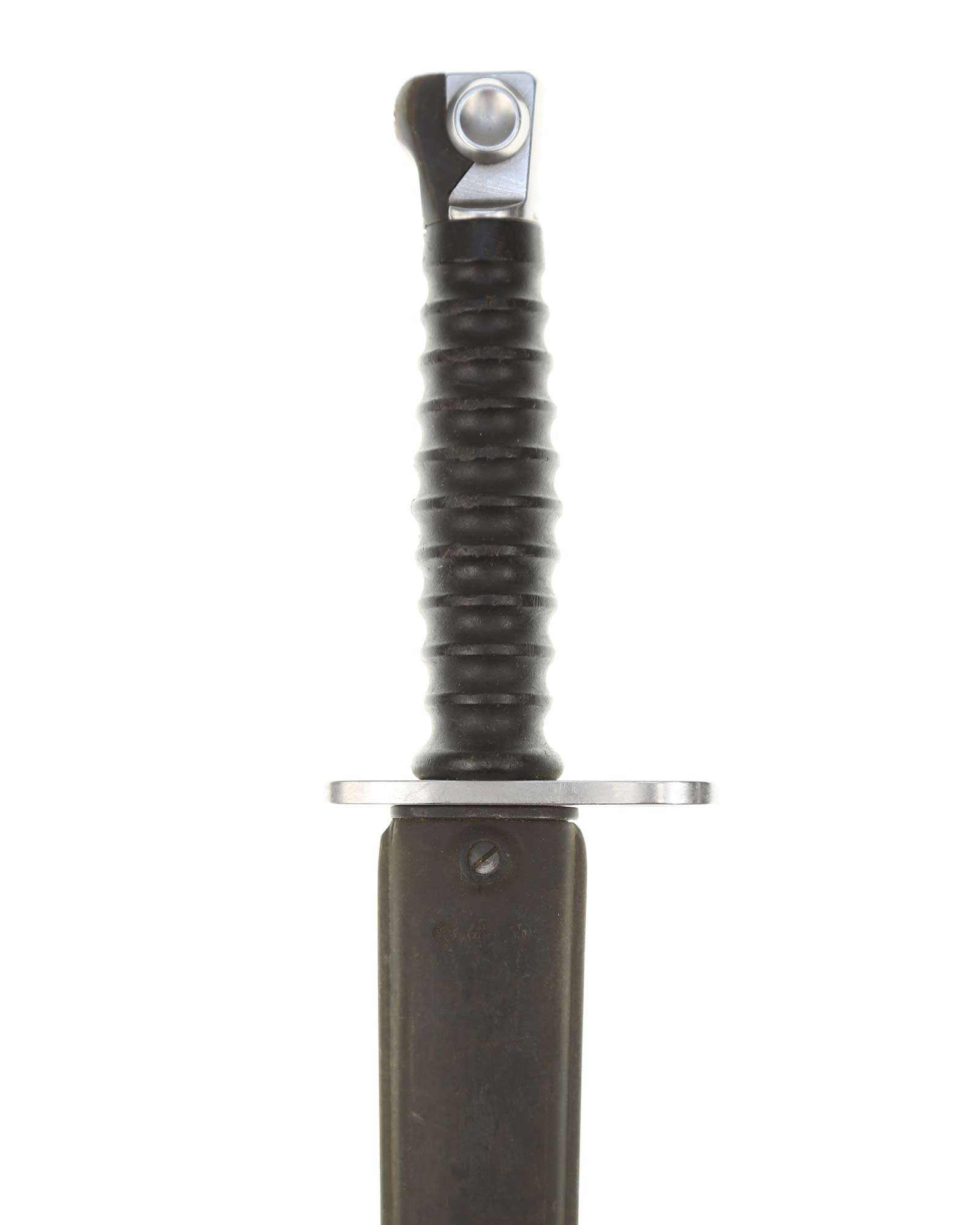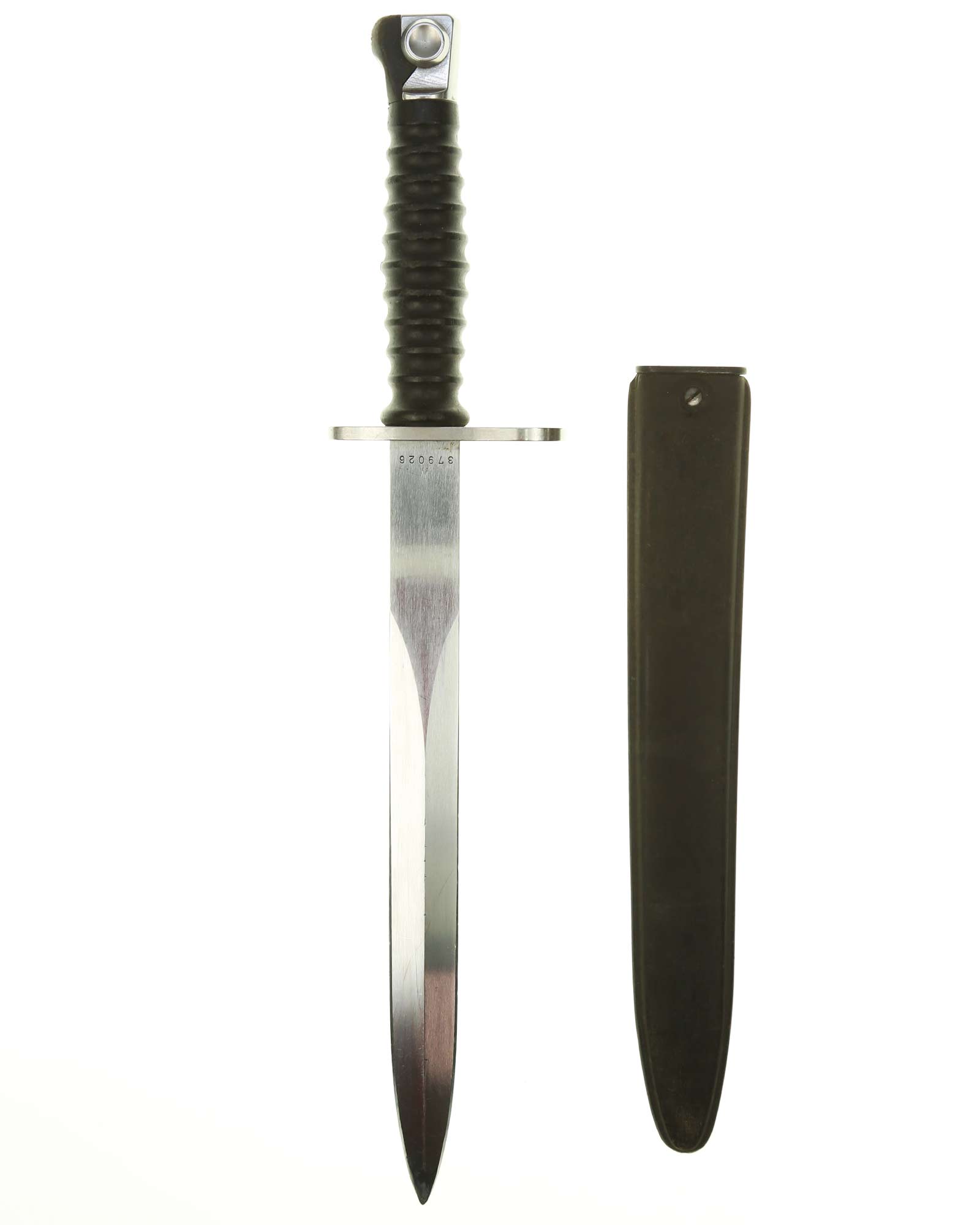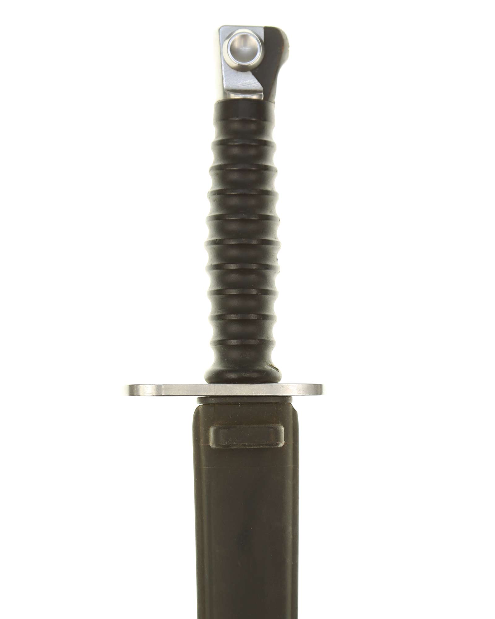 Швейцарский нож образца 1957 года. Рукоять пластмассовая черная, с кольцевыми желобками. В головке рукояти цилиндрический паз и пружинная защёлка с внутренним расположением спиральной пружины. Крестовина прямая с кольцом для ствола. Клинок прямой, двулезвийный, ромбического сечения. Ножны пластиковые со скобой.