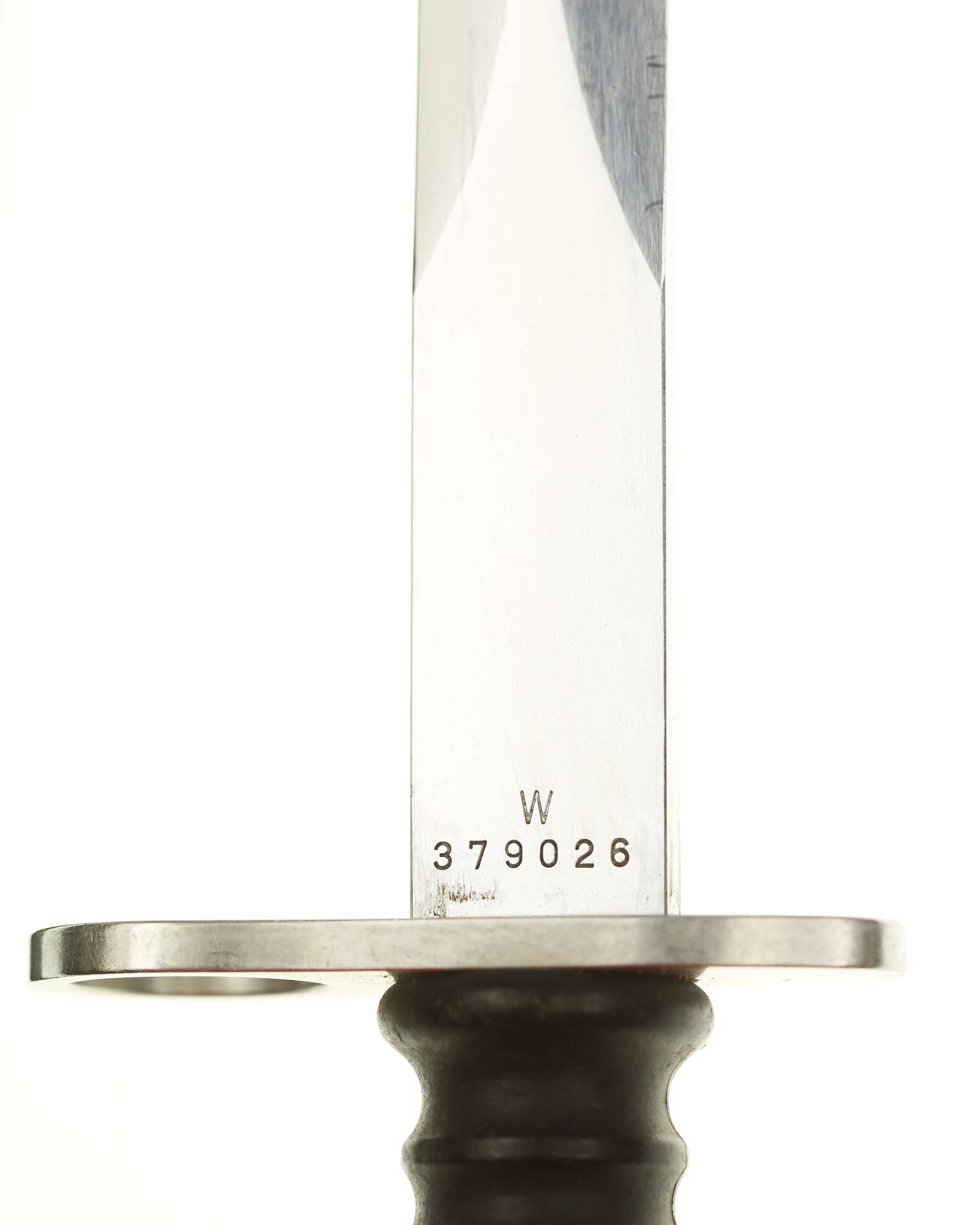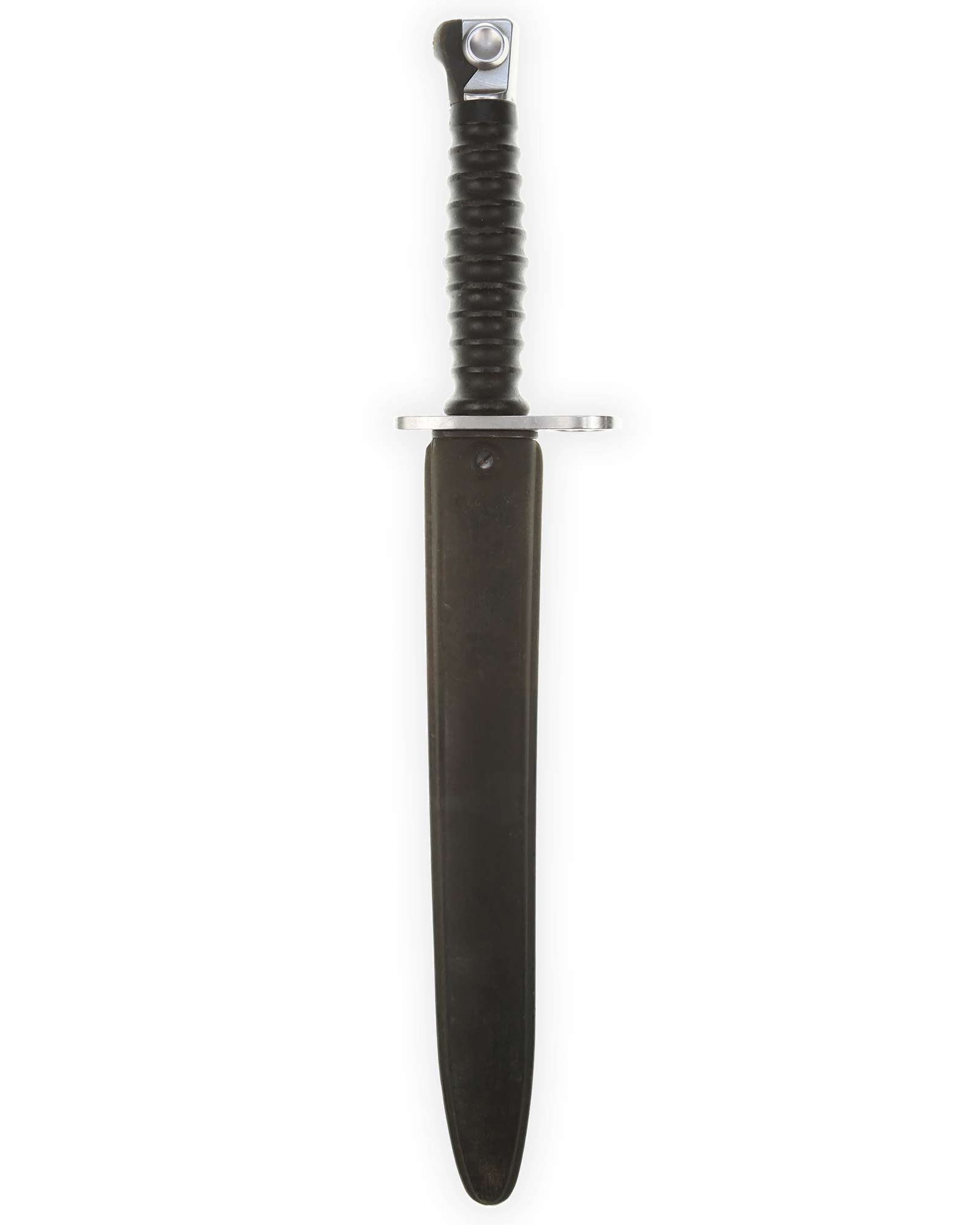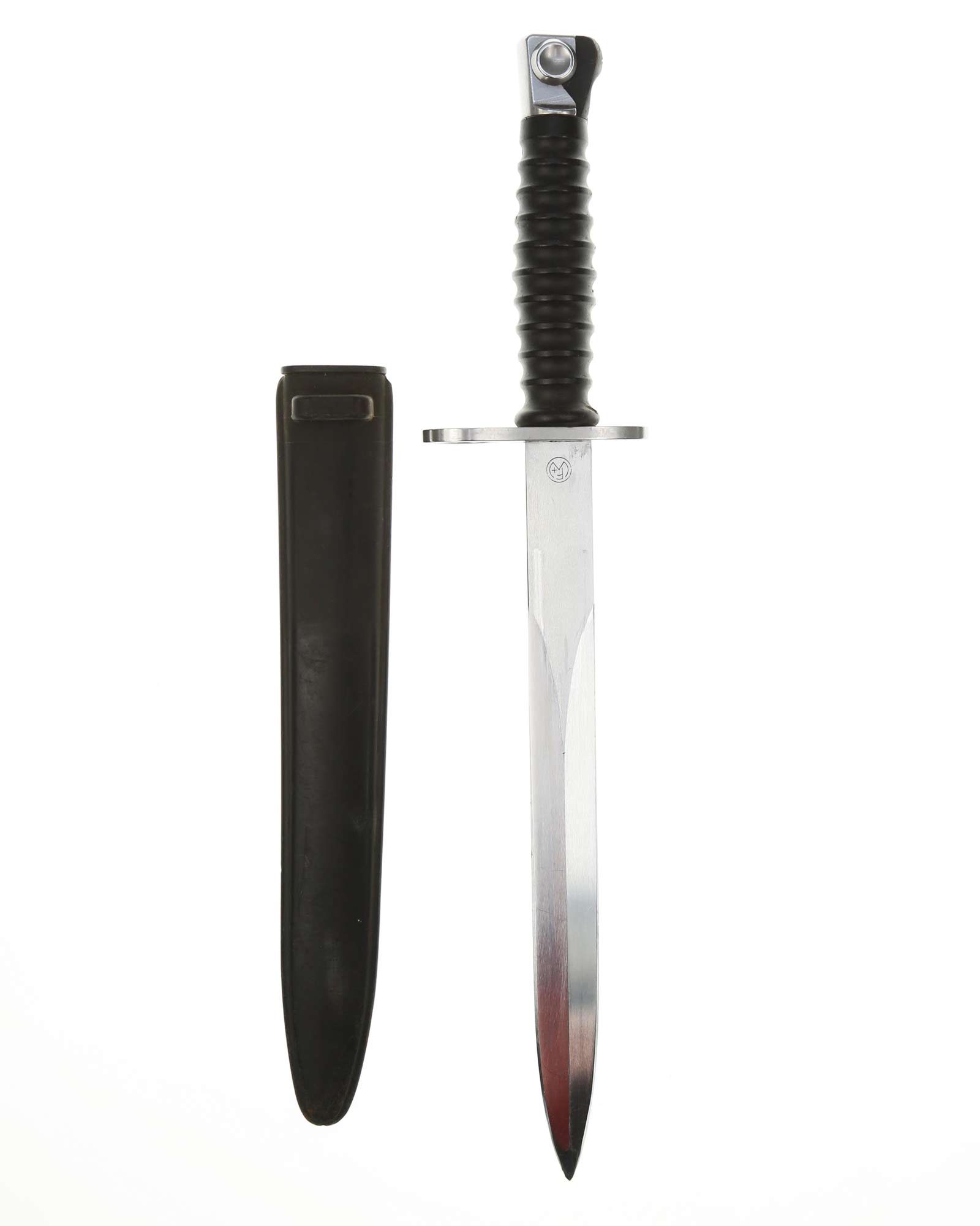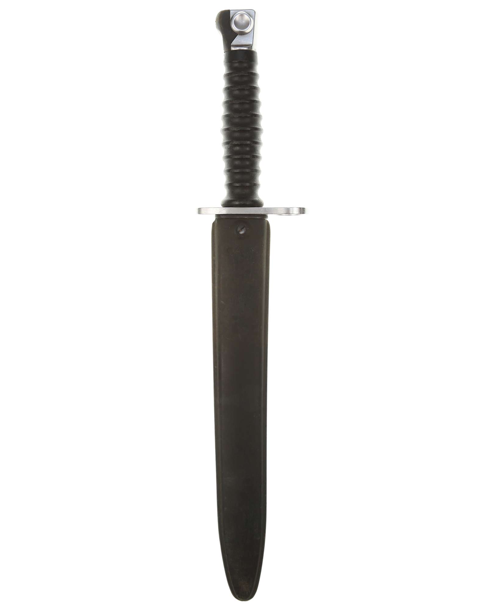 Швейцарский нож образца 1957 года. Рукоять пластмассовая черная, с кольцевыми желобками. В головке рукояти цилиндрический паз и пружинная защёлка с внутренним расположением спиральной пружины. Крестовина прямая с кольцом для ствола. Клинок прямой, двулезвийный, ромбического сечения. Ножны пластиковые со скобой.
