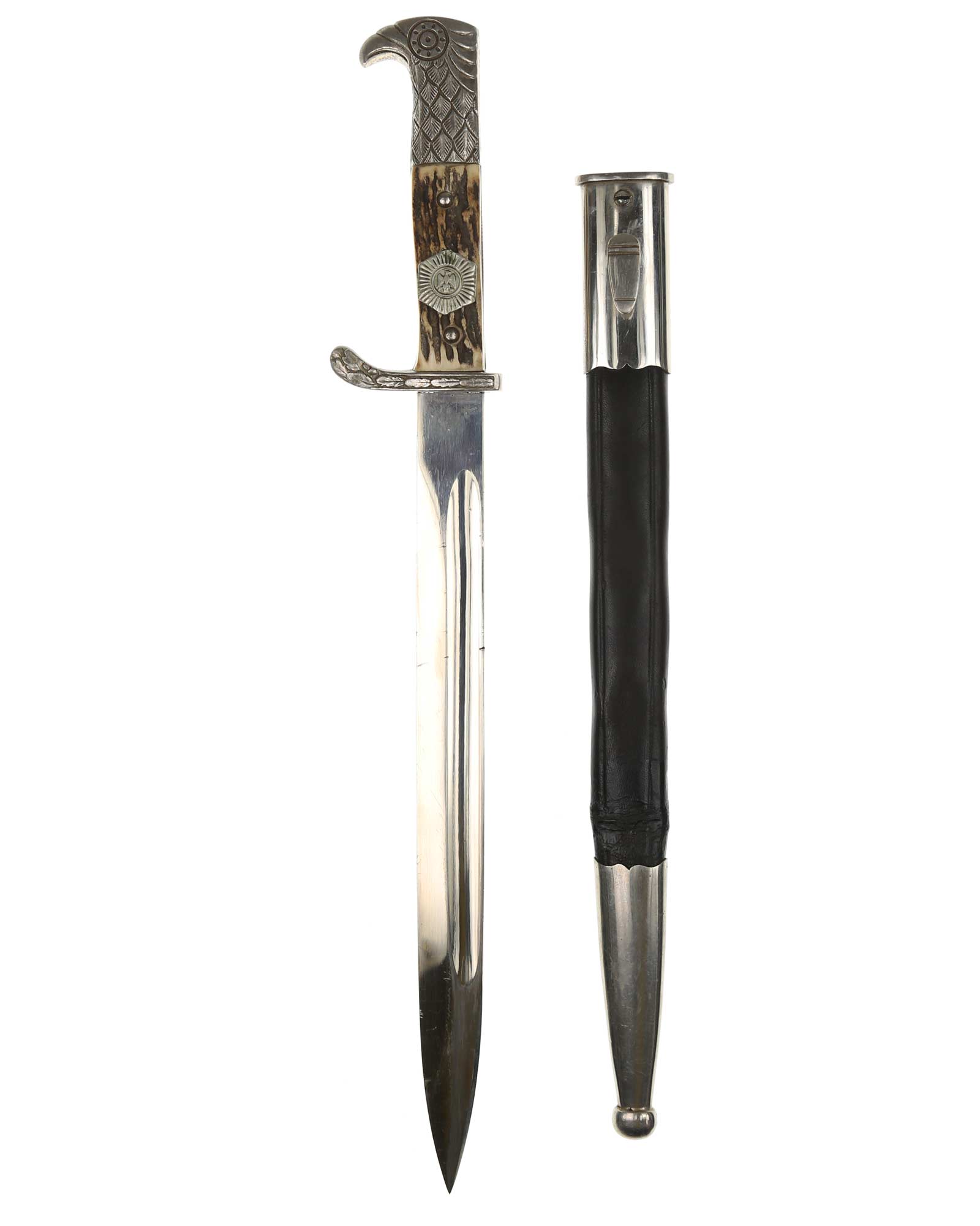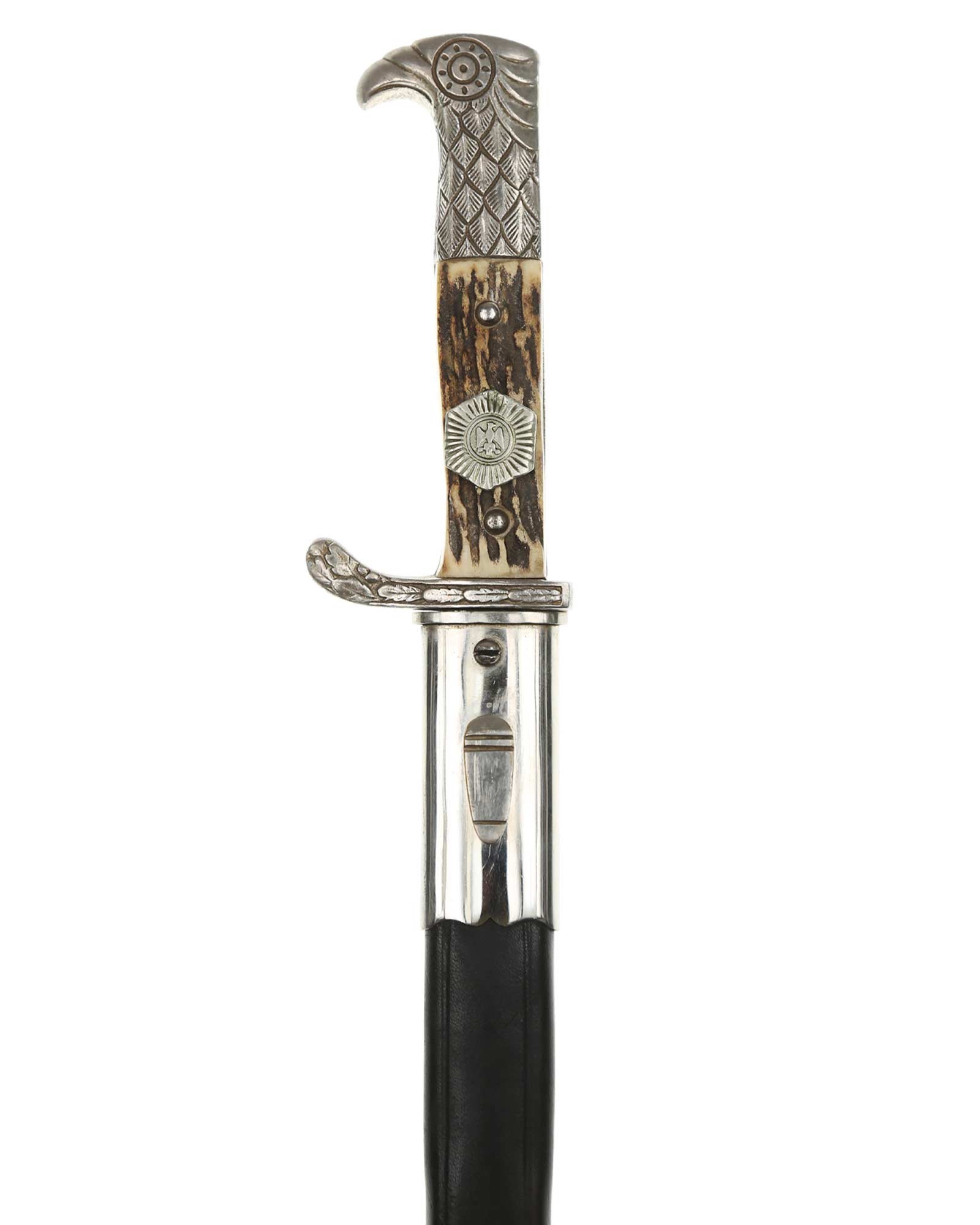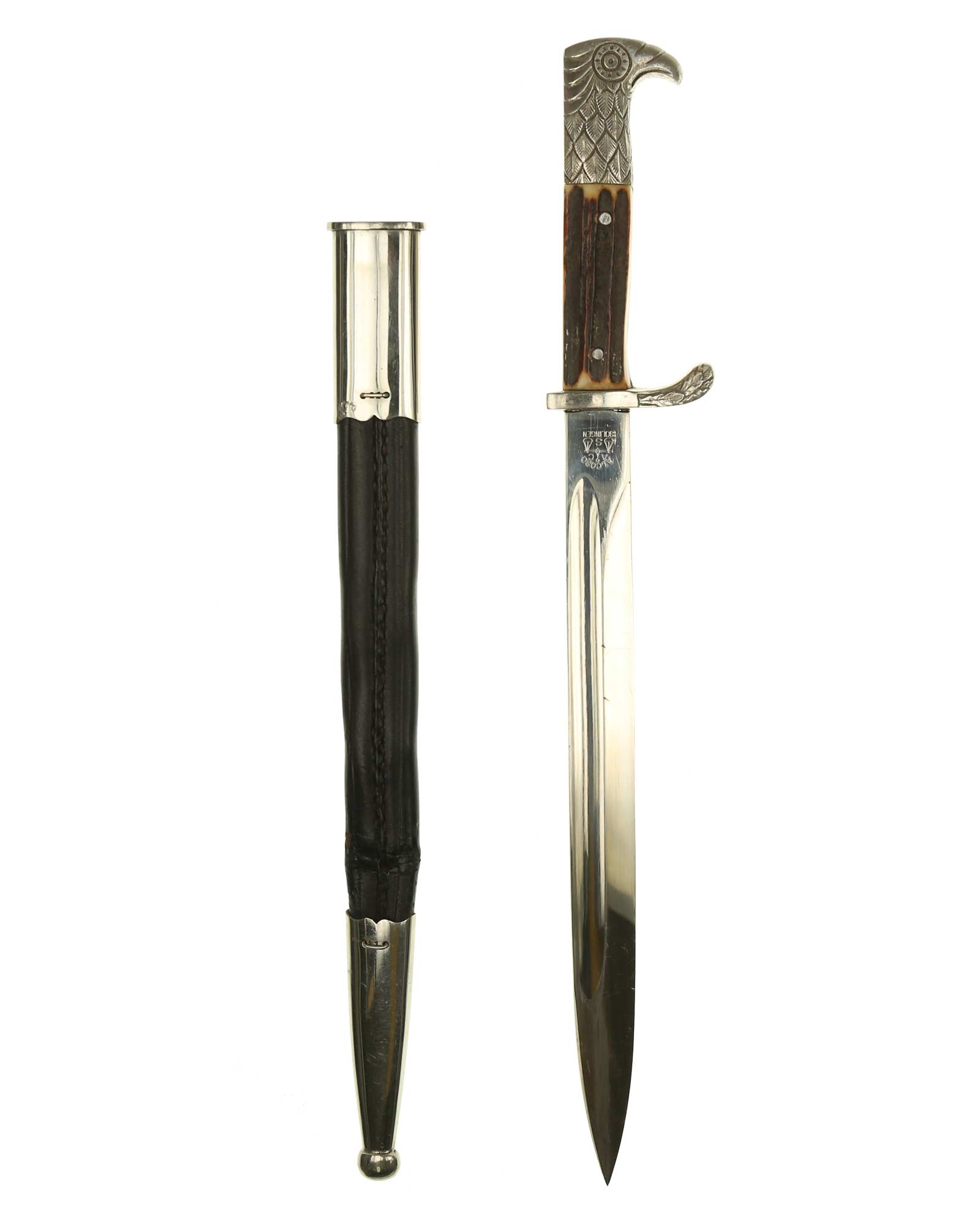 Штык парадный полицейский обр. 1934-45 гг. - Alcoso Золинген. Эфес состоит из рукояти и крестовины. Щечки рукояти роговые, укреплены на черенке клинка при помощи двух заклепок. В центре одной из щечек располагается полицейская эмблема – орел в венке со свастикой в лапах. Головка рукояти рифленая, выполненная в виде головы орла. Крестовина с одной стороны вверх по направлению к клюву «орла». Клинок стальной, прямой, однолезвийный, с одним долом, никелированный.