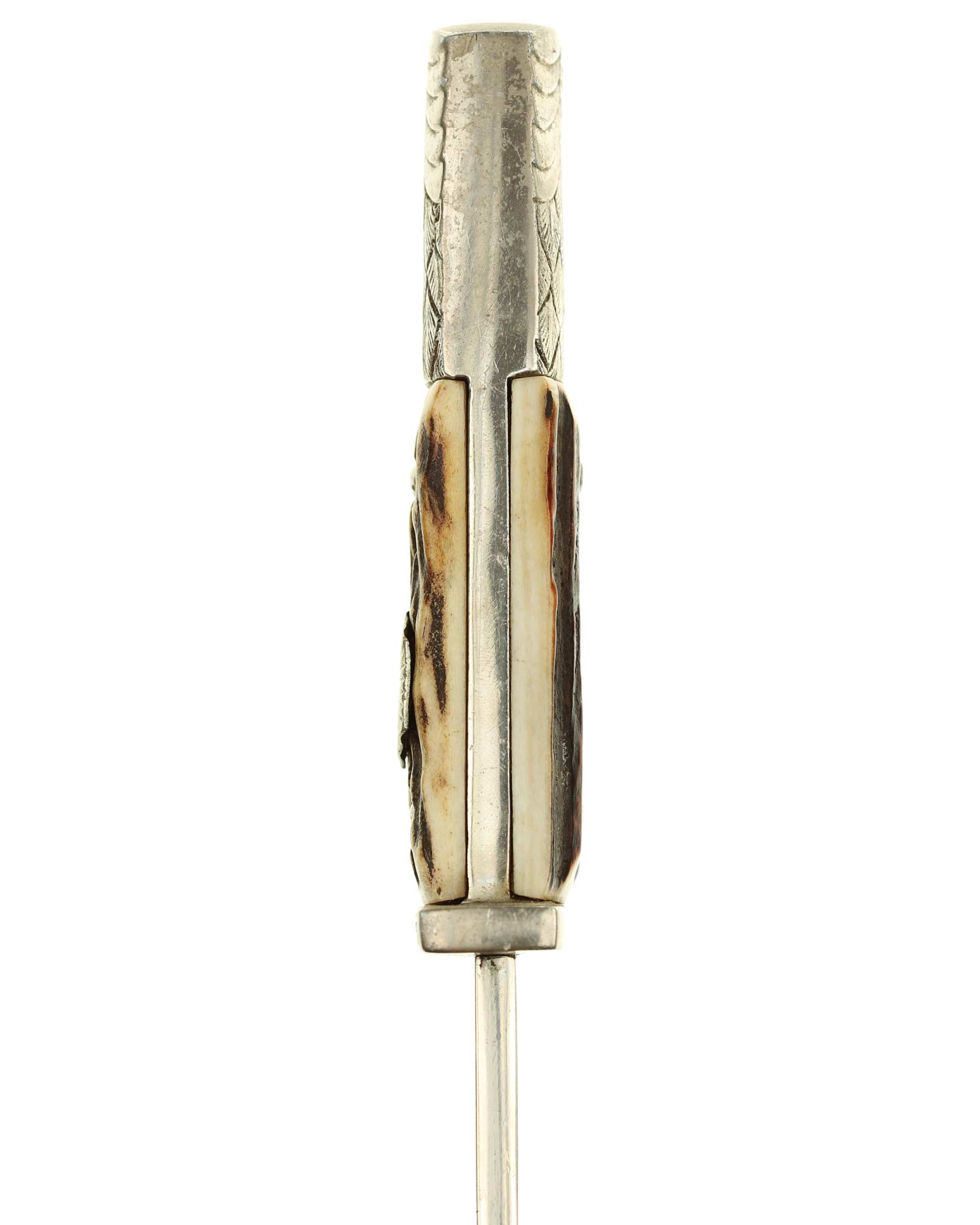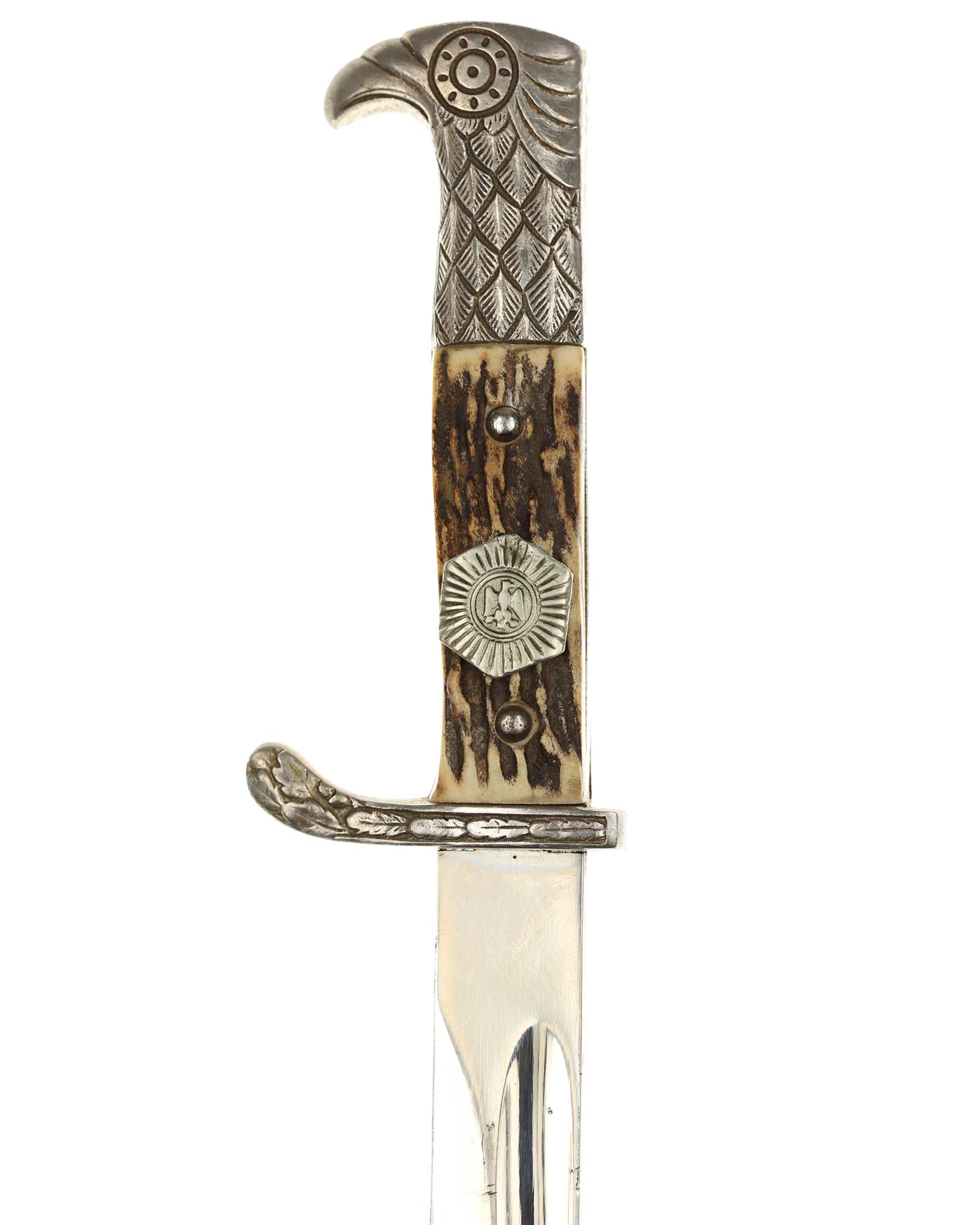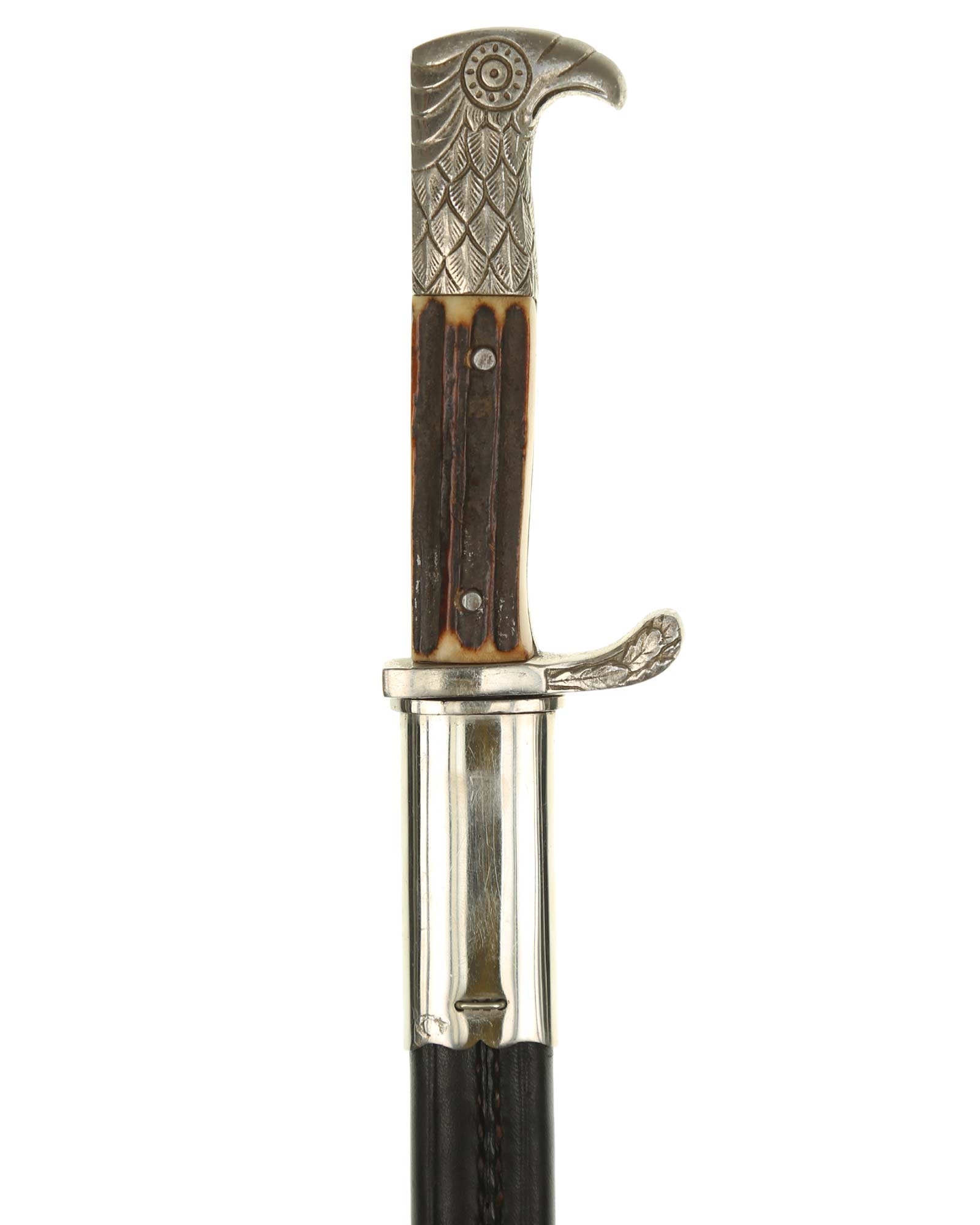 Штык парадный полицейский обр. 1934-45 гг. - Alcoso Золинген. Эфес состоит из рукояти и крестовины. Щечки рукояти роговые, укреплены на черенке клинка при помощи двух заклепок. В центре одной из щечек располагается полицейская эмблема – орел в венке со свастикой в лапах. Головка рукояти рифленая, выполненная в виде головы орла. Крестовина с одной стороны вверх по направлению к клюву «орла». Клинок стальной, прямой, однолезвийный, с одним долом, никелированный.