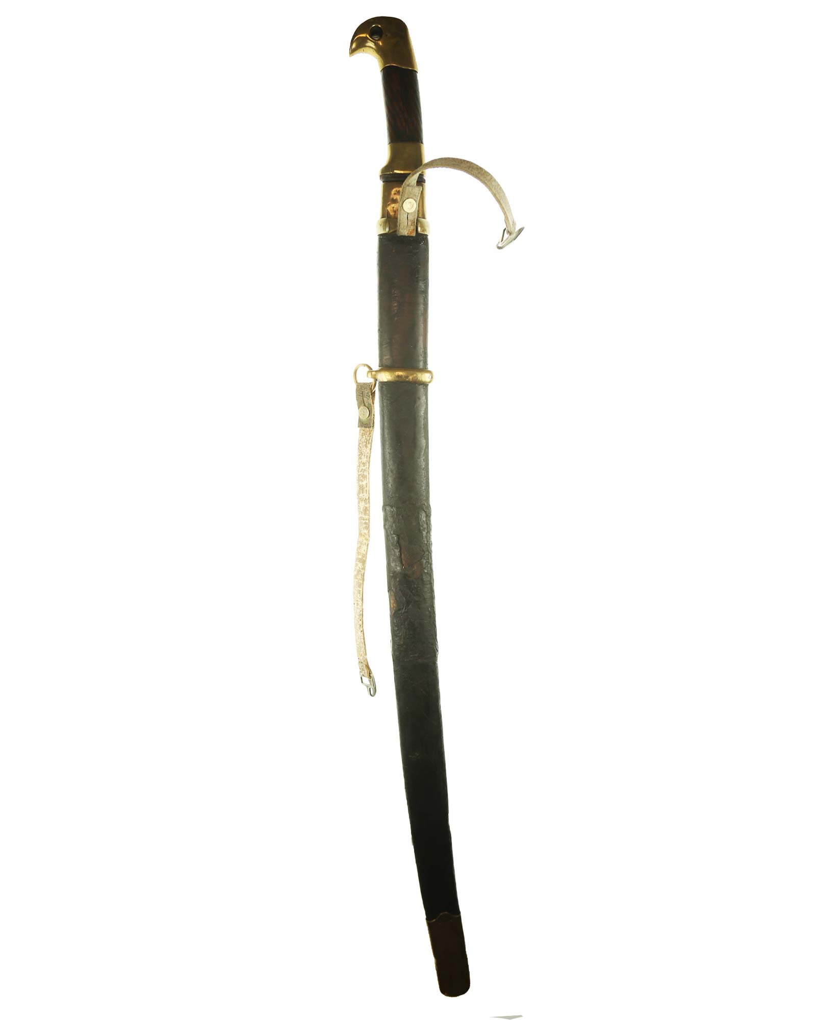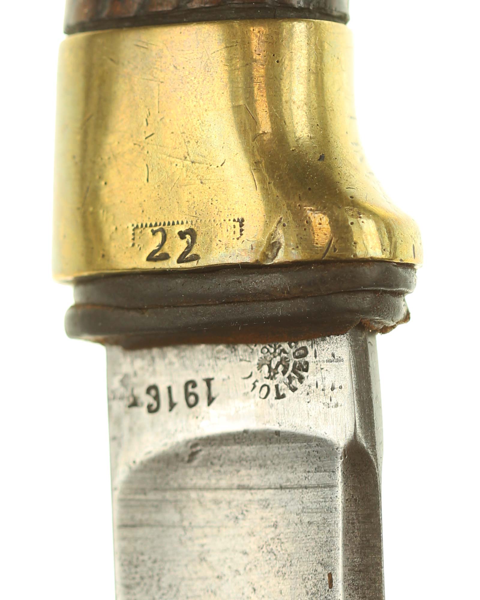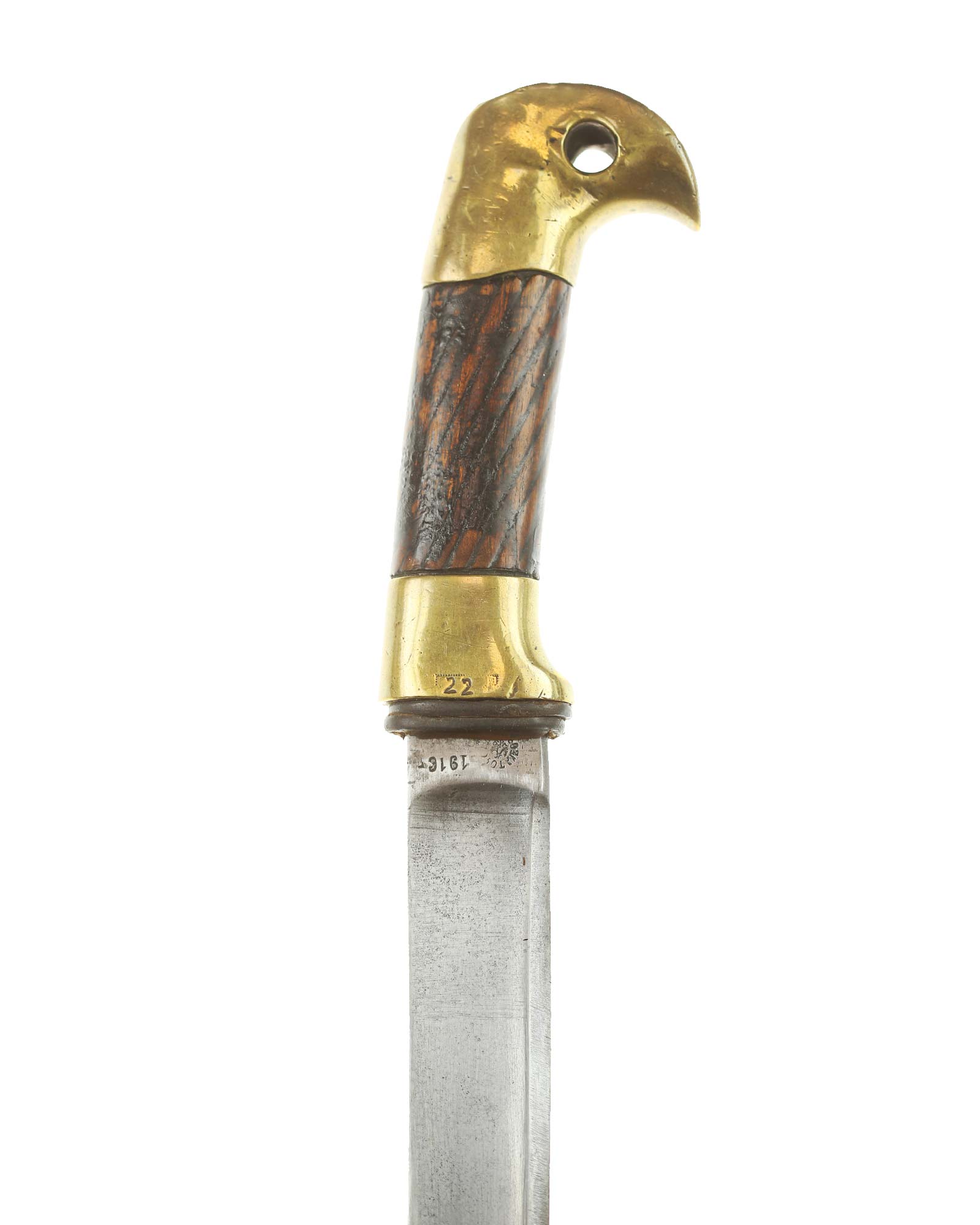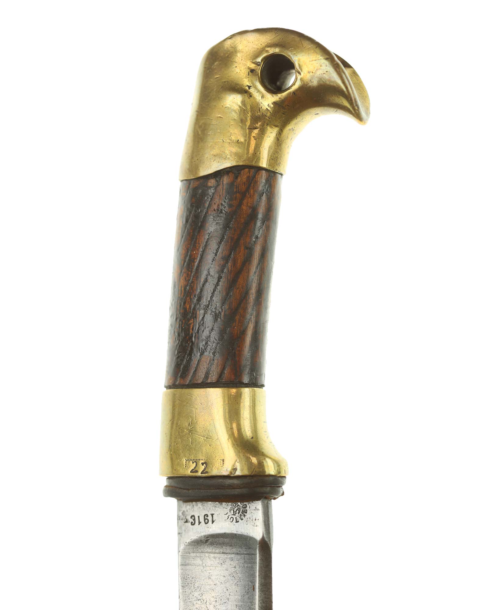 Казачья шашка образца 1881 года. Клинок слегка изогнутый, доленный с обеих сторон с обоюдоострым острием. латунный сосуд. Деревянная рифленая темно-коричневая рукоять, кожаные ножны с фурнитурой. На рукояти и ножнах клеймо 22, на клинке с одной стороны клеймо завода-изготовителя и год 1916, с другой стороны клеймо А и 40.