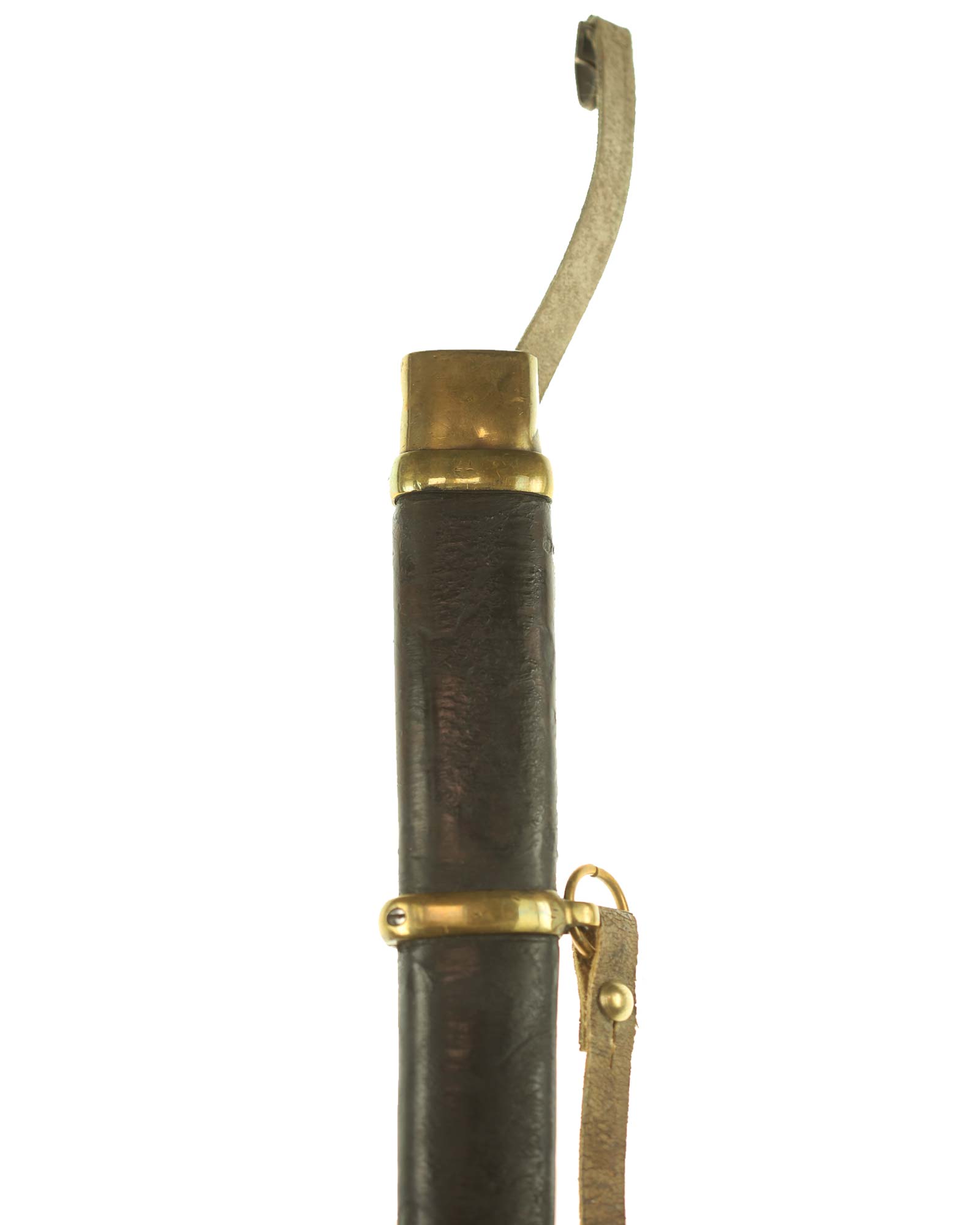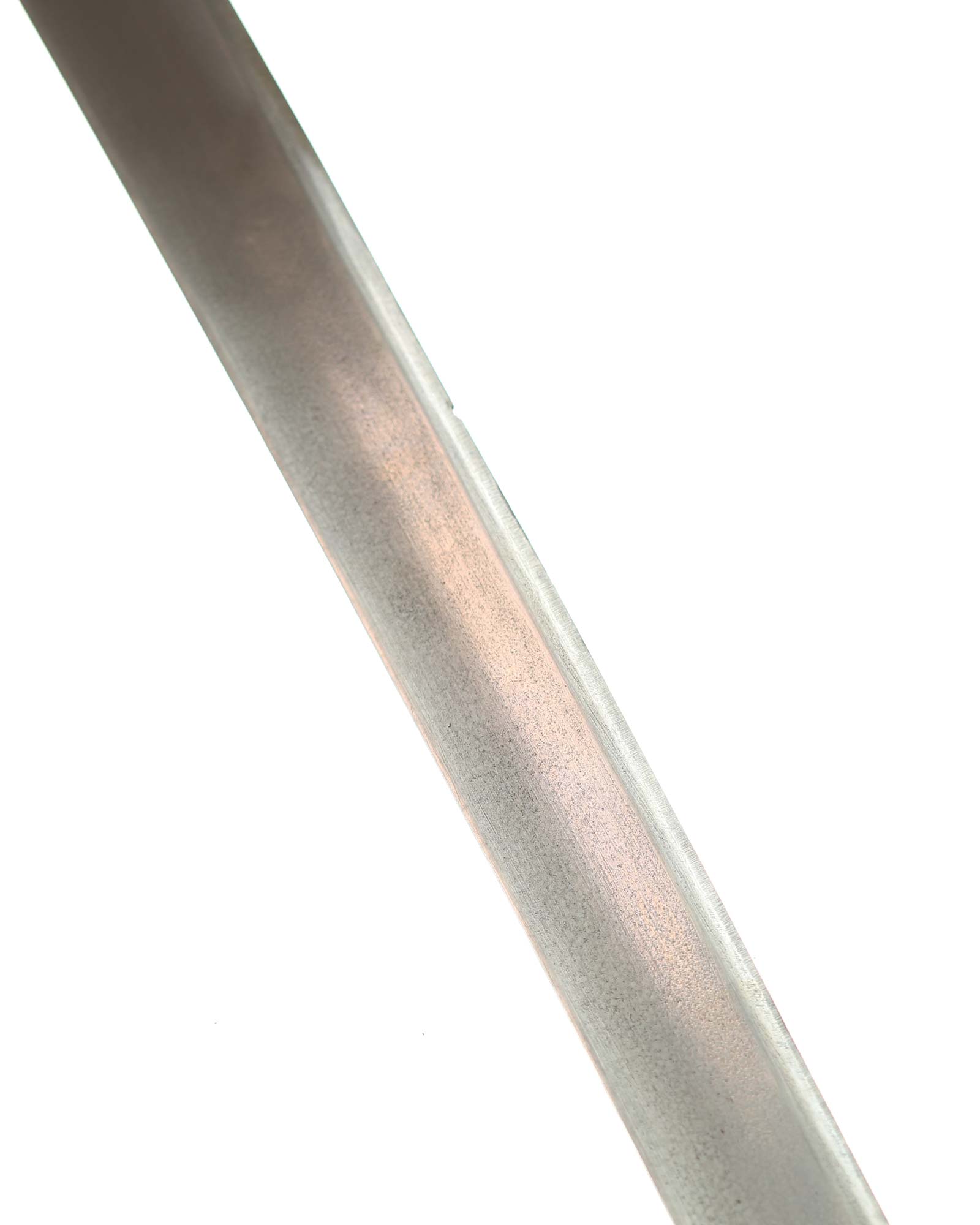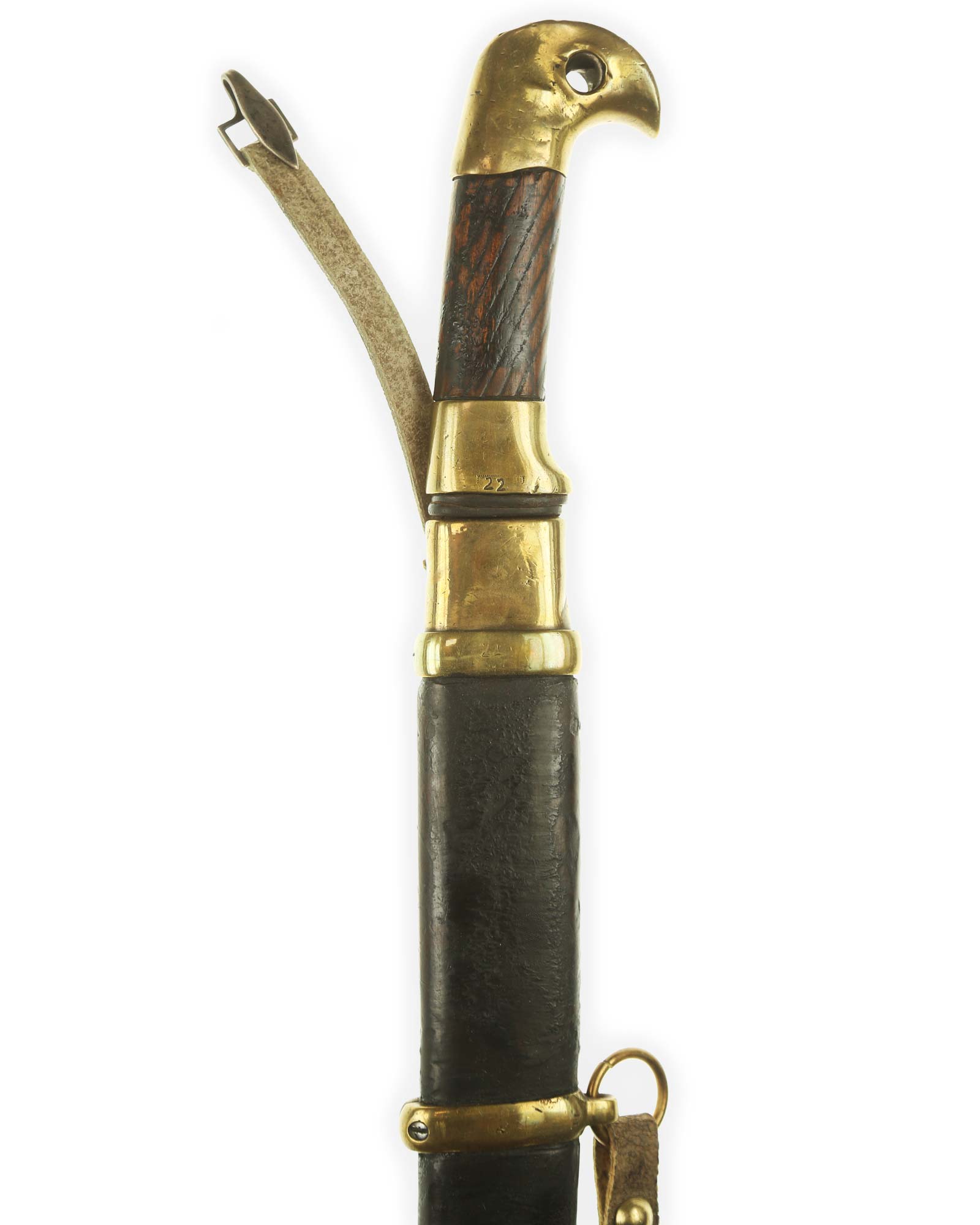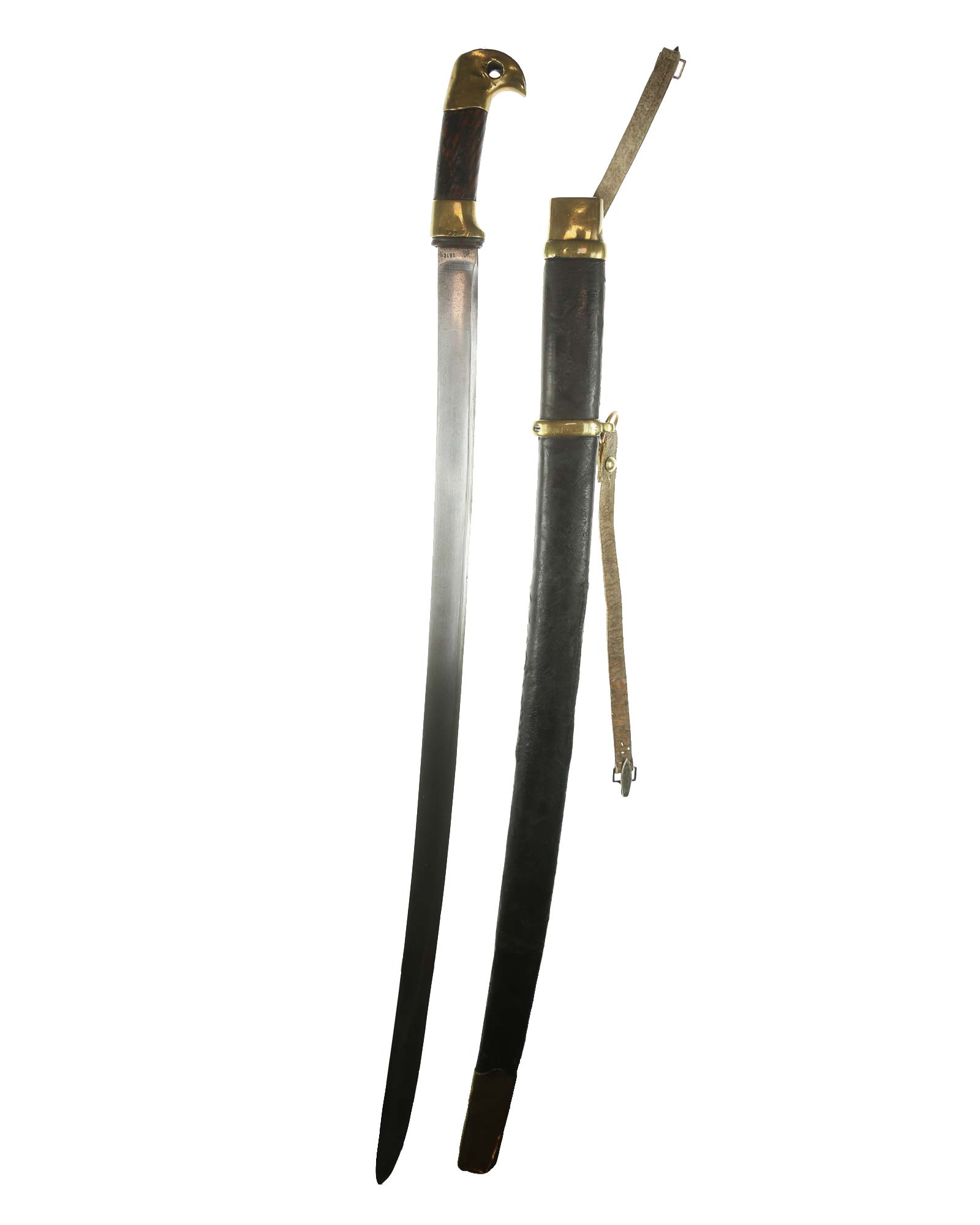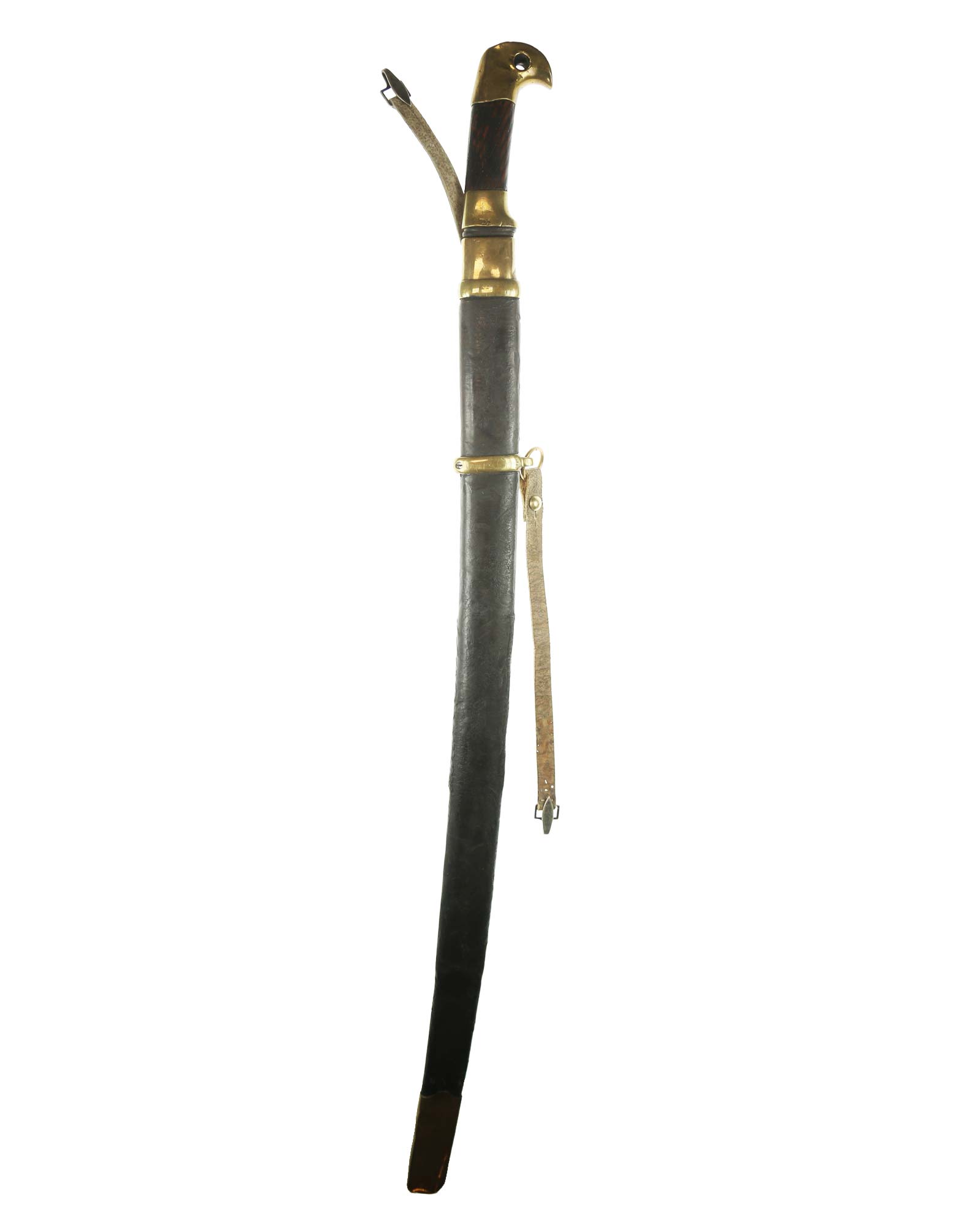 Казачья шашка образца 1881 года. Клинок слегка изогнутый, доленный с обеих сторон с обоюдоострым острием. латунный сосуд. Деревянная рифленая темно-коричневая рукоять, кожаные ножны с фурнитурой. На рукояти и ножнах клеймо 22, на клинке с одной стороны клеймо завода-изготовителя и год 1916, с другой стороны клеймо А и 40.