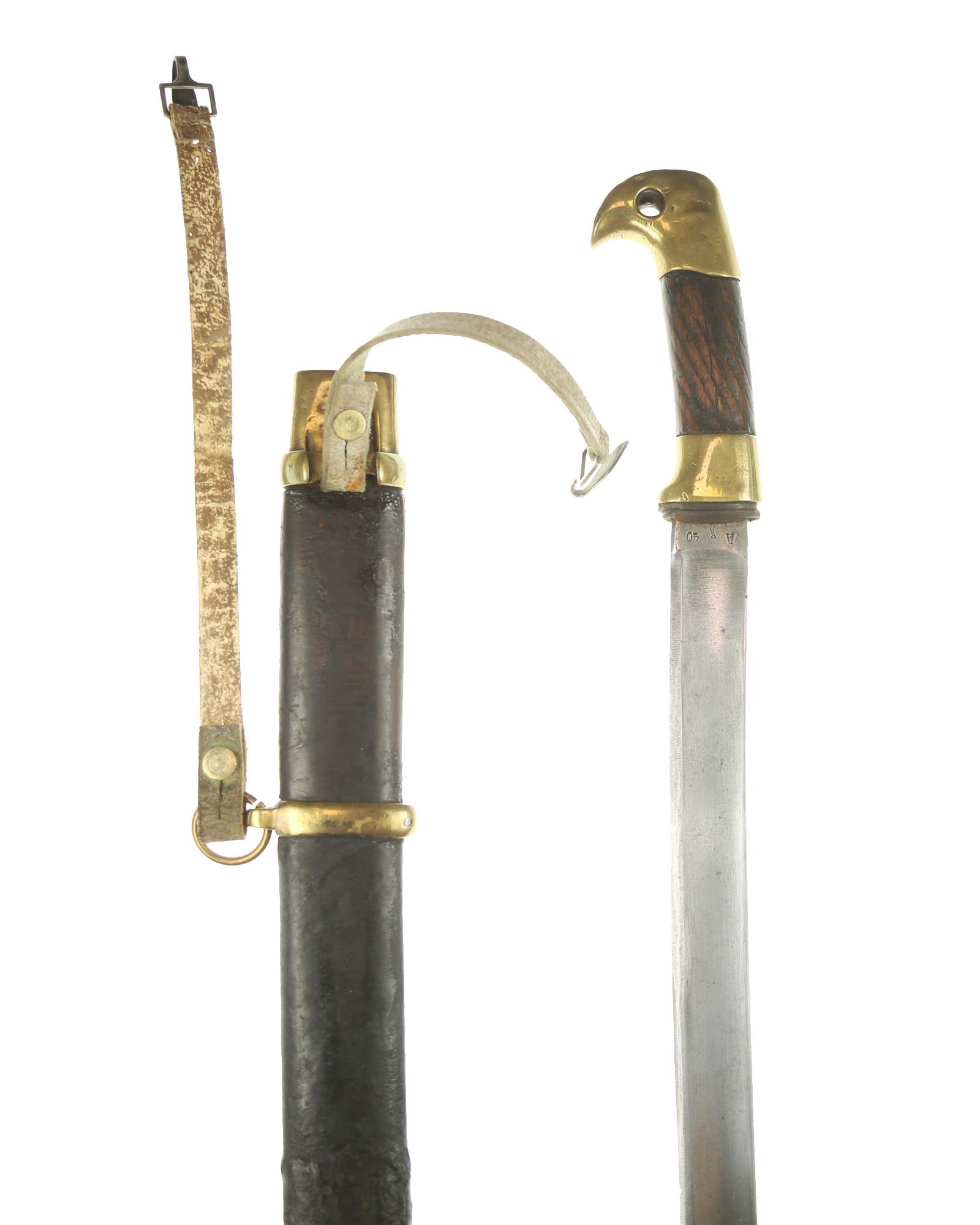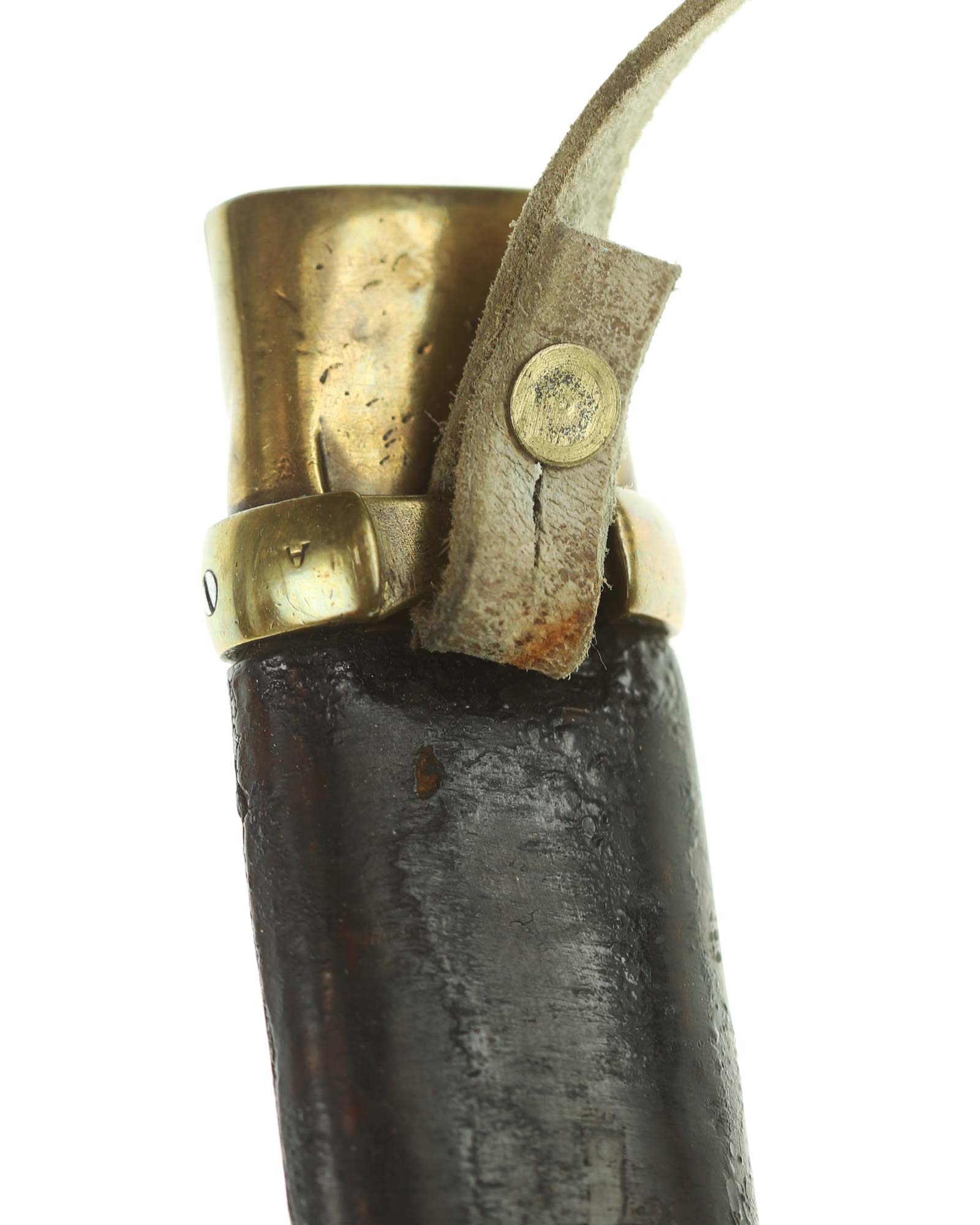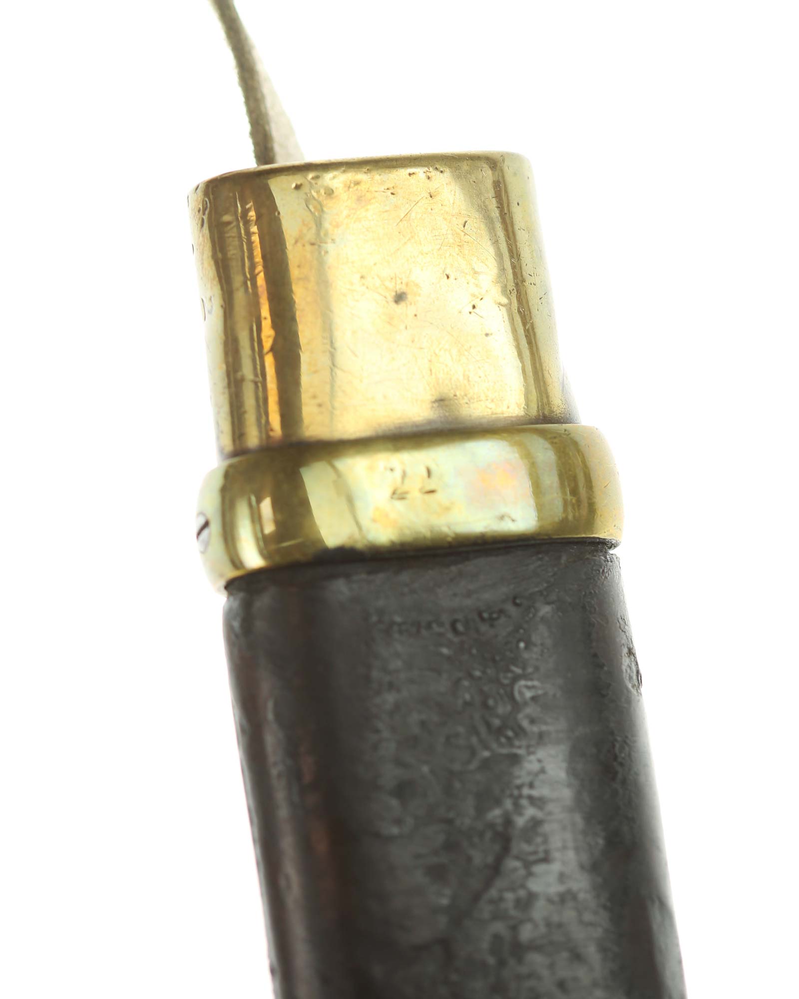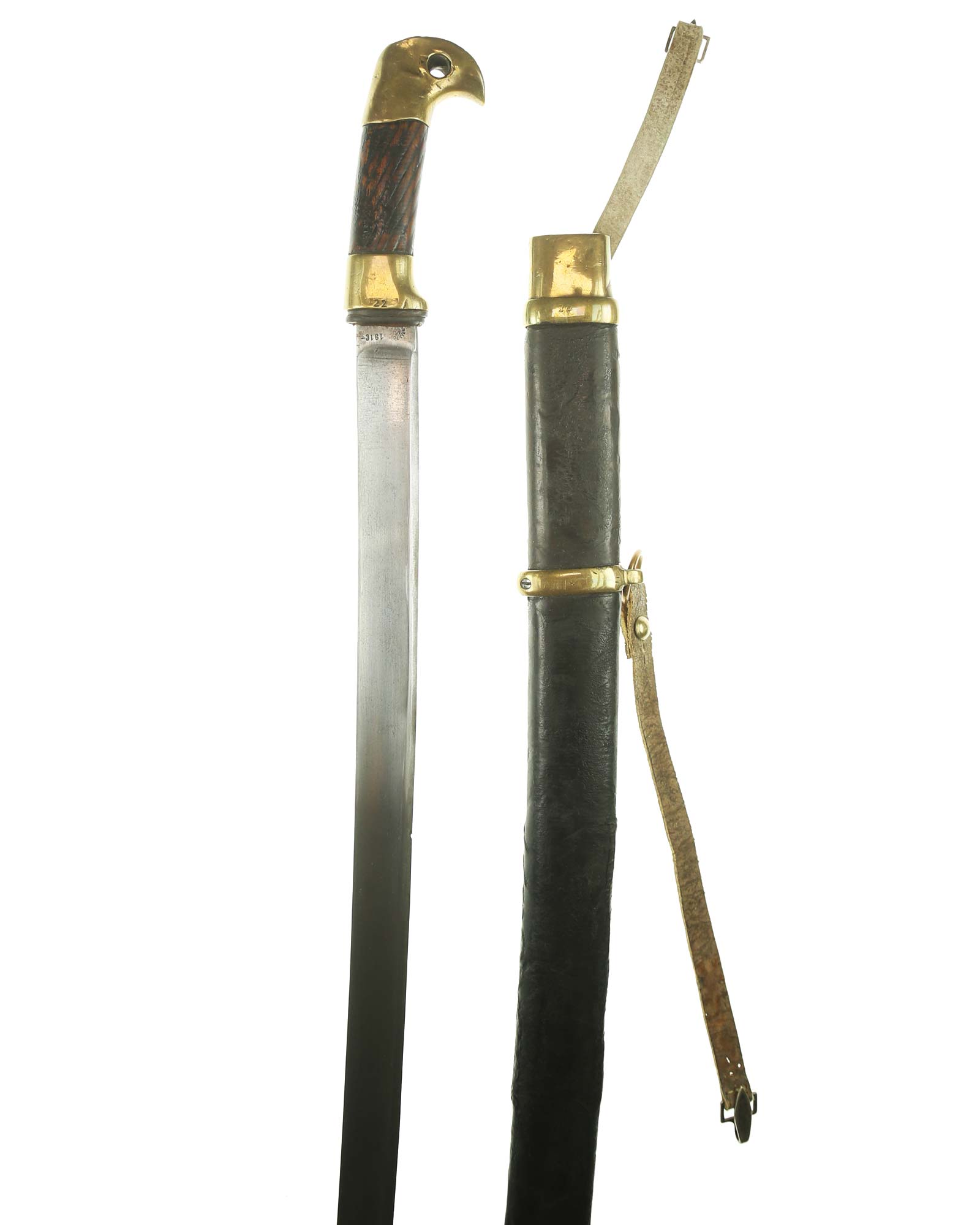 Казачья шашка образца 1881 года. Клинок слегка изогнутый, доленный с обеих сторон с обоюдоострым острием. латунный сосуд. Деревянная рифленая темно-коричневая рукоять, кожаные ножны с фурнитурой. На рукояти и ножнах клеймо 22, на клинке с одной стороны клеймо завода-изготовителя и год 1916, с другой стороны клеймо А и 40.