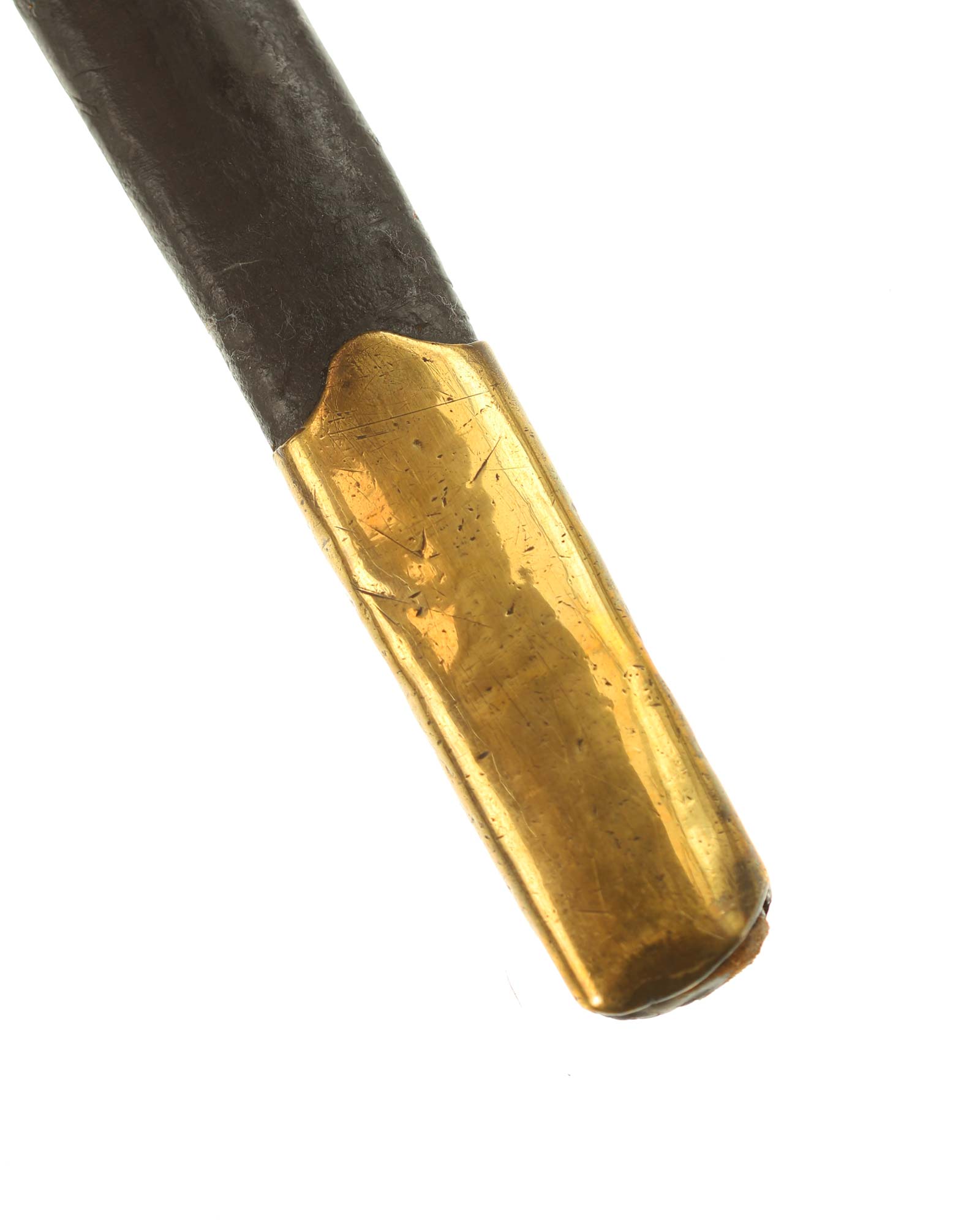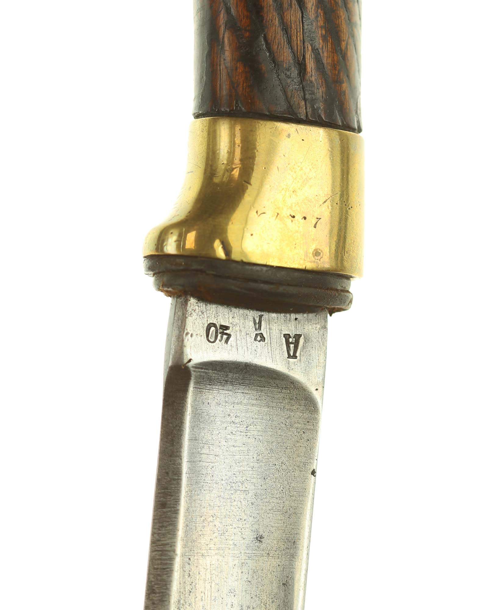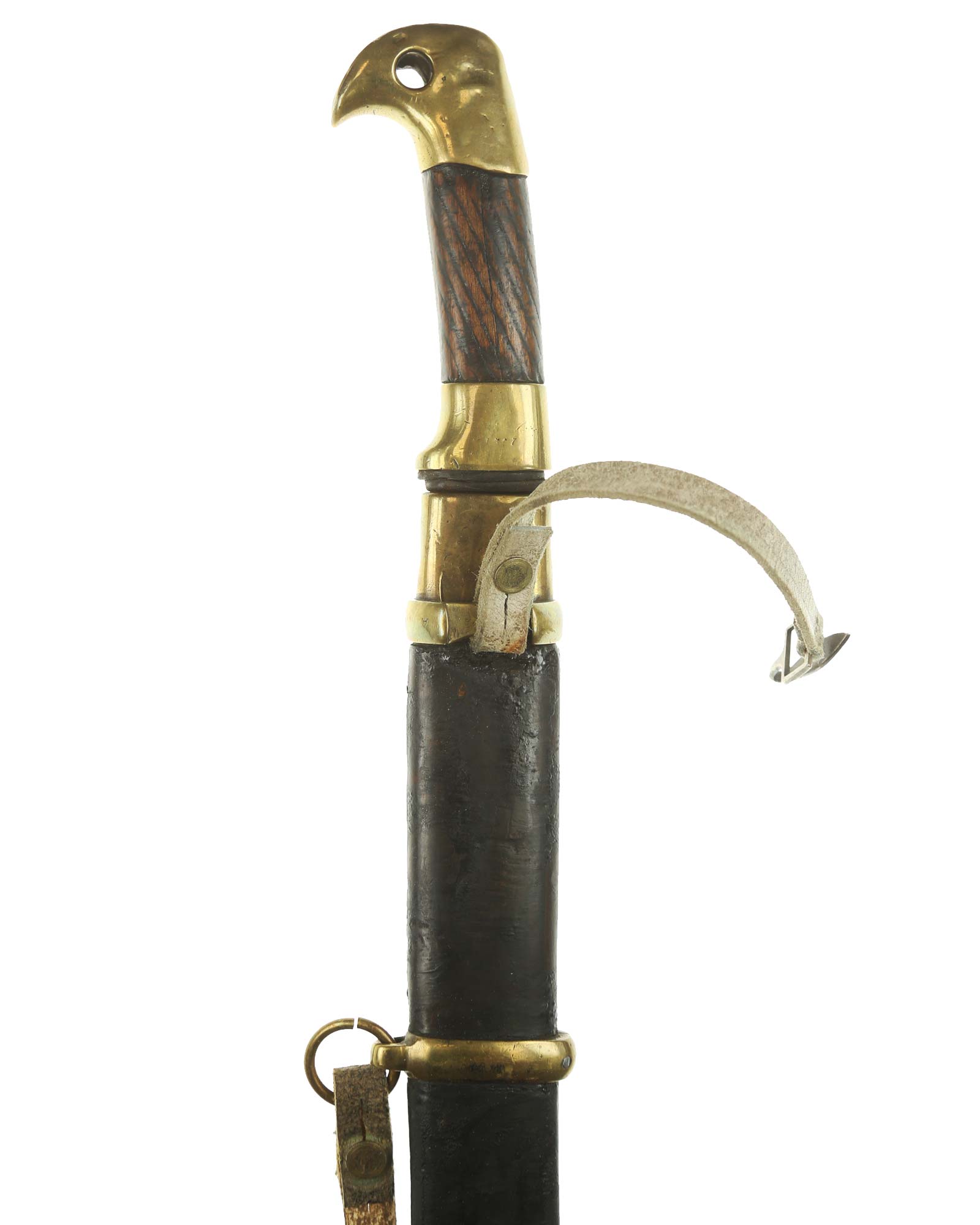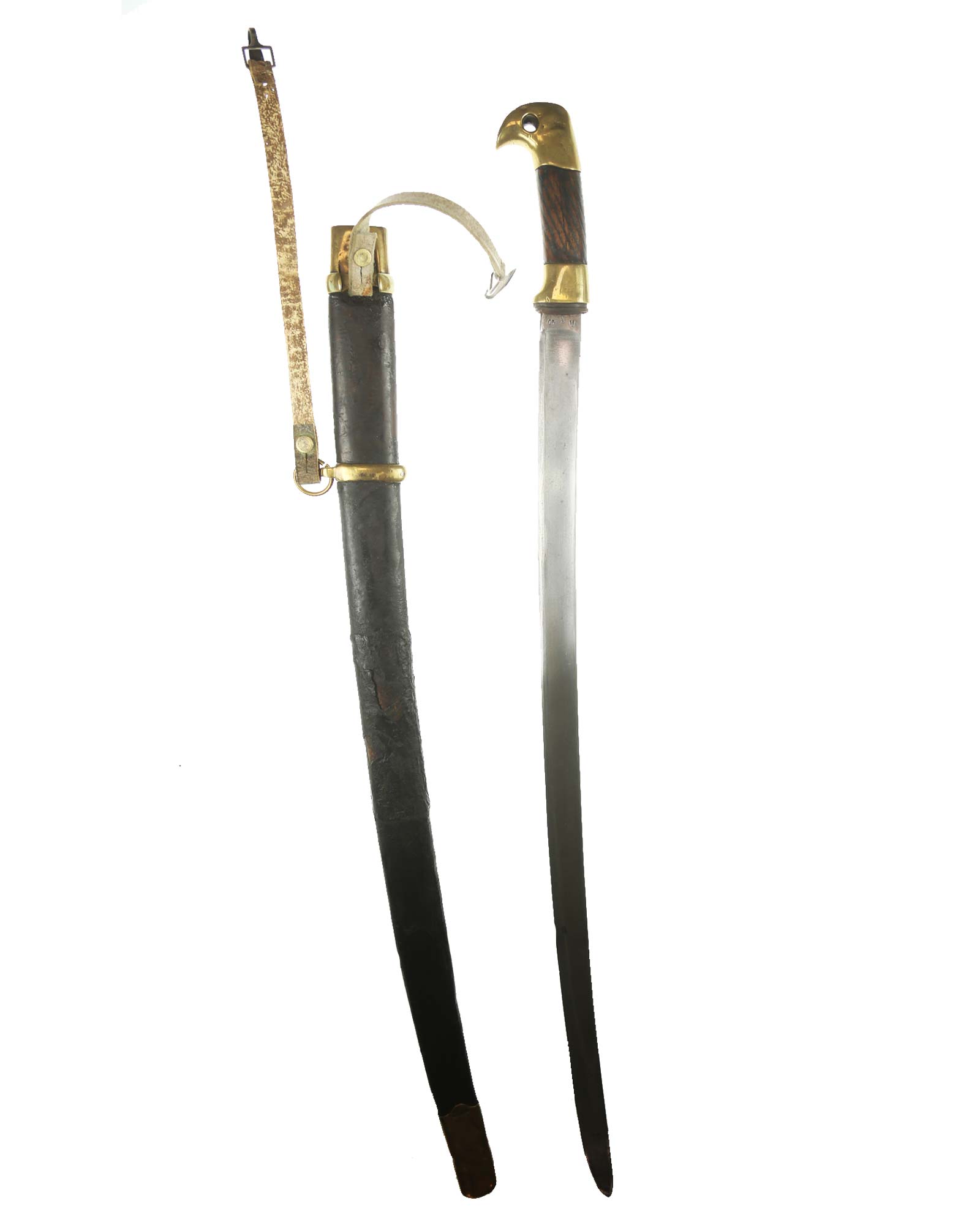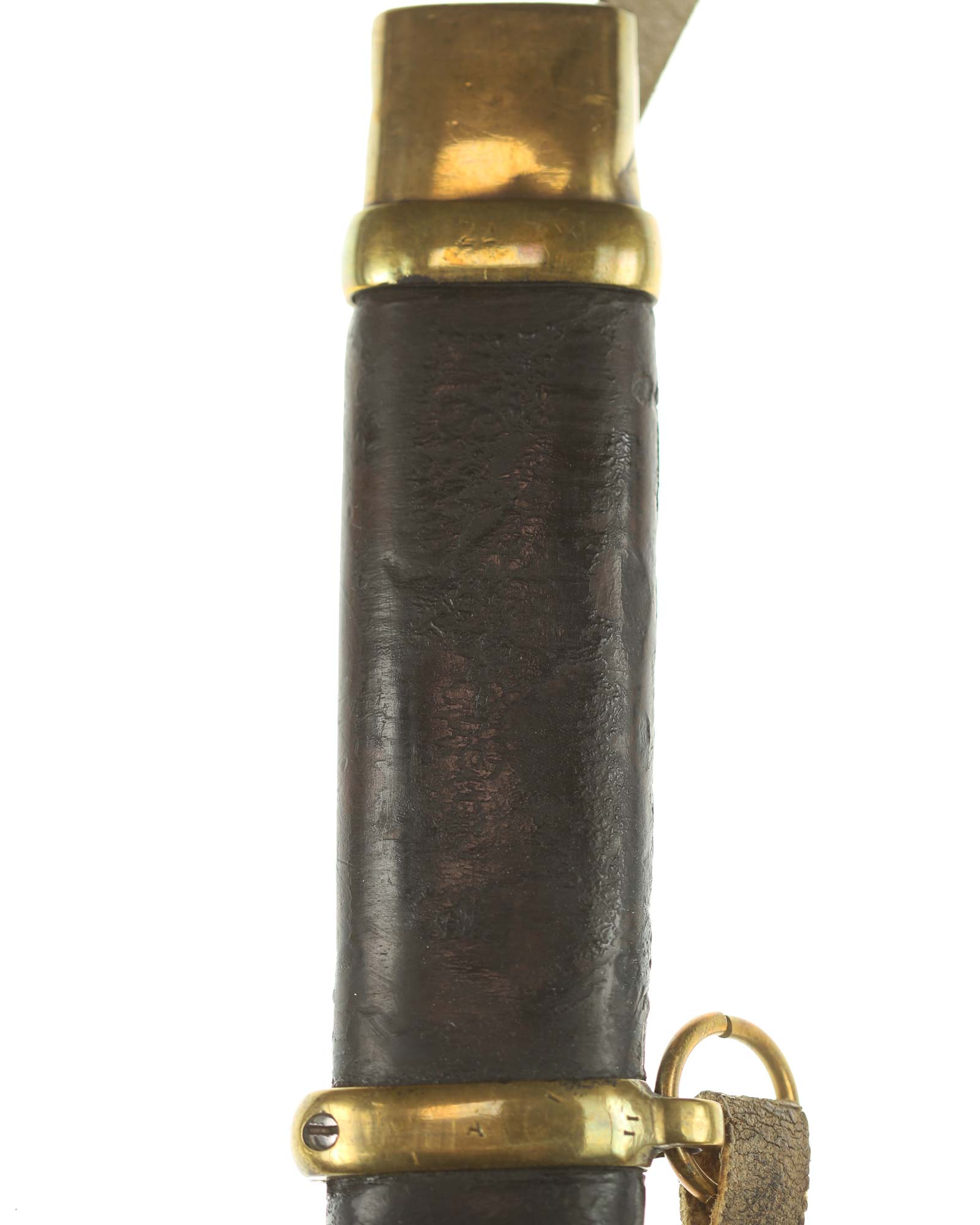 Казачья шашка образца 1881 года. Клинок слегка изогнутый, доленный с обеих сторон с обоюдоострым острием. латунный сосуд. Деревянная рифленая темно-коричневая рукоять, кожаные ножны с фурнитурой. На рукояти и ножнах клеймо 22, на клинке с одной стороны клеймо завода-изготовителя и год 1916, с другой стороны клеймо А и 40.