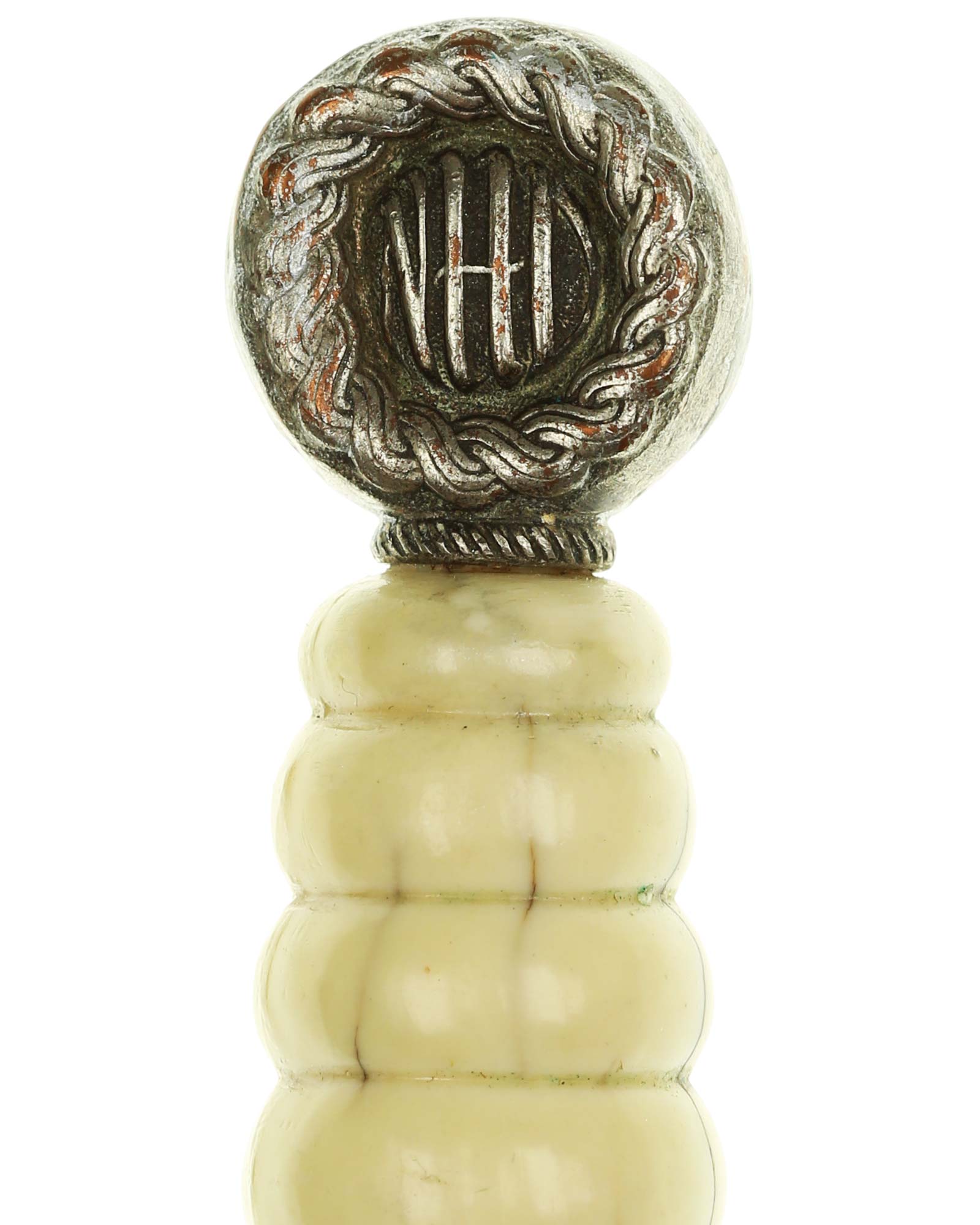 Рукоять: Рукоять деревянная, покрытая пластиком белого цвета, бочкообразная с поперечными желобками. Головка рукояти круглая плоская, поставленная вертикально, навинчивается на хвостовик рукояти. На лицевой стороне головки, в обрамлении орнамента из перекрученных линий, буквы «NHD» — «NEZAVISNA HRVATSKA DRZAVA» — «Независимое Хорватское государство». Крестовина выполнена в виде фигуры раскинувшего крылья орла, под которым в обрамлении скрученной веревки имеется овальная шайба. Все половинки деталей эфеса отштампованы из латуни, спаяны вместе и никелированы. Под перекрестьем имеется овальная кожаная прокладка.