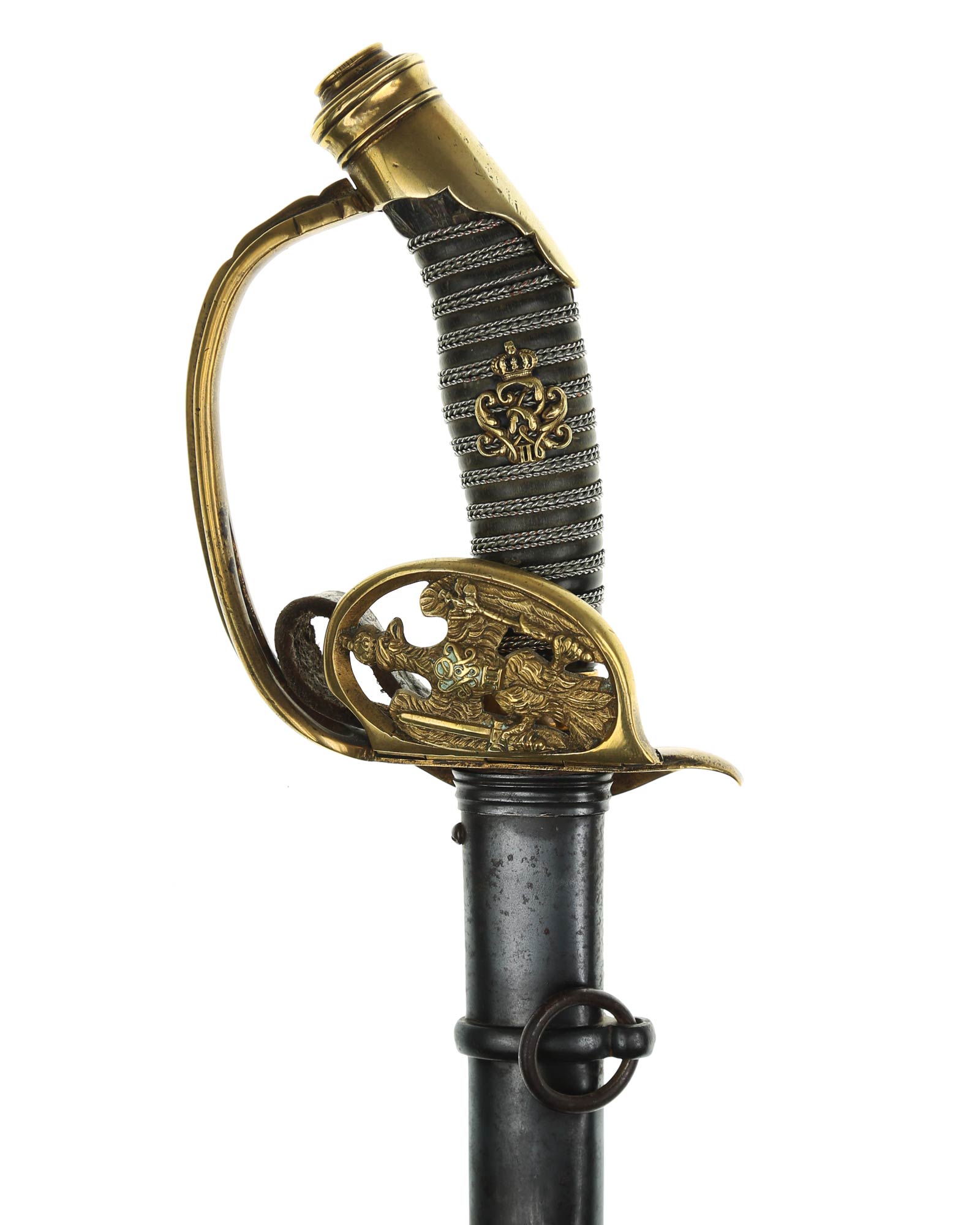 Рукоять: Эфес состоит из рукояти и латунной гарды. Рукоять деревянная, обтянутая кожей со спиралевидными желобками, по которым перевита тремя рядами проволоки. Вверху на рукояти латунная втулка, сверху которой овальная плоская головка. На внешней стороне рукояти накладной латунный вензель «WR II» (Вильгельм II, германский император в 1888-1918 гг.). Внизу на рукояти латунная втулка. Гарда образована защитной дужкой, переходящей в узкую чашку с загнутым вниз внутренним краем и двумя боковыми дужками. Между двух дополнительных дужек располагается прорезное изображение германского орла с вензелем Вильгельма II на груди.