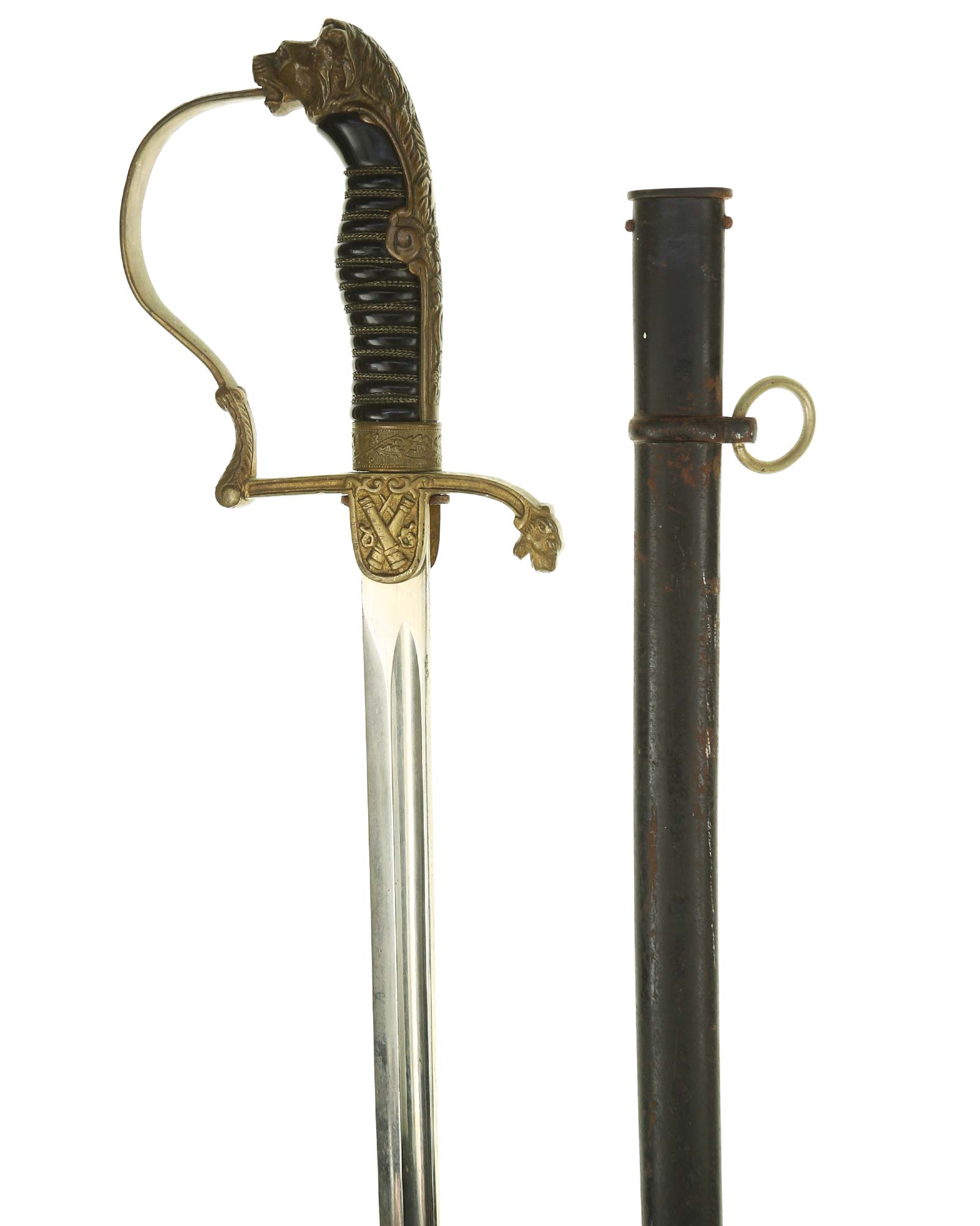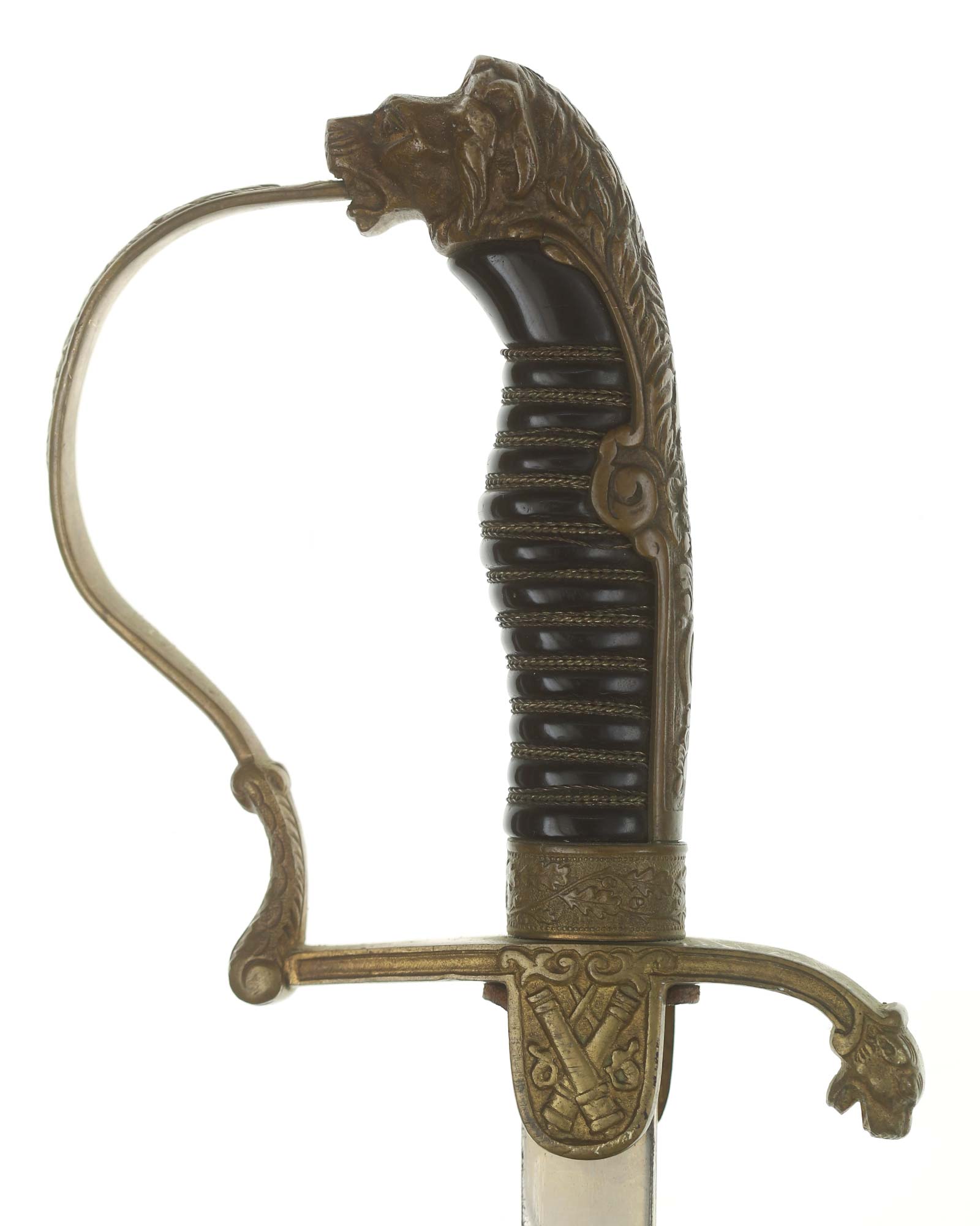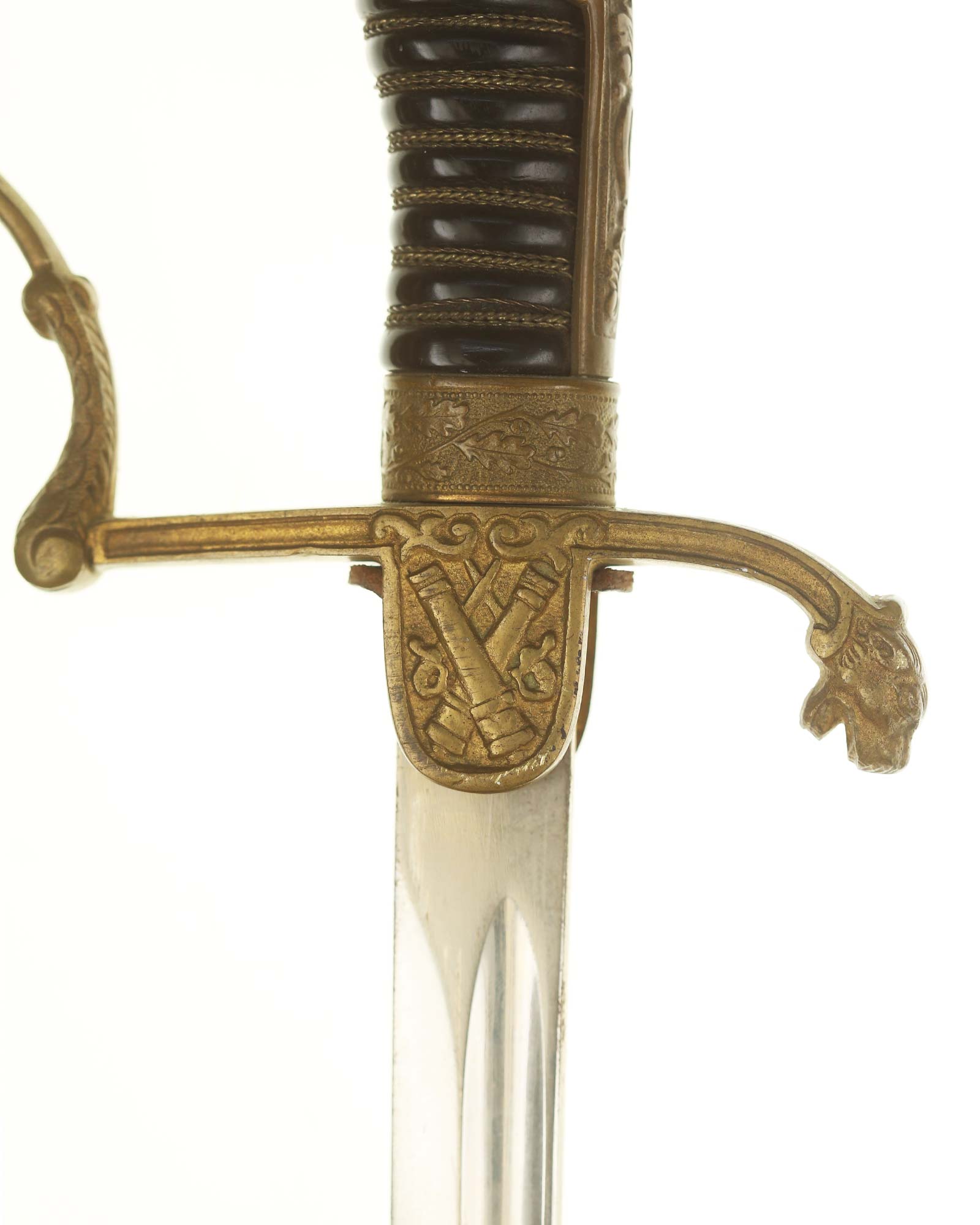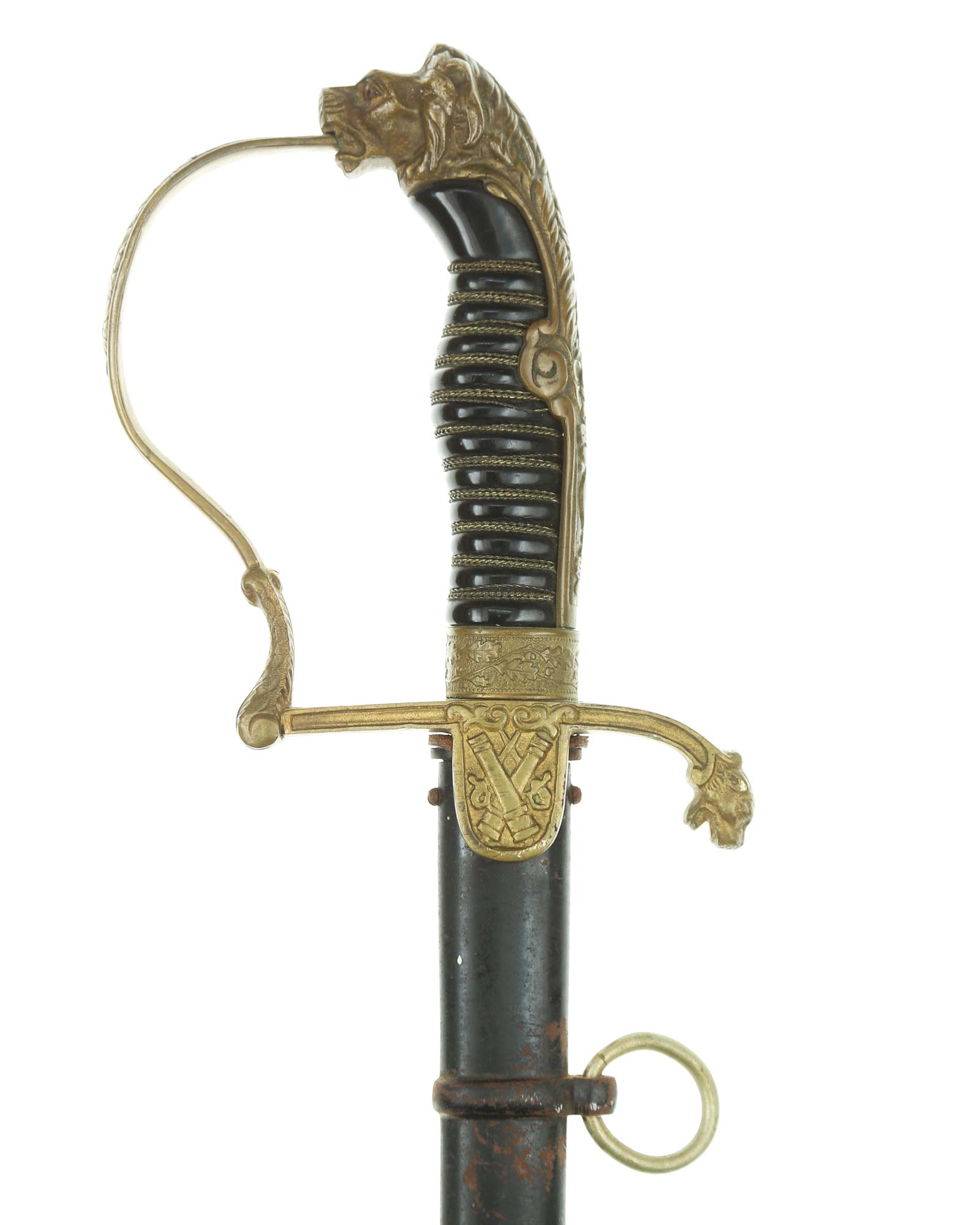 Прусская артиллерийская сабля для офицеров (сабля с львиной головой). Эфес в виде головы льва с крестовиной, украшенной дубовыми листьями, черная рукоять с неповрежденной проволочной обмоткой. Оба пера украшены, скрещенные пушки на лицевой стороне. Слегка изогнутый клинок, два фуллера. Ножны из черной лакированной стали с кольцом для подвеса.