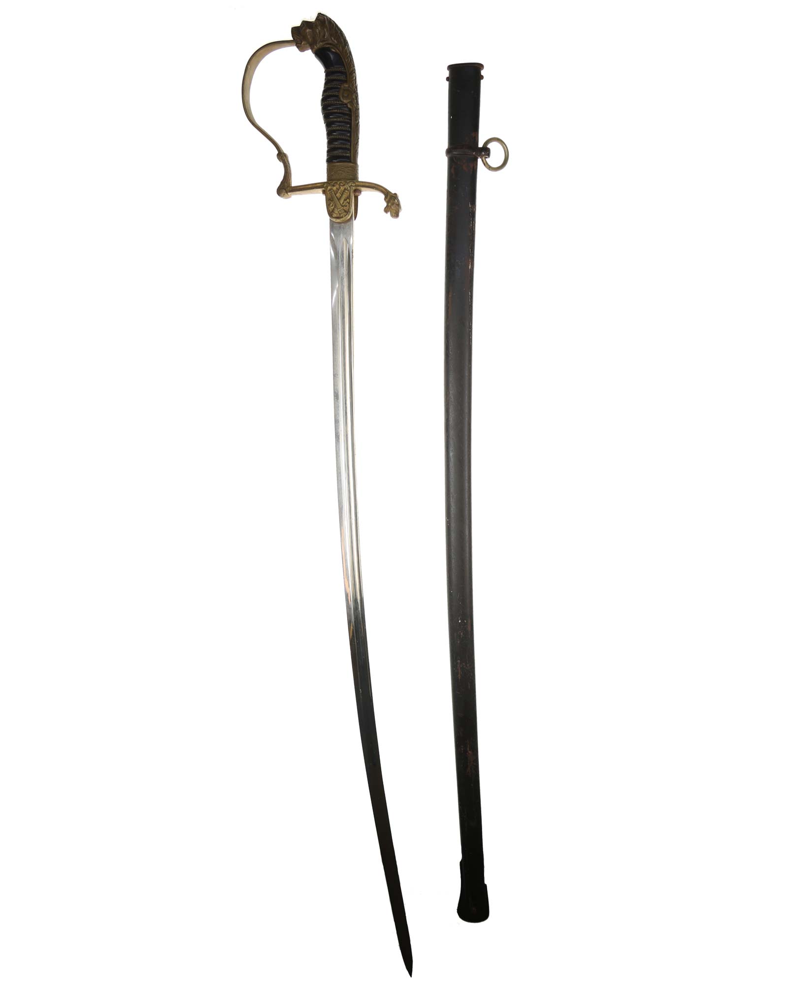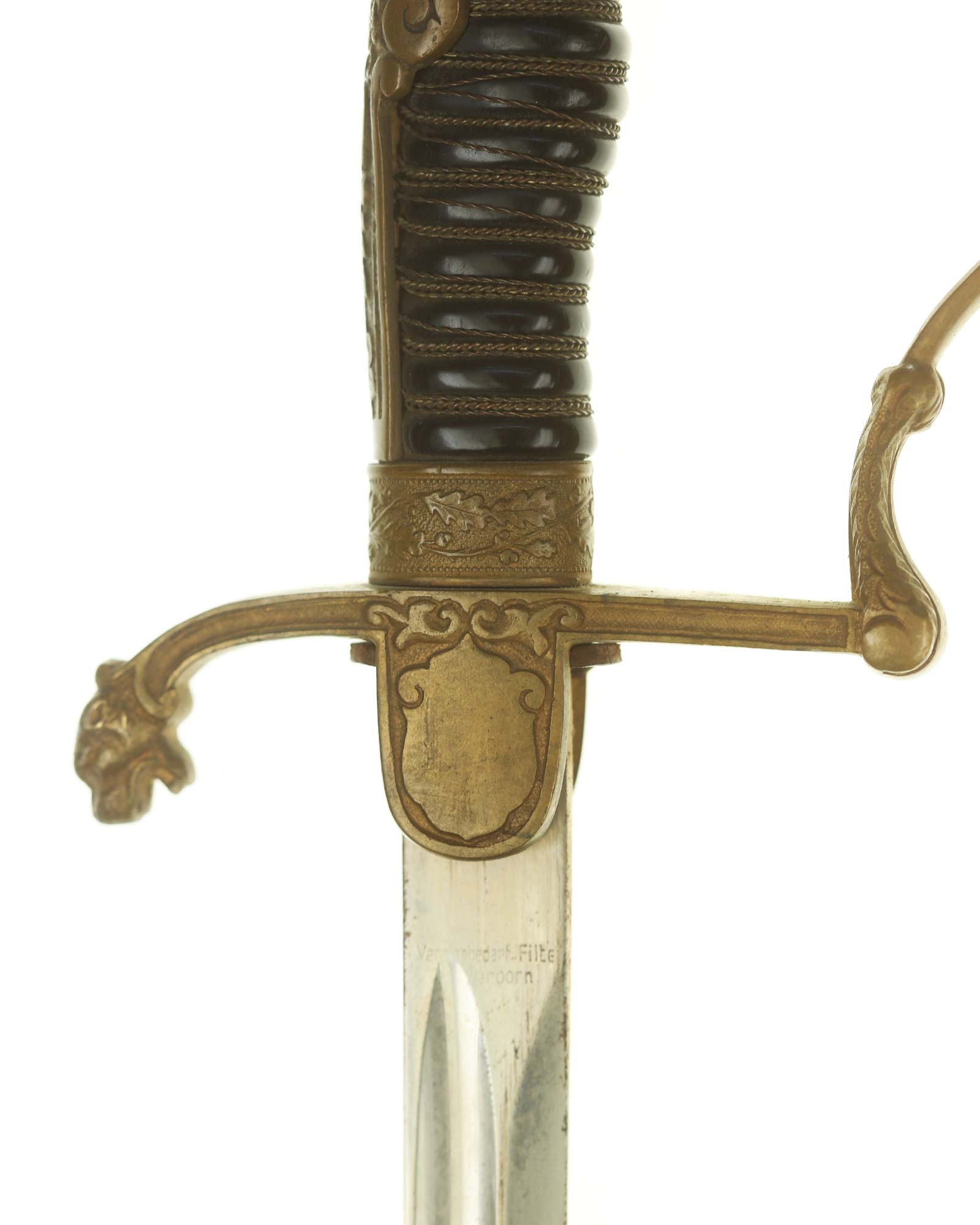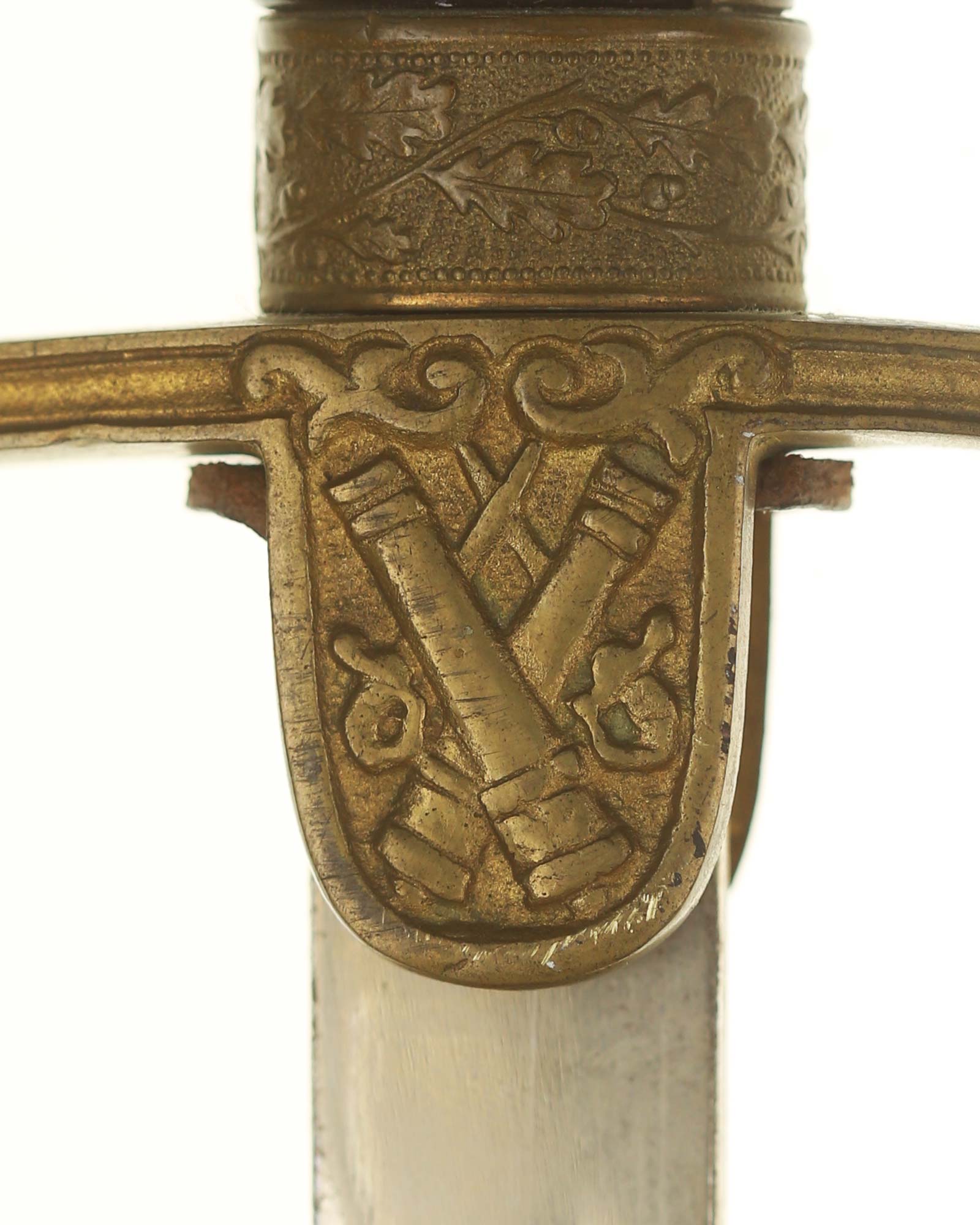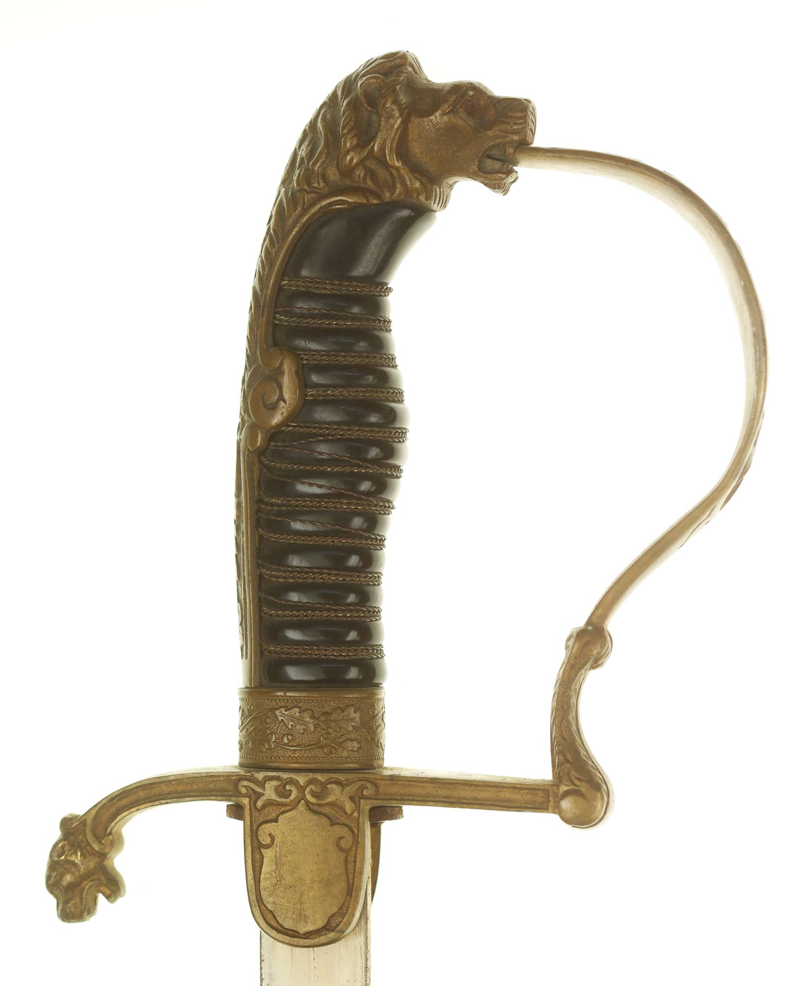 Прусская артиллерийская сабля для офицеров (сабля с львиной головой). Эфес в виде головы льва с крестовиной, украшенной дубовыми листьями, черная рукоять с неповрежденной проволочной обмоткой. Оба пера украшены, скрещенные пушки на лицевой стороне. Слегка изогнутый клинок, два фуллера. Ножны из черной лакированной стали с кольцом для подвеса.