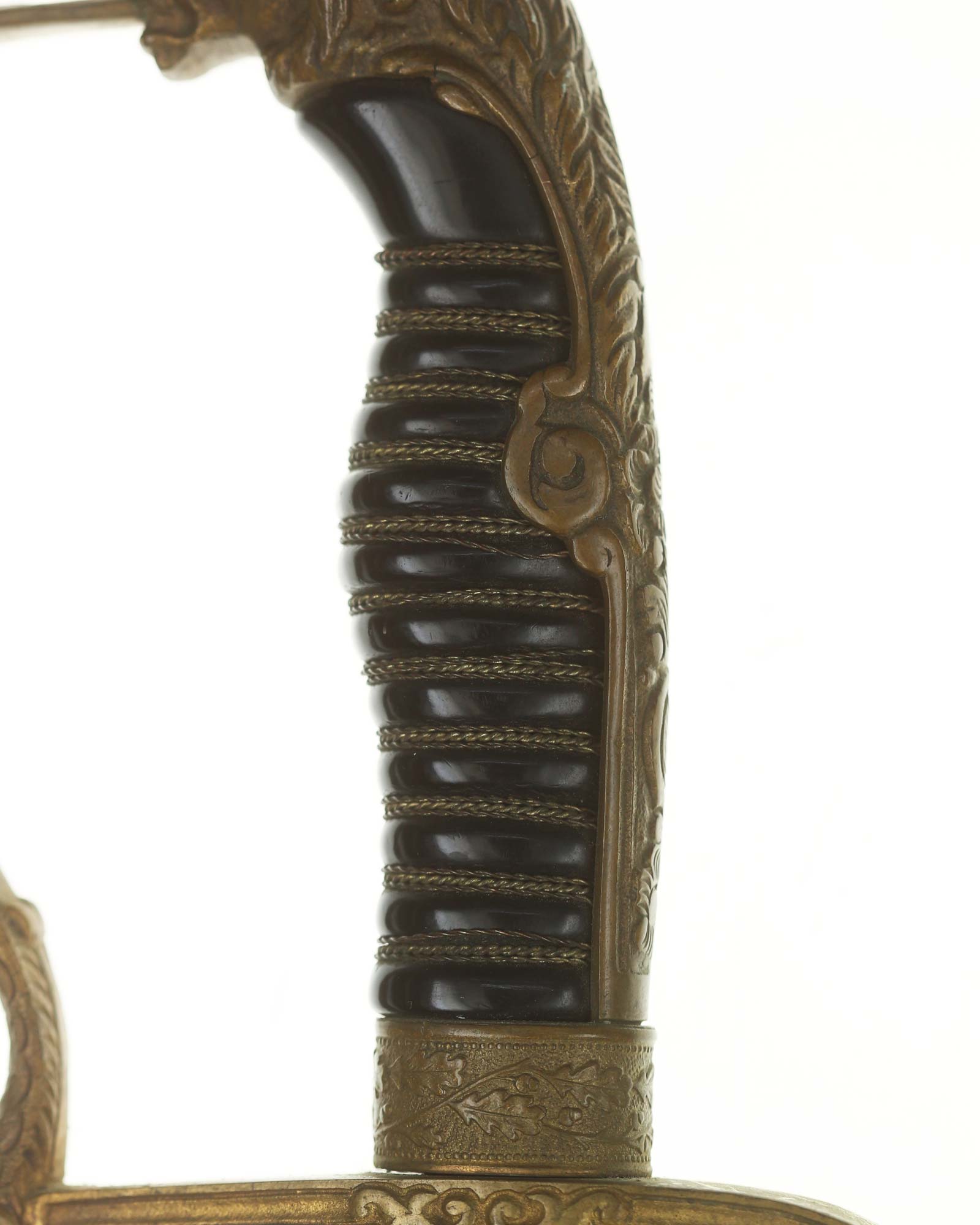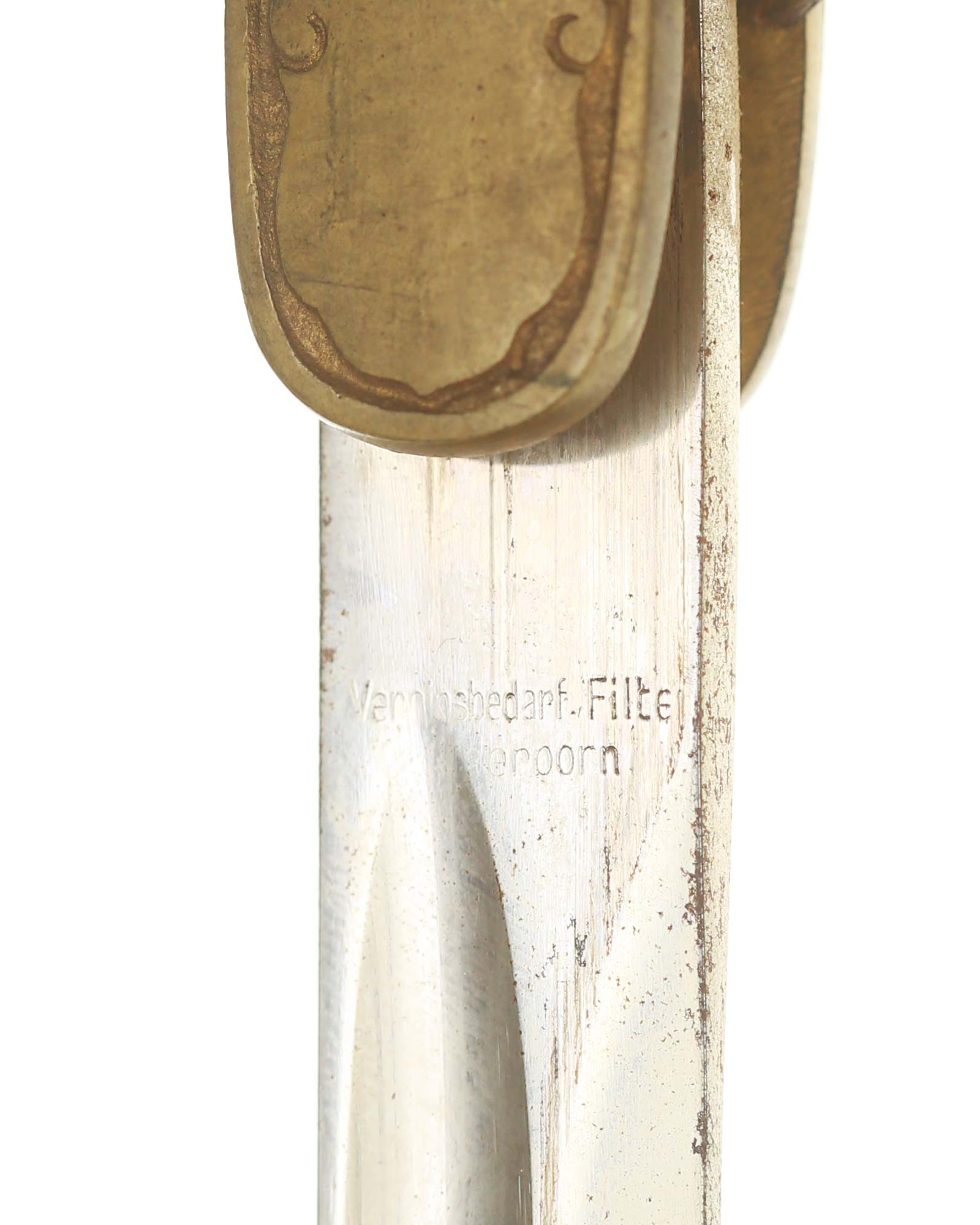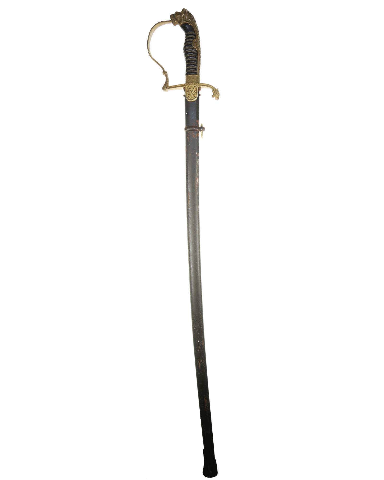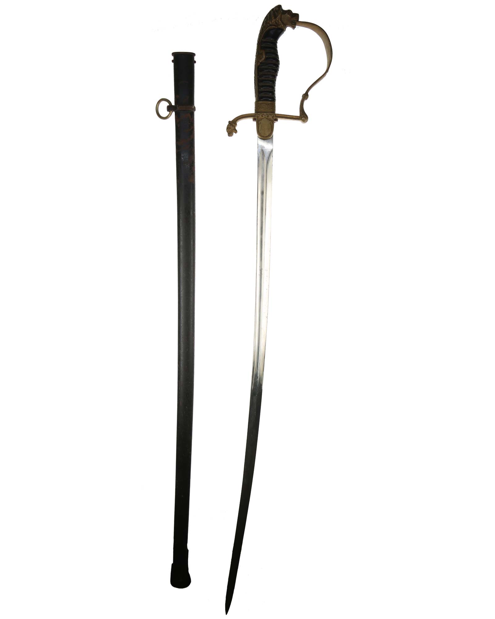 Прусская артиллерийская сабля для офицеров (сабля с львиной головой). Эфес в виде головы льва с крестовиной, украшенной дубовыми листьями, черная рукоять с неповрежденной проволочной обмоткой. Оба пера украшены, скрещенные пушки на лицевой стороне. Слегка изогнутый клинок, два фуллера. Ножны из черной лакированной стали с кольцом для подвеса.