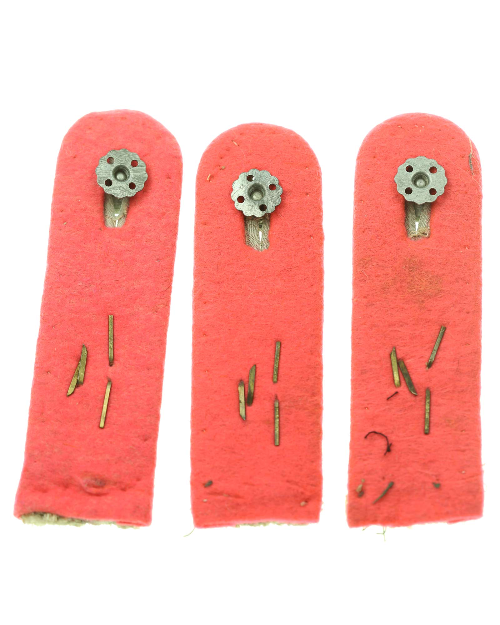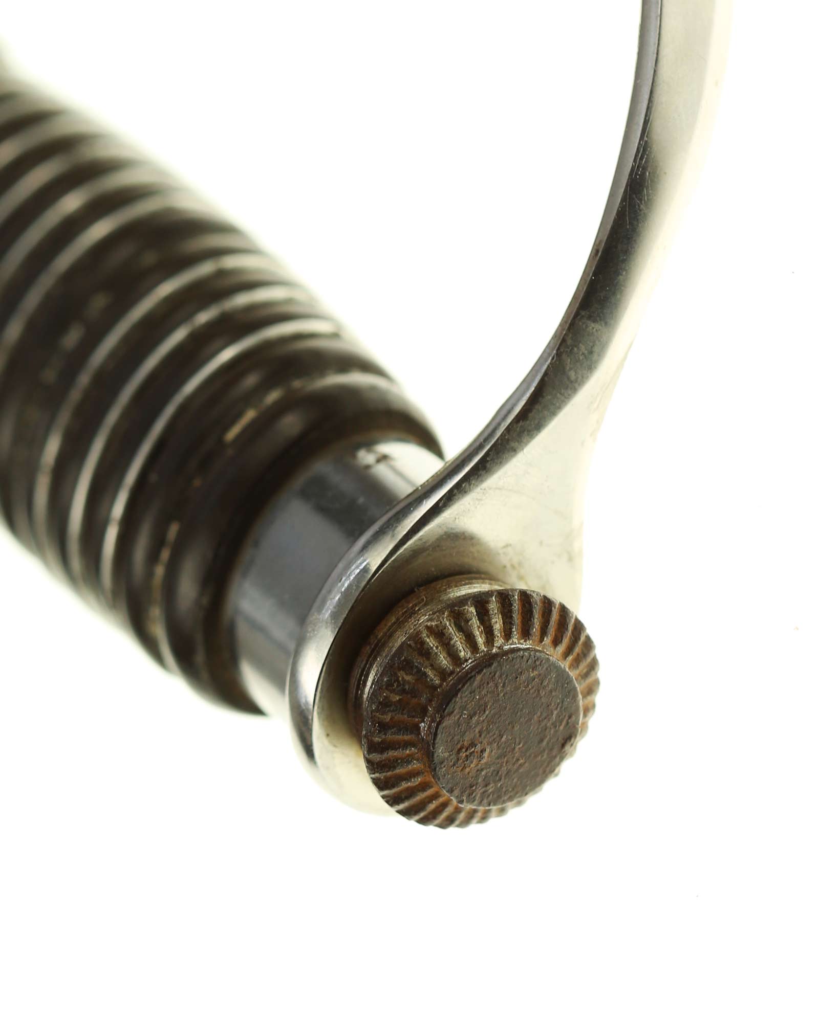 Рукоять: Эфес состоит из нижней втулки, рукояти, дужки одной стороной загнутой в сторону клинка, а другой, стороной плавно уходящей в верх к навершию и навершия в виде круглой плоской накладки. Втулка стальная, украшена рельефным изображением дубовых листьев по всей окружности. Рукоять деревянная с поперечными желобками, выкрашенная в черный цвет. Прибор гарды стальной никелированный с незначительными потерями никелированного покрытия. Палаш с оригинальным офицерским темляком SS.