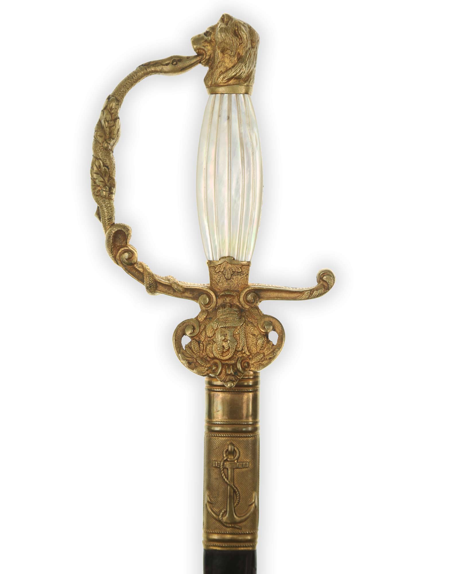 Шпага для офицеров императорского и королевского флота, модель 1907 г. Латунный эфес с откидной гардой, на орле сохранились все знаки отличия правителя. Никелированный однолезвийный клинок с фуллерами с обеих сторон. Позолоченный латунный кастетный эфес с монтировкой в виде головы льва, гарда с накладным вензелем правителя «FJI.». Рифленые чешуйки рукояти из перламутра. Кожаные ножны с латунными креплениями.