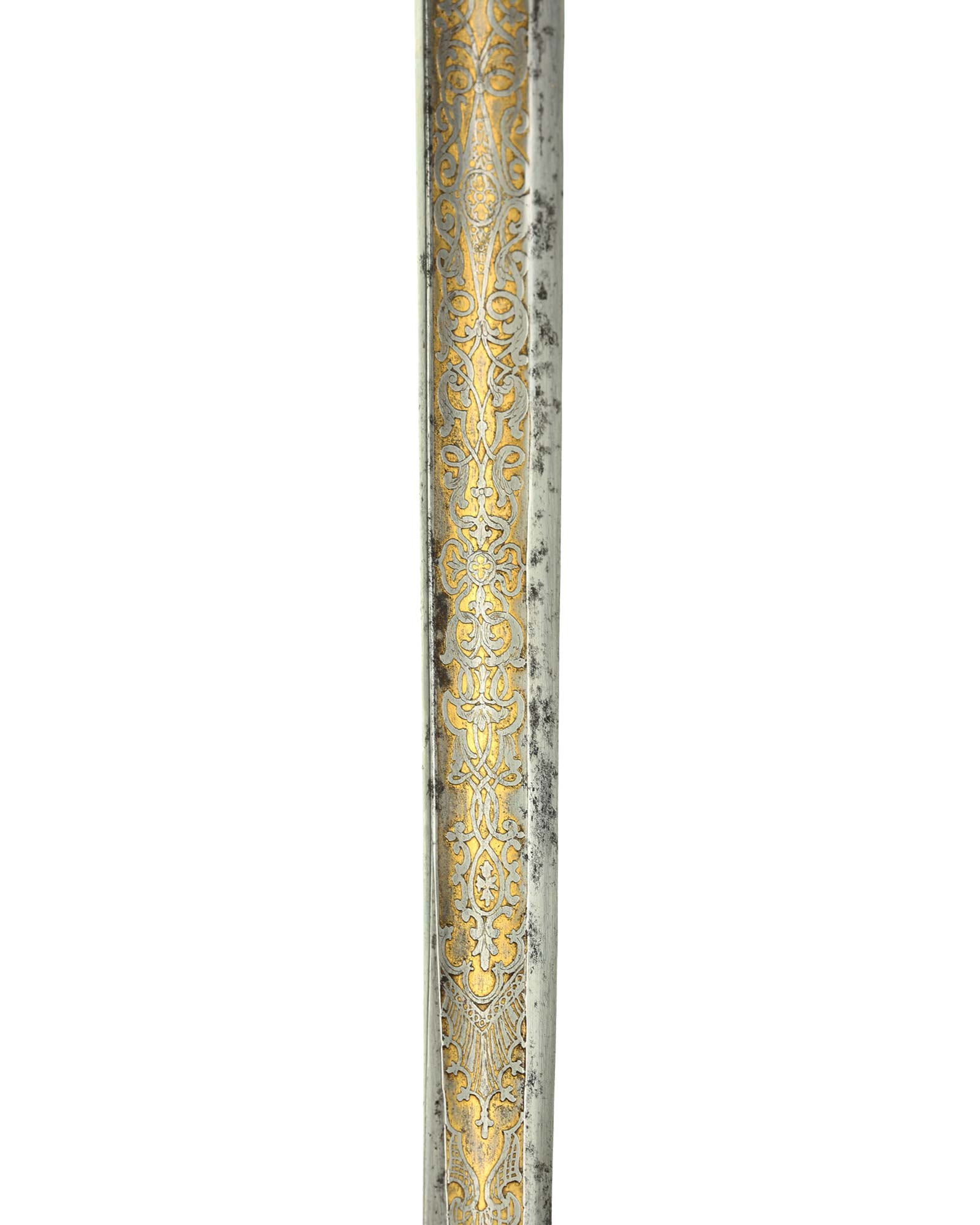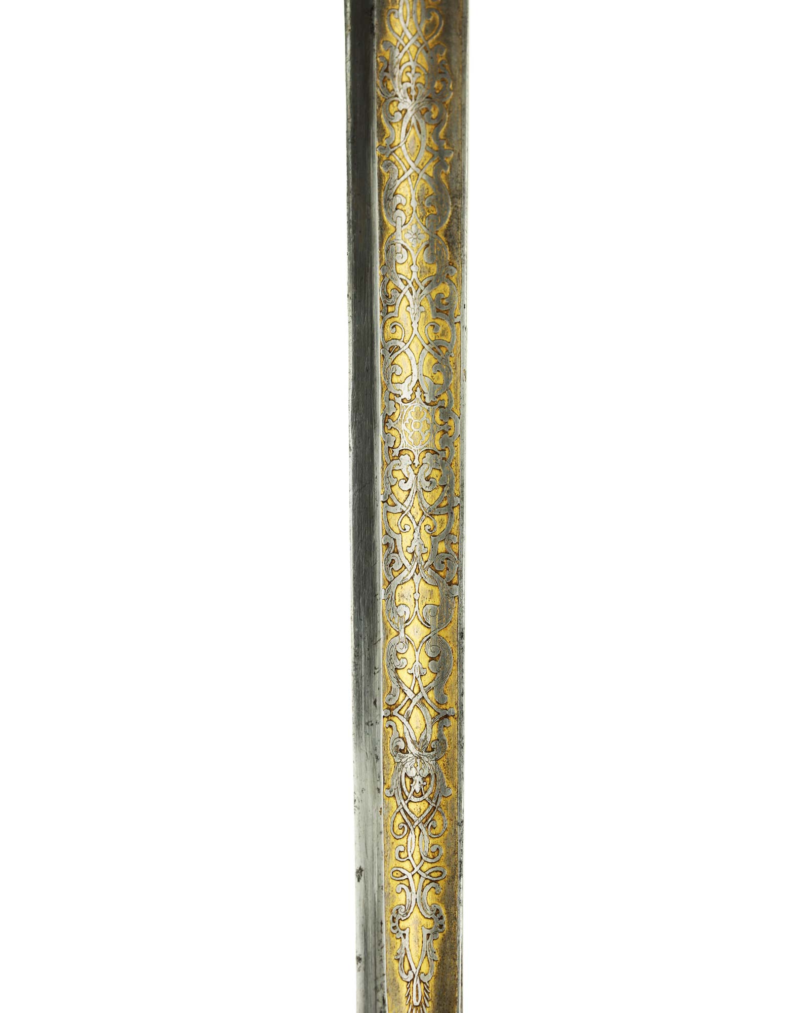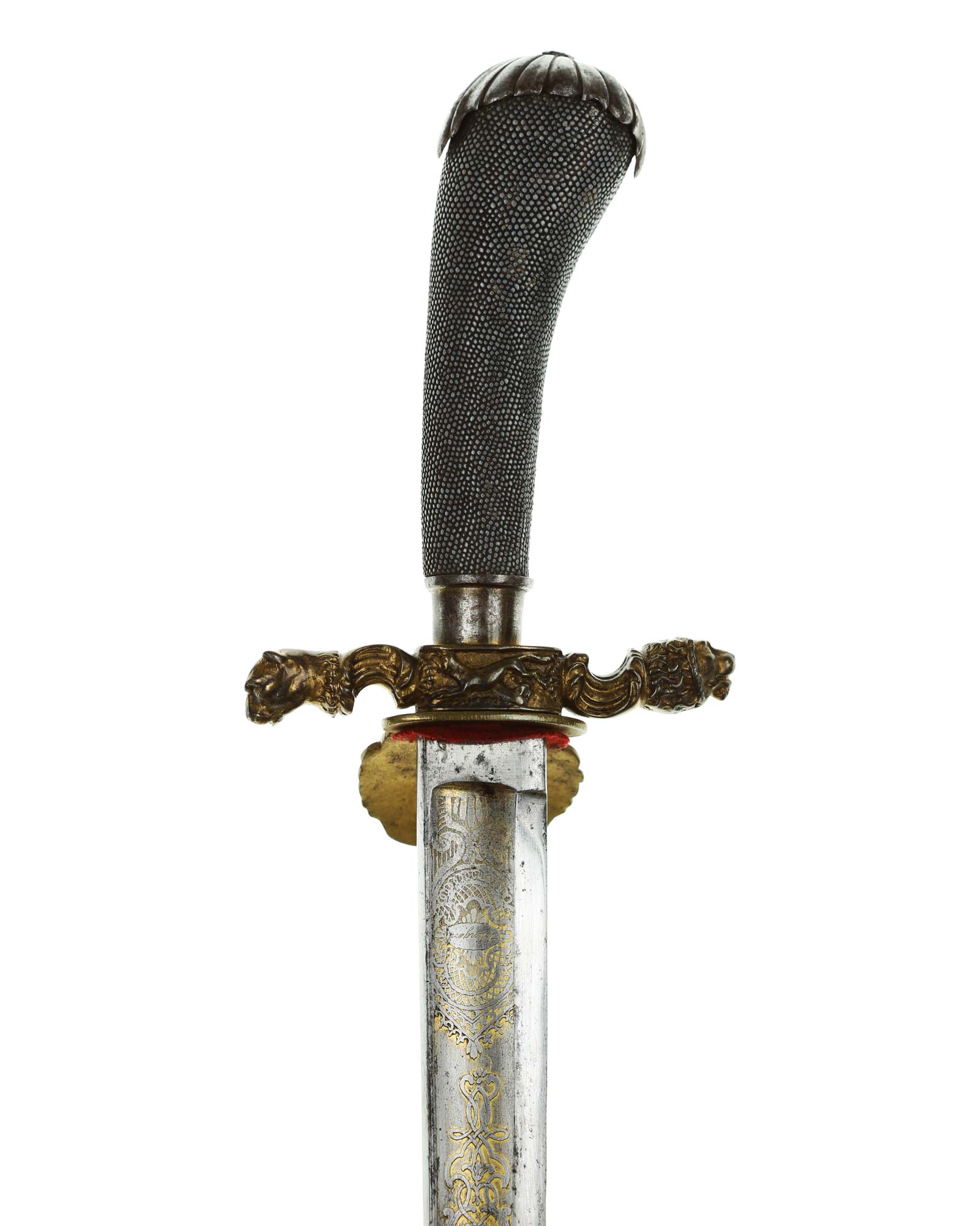Клинок: Клинок прямой, стальной, однолезвийные, плоский, с двух сторон украшен травленым орнаментом.