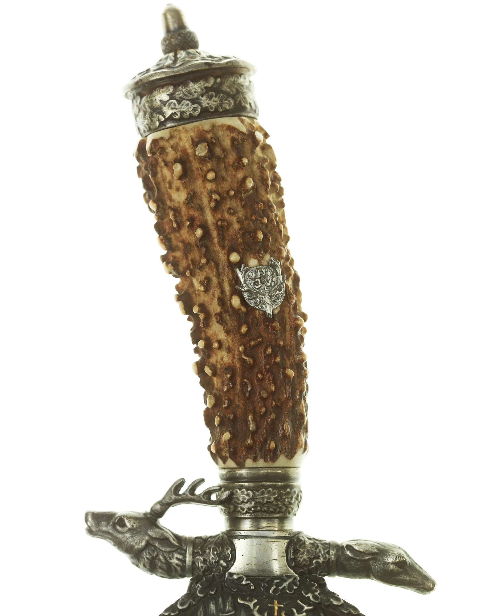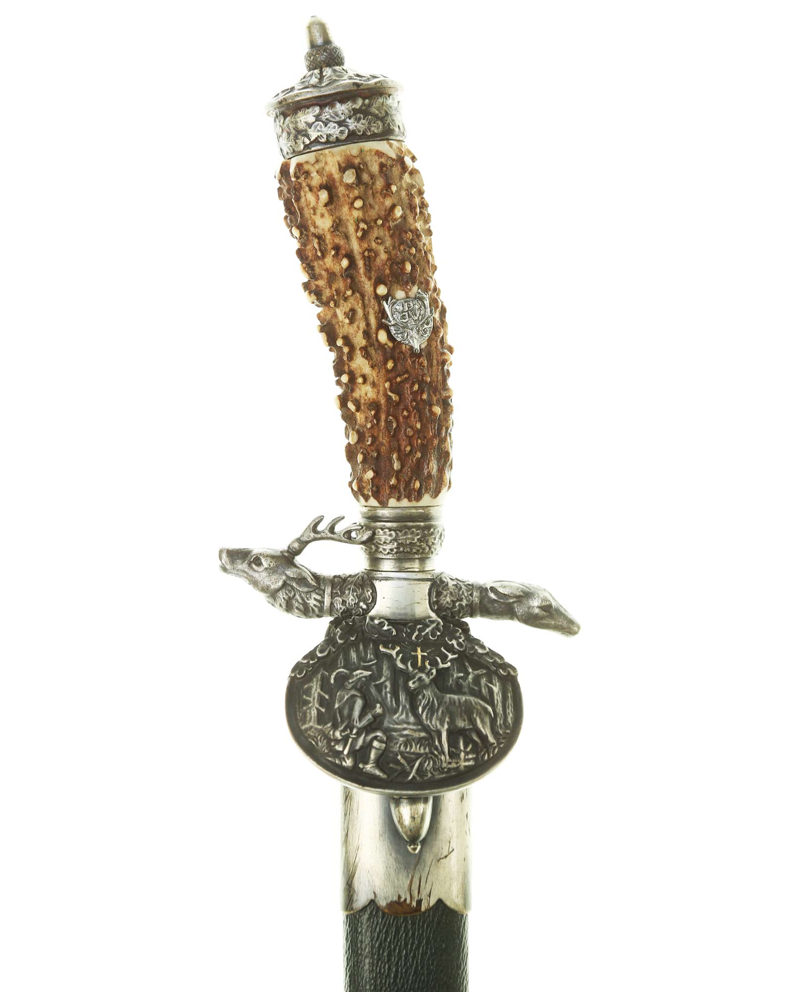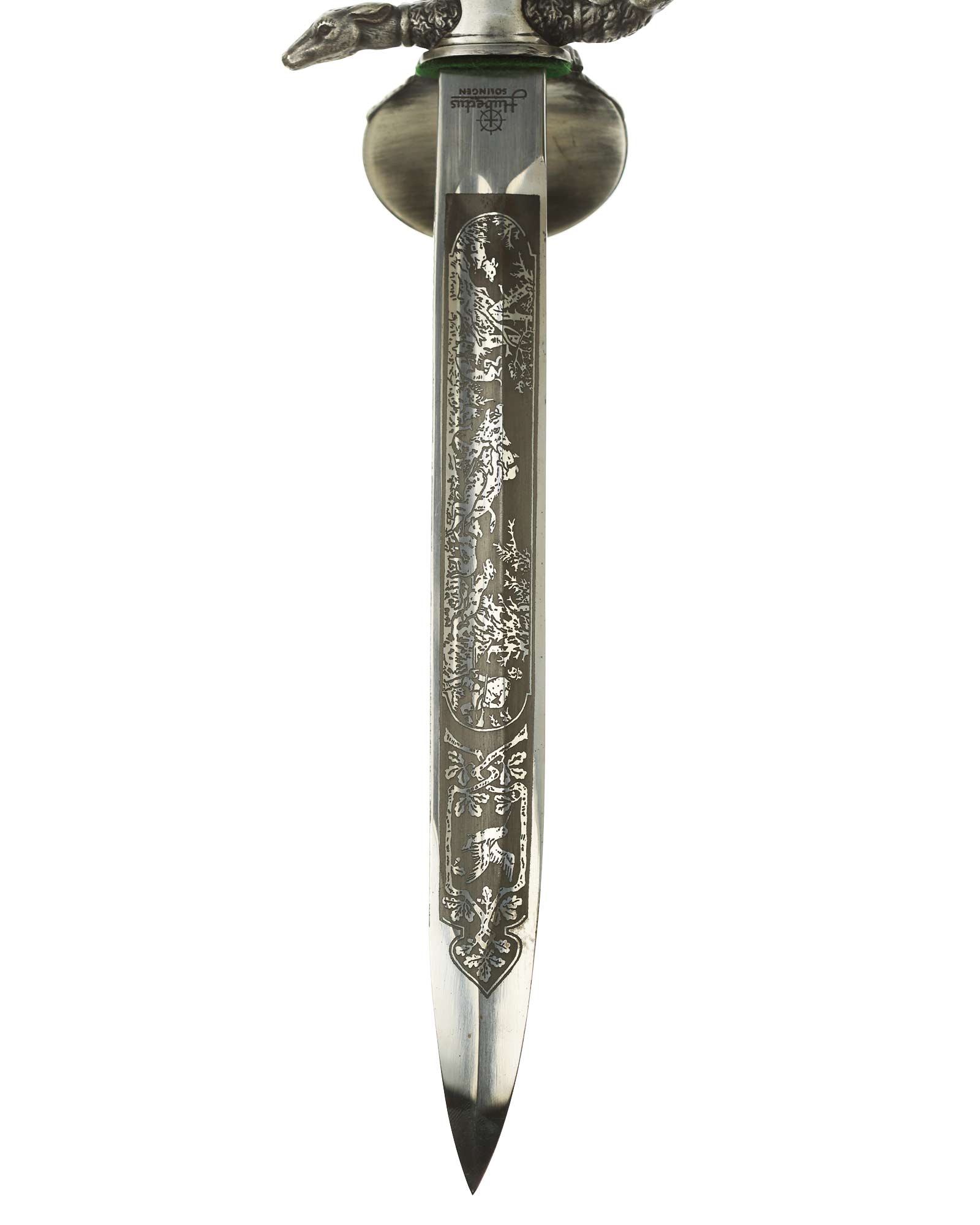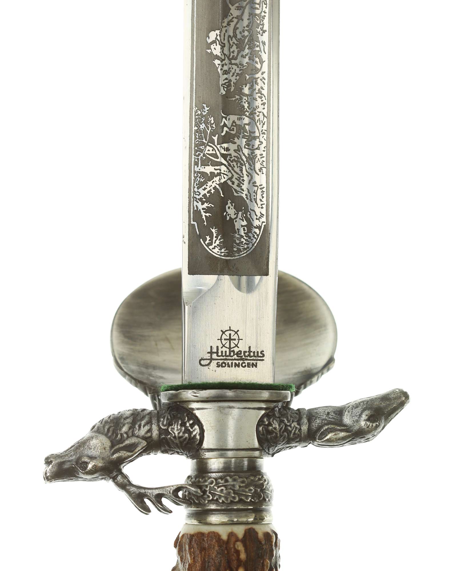 Кинжал охотничий Хиршфангер с футляром и производителем Hubertus Solingen (ранее Kuno Ritter Solingen). Рукоять роговая, крепится на черенке клинка всадным способом. Навершие рукояти стальное, овальной формы, плоское, с декоративным винтом. Перекрестье рукояти стальное, направленных в разные стороны. В центре перекрестья с одной стороны закреплен декоративный щитик, выполненный в форме раковины. Клинок стальной, прямой, двухлезвийный, ромбического сечения, без долов, у пяты плоский, с двух сторон богато украшен травлением со сценами охоты на кабана и оленя. На пяте клинка с обратной стороны имеется клеймо фирмы - Hubertus Solingen, характерное для продукции. Обух клинка практически на всю длинну украшен орнаментом из дубовых листьев и именем бывшего владельца. Ножны деревянные, обтянуты темной кожей, со стальным прибором, состоящим из устья со шпеньком в виде желудя и наконечника.
