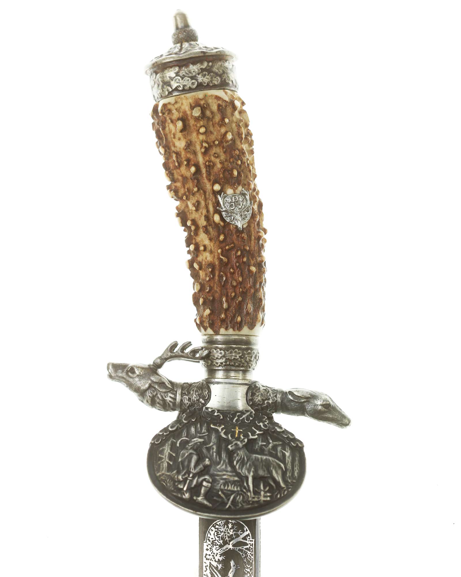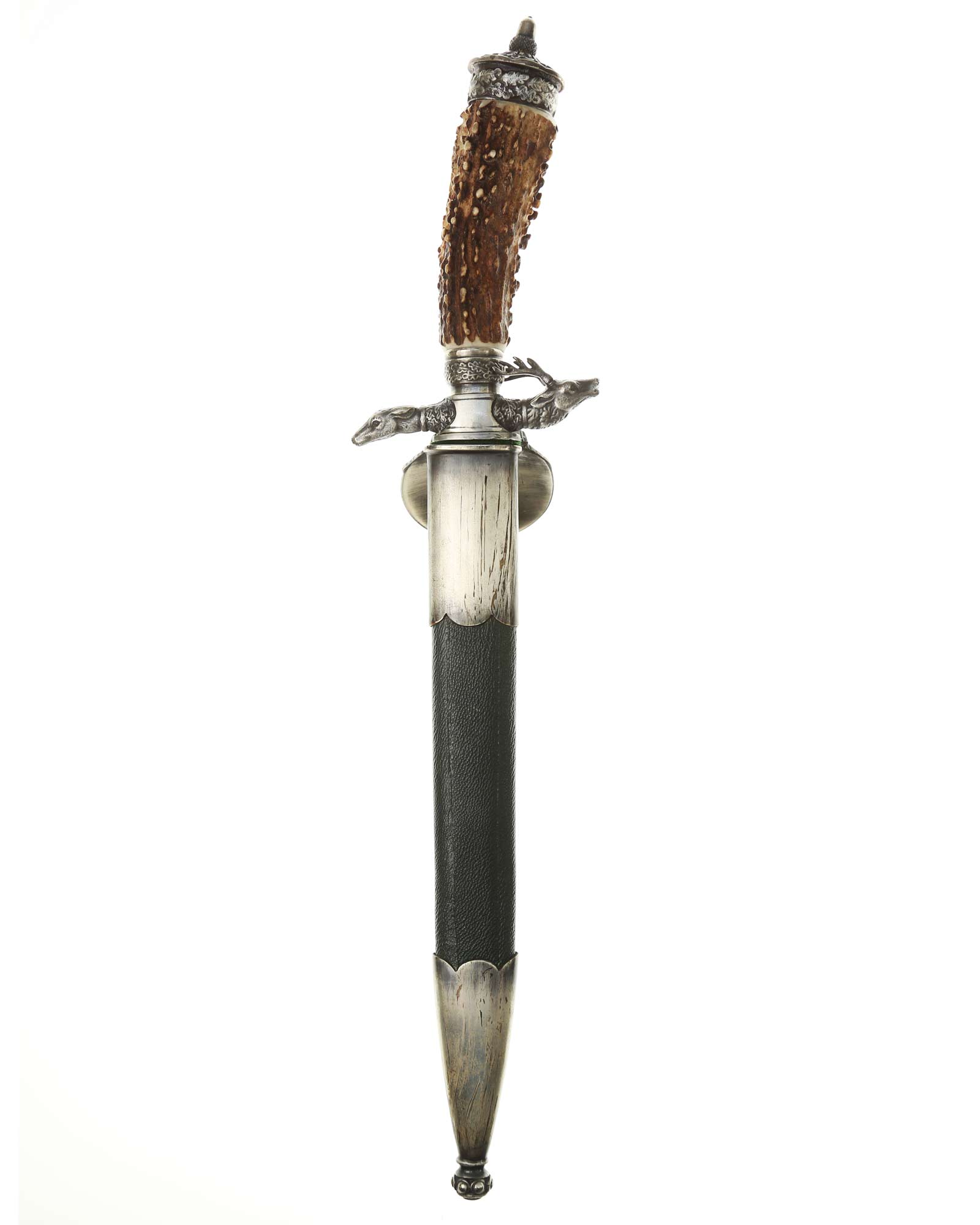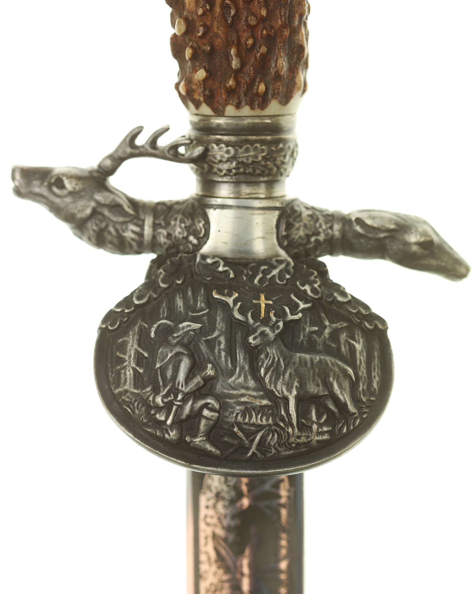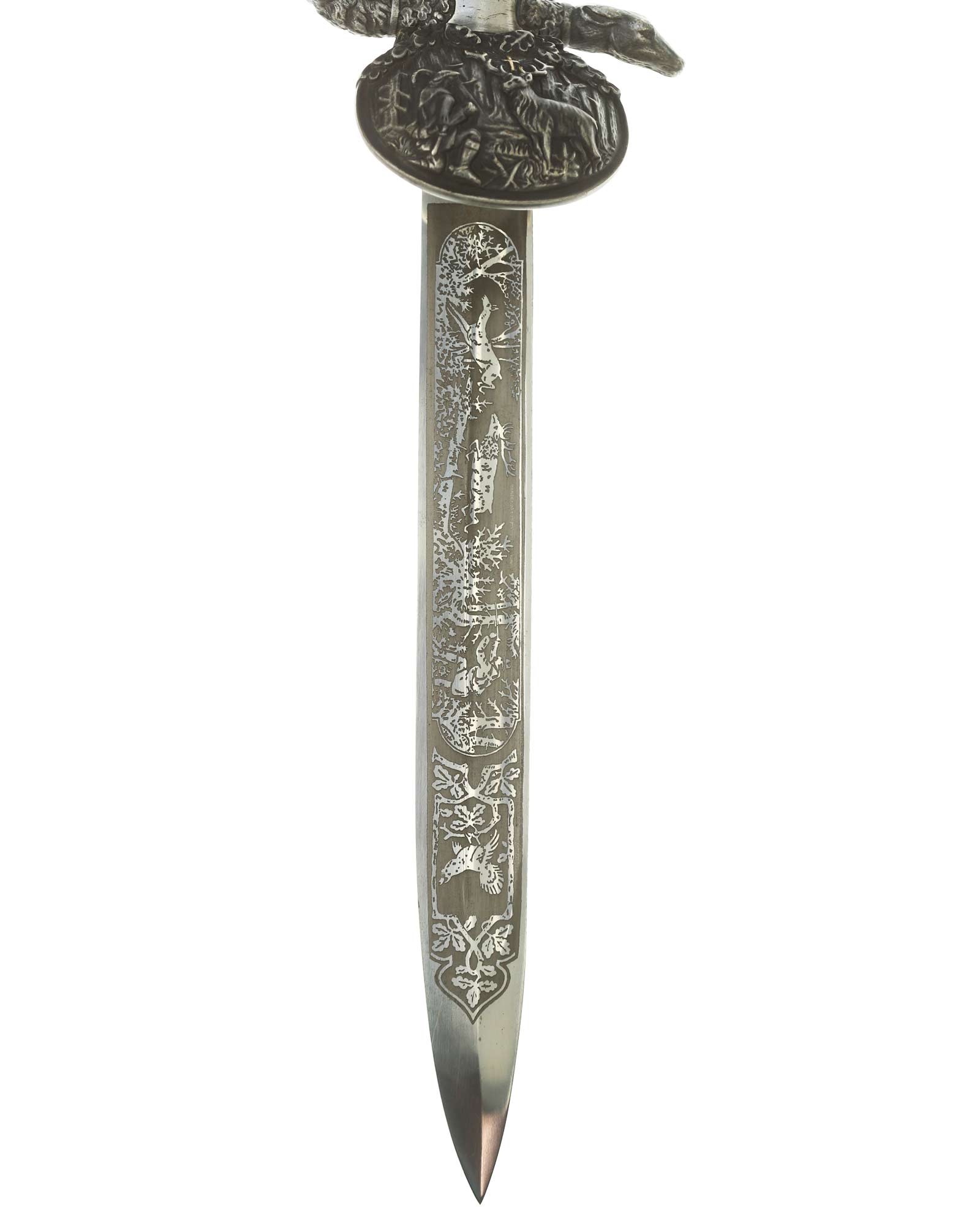 Кинжал охотничий Хиршфангер с футляром и производителем Hubertus Solingen (ранее Kuno Ritter Solingen). Рукоять роговая, крепится на черенке клинка всадным способом. Навершие рукояти стальное, овальной формы, плоское, с декоративным винтом. Перекрестье рукояти стальное, направленных в разные стороны. В центре перекрестья с одной стороны закреплен декоративный щитик, выполненный в форме раковины. Клинок стальной, прямой, двухлезвийный, ромбического сечения, без долов, у пяты плоский, с двух сторон богато украшен травлением со сценами охоты на кабана и оленя. На пяте клинка с обратной стороны имеется клеймо фирмы - Hubertus Solingen, характерное для продукции. Обух клинка практически на всю длинну украшен орнаментом из дубовых листьев и именем бывшего владельца. Ножны деревянные, обтянуты темной кожей, со стальным прибором, состоящим из устья со шпеньком в виде желудя и наконечника.