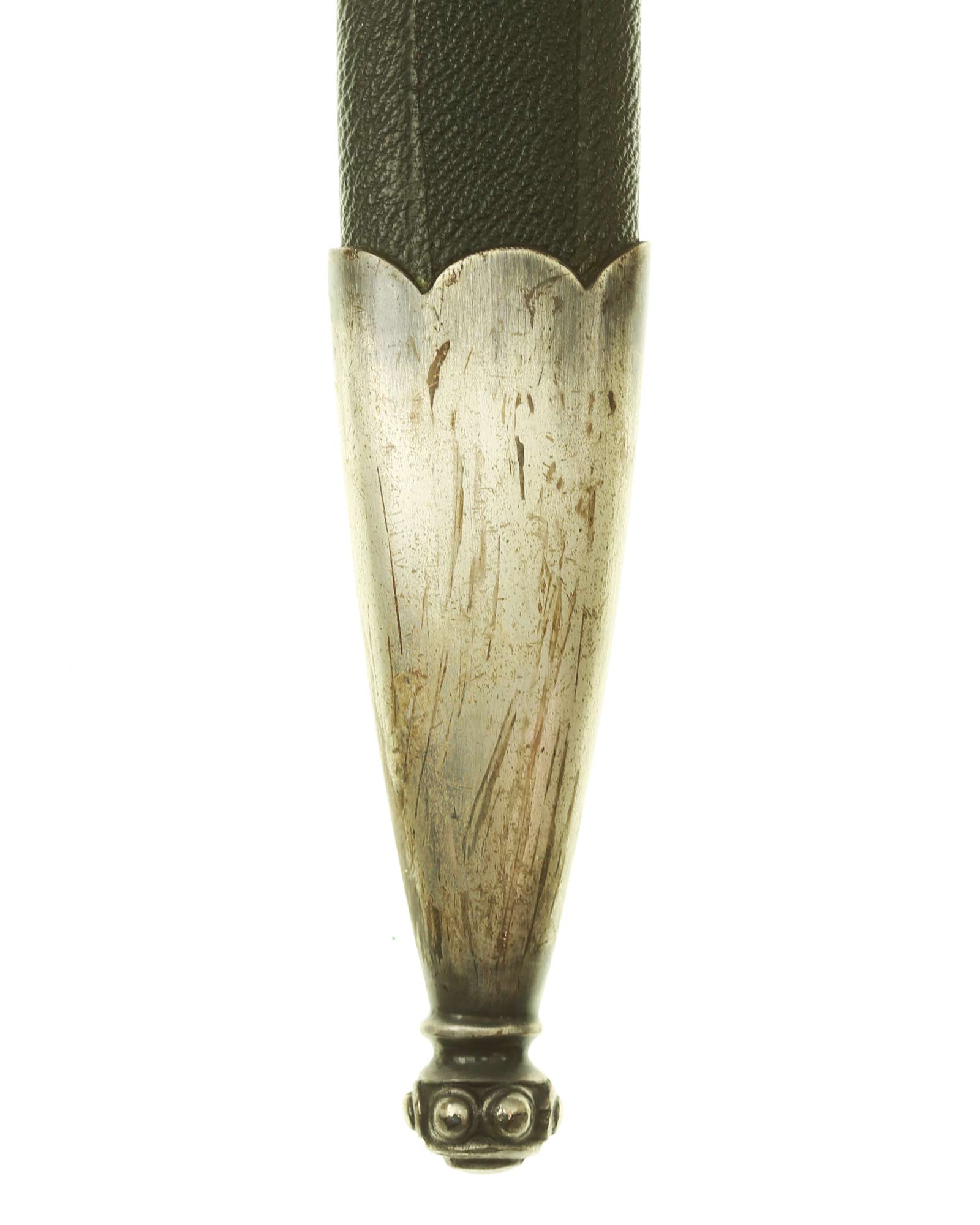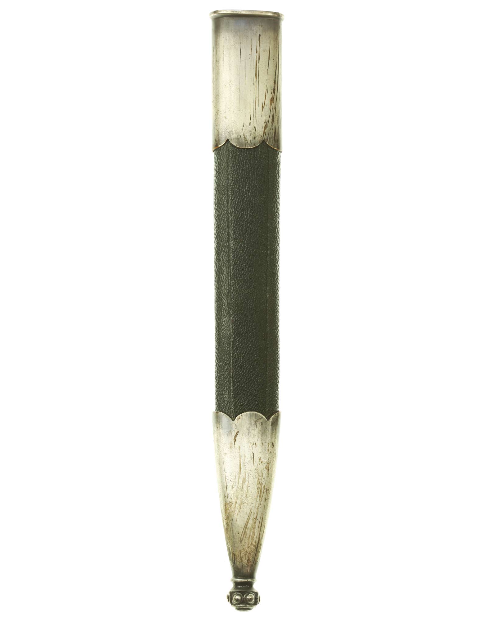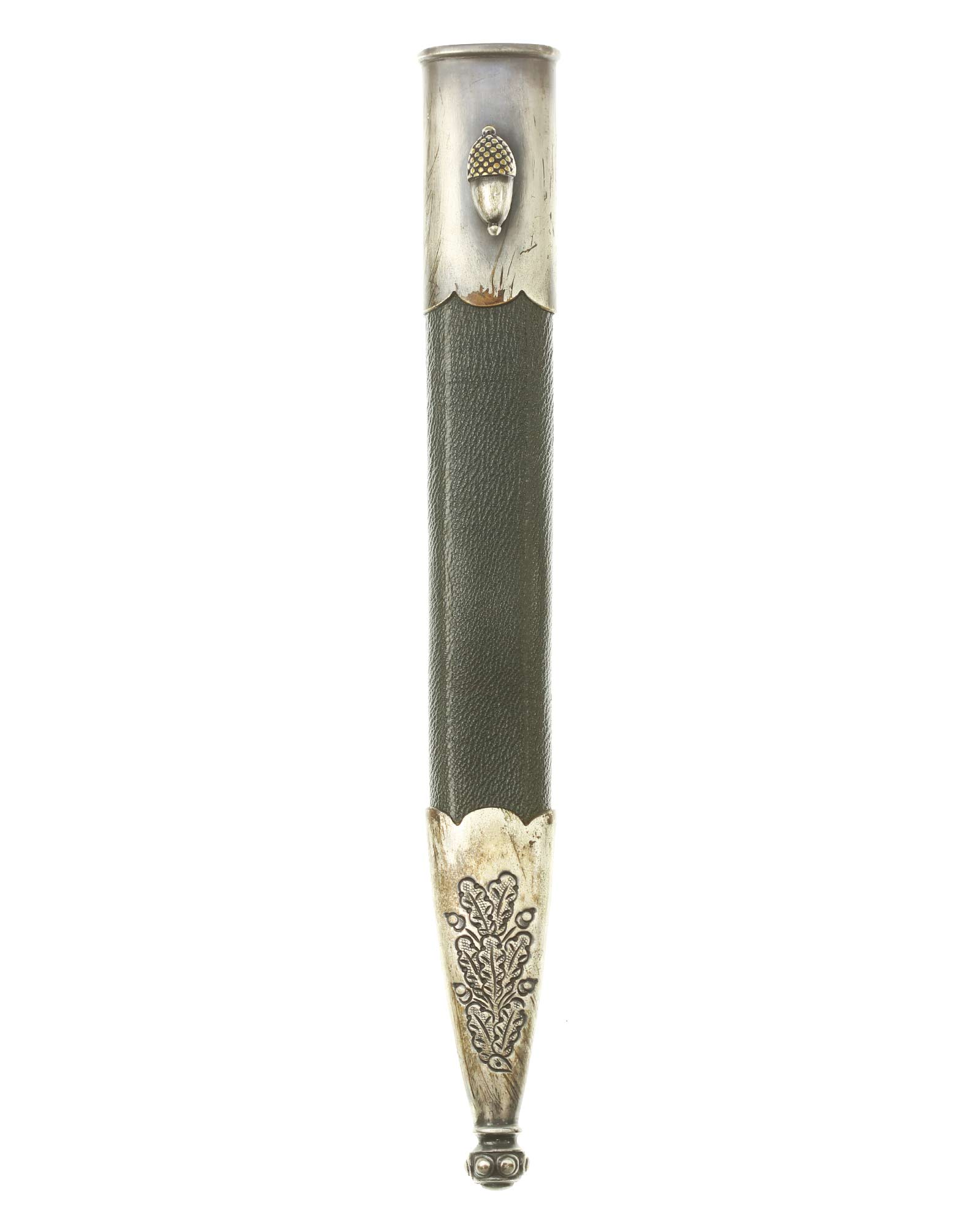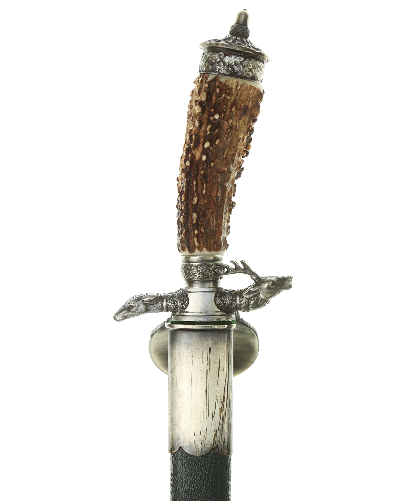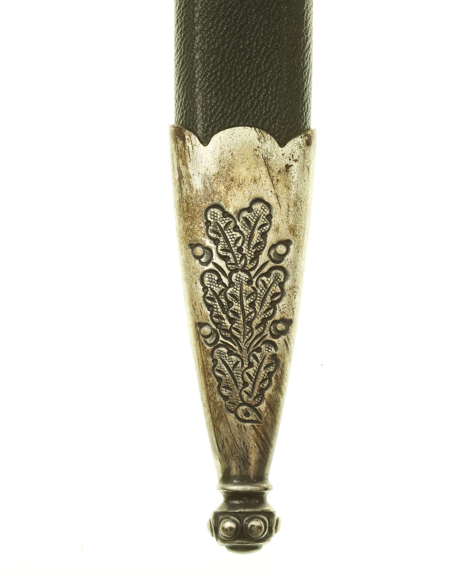 Кинжал охотничий Хиршфангер с футляром и производителем Hubertus Solingen (ранее Kuno Ritter Solingen). Рукоять роговая, крепится на черенке клинка всадным способом. Навершие рукояти стальное, овальной формы, плоское, с декоративным винтом. Перекрестье рукояти стальное, направленных в разные стороны. В центре перекрестья с одной стороны закреплен декоративный щитик, выполненный в форме раковины. Клинок стальной, прямой, двухлезвийный, ромбического сечения, без долов, у пяты плоский, с двух сторон богато украшен травлением со сценами охоты на кабана и оленя. На пяте клинка с обратной стороны имеется клеймо фирмы - Hubertus Solingen, характерное для продукции. Обух клинка практически на всю длинну украшен орнаментом из дубовых листьев и именем бывшего владельца. Ножны деревянные, обтянуты темной кожей, со стальным прибором, состоящим из устья со шпеньком в виде желудя и наконечника.