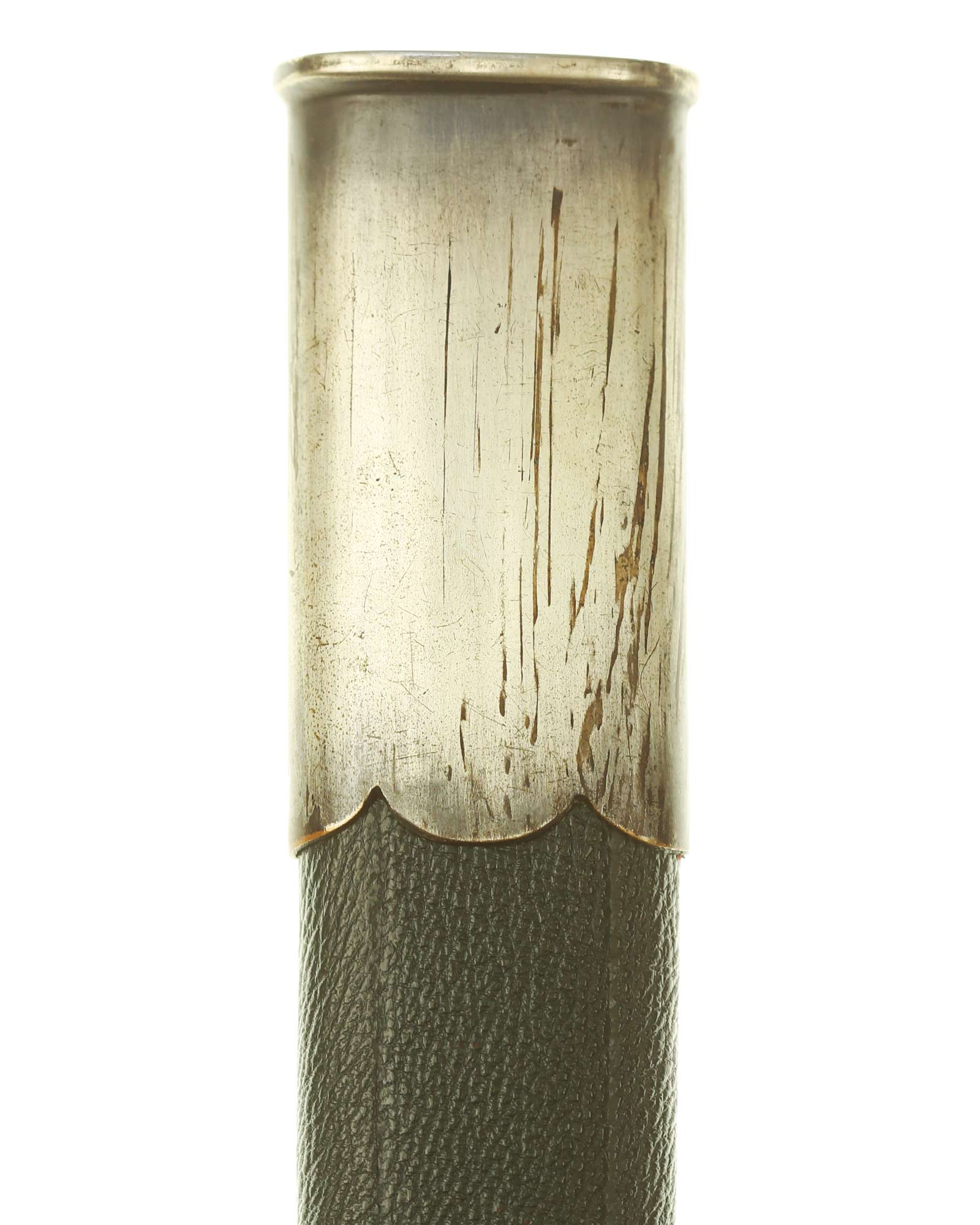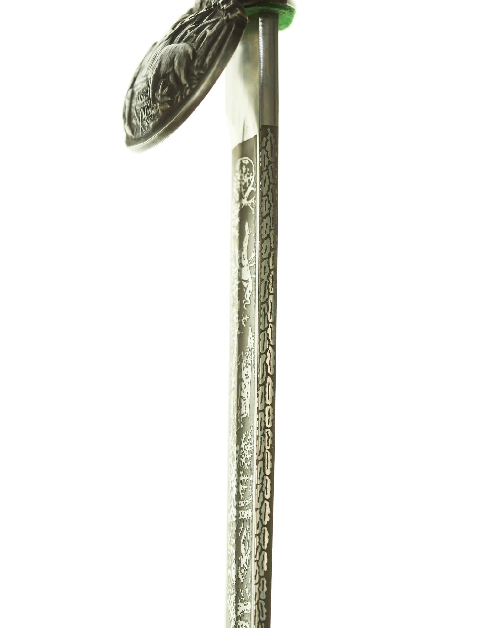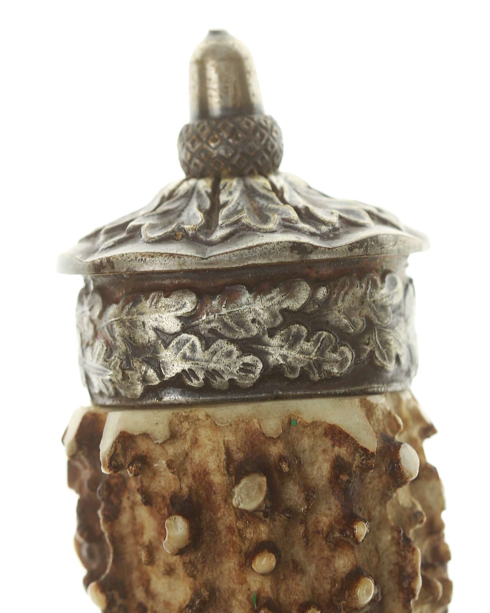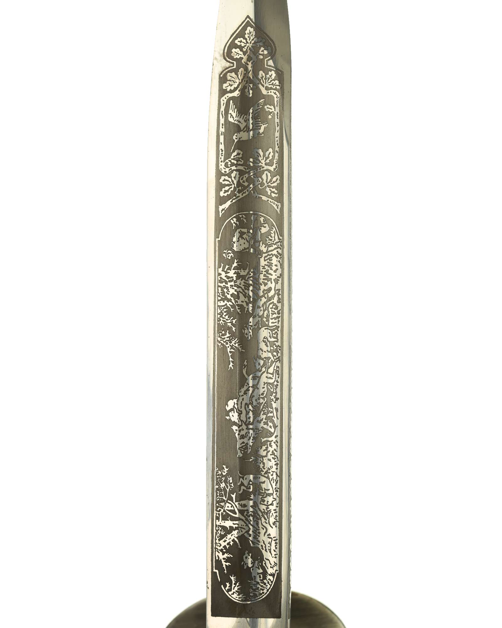 Кинжал охотничий Хиршфангер с футляром и производителем Hubertus Solingen (ранее Kuno Ritter Solingen). Рукоять роговая, крепится на черенке клинка всадным способом. Навершие рукояти стальное, овальной формы, плоское, с декоративным винтом. Перекрестье рукояти стальное, направленных в разные стороны. В центре перекрестья с одной стороны закреплен декоративный щитик, выполненный в форме раковины. Клинок стальной, прямой, двухлезвийный, ромбического сечения, без долов, у пяты плоский, с двух сторон богато украшен травлением со сценами охоты на кабана и оленя. На пяте клинка с обратной стороны имеется клеймо фирмы - Hubertus Solingen, характерное для продукции. Обух клинка практически на всю длинну украшен орнаментом из дубовых листьев и именем бывшего владельца. Ножны деревянные, обтянуты темной кожей, со стальным прибором, состоящим из устья со шпеньком в виде желудя и наконечника.