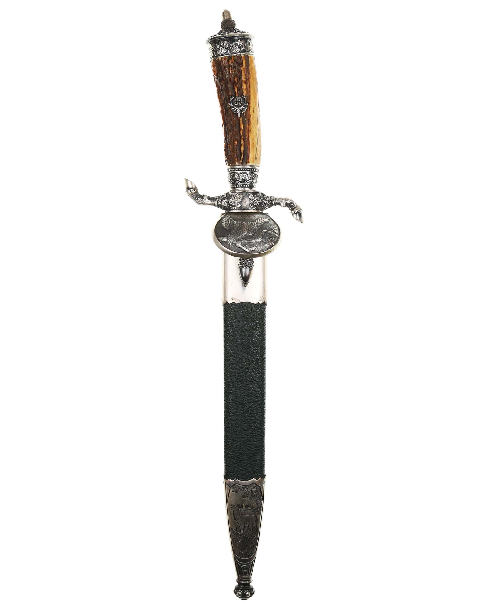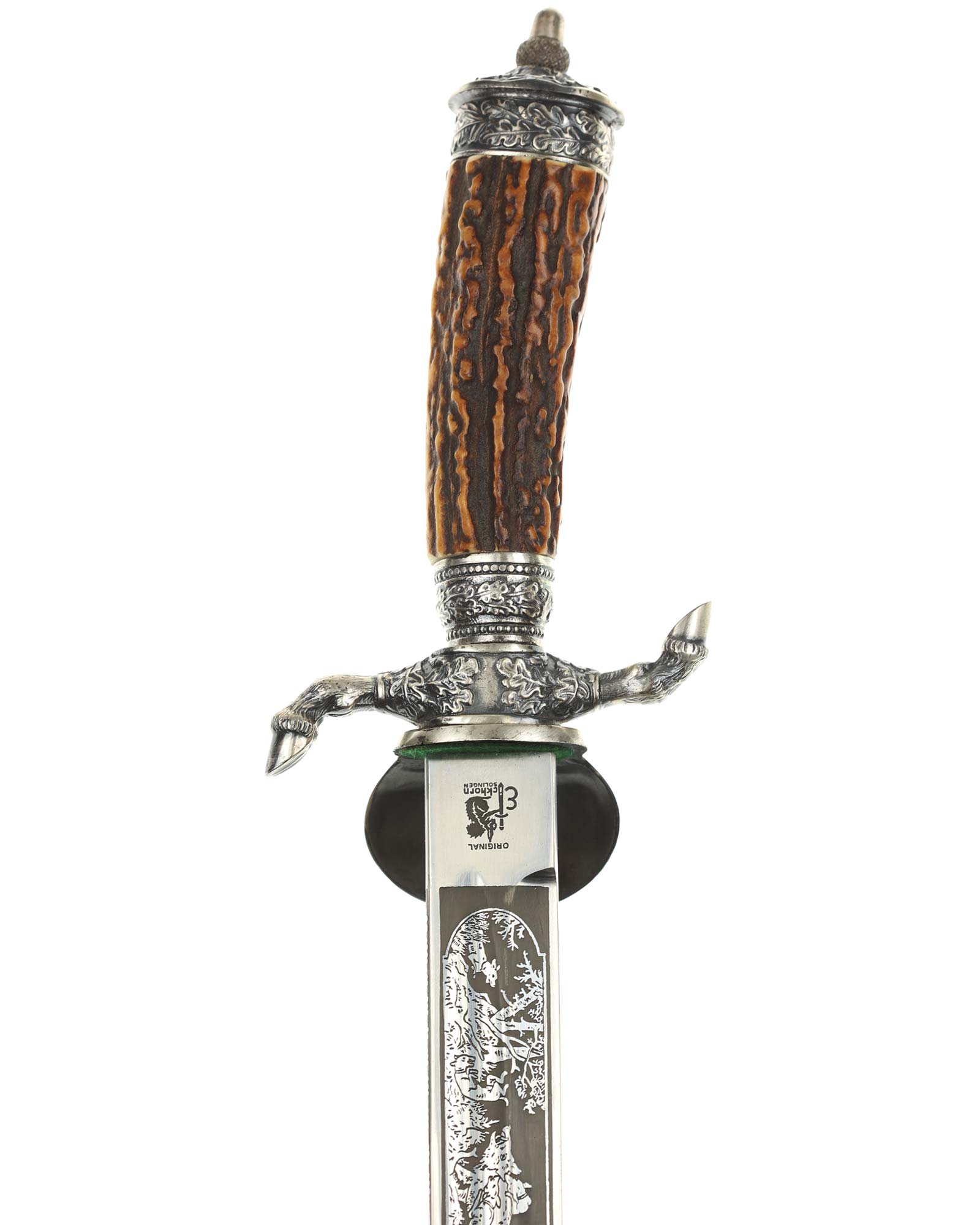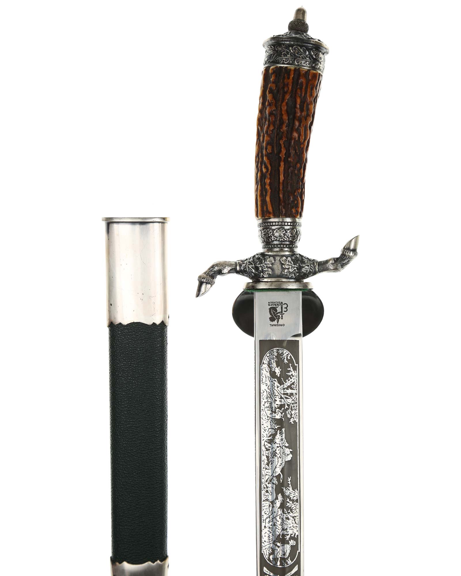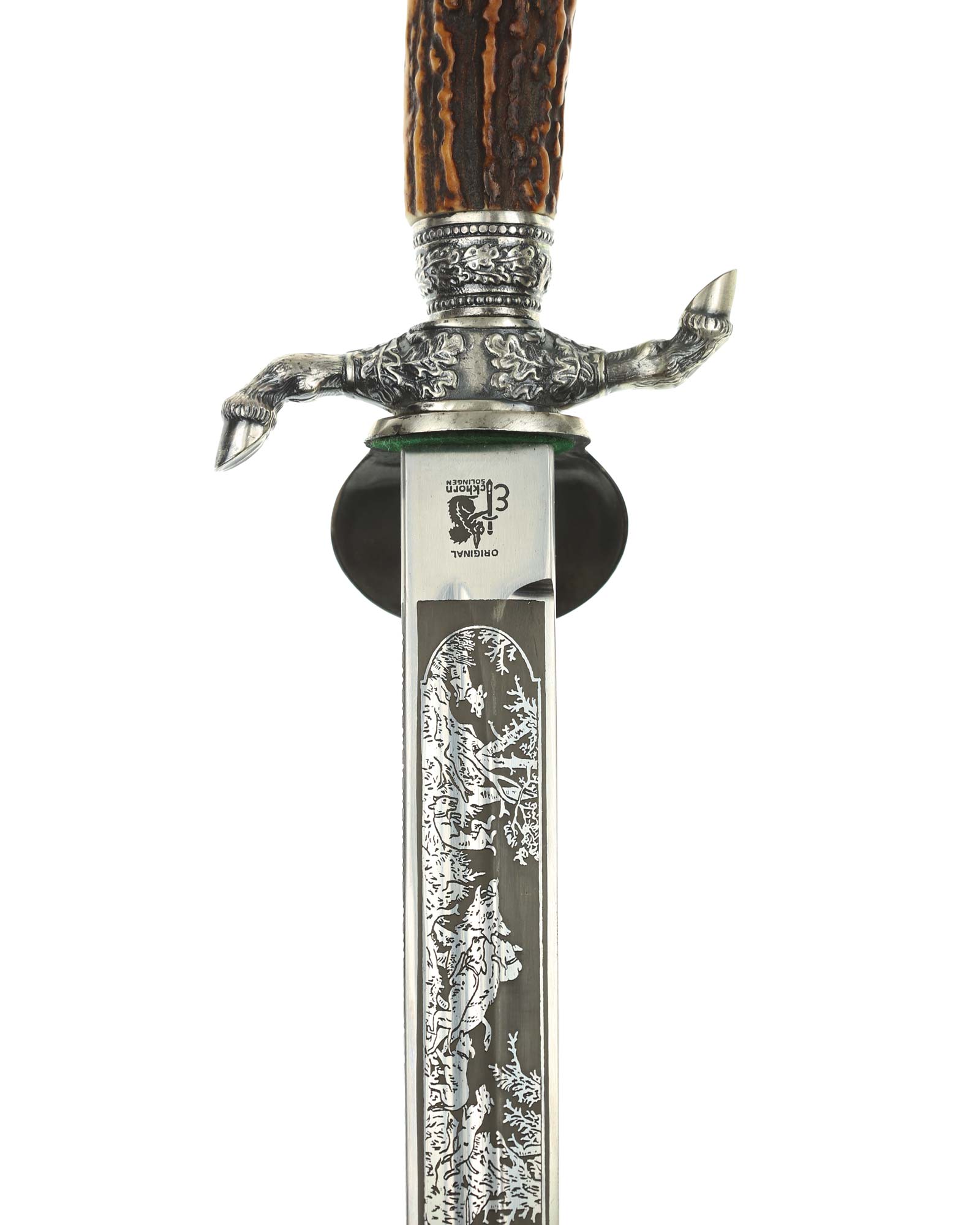 Кинжал охотничий Хиршфангер (нем. Deutscher Jägerverband (DJV) Hirschfänger). Кинжал с клеймом Original Eickhorn Solingen (Карл Айкхорн Золинген). Рукоять роговая, крепится на черенке клинка всадным способом. Навершие рукояти стальное, овальной формы, плоское, с декоративным винтом. Перекрестье рукояти стальное в виде стилизованных кабаньих копыт направленных в разные стороны. В центре перекрестья с одной стороны закреплен декоративный щитик, выполненный в форме раковины. Клинок стальной, прямой, двухлезвийный, ромбического сечения, без долов, у пяты плоский, с двух сторон богато украшен травлением со сценами охоты на кабана и оленя. На пяте клинка с обратной стороны имеется клеймо известной фирмы - Карл Айкхорн, г. Золинген, характерное для продукции, выпускаемой данным производителем в период с 1941-1945 гг. Обух клинка практически на всю длинну украшен орнаментом из дубовых листьев и именем бывшего владельца. Ножны деревянные, обтянуты темной кожей, со стальным прибором, состоящим из устья со шпеньком в виде желудя и наконечника. Внутри устья для дополнительной фиксации вставлена стальная распорка-фиксатор.