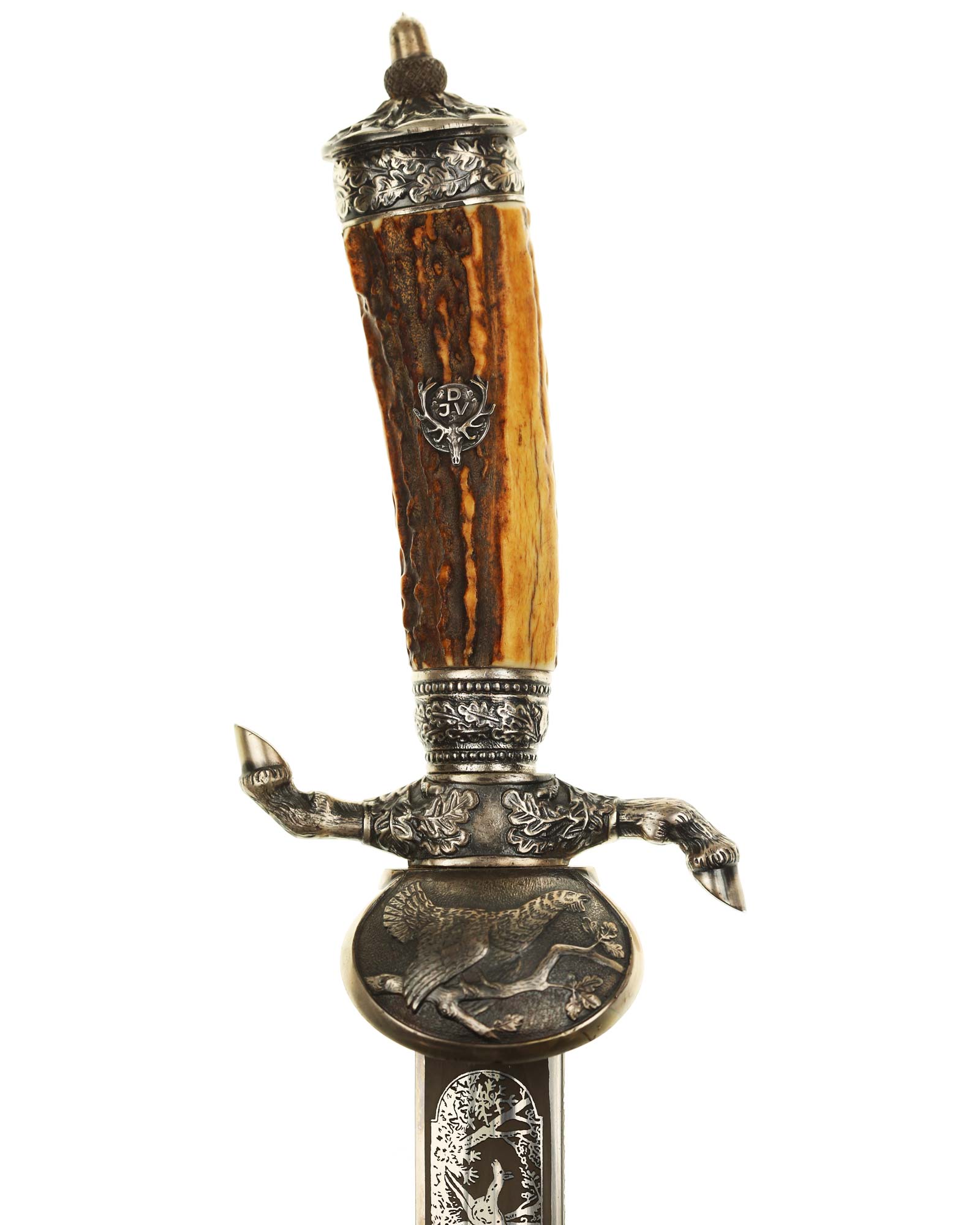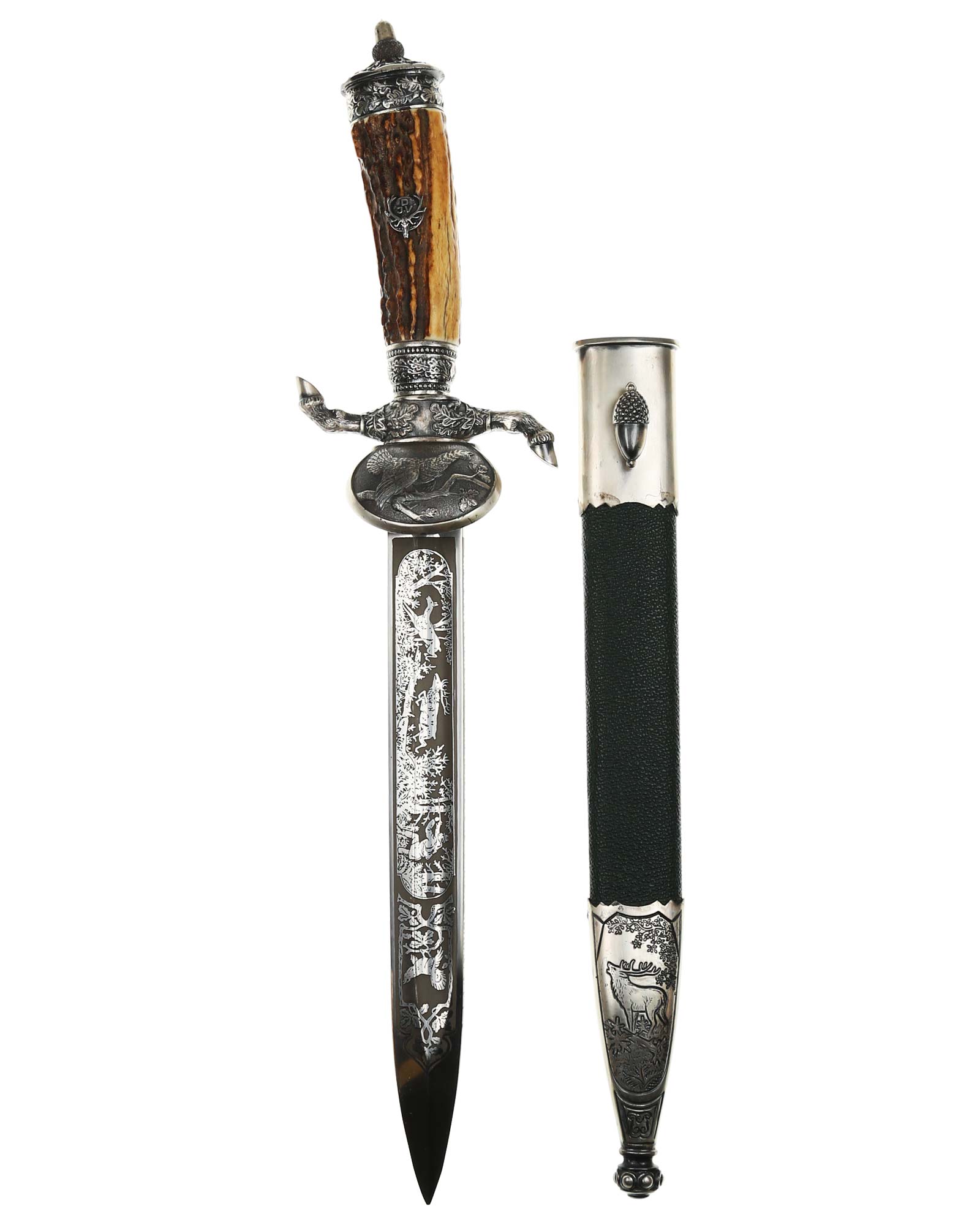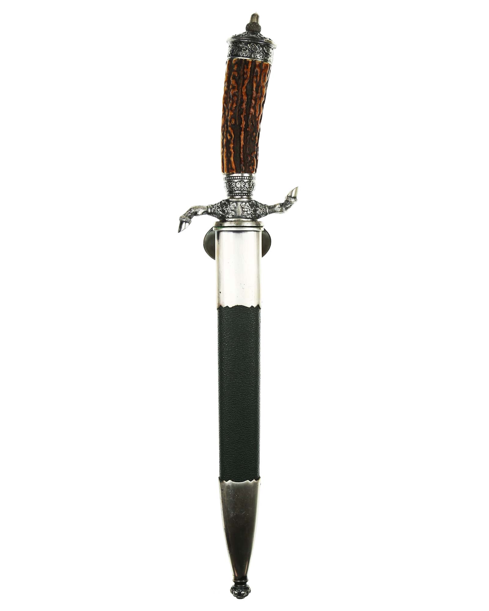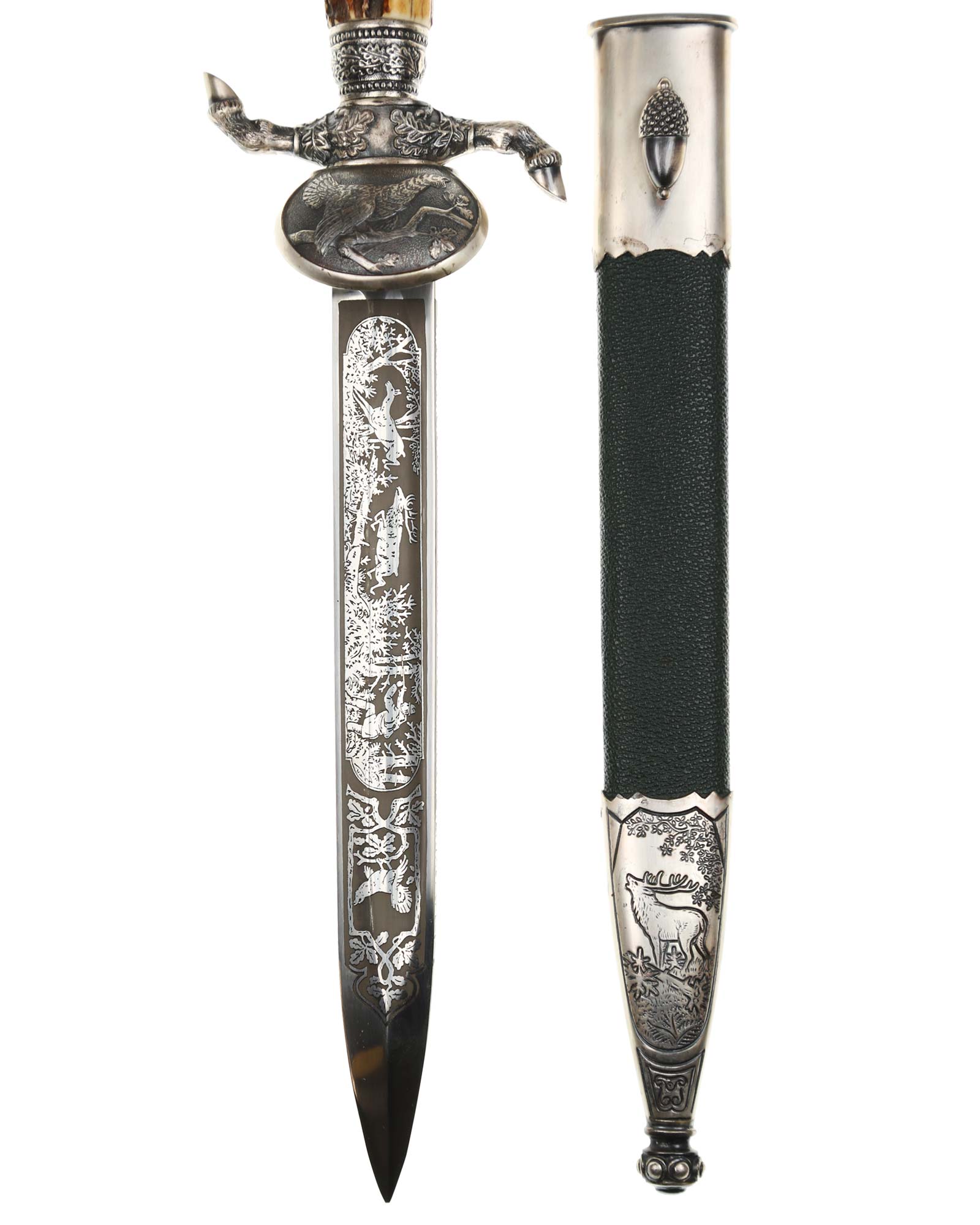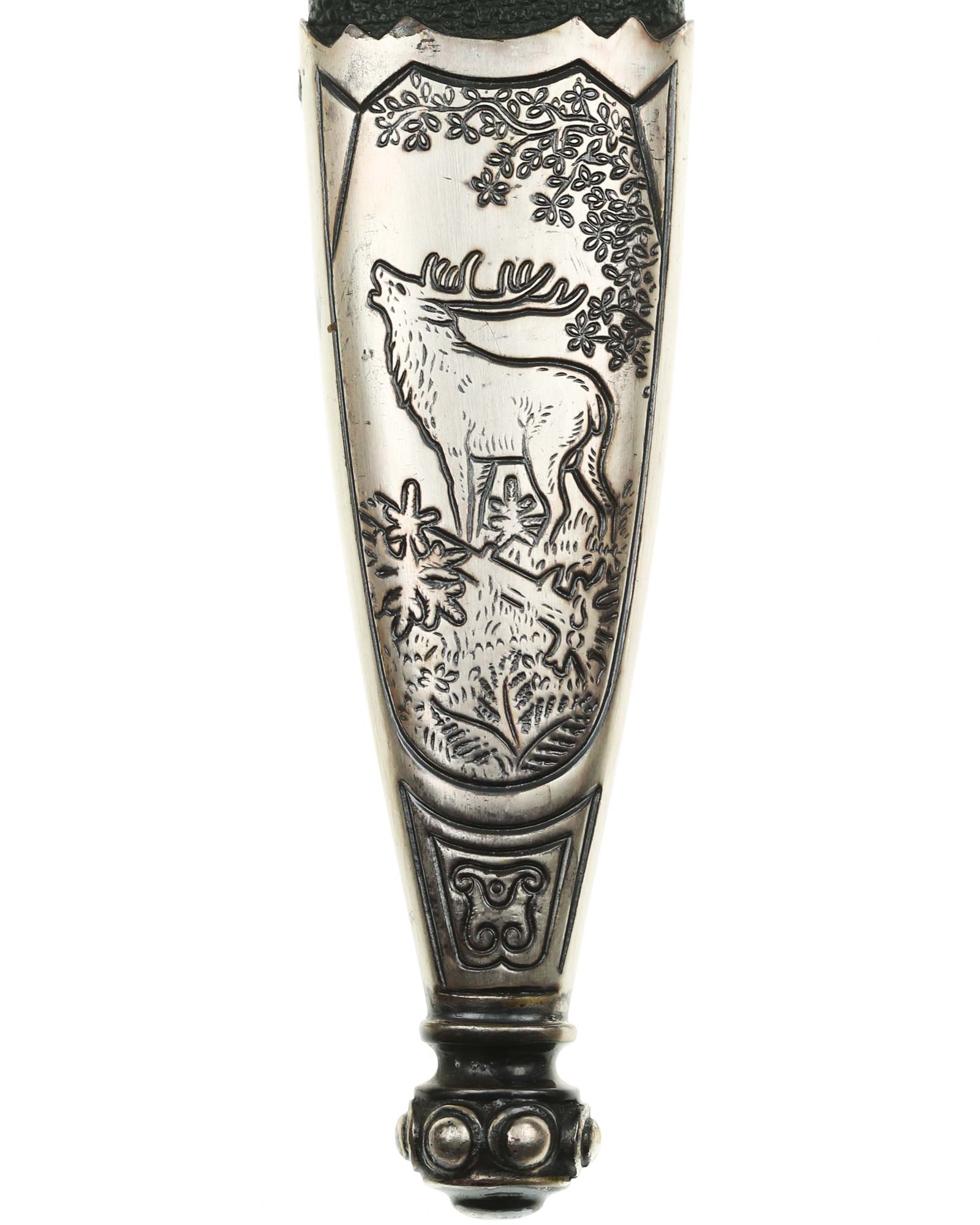Кинжал охотничий Хиршфангер (нем. Deutscher Jägerverband (DJV) Hirschfänger). Кинжал с клеймом Original Eickhorn Solingen (Карл Айкхорн Золинген). Рукоять роговая, крепится на черенке клинка всадным способом. Навершие рукояти стальное, овальной формы, плоское, с декоративным винтом. Перекрестье рукояти стальное в виде стилизованных кабаньих копыт направленных в разные стороны. В центре перекрестья с одной стороны закреплен декоративный щитик, выполненный в форме раковины. Клинок стальной, прямой, двухлезвийный, ромбического сечения, без долов, у пяты плоский, с двух сторон богато украшен травлением со сценами охоты на кабана и оленя. На пяте клинка с обратной стороны имеется клеймо известной фирмы - Карл Айкхорн, г. Золинген, характерное для продукции, выпускаемой данным производителем в период с 1941-1945 гг. Обух клинка практически на всю длинну украшен орнаментом из дубовых листьев и именем бывшего владельца. Ножны деревянные, обтянуты темной кожей, со стальным прибором, состоящим из устья со шпеньком в виде желудя и наконечника. Внутри устья для дополнительной фиксации вставлена стальная распорка-фиксатор.