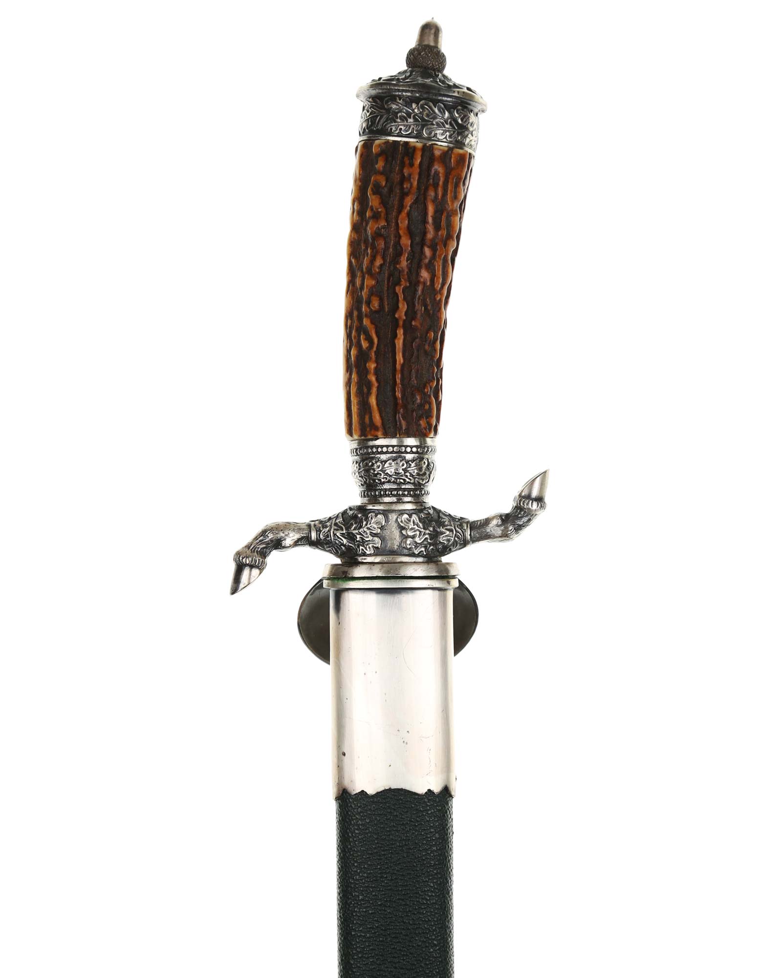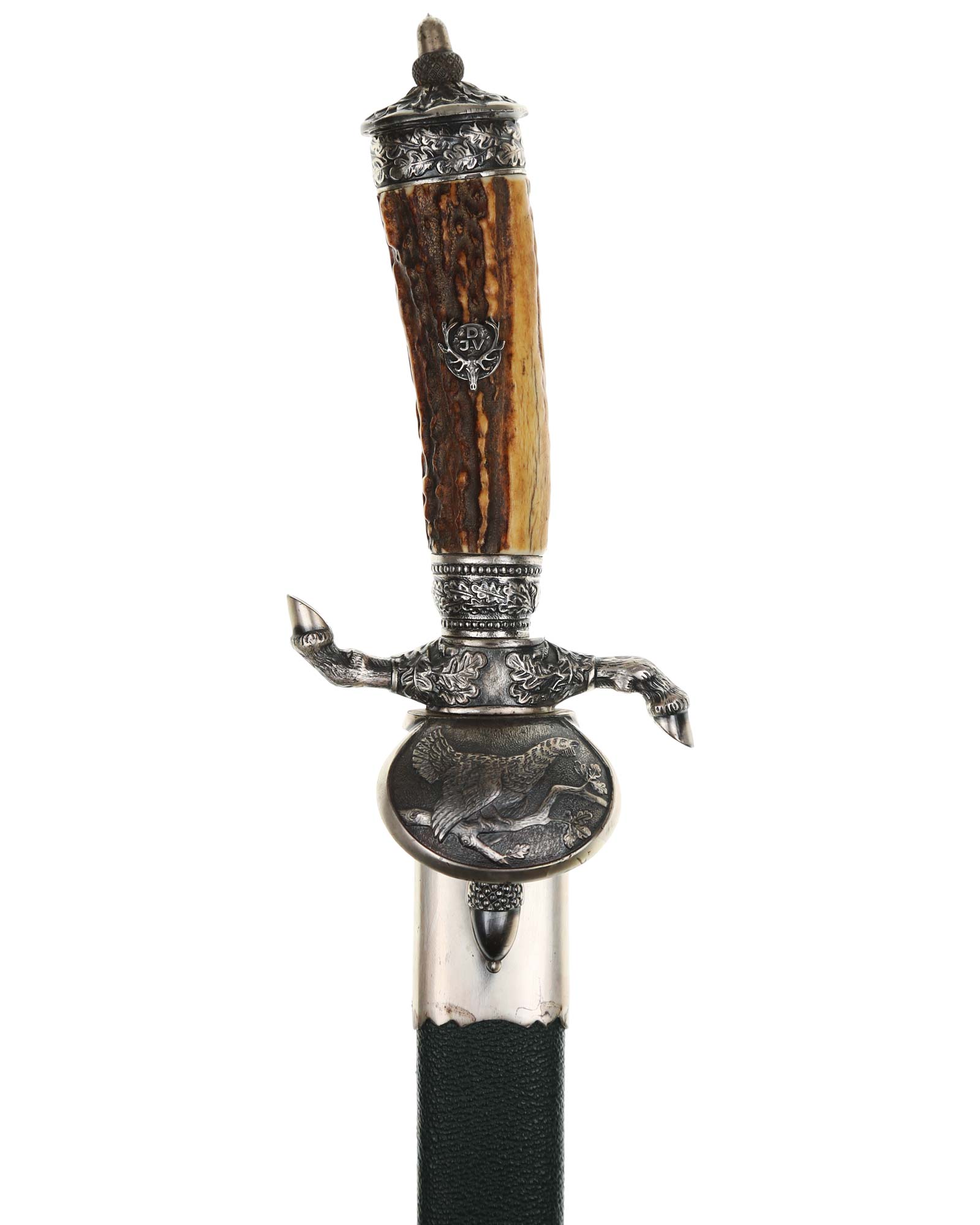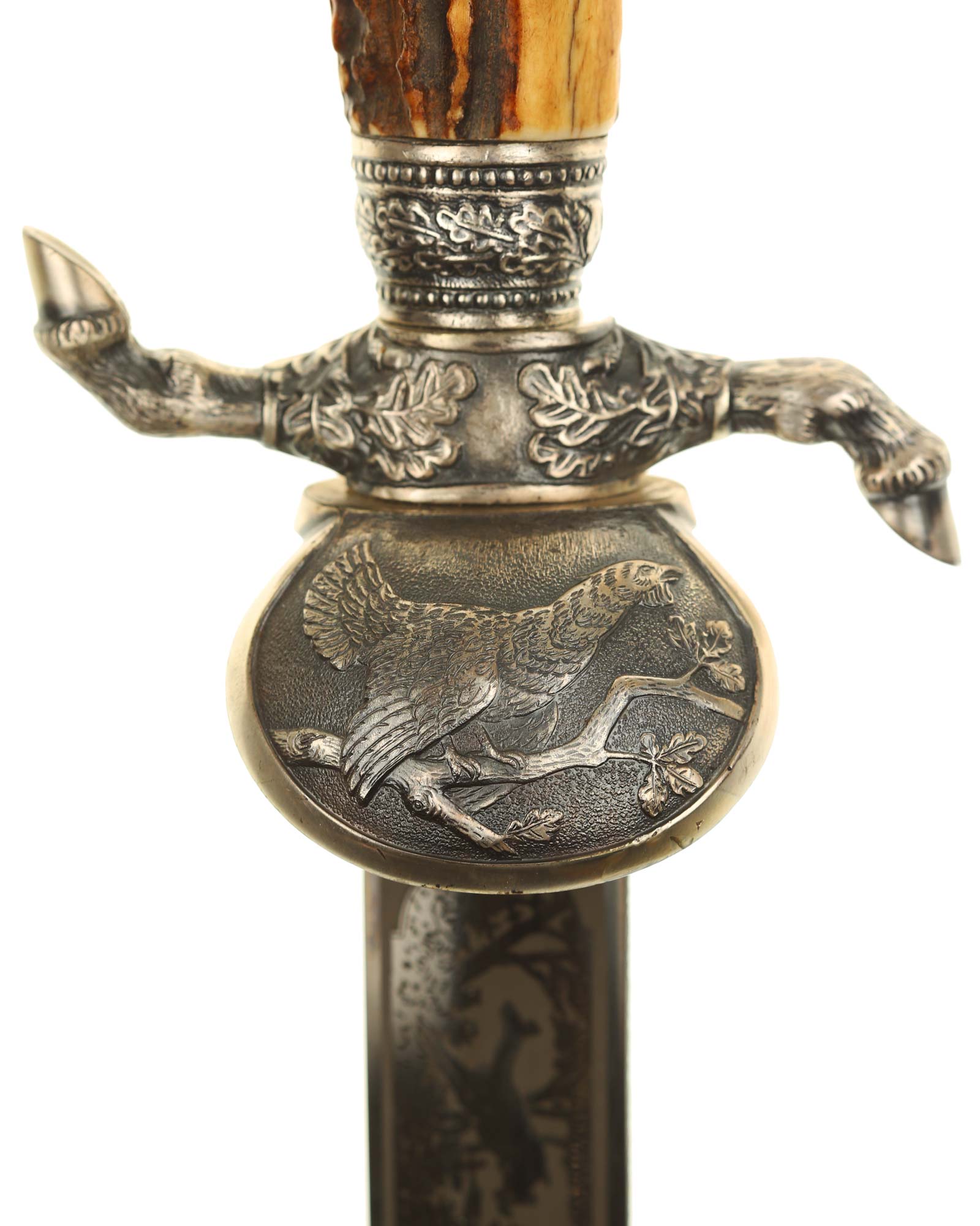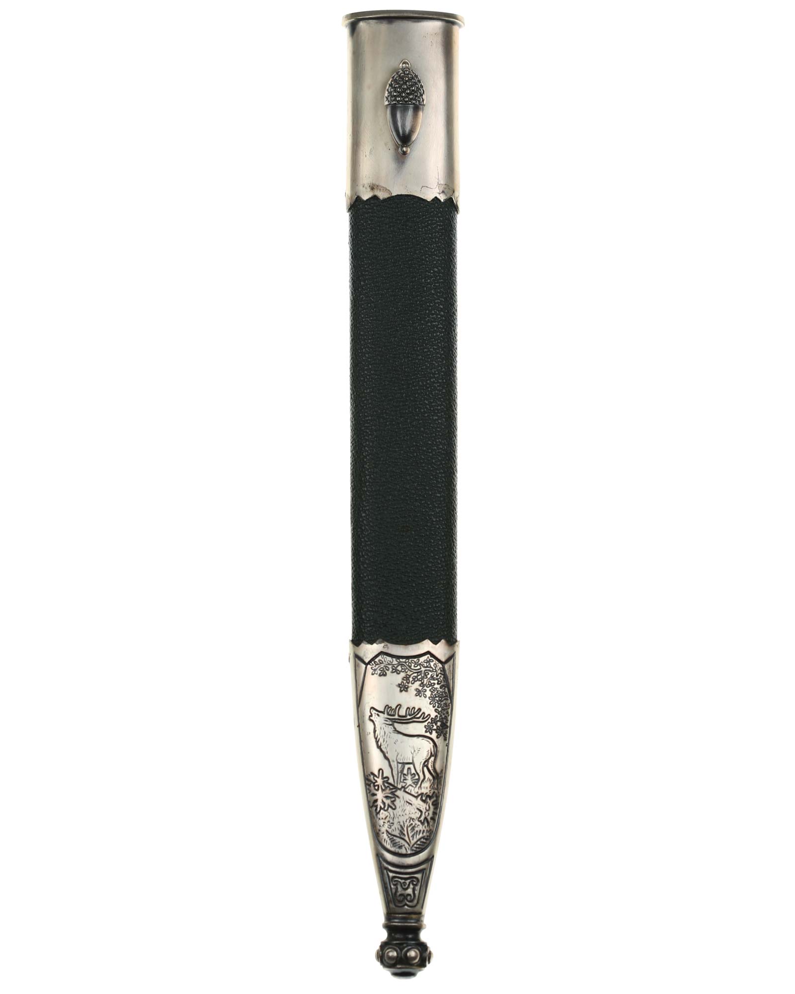Кинжал охотничий Хиршфангер (нем. Deutscher Jägerverband (DJV) Hirschfänger). Кинжал с клеймом Original Eickhorn Solingen (Карл Айкхорн Золинген). Рукоять роговая, крепится на черенке клинка всадным способом. Навершие рукояти стальное, овальной формы, плоское, с декоративным винтом. Перекрестье рукояти стальное в виде стилизованных кабаньих копыт направленных в разные стороны. В центре перекрестья с одной стороны закреплен декоративный щитик, выполненный в форме раковины. Клинок стальной, прямой, двухлезвийный, ромбического сечения, без долов, у пяты плоский, с двух сторон богато украшен травлением со сценами охоты на кабана и оленя. На пяте клинка с обратной стороны имеется клеймо известной фирмы - Карл Айкхорн, г. Золинген, характерное для продукции, выпускаемой данным производителем в период с 1941-1945 гг. Обух клинка практически на всю длинну украшен орнаментом из дубовых листьев и именем бывшего владельца. Ножны деревянные, обтянуты темной кожей, со стальным прибором, состоящим из устья со шпеньком в виде желудя и наконечника. Внутри устья для дополнительной фиксации вставлена стальная распорка-фиксатор.