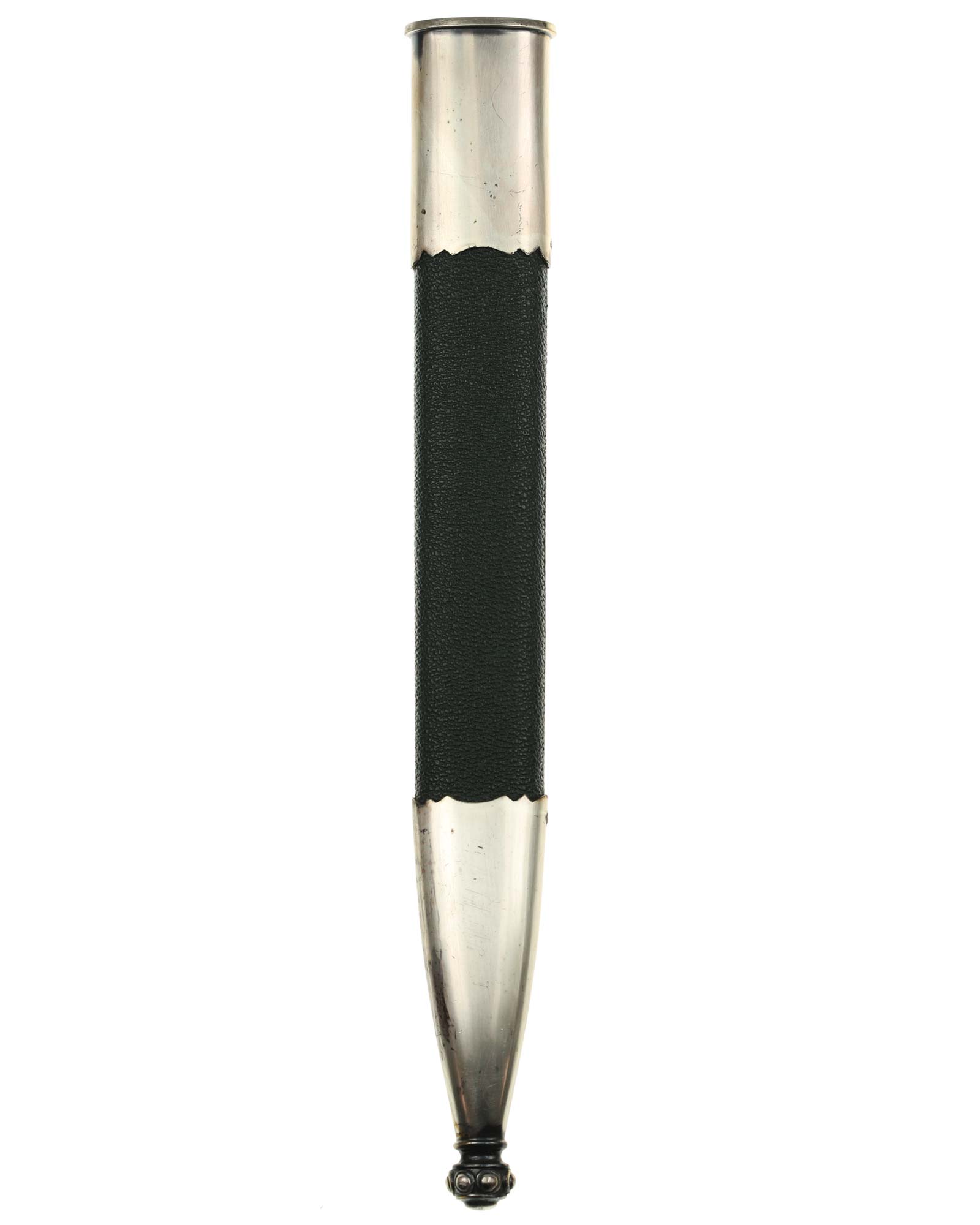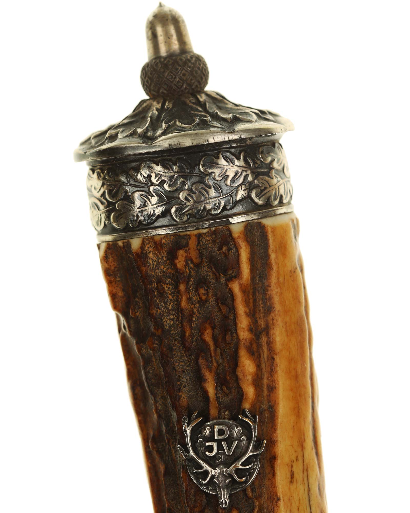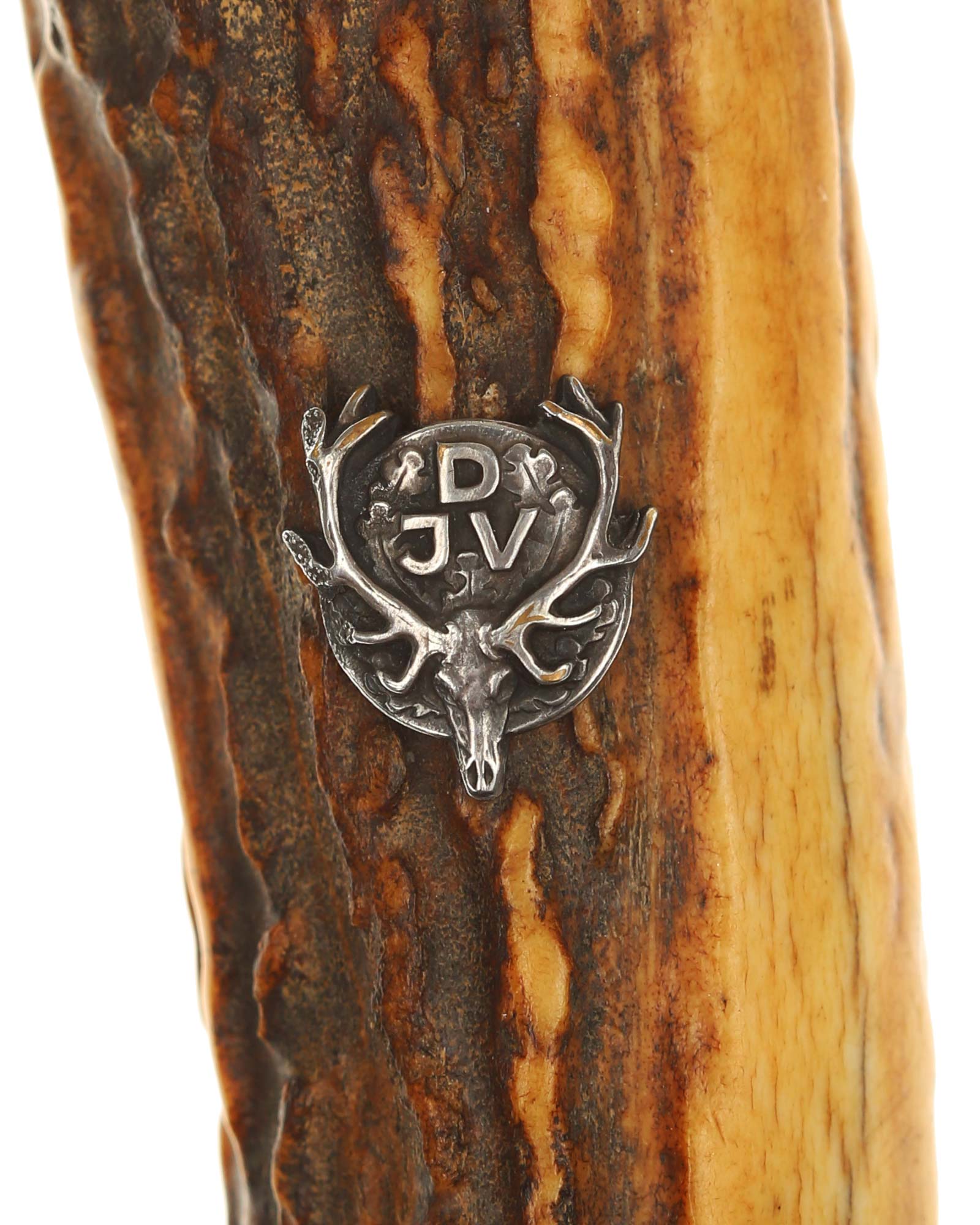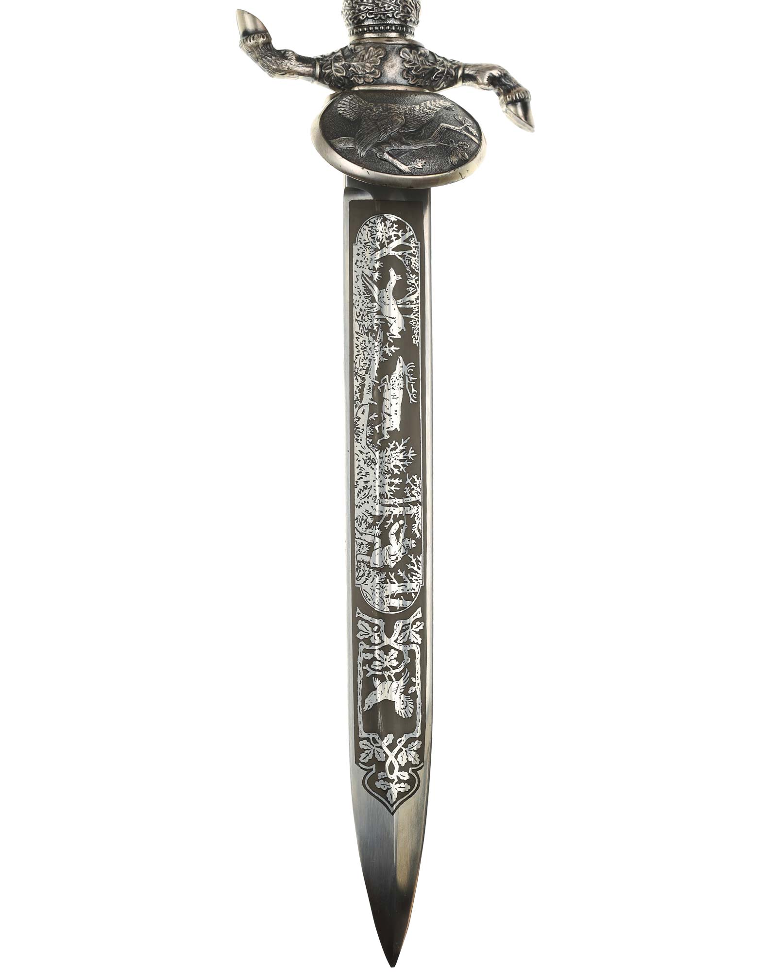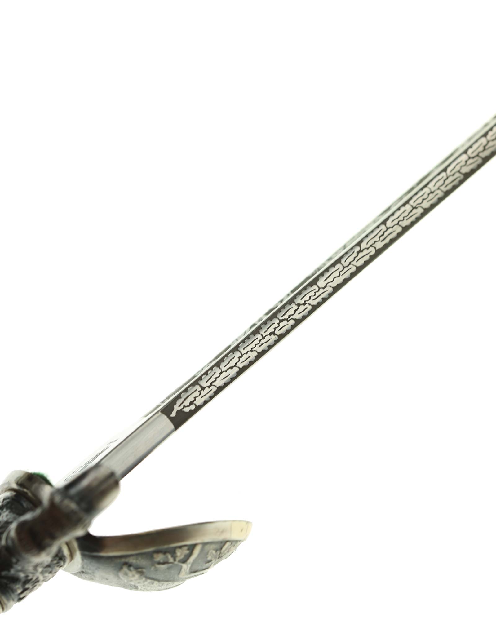 Кинжал охотничий Хиршфангер (нем. Deutscher Jägerverband (DJV) Hirschfänger). Кинжал с клеймом Original Eickhorn Solingen (Карл Айкхорн Золинген). Рукоять роговая, крепится на черенке клинка всадным способом. Навершие рукояти стальное, овальной формы, плоское, с декоративным винтом. Перекрестье рукояти стальное в виде стилизованных кабаньих копыт направленных в разные стороны. В центре перекрестья с одной стороны закреплен декоративный щитик, выполненный в форме раковины. Клинок стальной, прямой, двухлезвийный, ромбического сечения, без долов, у пяты плоский, с двух сторон богато украшен травлением со сценами охоты на кабана и оленя. На пяте клинка с обратной стороны имеется клеймо известной фирмы - Карл Айкхорн, г. Золинген, характерное для продукции, выпускаемой данным производителем в период с 1941-1945 гг. Обух клинка практически на всю длинну украшен орнаментом из дубовых листьев и именем бывшего владельца. Ножны деревянные, обтянуты темной кожей, со стальным прибором, состоящим из устья со шпеньком в виде желудя и наконечника. Внутри устья для дополнительной фиксации вставлена стальная распорка-фиксатор.