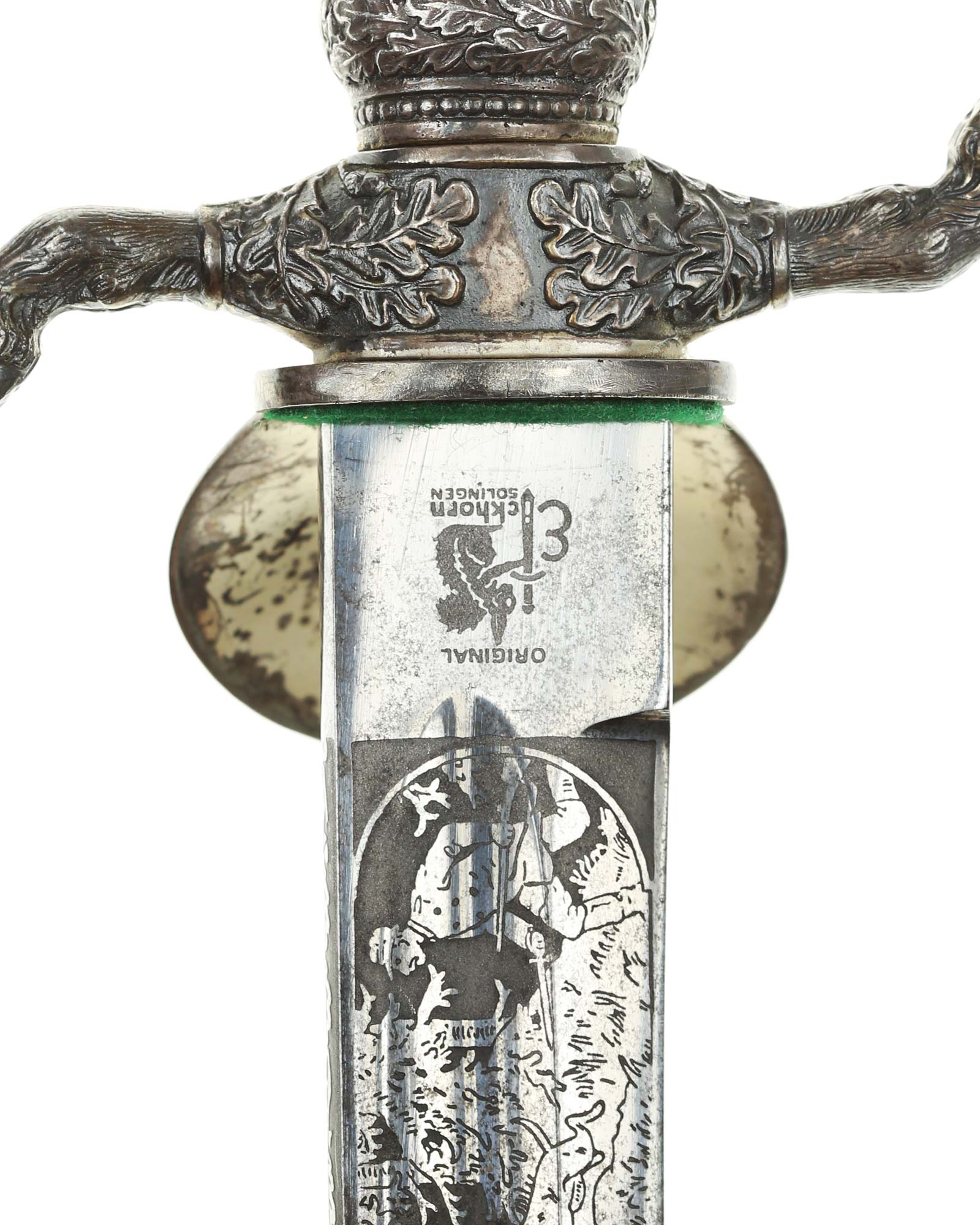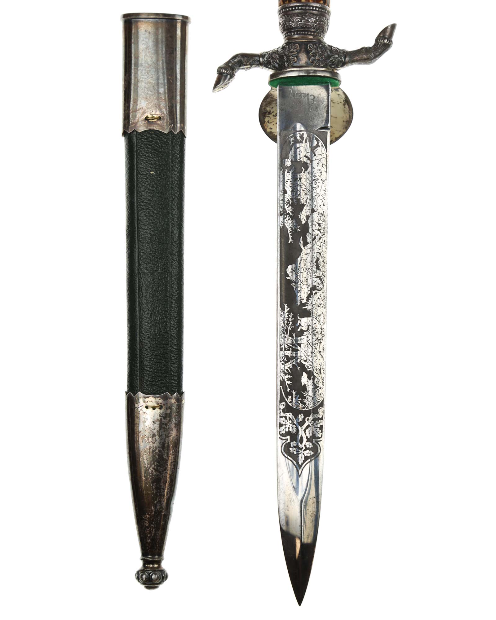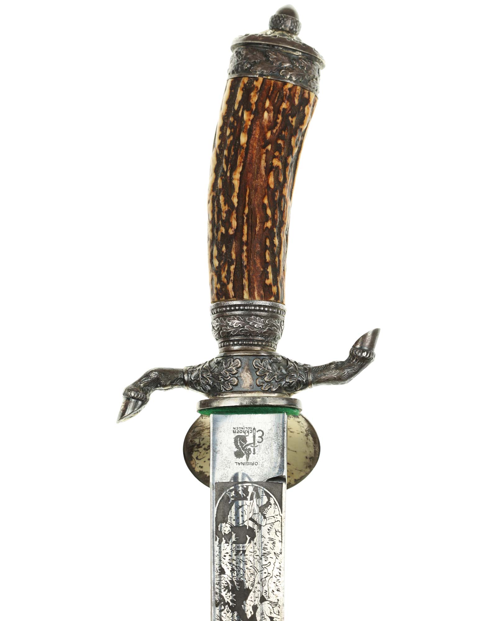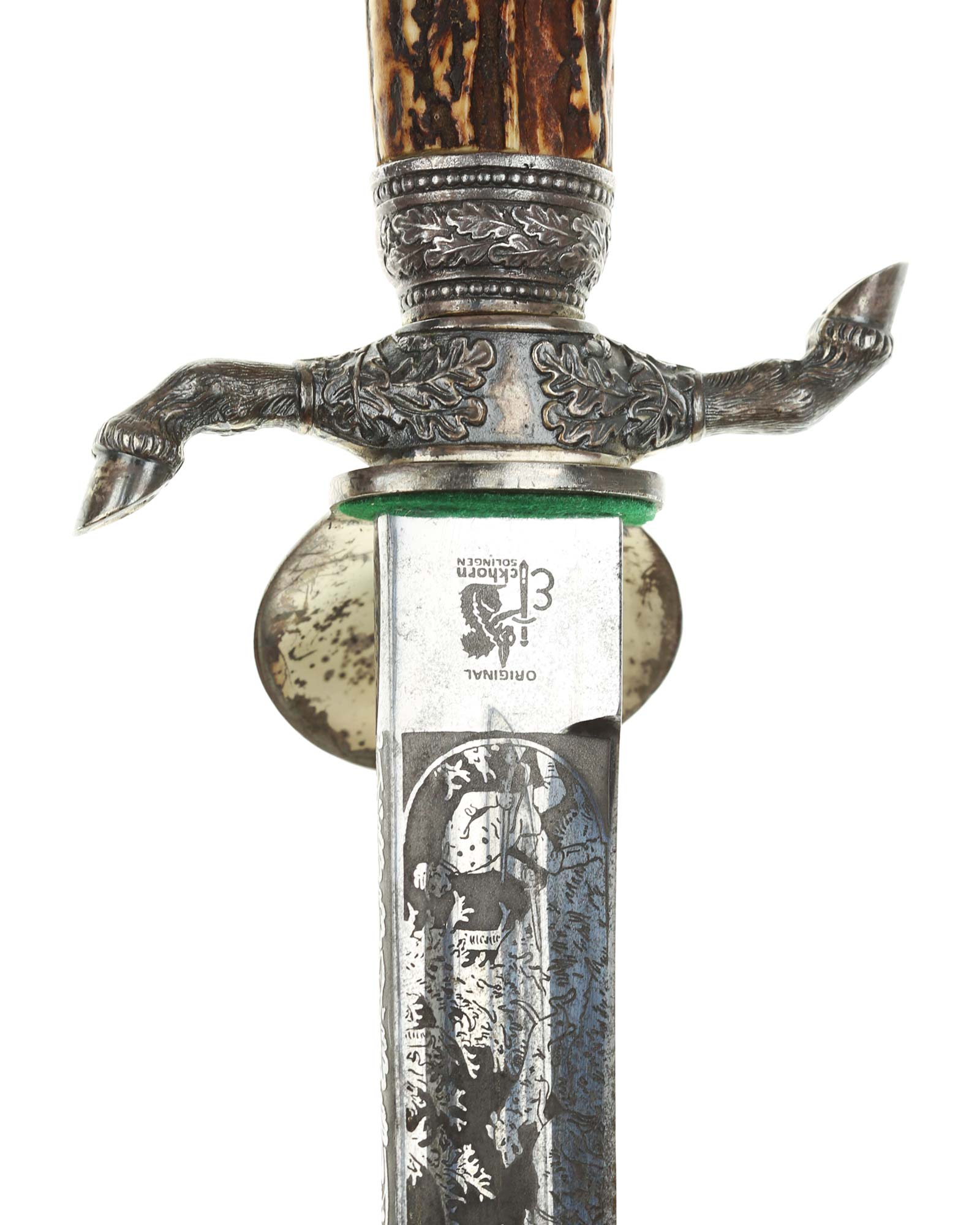 Кинжал охотничий Хиршфангер (нем. Deutscher Jägerverband (DJV) Hirschfänger). Кинжал с клеймом Original Eickhorn Solingen (Карл Айкхорн Золинген). Рукоять роговая, крепится на черенке клинка всадным способом. Навершие рукояти стальное, овальной формы, плоское, с декоративным винтом. Перекрестье рукояти стальное в виде стилизованных кабаньих копыт направленных в разные стороны. В центре перекрестья с одной стороны закреплен декоративный щитик, выполненный в форме раковины. Клинок стальной, прямой, двухлезвийный, ромбического сечения, без долов, у пяты плоский, с двух сторон богато украшен травлением со сценами охоты на кабана и оленя. На пяте клинка с обратной стороны имеется клеймо известной фирмы - Карл Айкхорн, г. Золинген, характерное для продукции, выпускаемой данным производителем в период с 1941-1945 гг. Обух клинка практически на всю длинну украшен орнаментом из дубовых листьев и именем бывшего владельца. Ножны деревянные, обтянуты темной кожей, со стальным прибором, состоящим из устья со шпеньком в виде желудя и наконечника. Внутри устья для дополнительной фиксации вставлена стальная распорка-фиксатор.