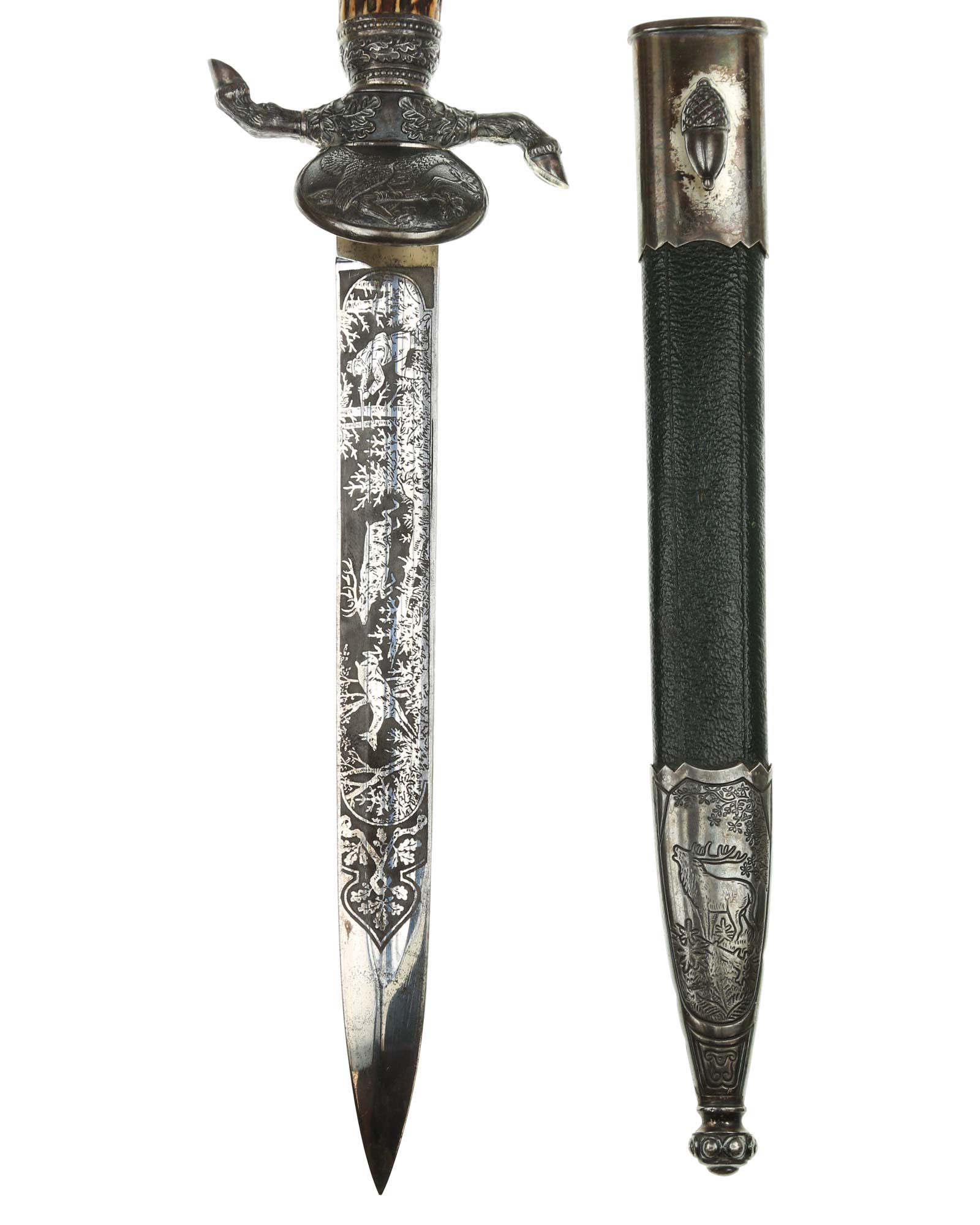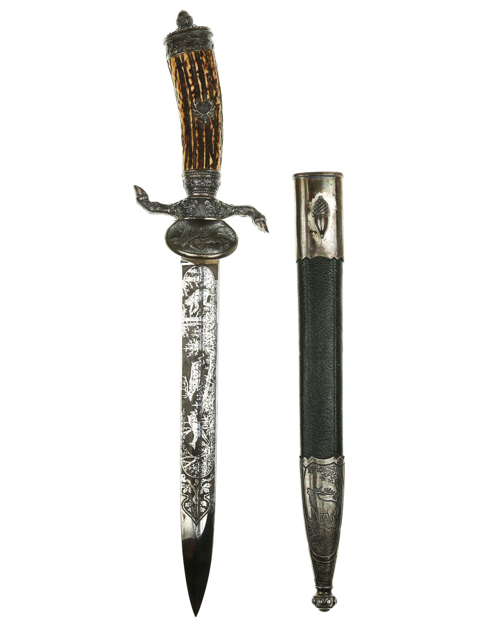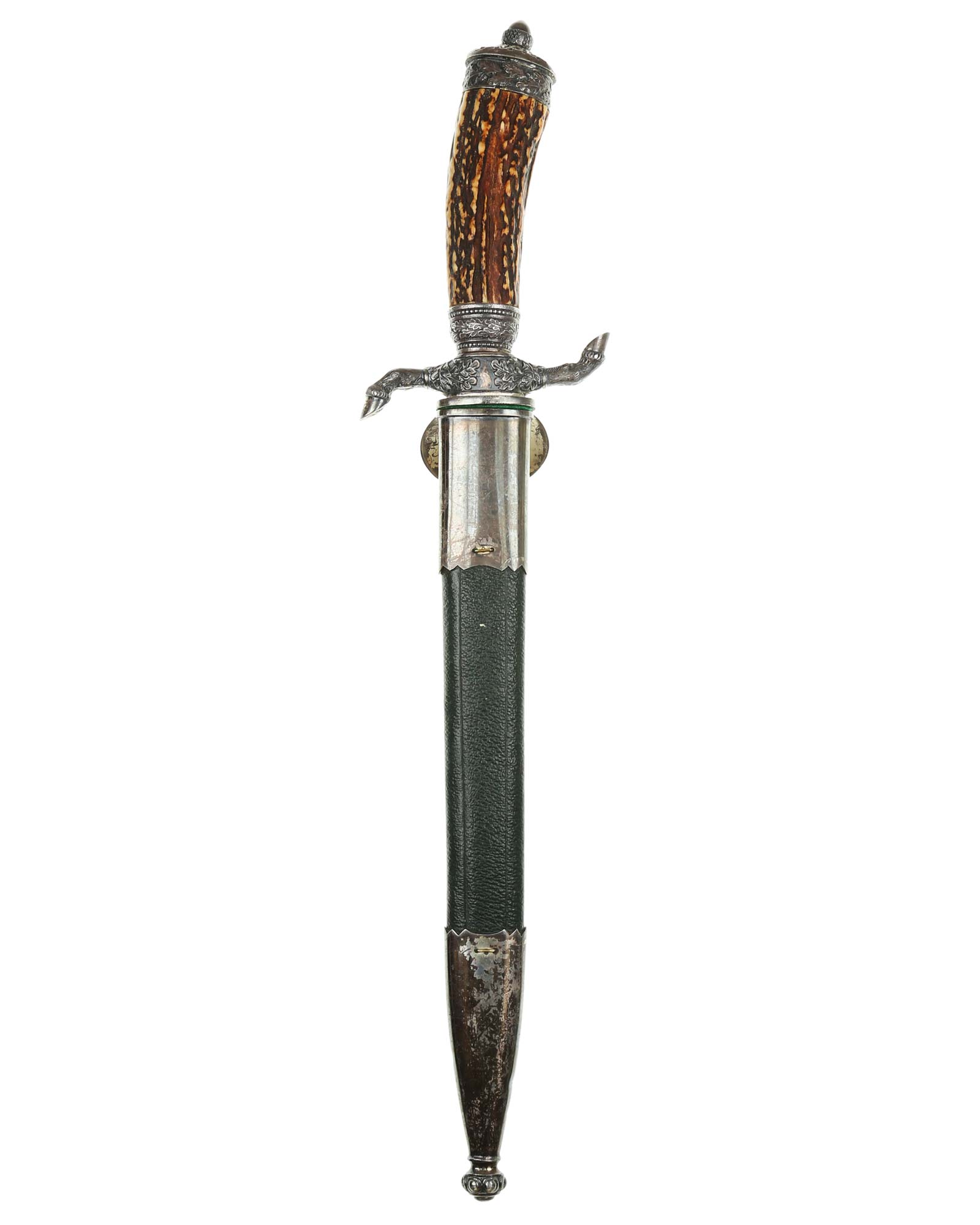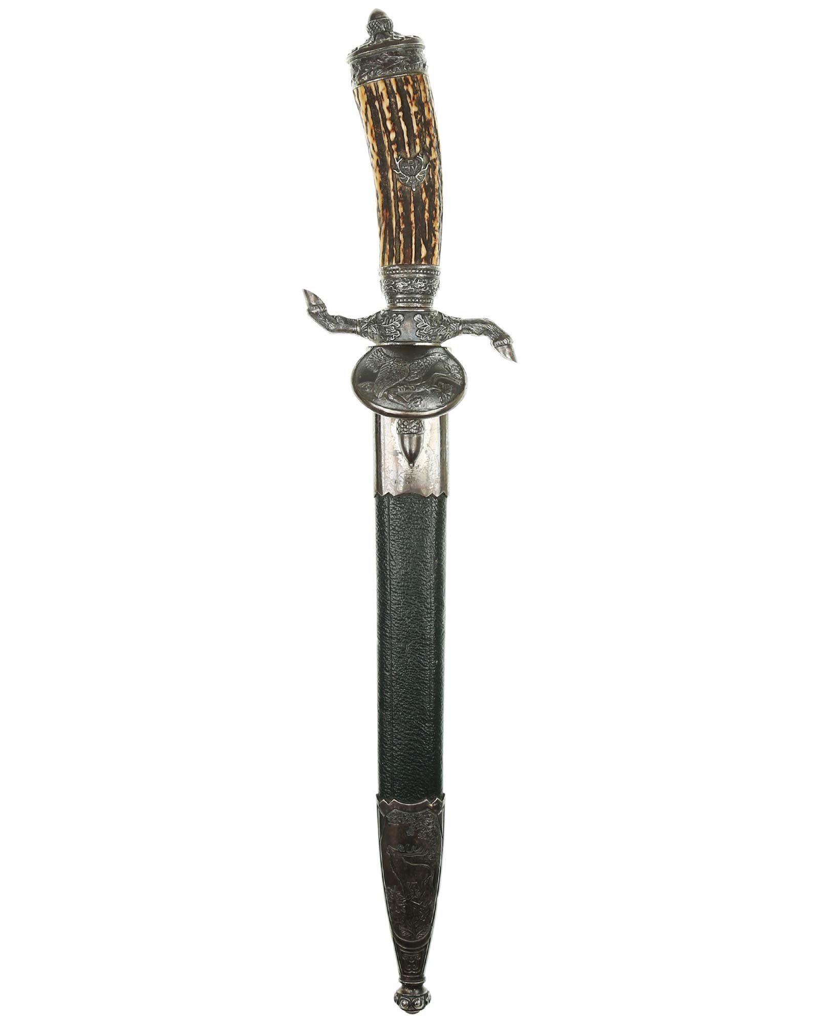 Кинжал охотничий Хиршфангер (нем. Deutscher Jägerverband (DJV) Hirschfänger). Кинжал с клеймом Original Eickhorn Solingen (Карл Айкхорн Золинген). Рукоять роговая, крепится на черенке клинка всадным способом. Навершие рукояти стальное, овальной формы, плоское, с декоративным винтом. Перекрестье рукояти стальное в виде стилизованных кабаньих копыт направленных в разные стороны. В центре перекрестья с одной стороны закреплен декоративный щитик, выполненный в форме раковины. Клинок стальной, прямой, двухлезвийный, ромбического сечения, без долов, у пяты плоский, с двух сторон богато украшен травлением со сценами охоты на кабана и оленя. На пяте клинка с обратной стороны имеется клеймо известной фирмы - Карл Айкхорн, г. Золинген, характерное для продукции, выпускаемой данным производителем в период с 1941-1945 гг. Обух клинка практически на всю длинну украшен орнаментом из дубовых листьев и именем бывшего владельца. Ножны деревянные, обтянуты темной кожей, со стальным прибором, состоящим из устья со шпеньком в виде желудя и наконечника. Внутри устья для дополнительной фиксации вставлена стальная распорка-фиксатор.