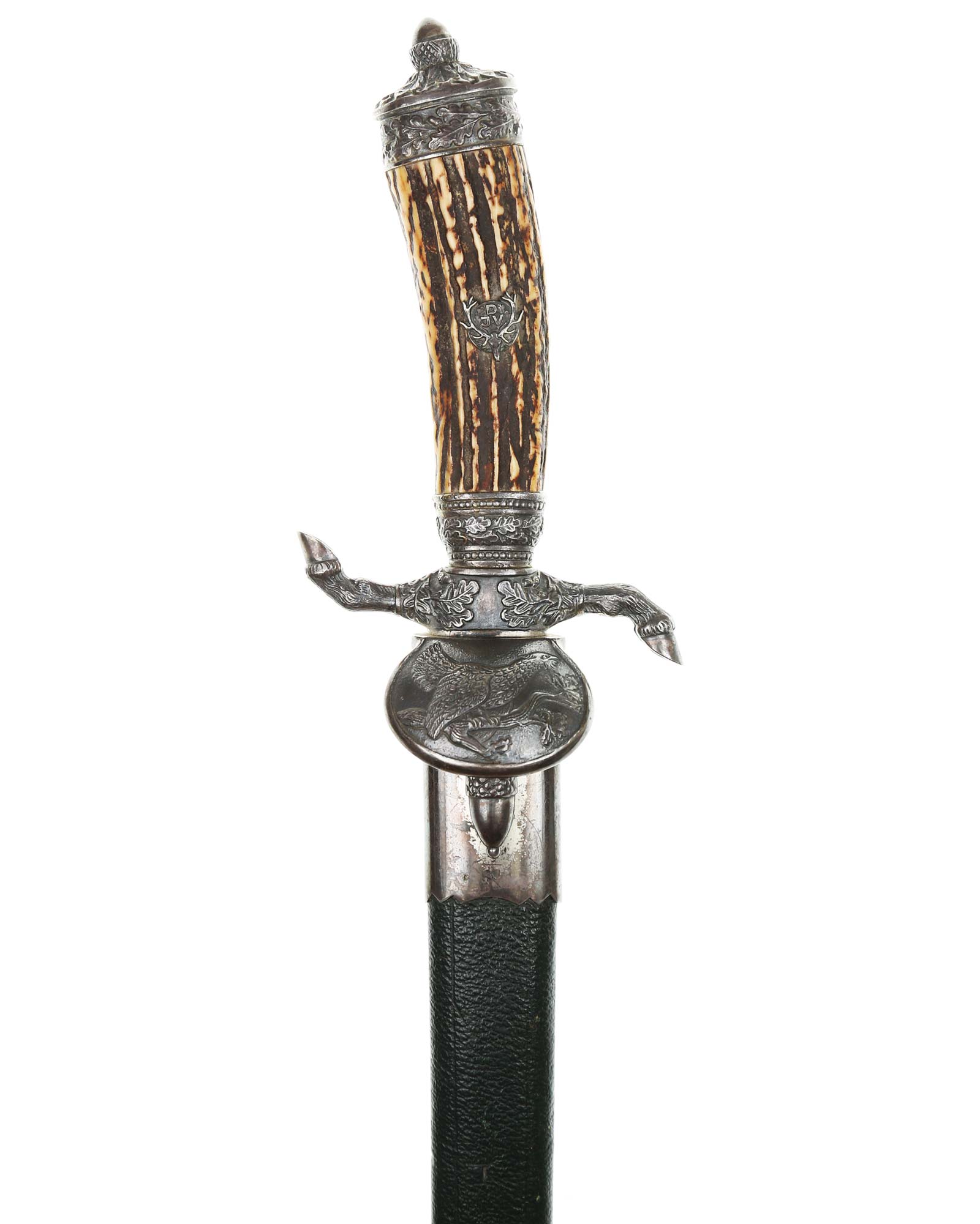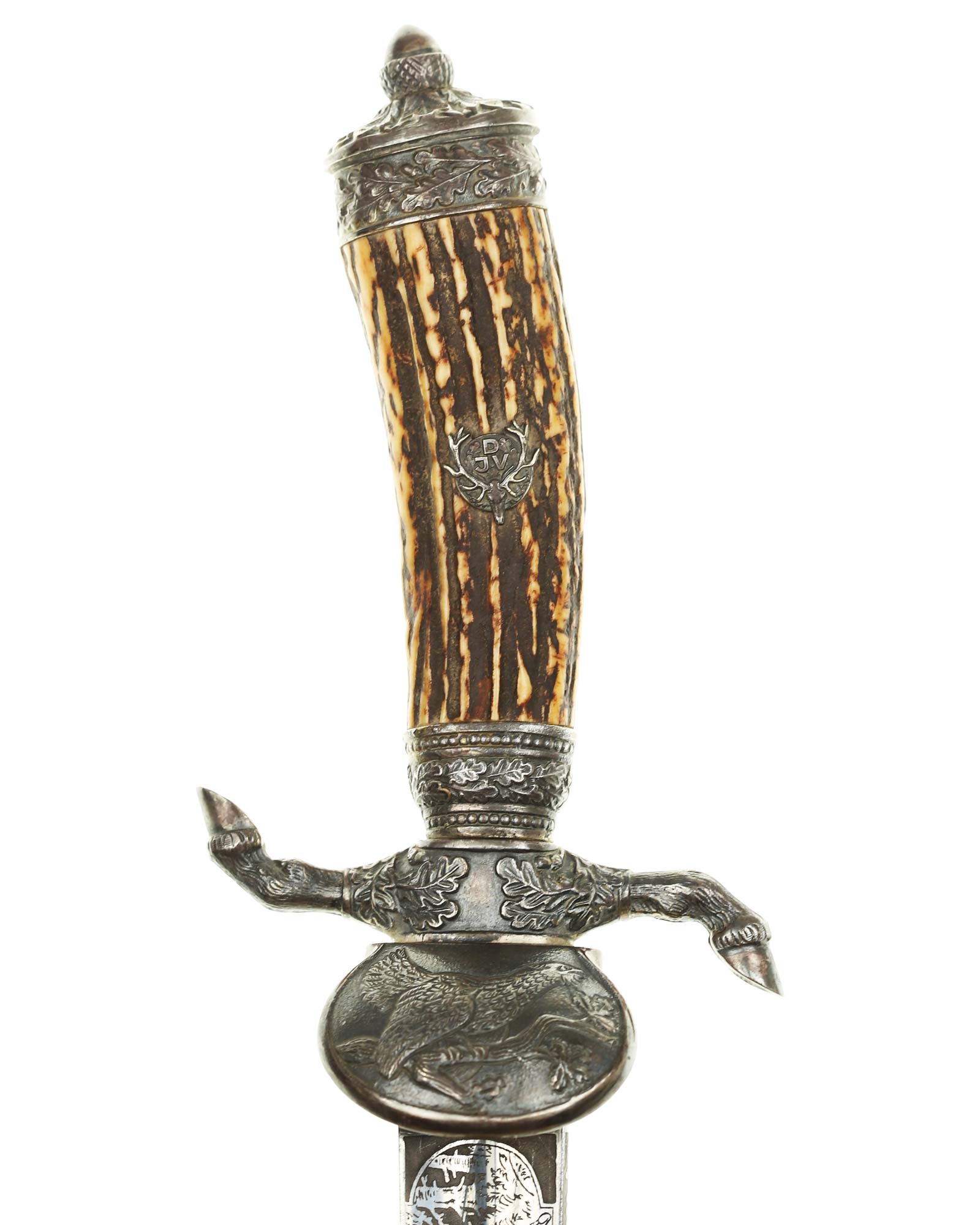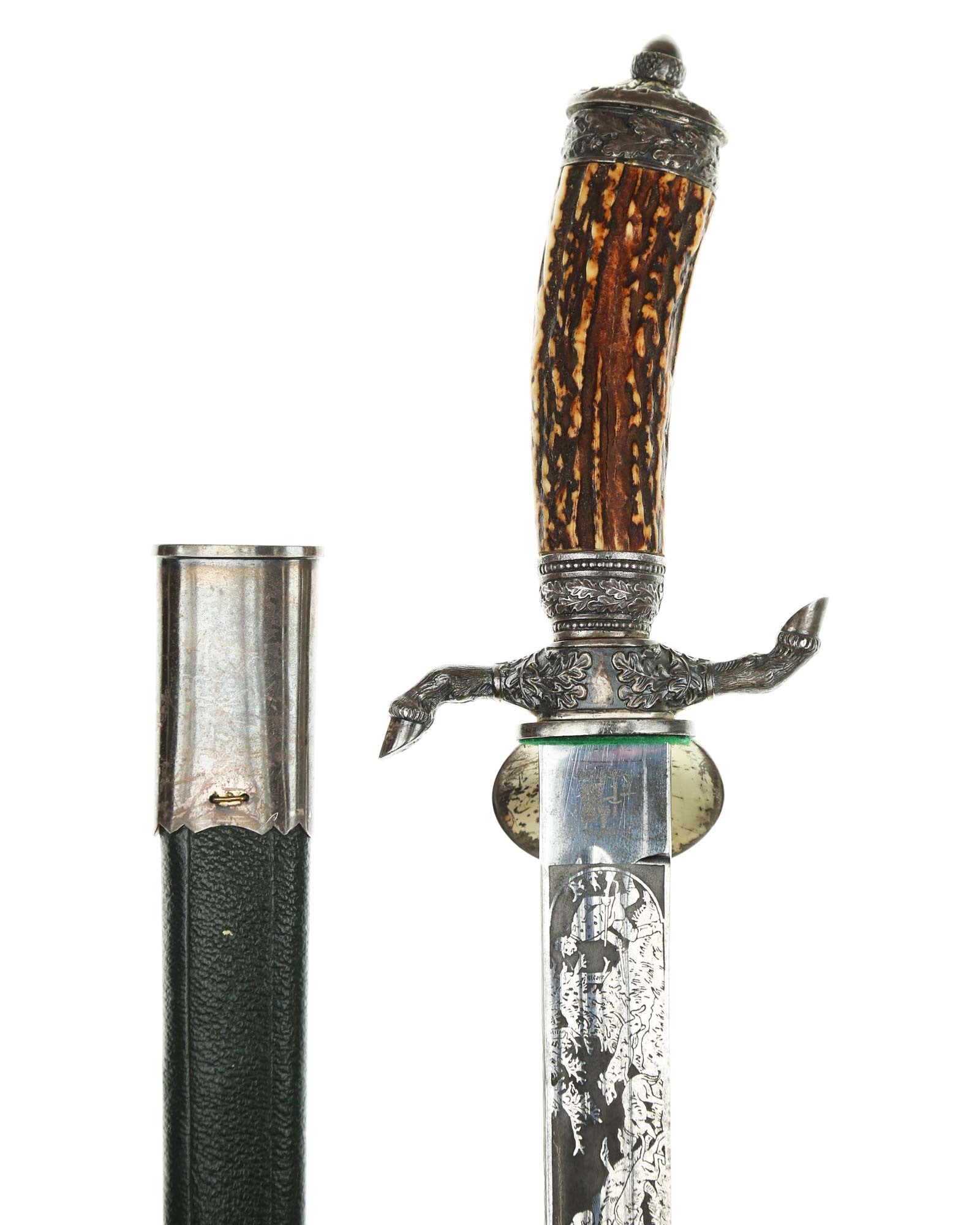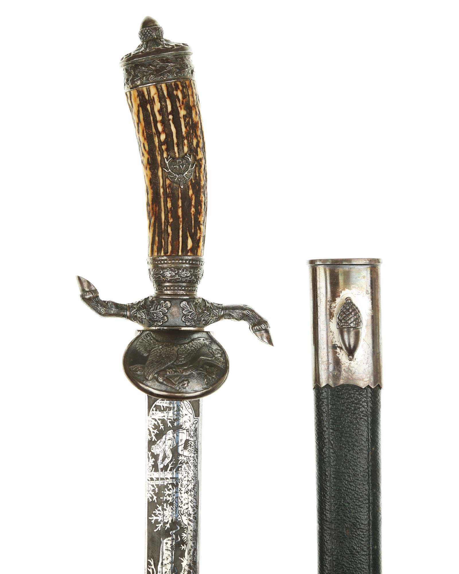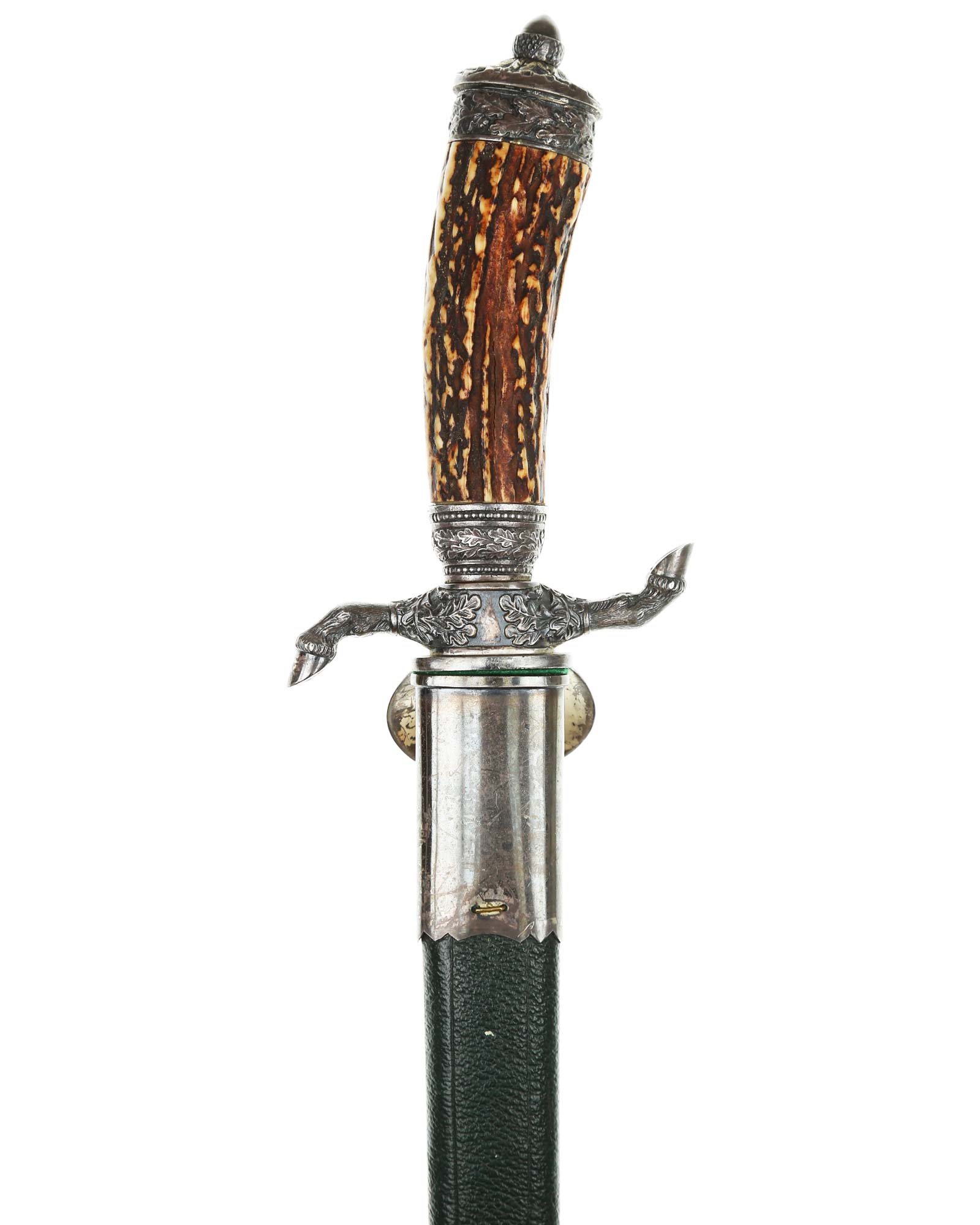 Кинжал охотничий Хиршфангер (нем. Deutscher Jägerverband (DJV) Hirschfänger). Кинжал с клеймом Original Eickhorn Solingen (Карл Айкхорн Золинген). Рукоять роговая, крепится на черенке клинка всадным способом. Навершие рукояти стальное, овальной формы, плоское, с декоративным винтом. Перекрестье рукояти стальное в виде стилизованных кабаньих копыт направленных в разные стороны. В центре перекрестья с одной стороны закреплен декоративный щитик, выполненный в форме раковины. Клинок стальной, прямой, двухлезвийный, ромбического сечения, без долов, у пяты плоский, с двух сторон богато украшен травлением со сценами охоты на кабана и оленя. На пяте клинка с обратной стороны имеется клеймо известной фирмы - Карл Айкхорн, г. Золинген, характерное для продукции, выпускаемой данным производителем в период с 1941-1945 гг. Обух клинка практически на всю длинну украшен орнаментом из дубовых листьев и именем бывшего владельца. Ножны деревянные, обтянуты темной кожей, со стальным прибором, состоящим из устья со шпеньком в виде желудя и наконечника. Внутри устья для дополнительной фиксации вставлена стальная распорка-фиксатор.